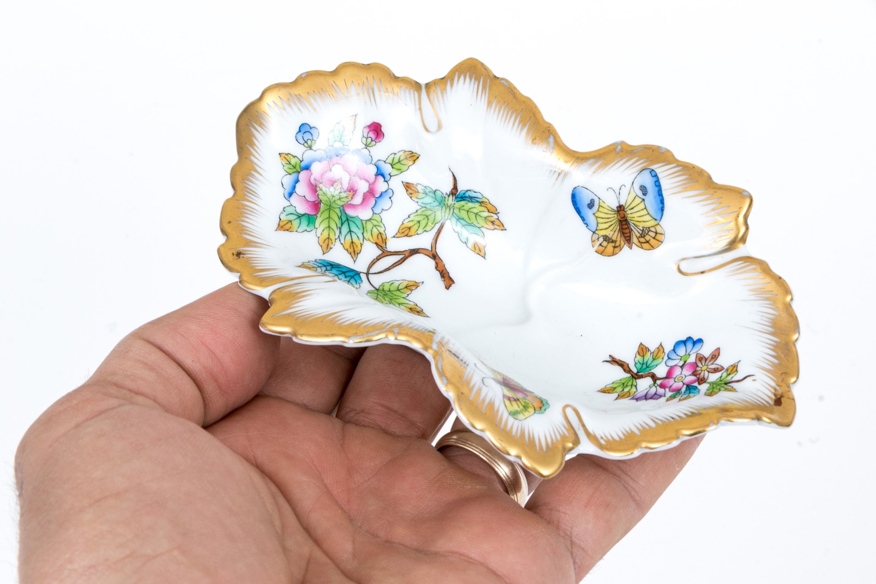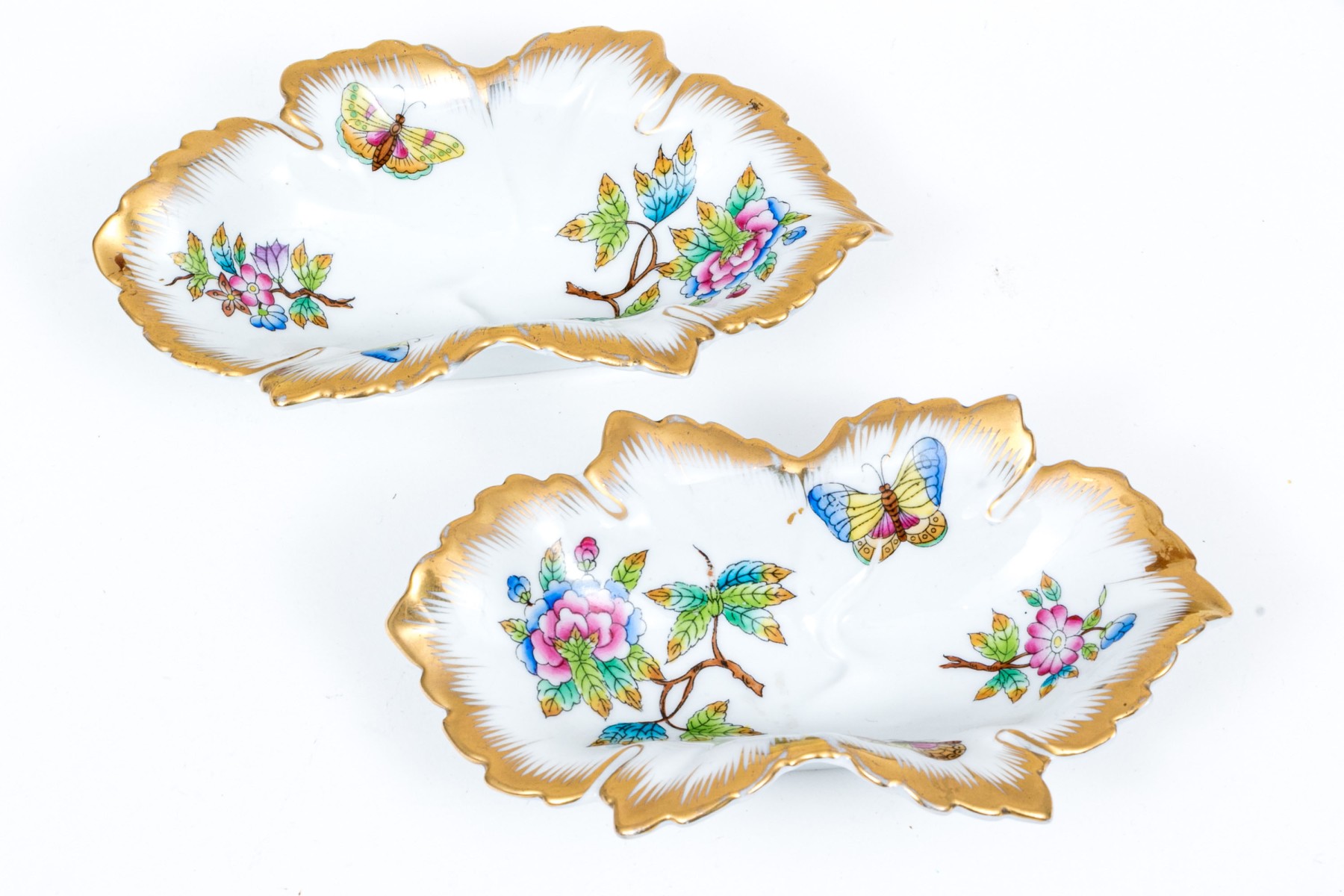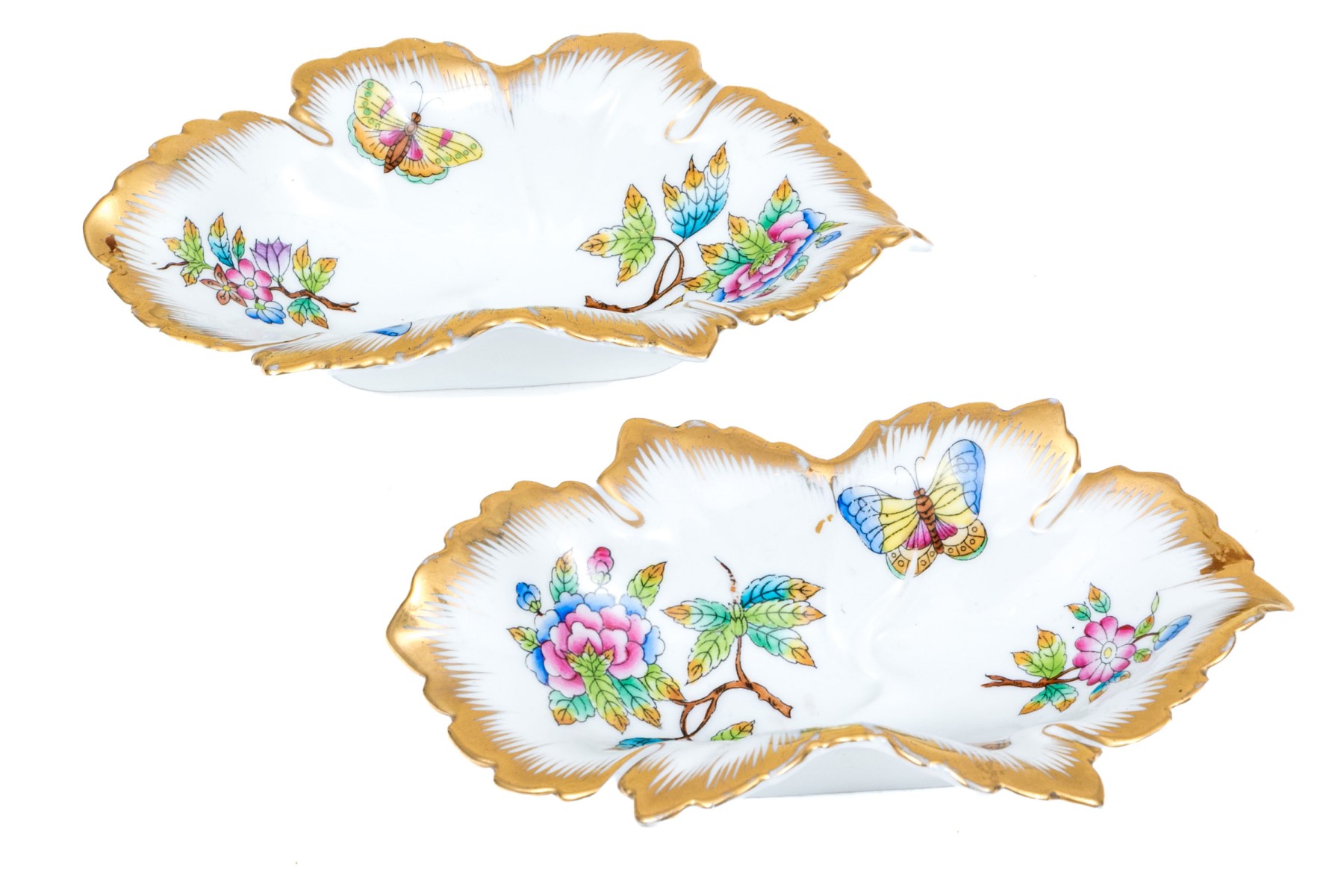 A pair of hand painted Herend 'Queen Victoria' leaf form dresser top dish. A floral painted dish with gold gilt border.