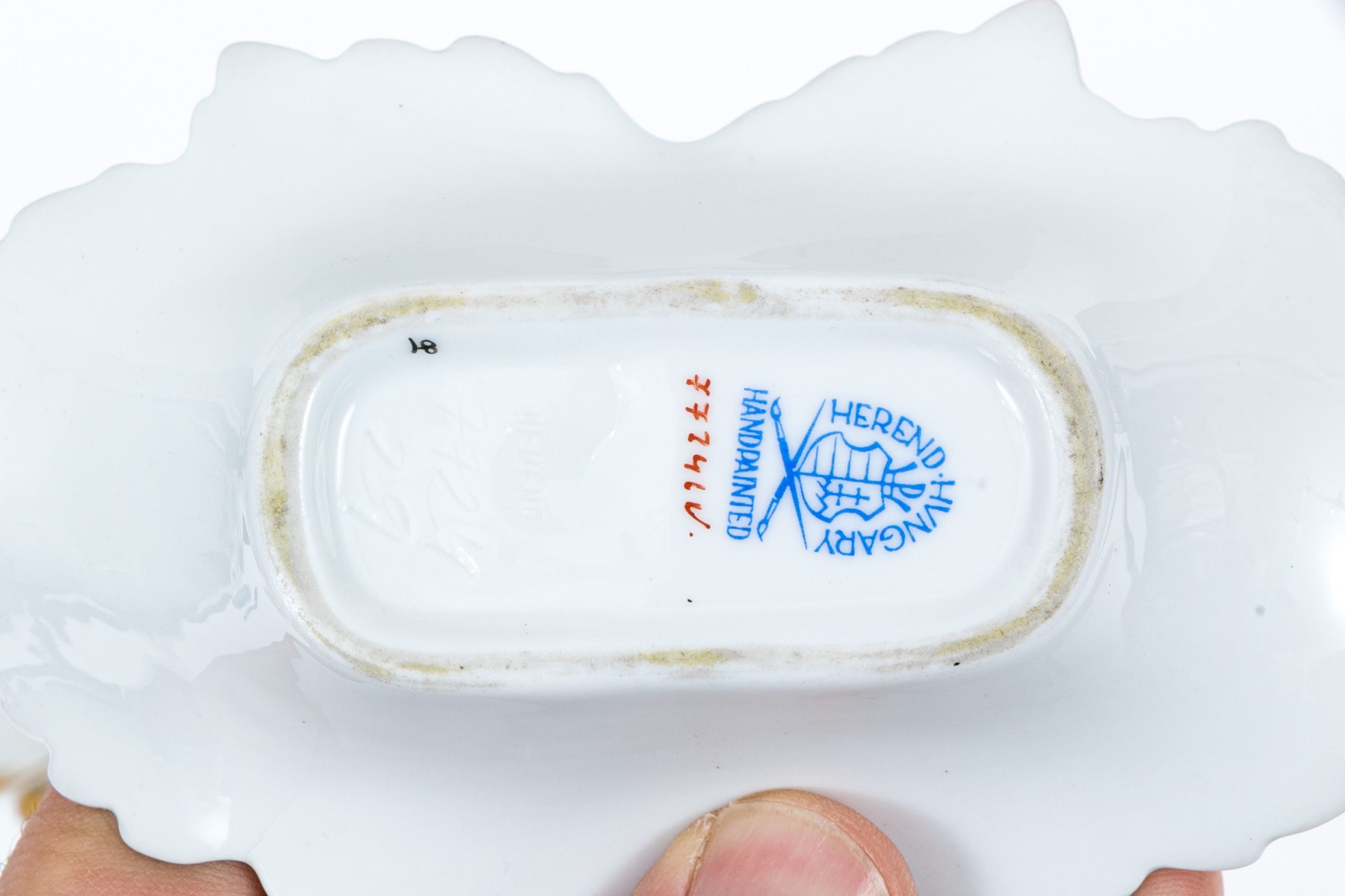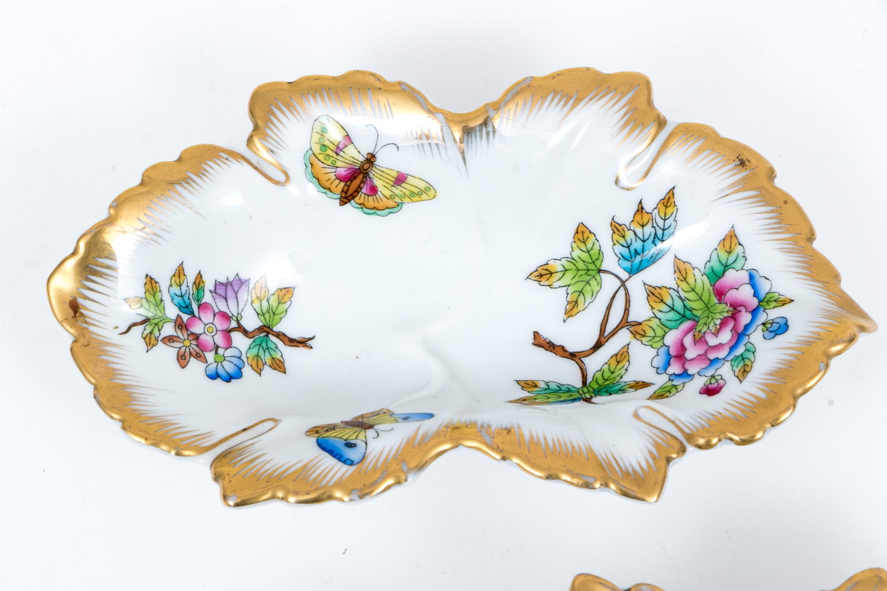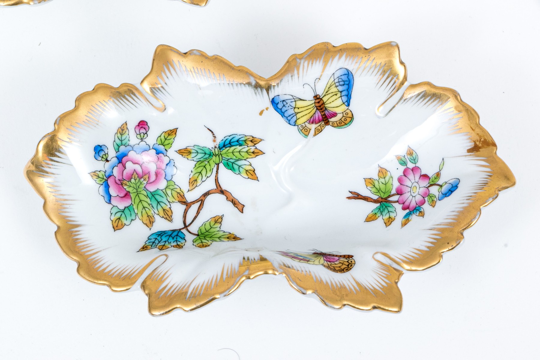 A pair of hand painted Herend 'Queen Victoria' leaf form dresser top dish. A floral painted dish with gold gilt border.