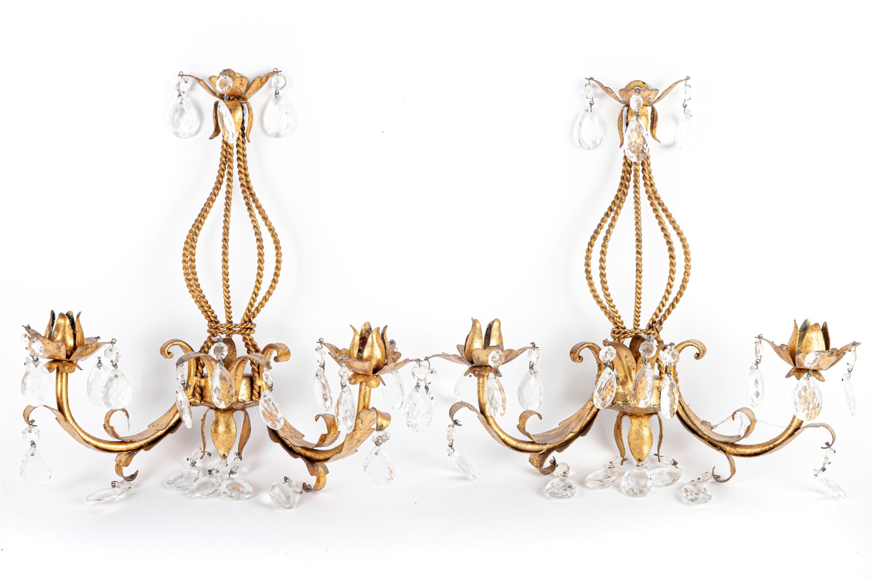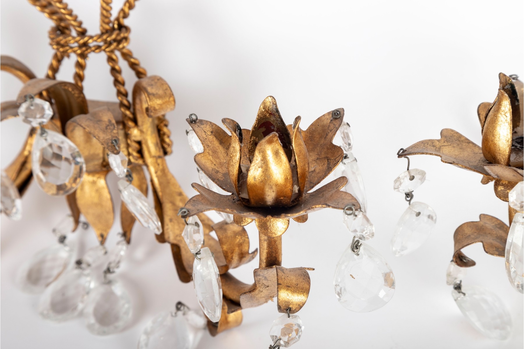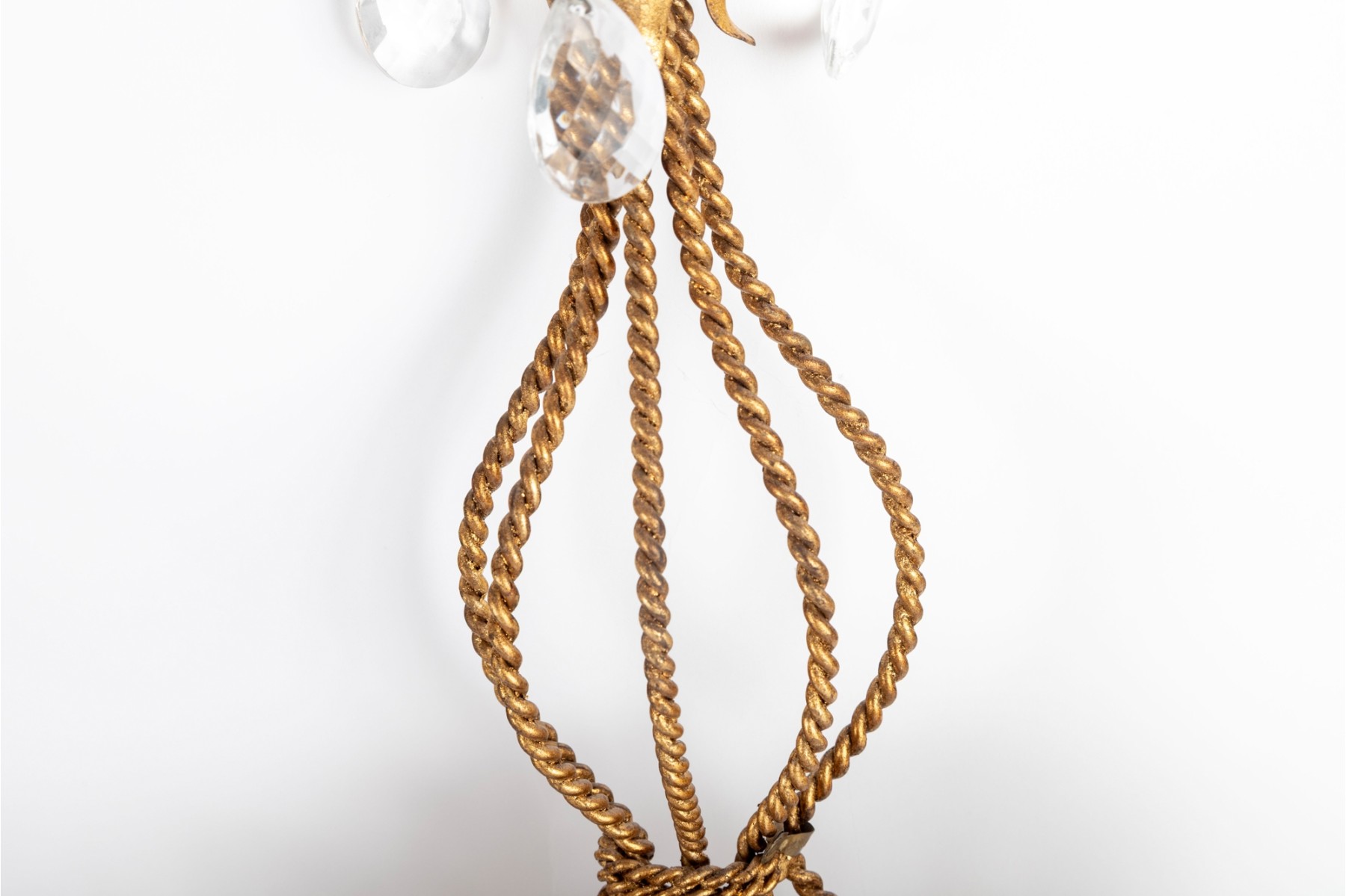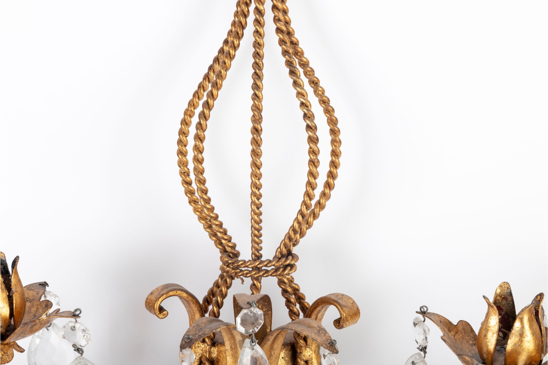 A handsome pair of vintage Italian Hollywood Regency sconces designed with baluster form openwork rope twist columns leading down to three tulip sconces on foliate arms. Surrounded throughout with elegant dangling pear-form prisms for an all over elegant appearance.