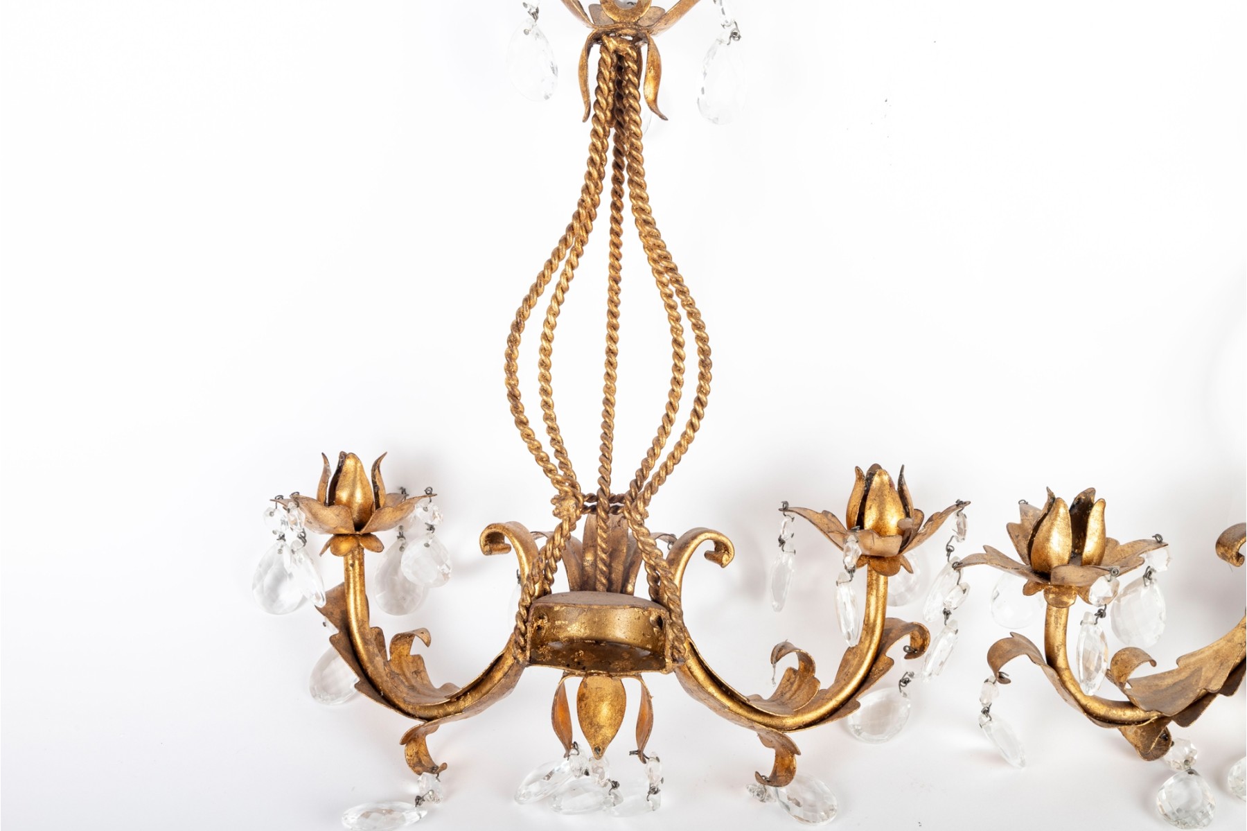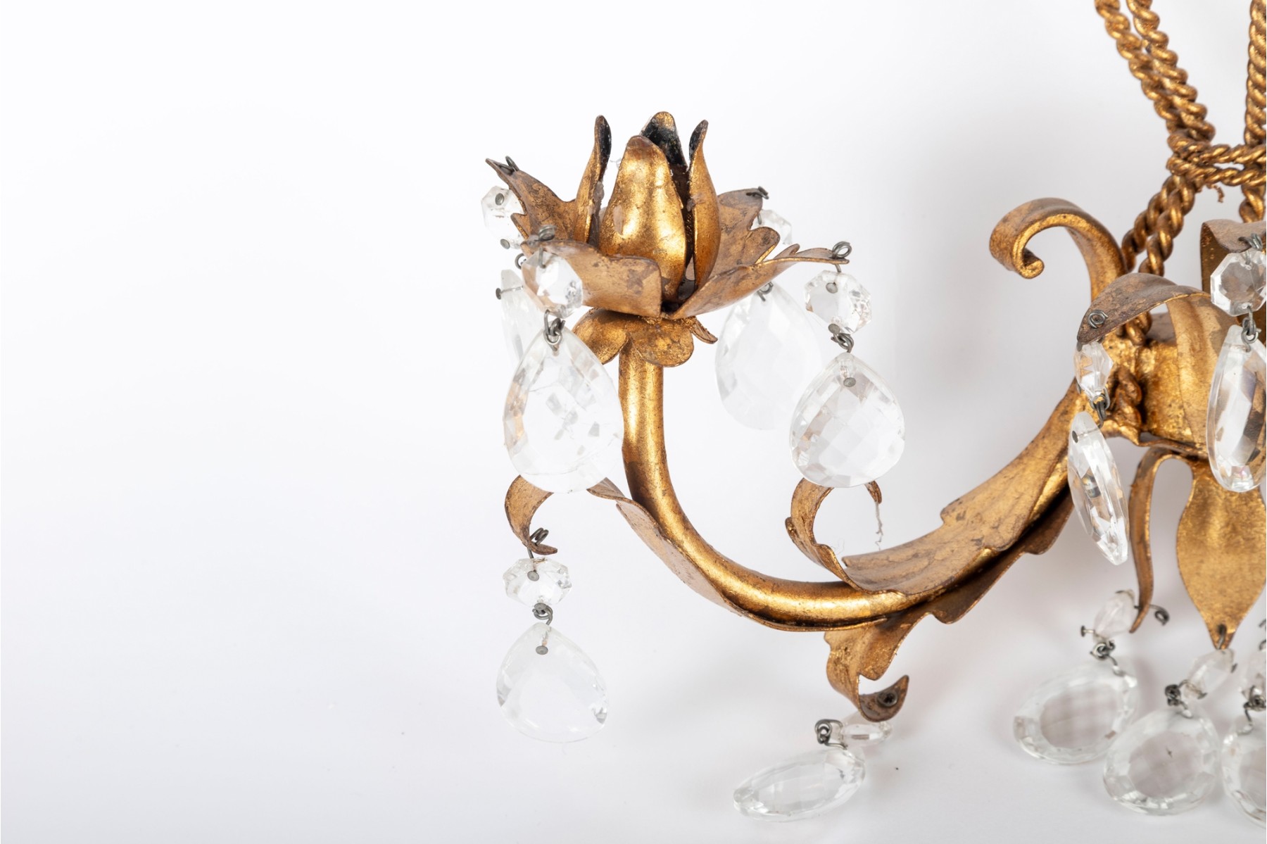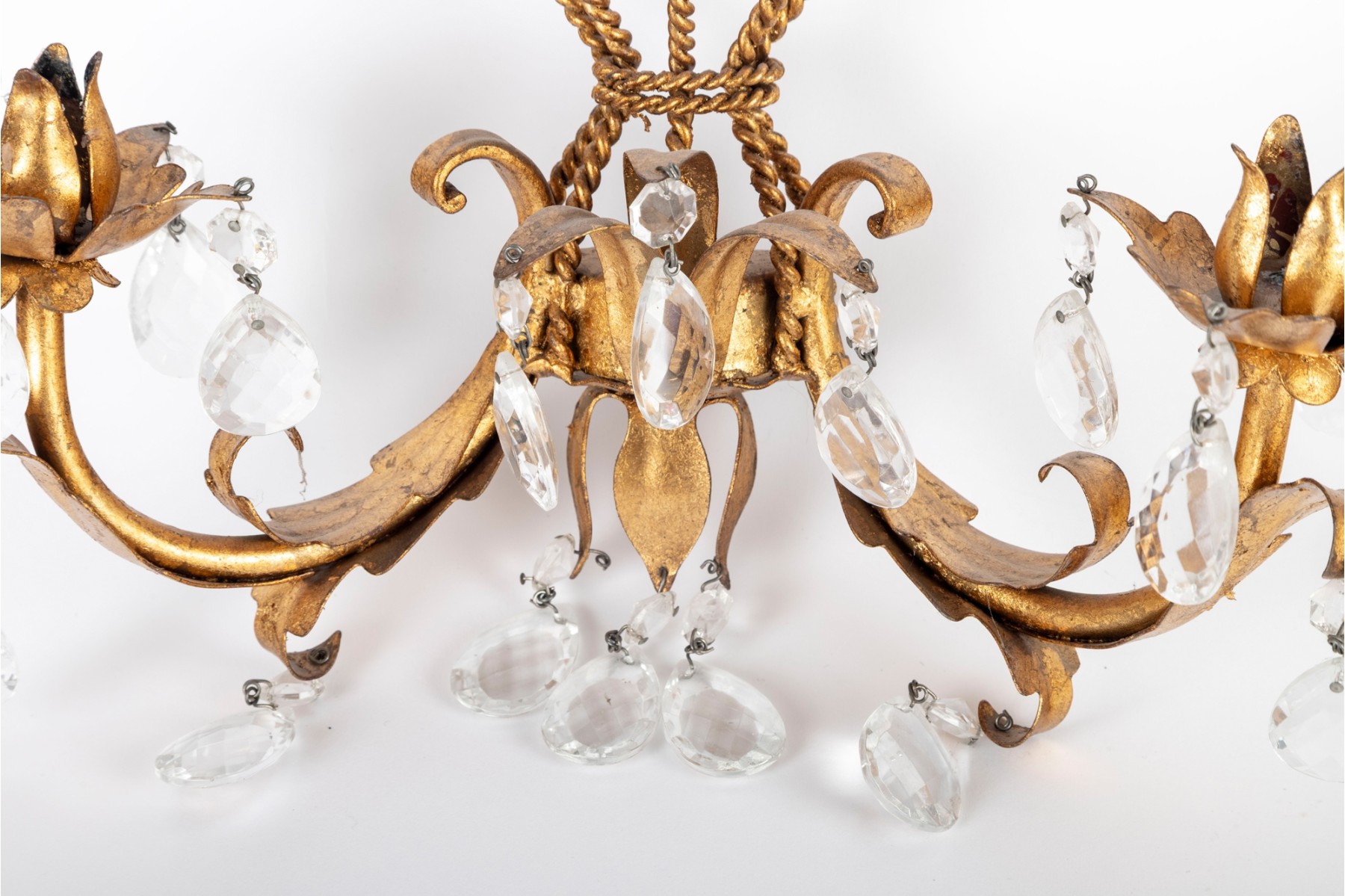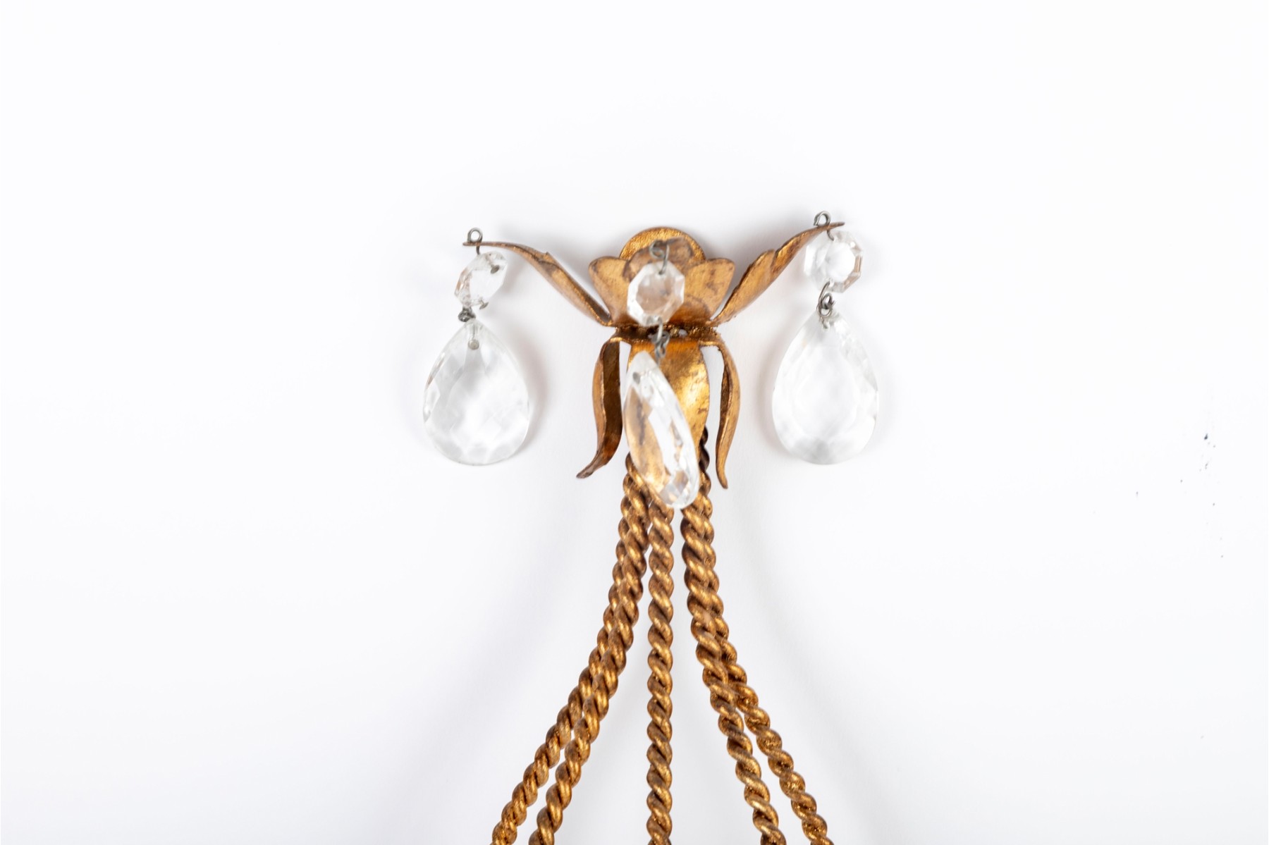 A handsome pair of vintage Italian Hollywood Regency sconces designed with baluster form openwork rope twist columns leading down to three tulip sconces on foliate arms. Surrounded throughout with elegant dangling pear-form prisms for an all over elegant appearance.