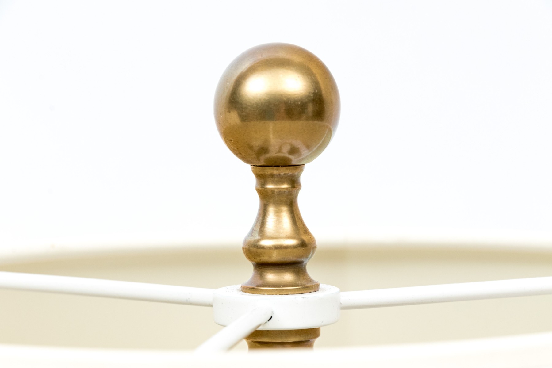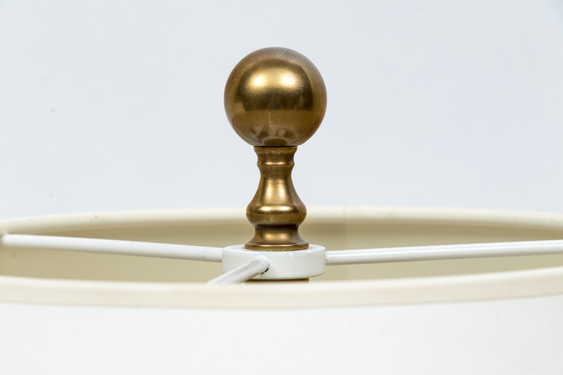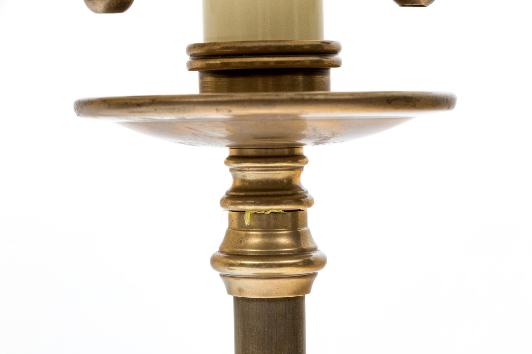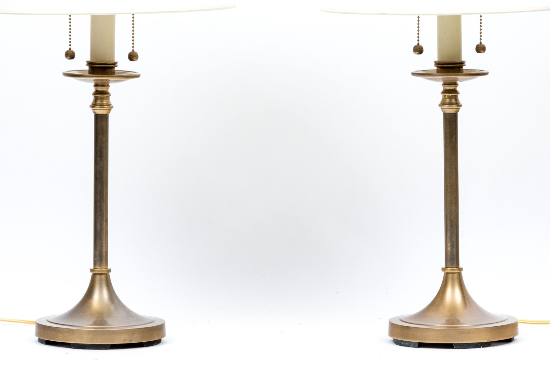 Both are mounted on circular, weighted circular bases with cylindrical pillars and wax drip cus with nozzles and faux candle sleeves with two pull chains for the two light bulbs concealed under the paper shade with brass finial.