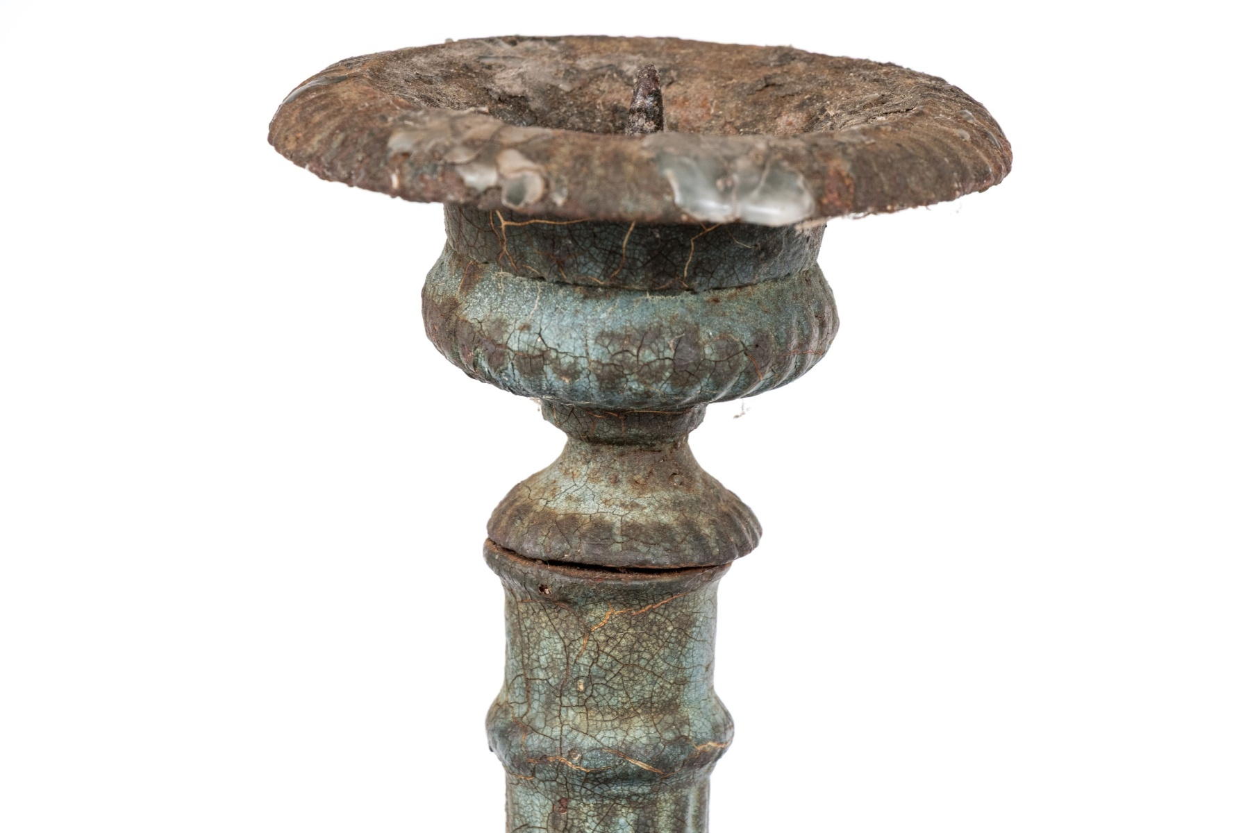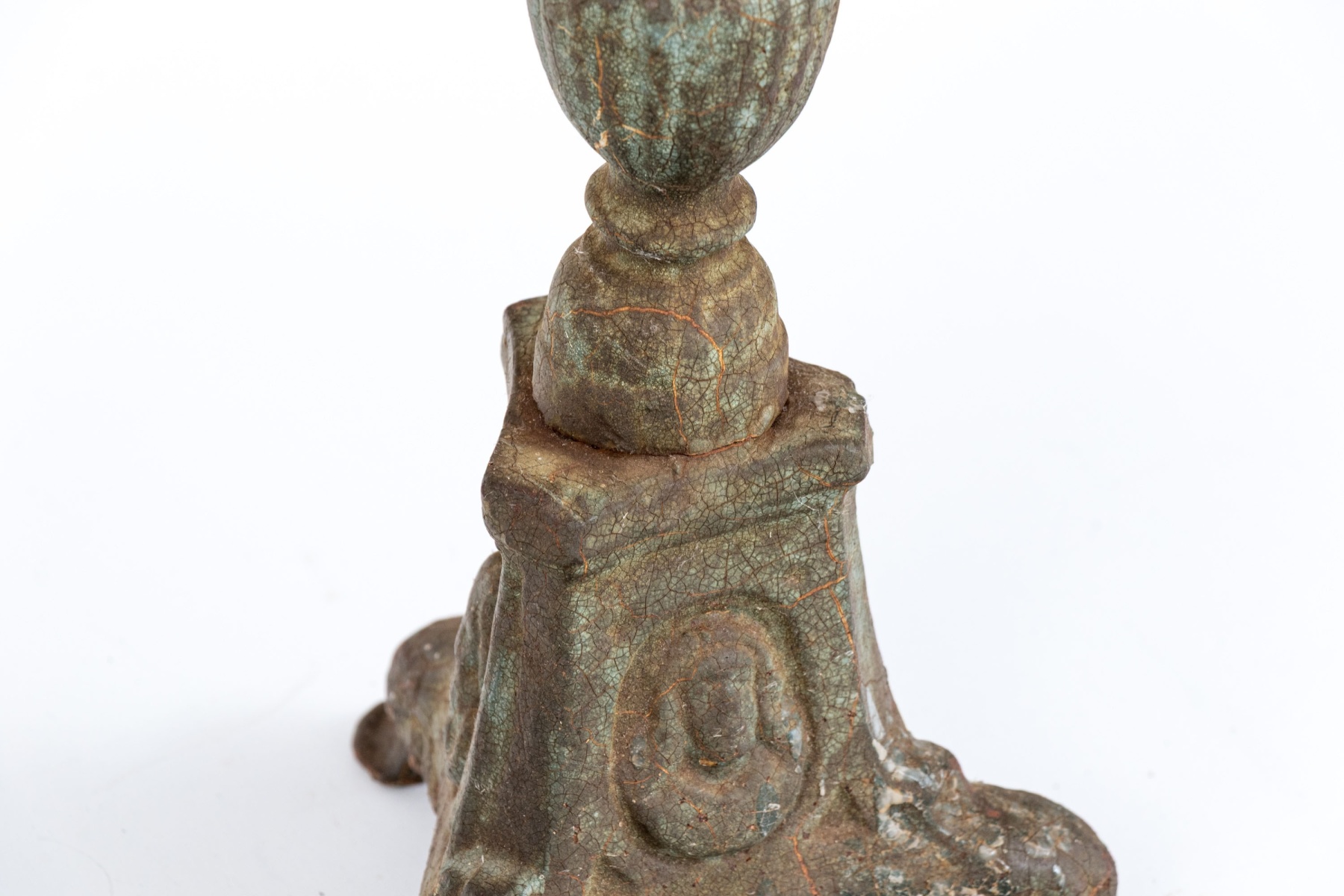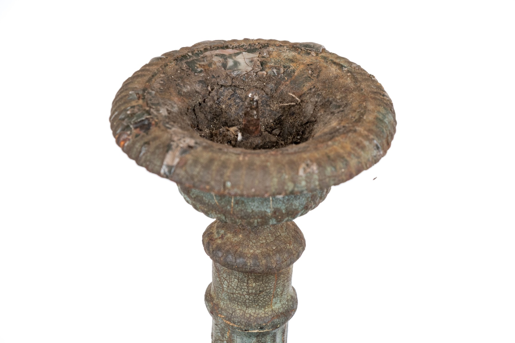 A charming pair of antique candlesticks showcasing squat campana form capitals with everted lappet rims over fluted columns leading down to urn knops. Supported by triangular bases with cabriole legs.