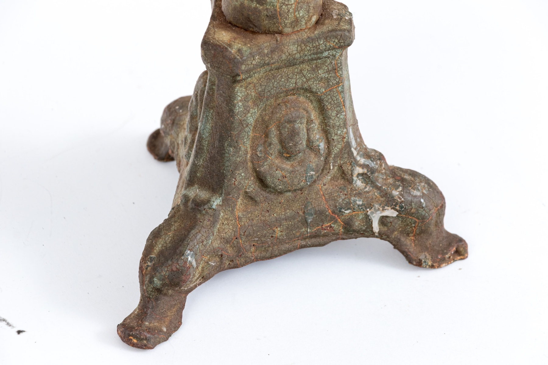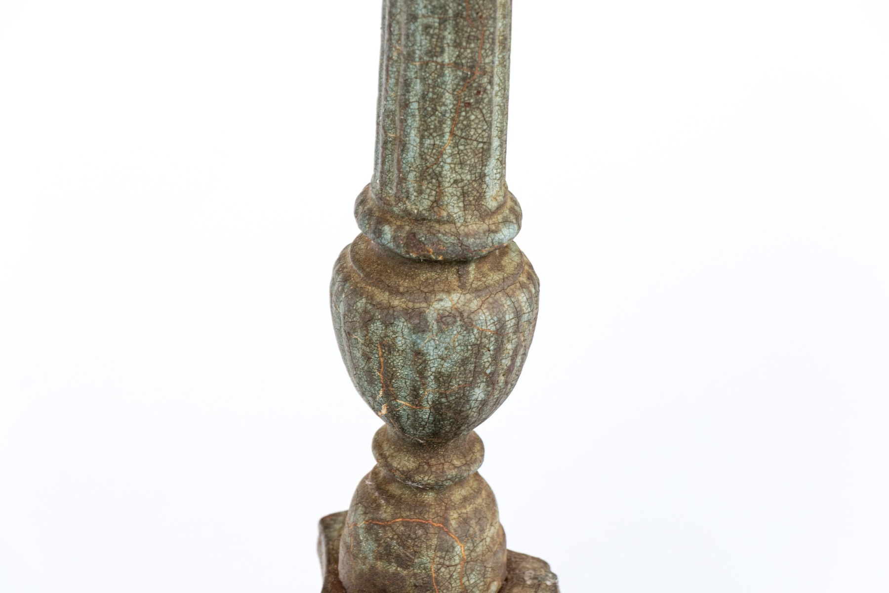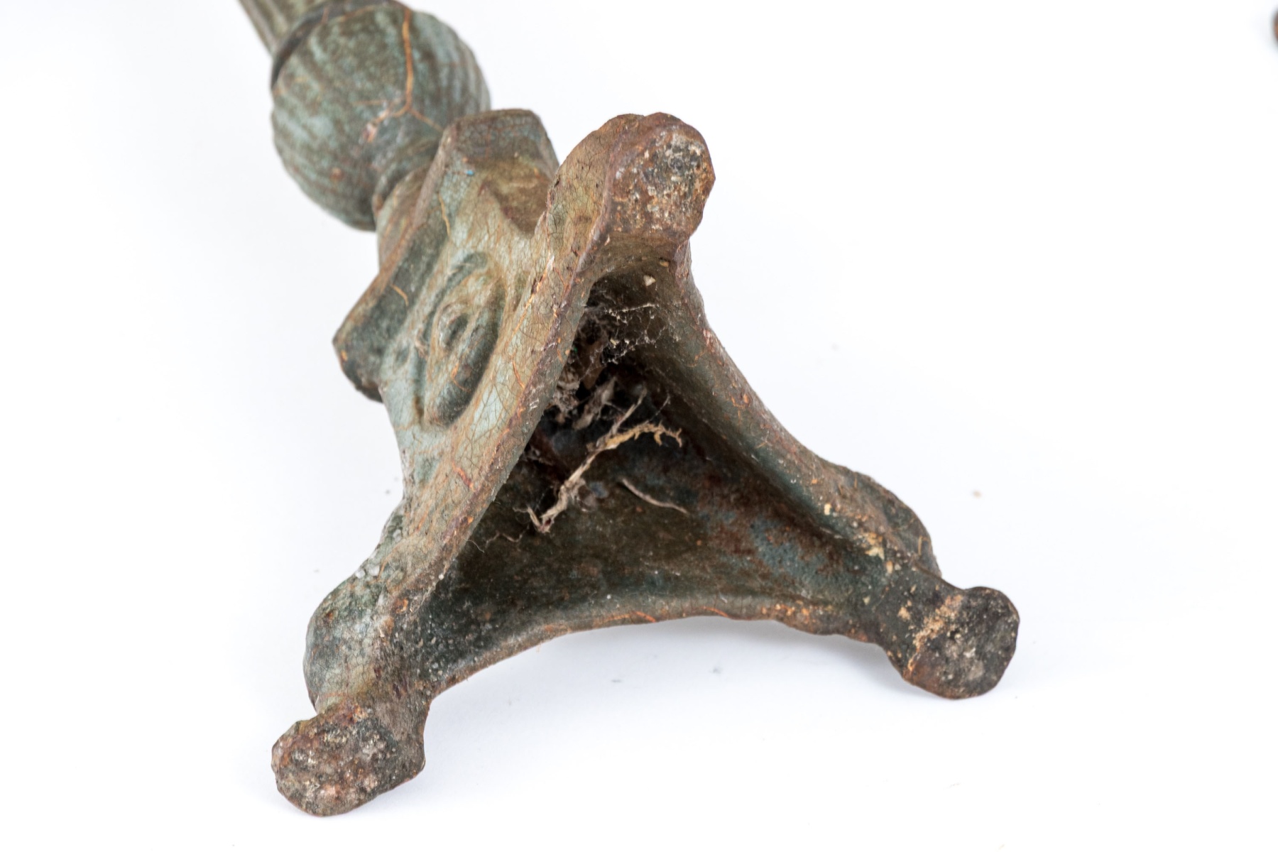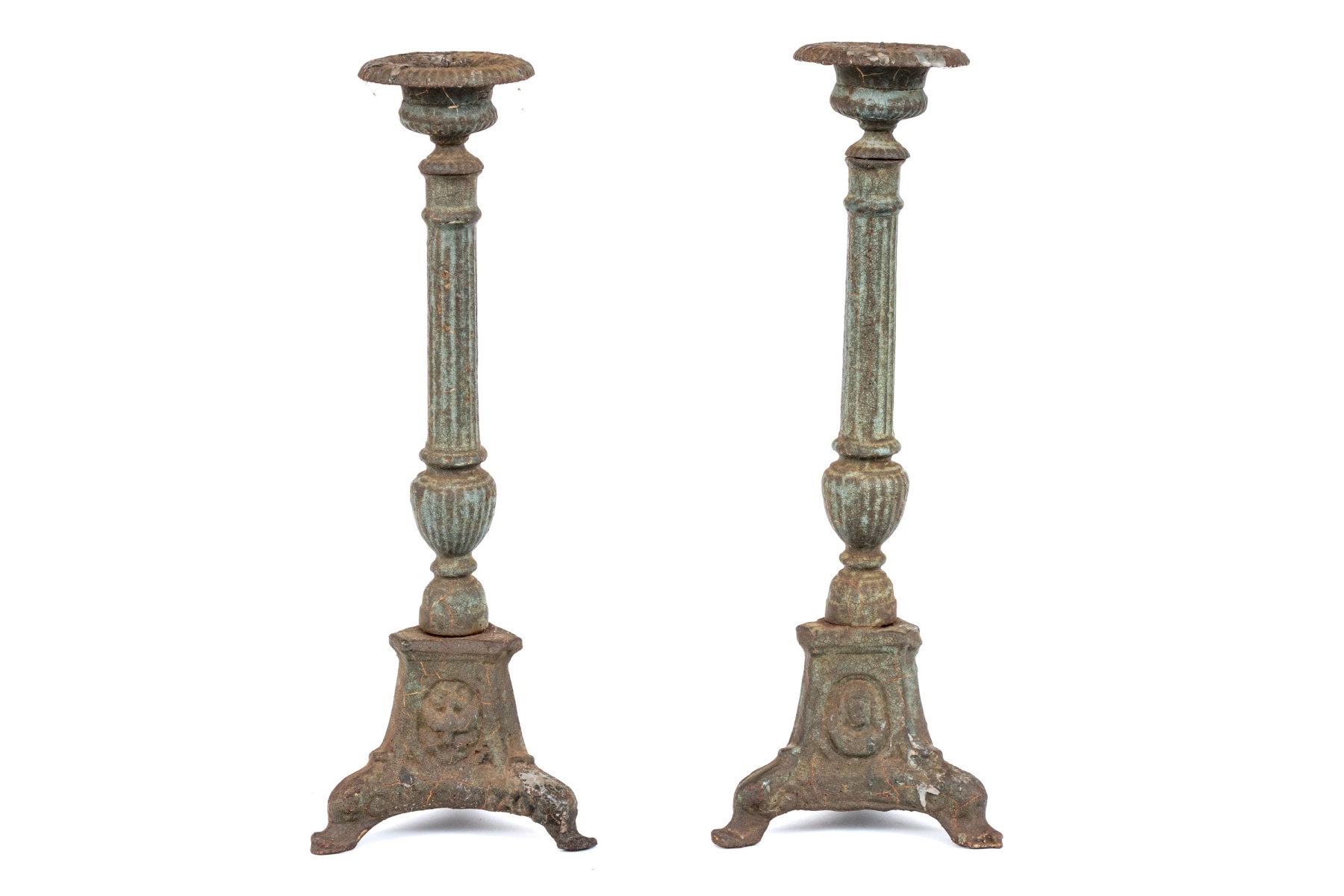 A charming pair of antique candlesticks showcasing squat campana form capitals with everted lappet rims over fluted columns leading down to urn knops. Supported by triangular bases with cabriole legs.