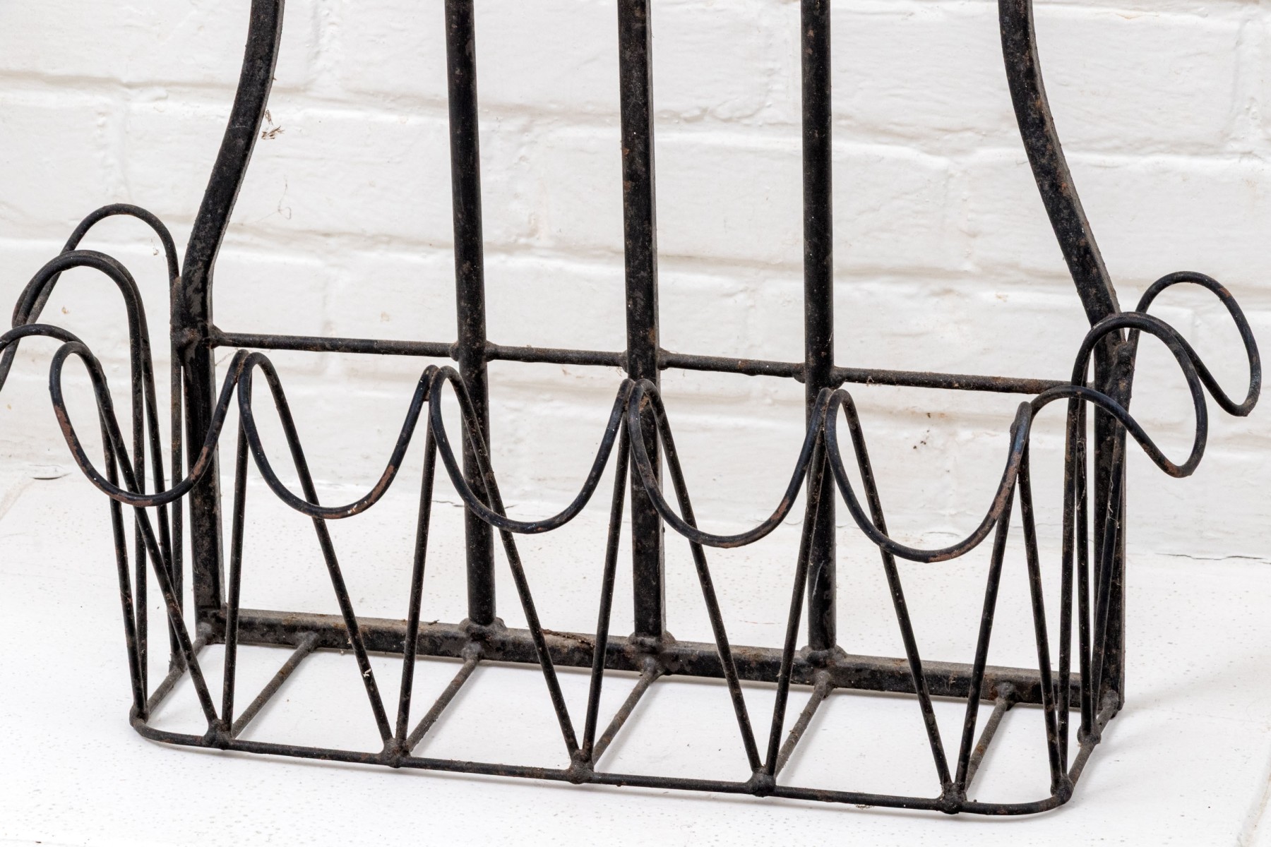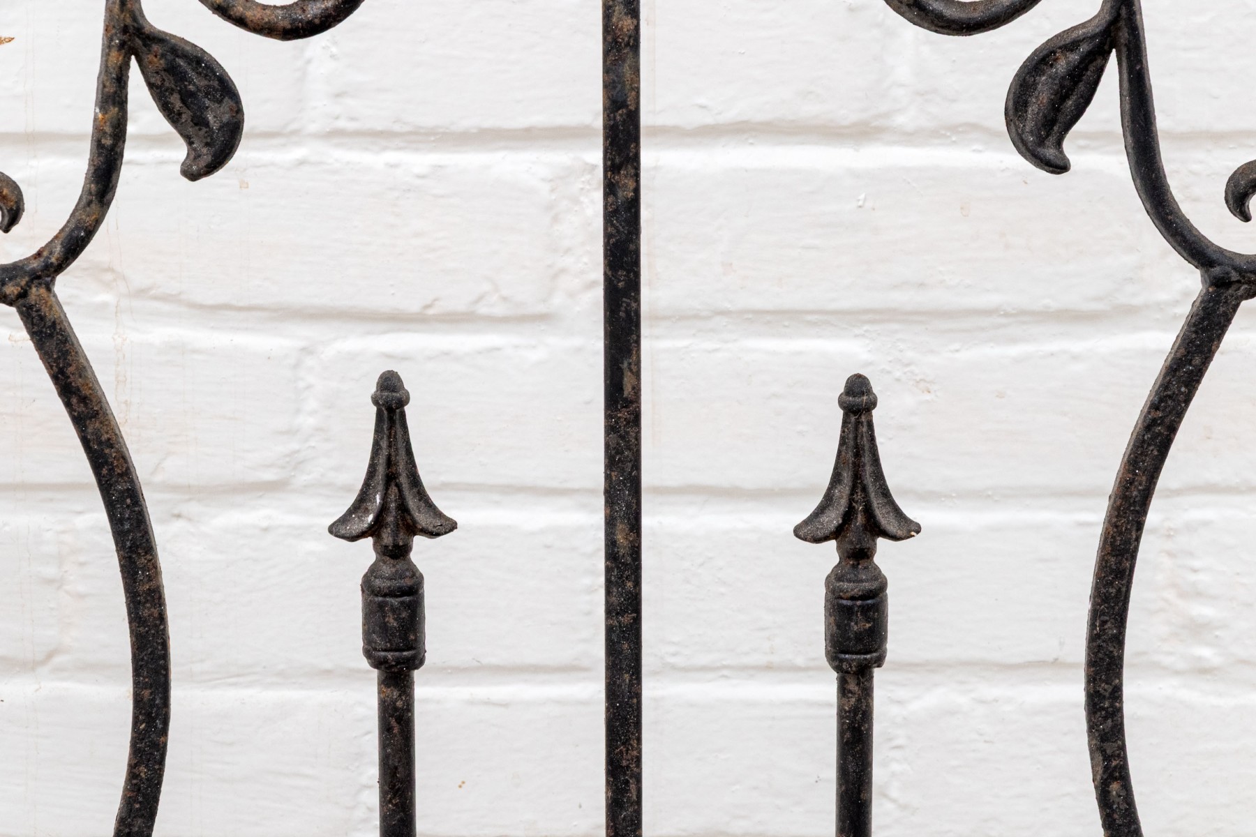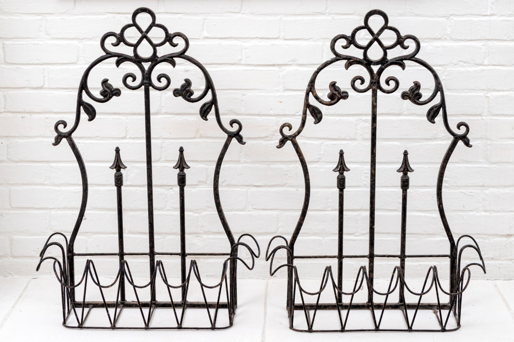 A fabulous pair of black wrought iron wall planters with quatrefoil crests and arched foliate vines across the backs leading to arrow motif splats and scalloped wire borders around rectangular lower frames.