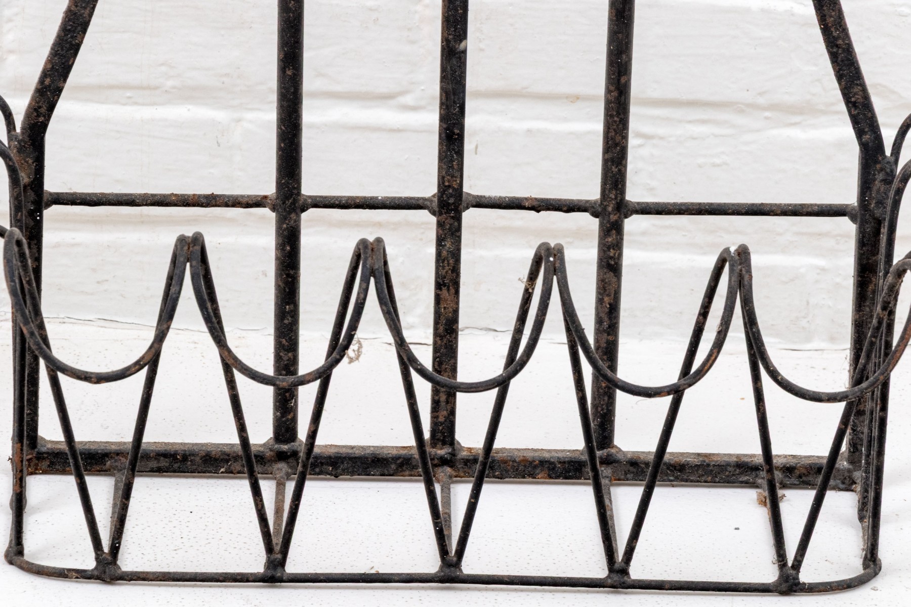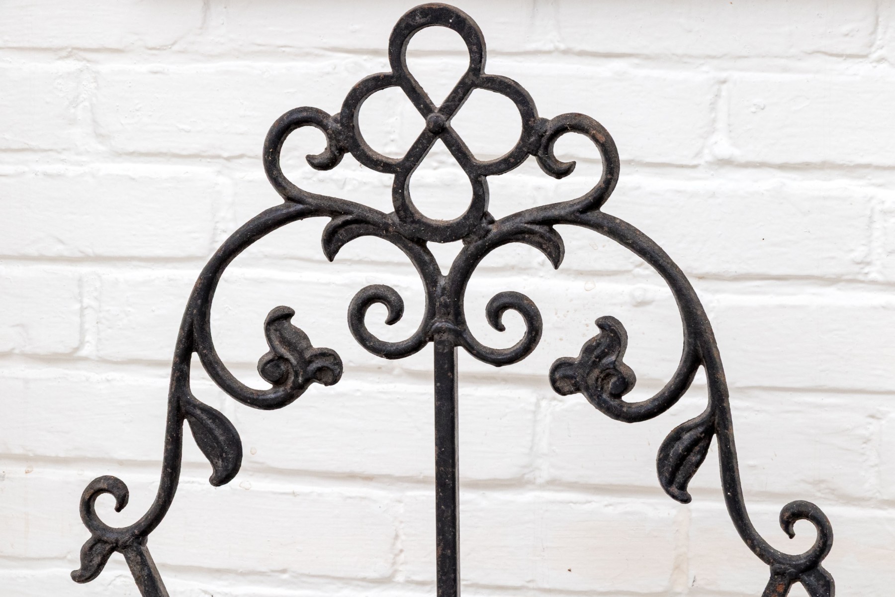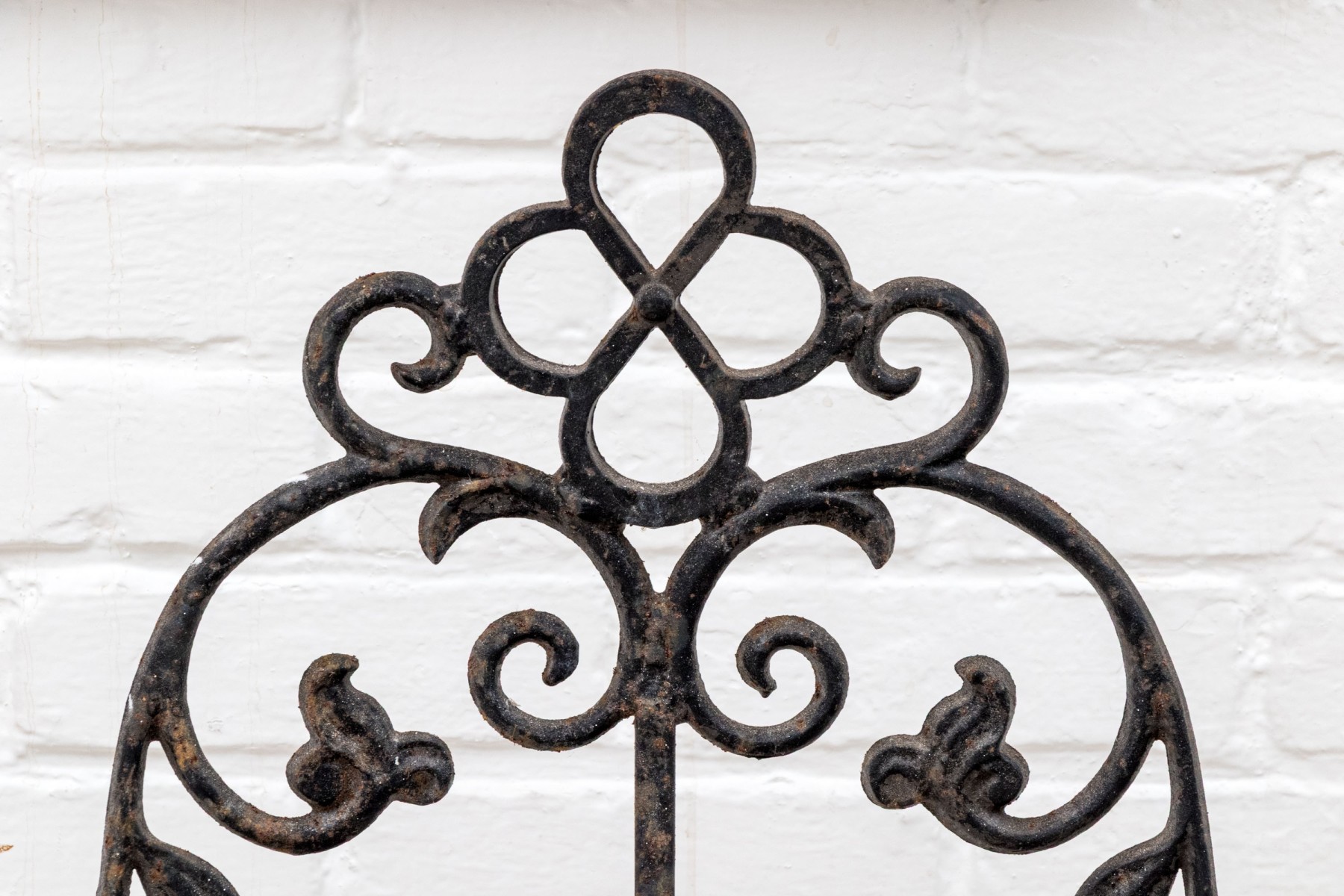A fabulous pair of black wrought iron wall planters with quatrefoil crests and arched foliate vines across the backs leading to arrow motif splats and scalloped wire borders around rectangular lower frames.