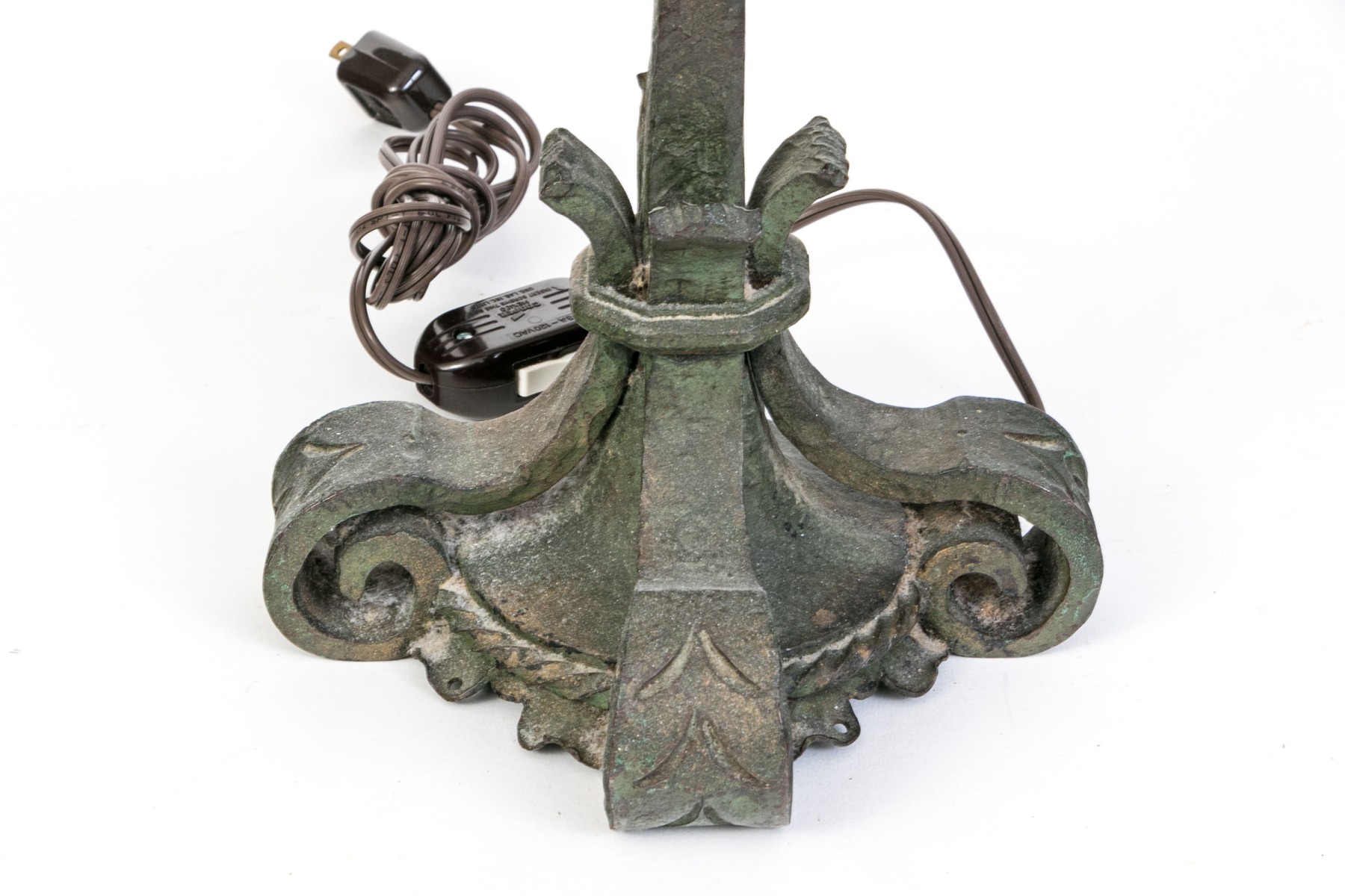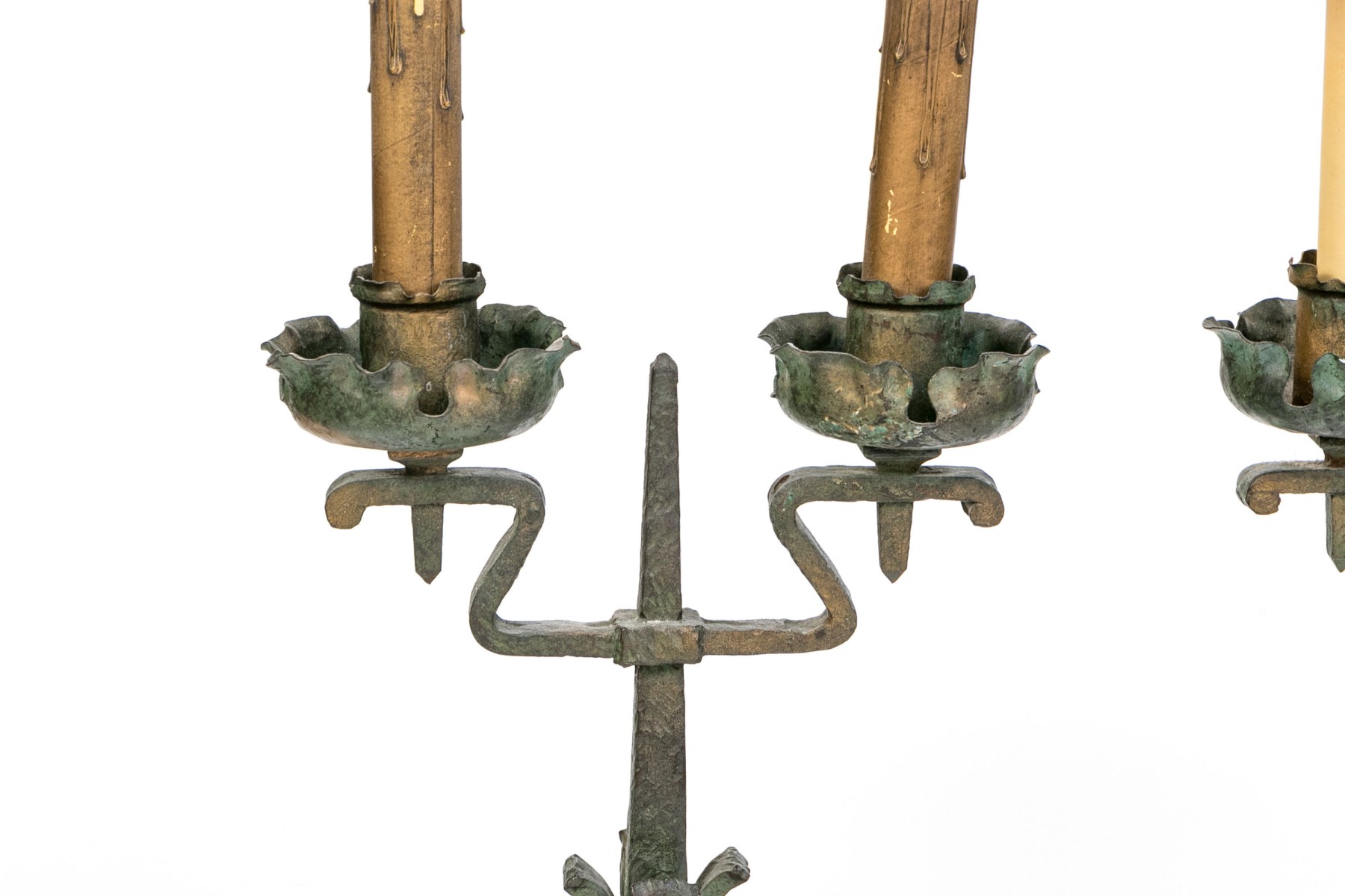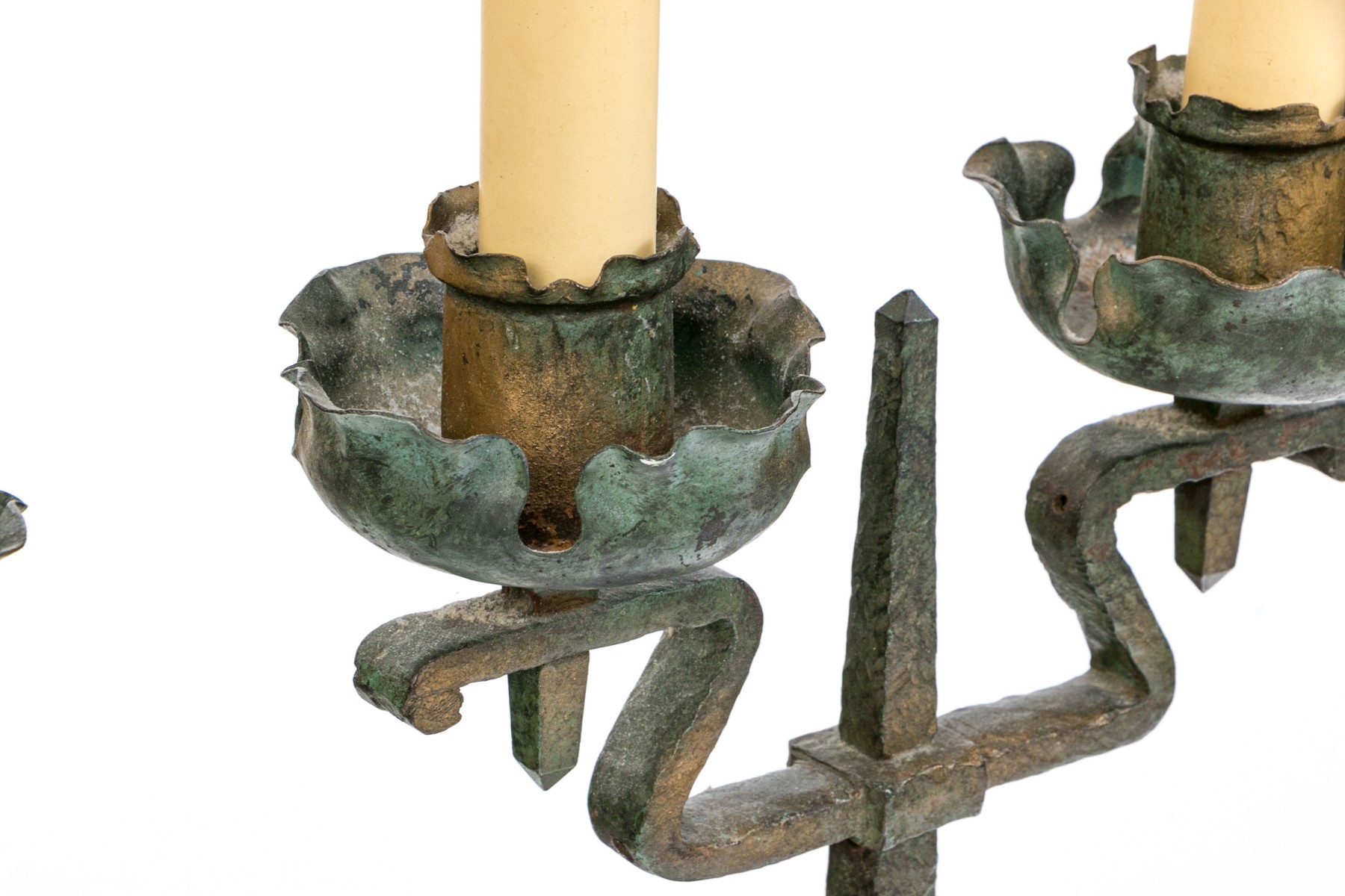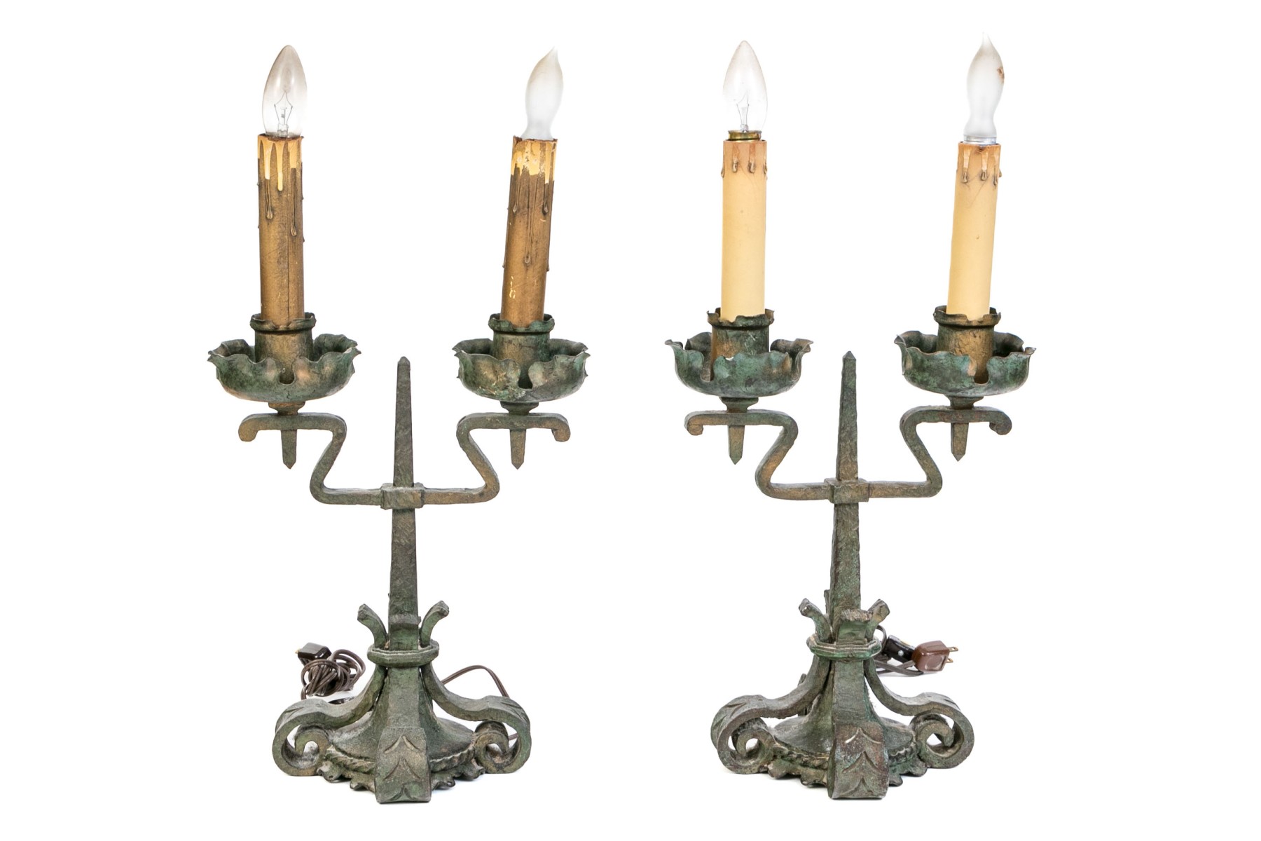 The iron two light candelabra form table lamps are charming. Raised on a base with four scrolled feet.