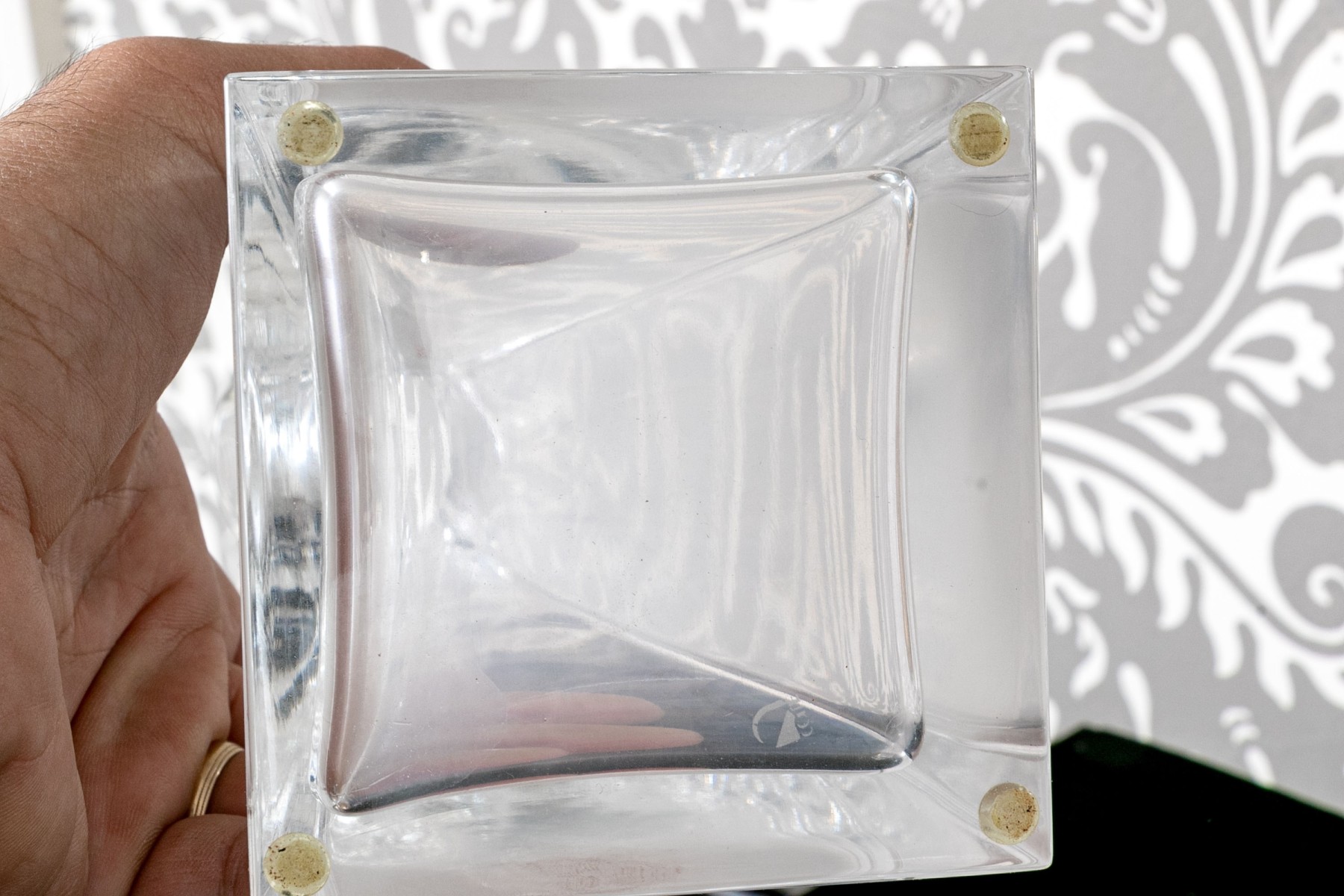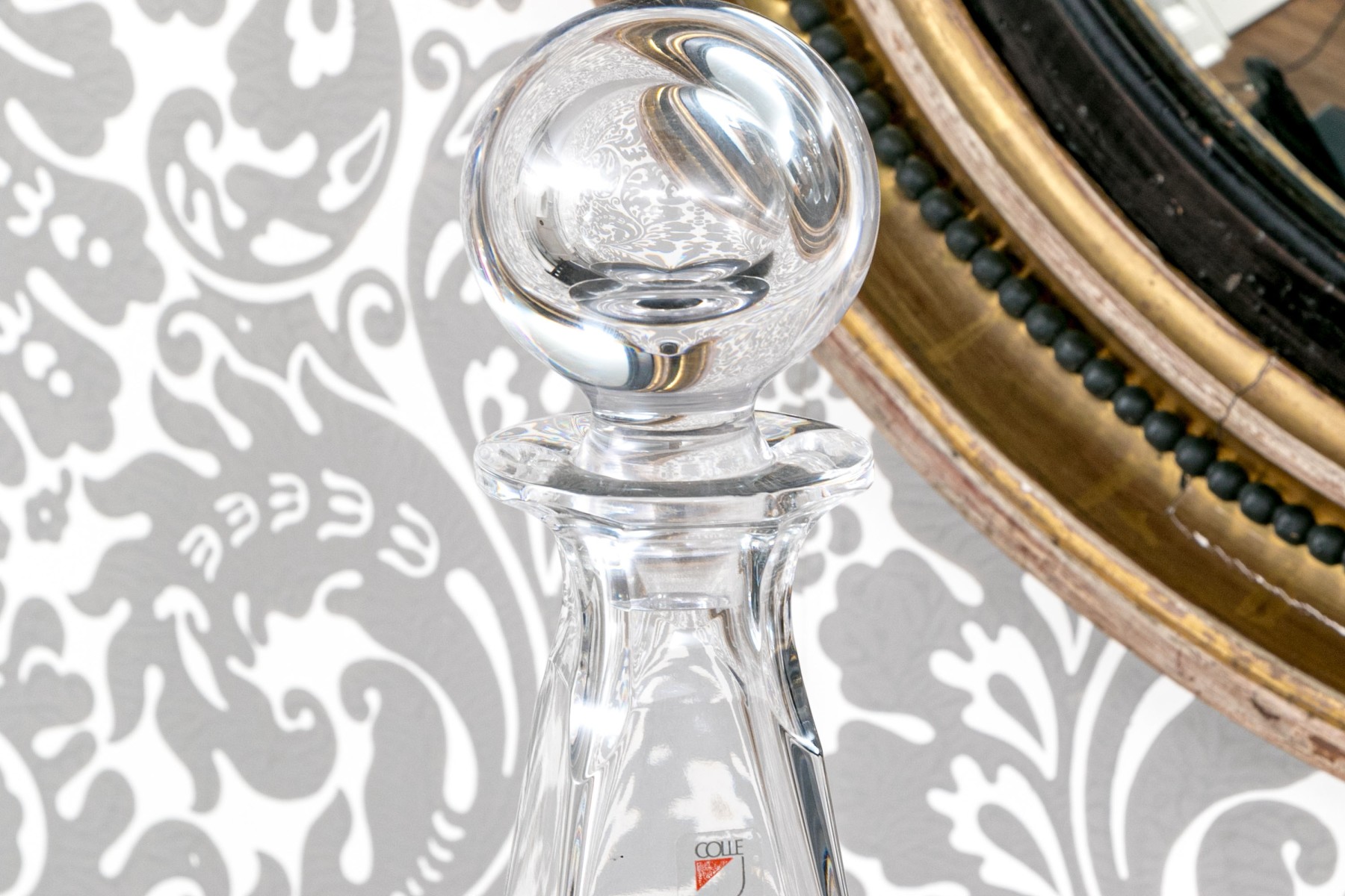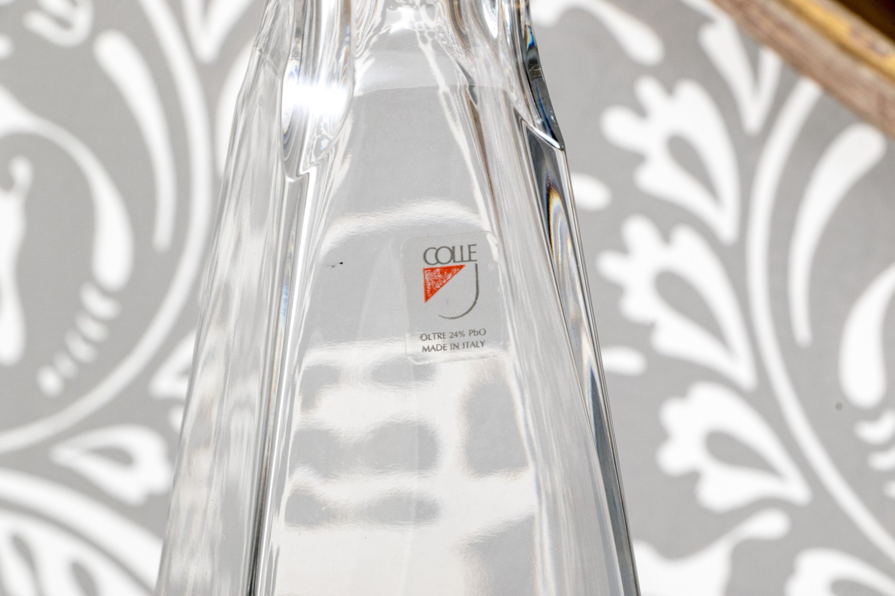 A gorgeous pair of Colle crystal decanters with a stylish Deco and Hollywood Regency elegance, sporting impactful square pyramidal forms with flared rims and sturdy bases. Marked underfoot. Topped with globular stoppers.