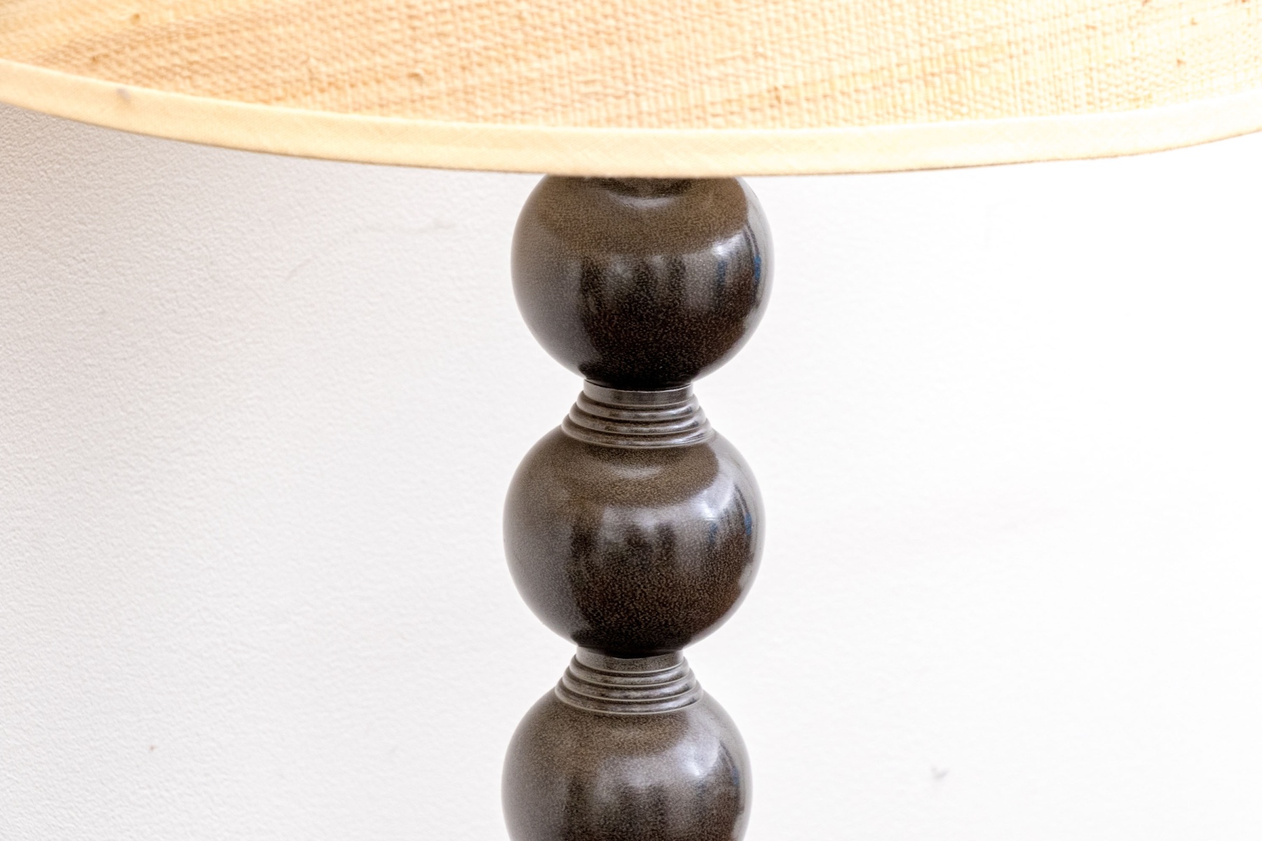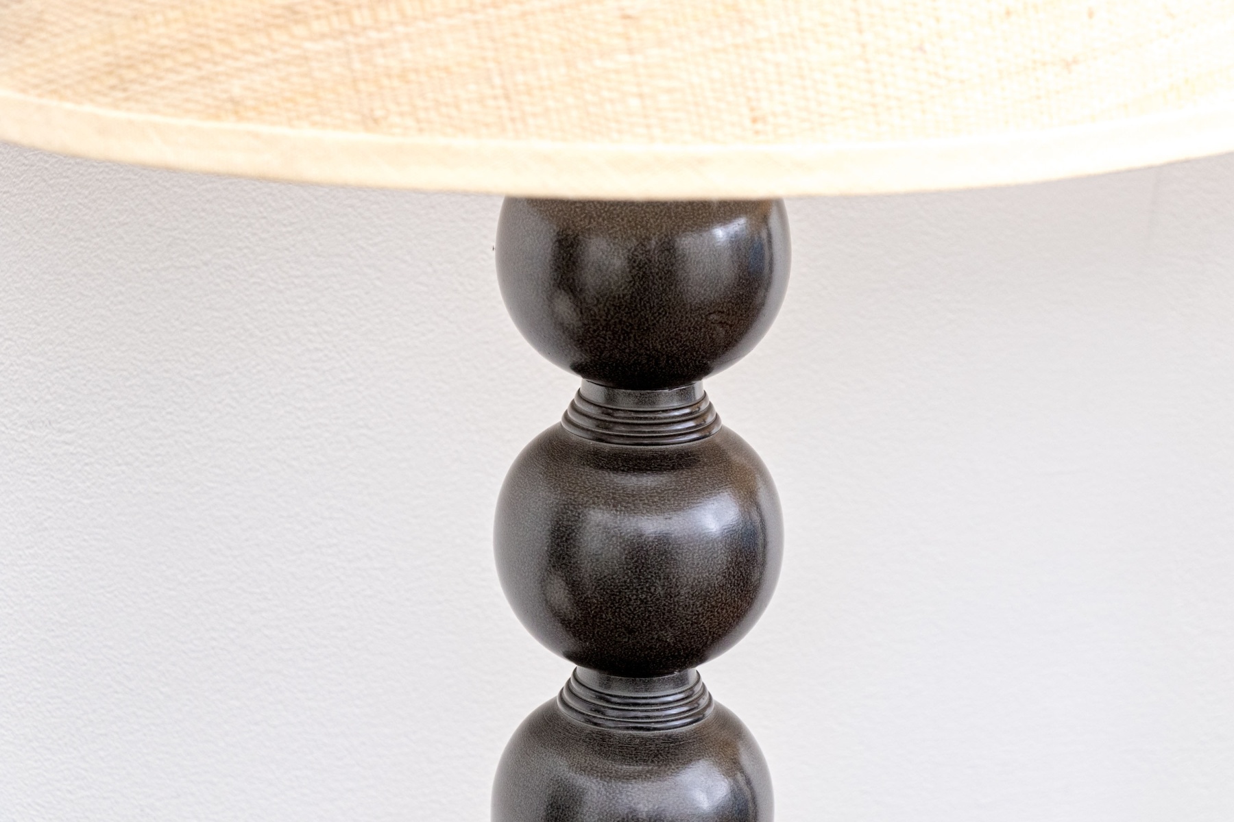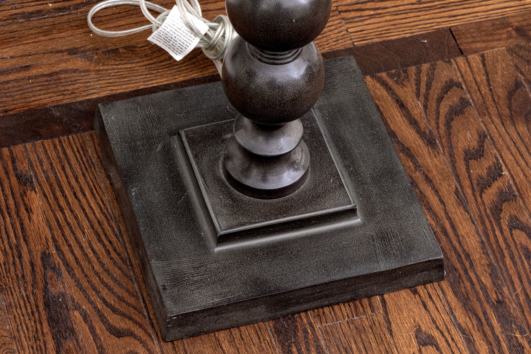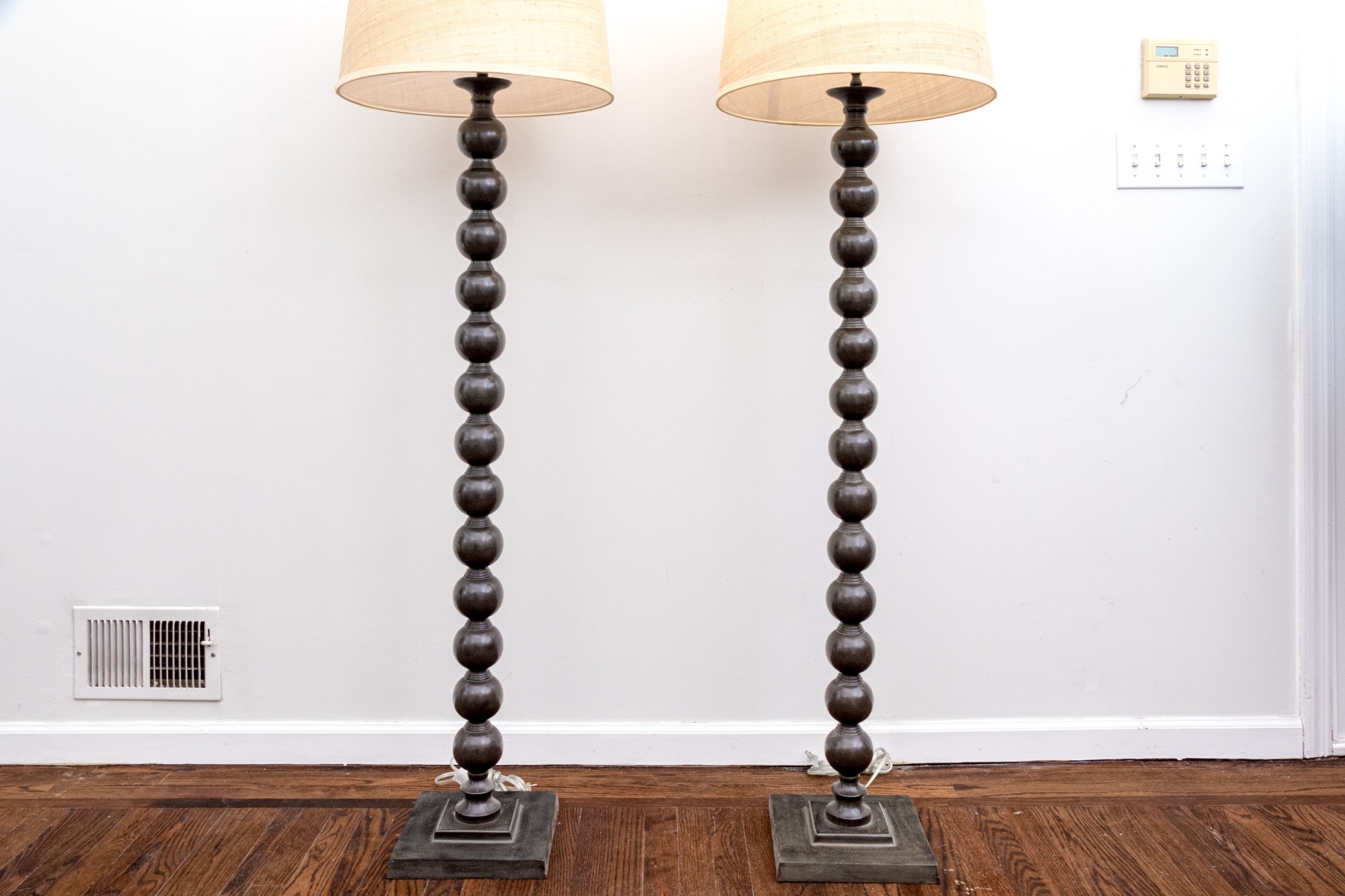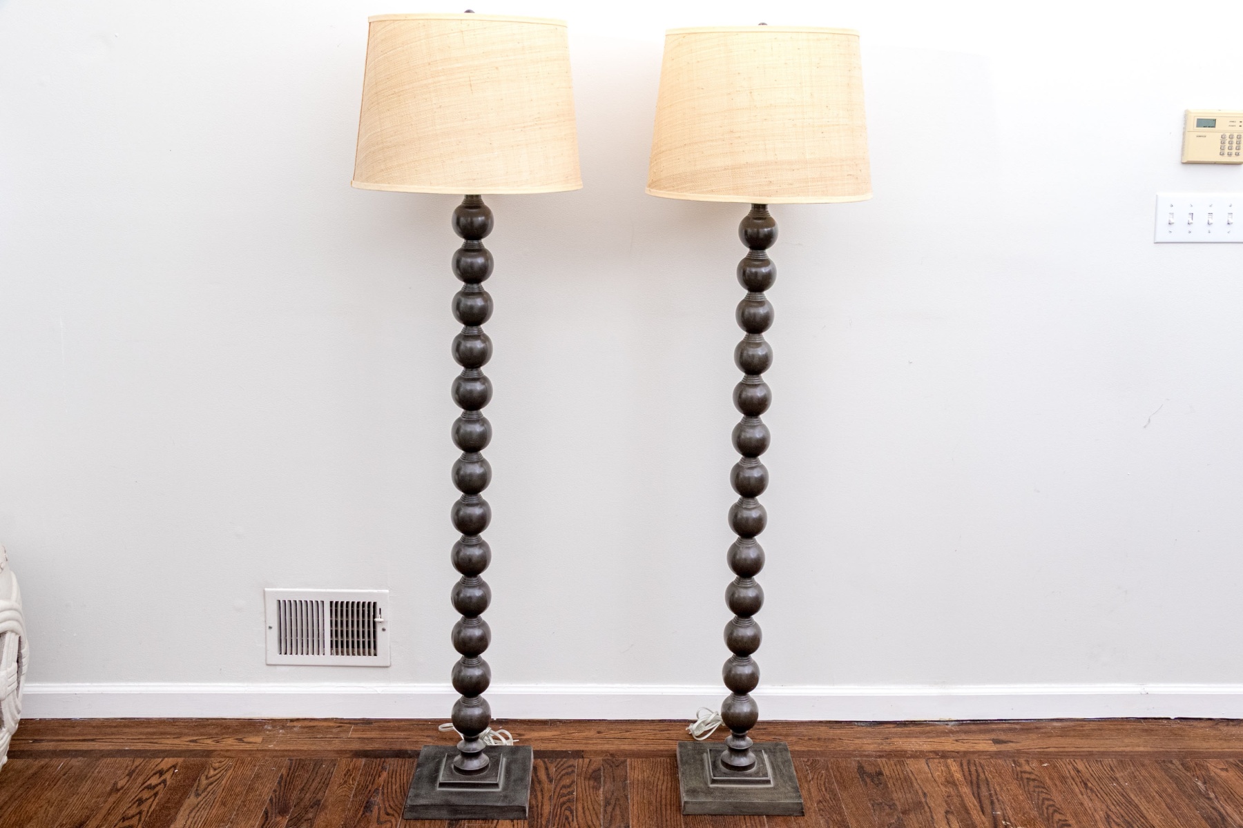 A fabulous pair of Jamie Young floor lamps raised on square bases with wonderful bobbin turned formed metallic posts in dark stained finishes. Each surmounted with slubby woven empire shades adding great texture.