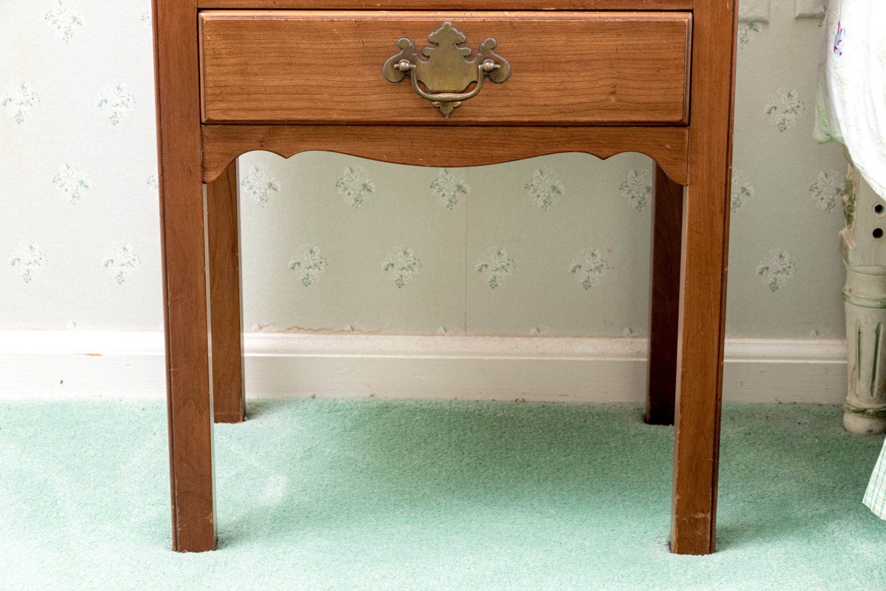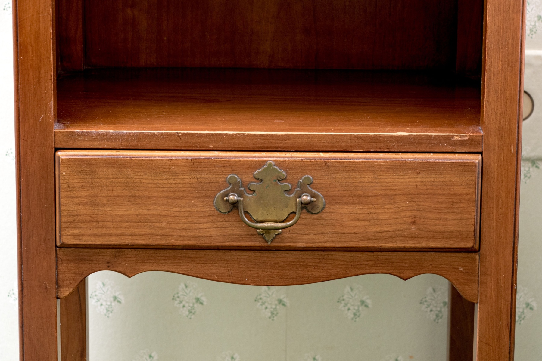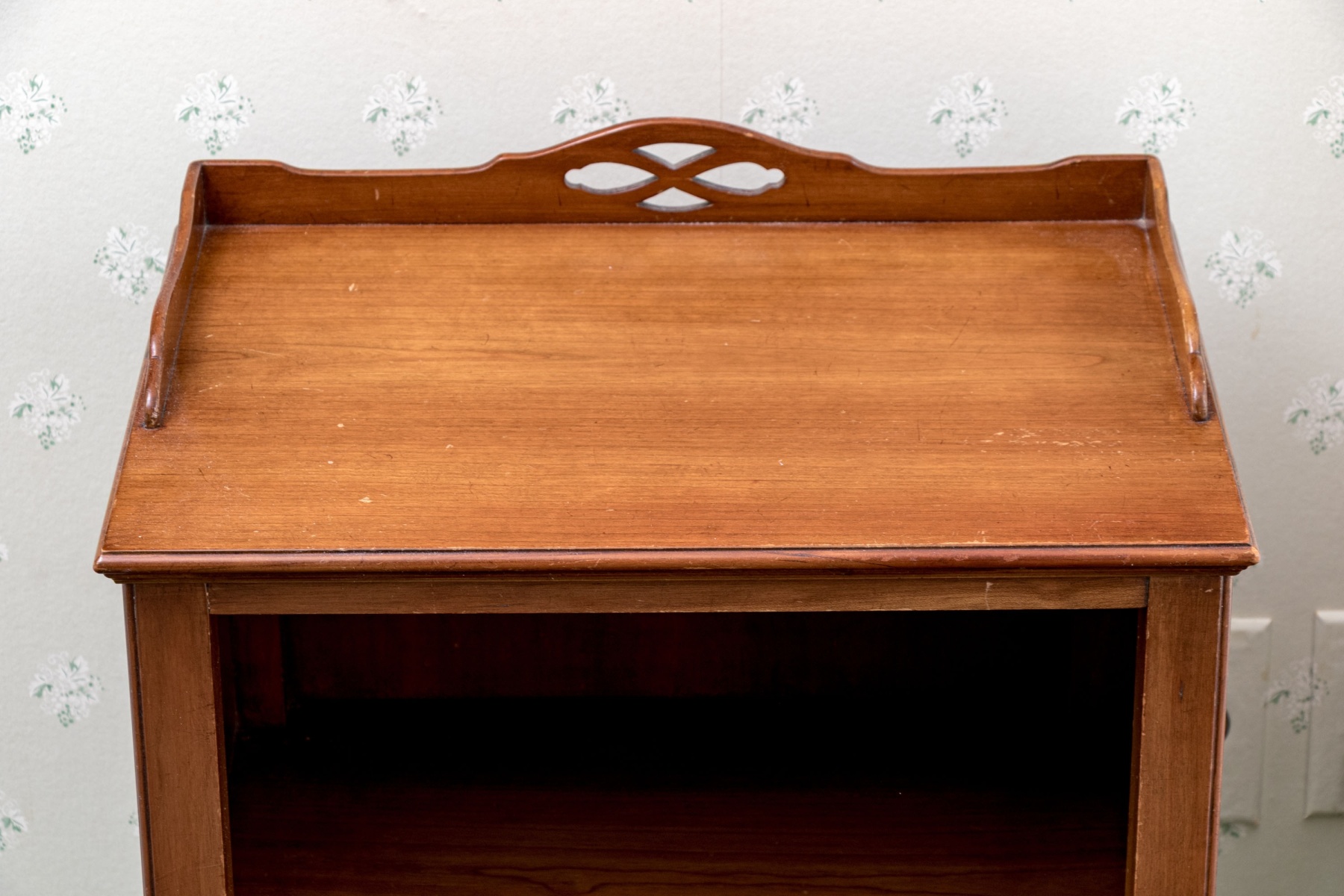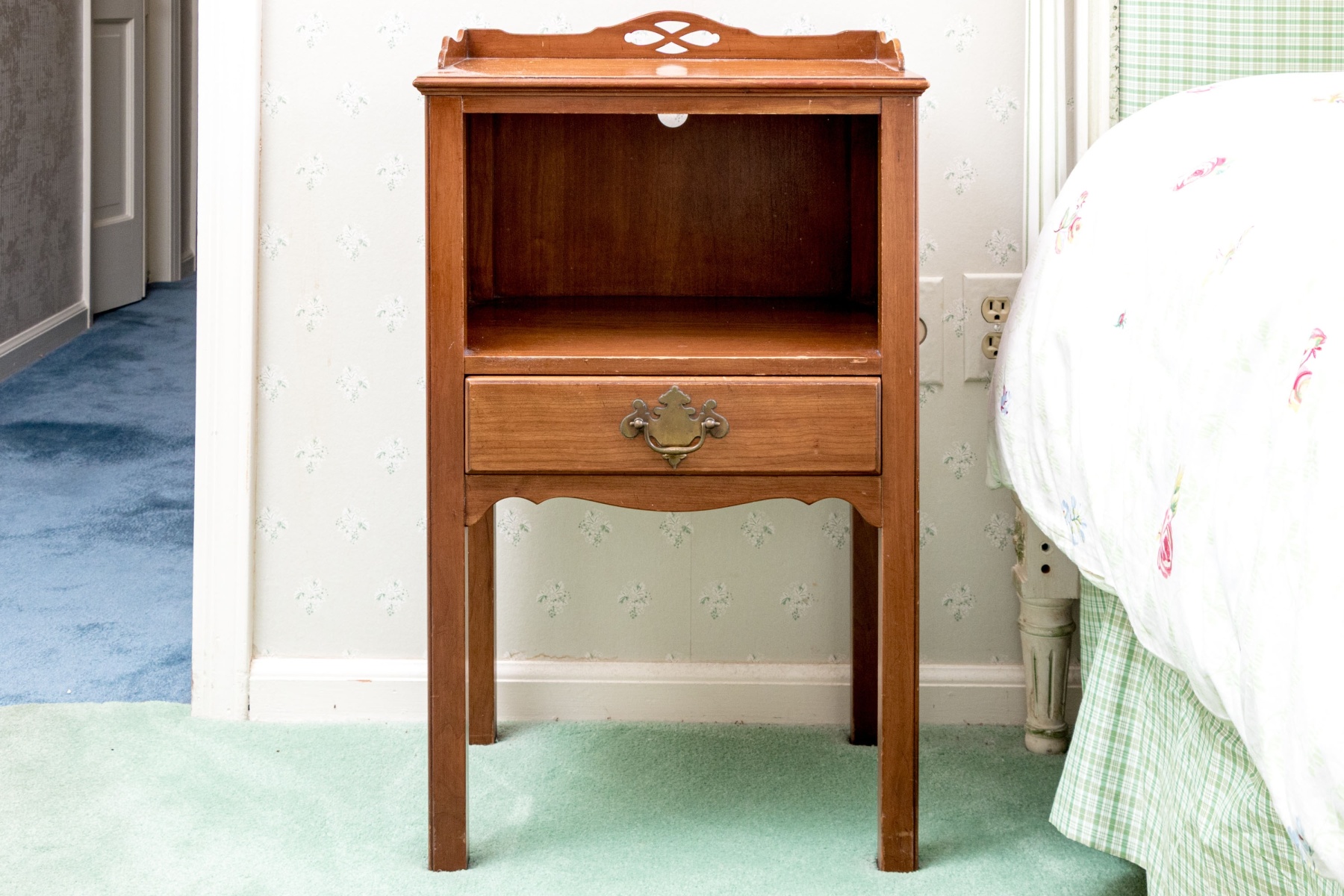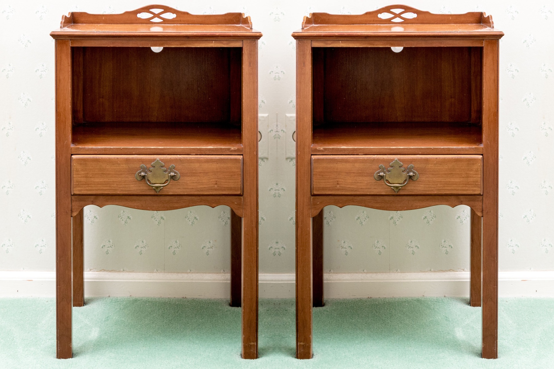 A handsome pair of Kindel Furniture nightstands with great Chippendale and Federal appeal, well crafted in warm-toned medium brown wood with square tops detailed with shapely three quarter galleries with pierced quatrefoil motifs. Below, spacious open compartments feature pierced backboards for media use. Each stand finishes with single drawers adorned with brass bail handles on batwing plaques, serpentine aprons, and straight legs.