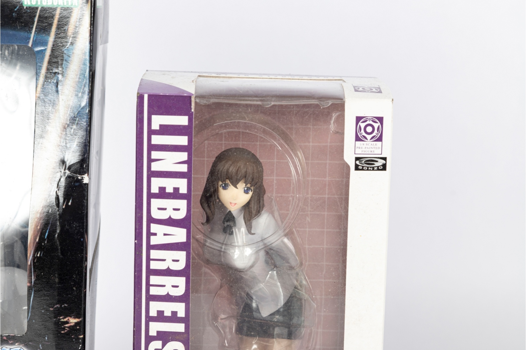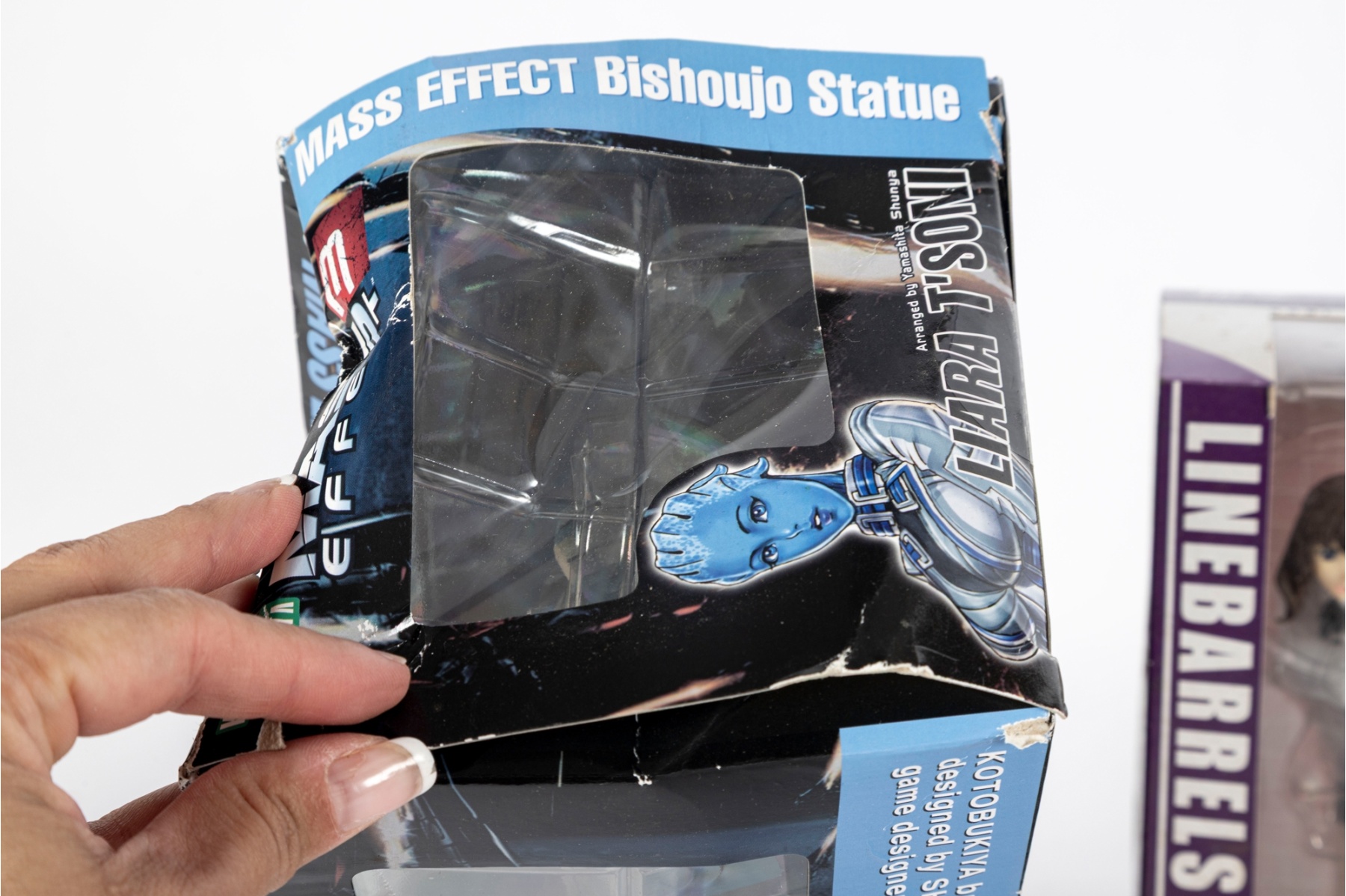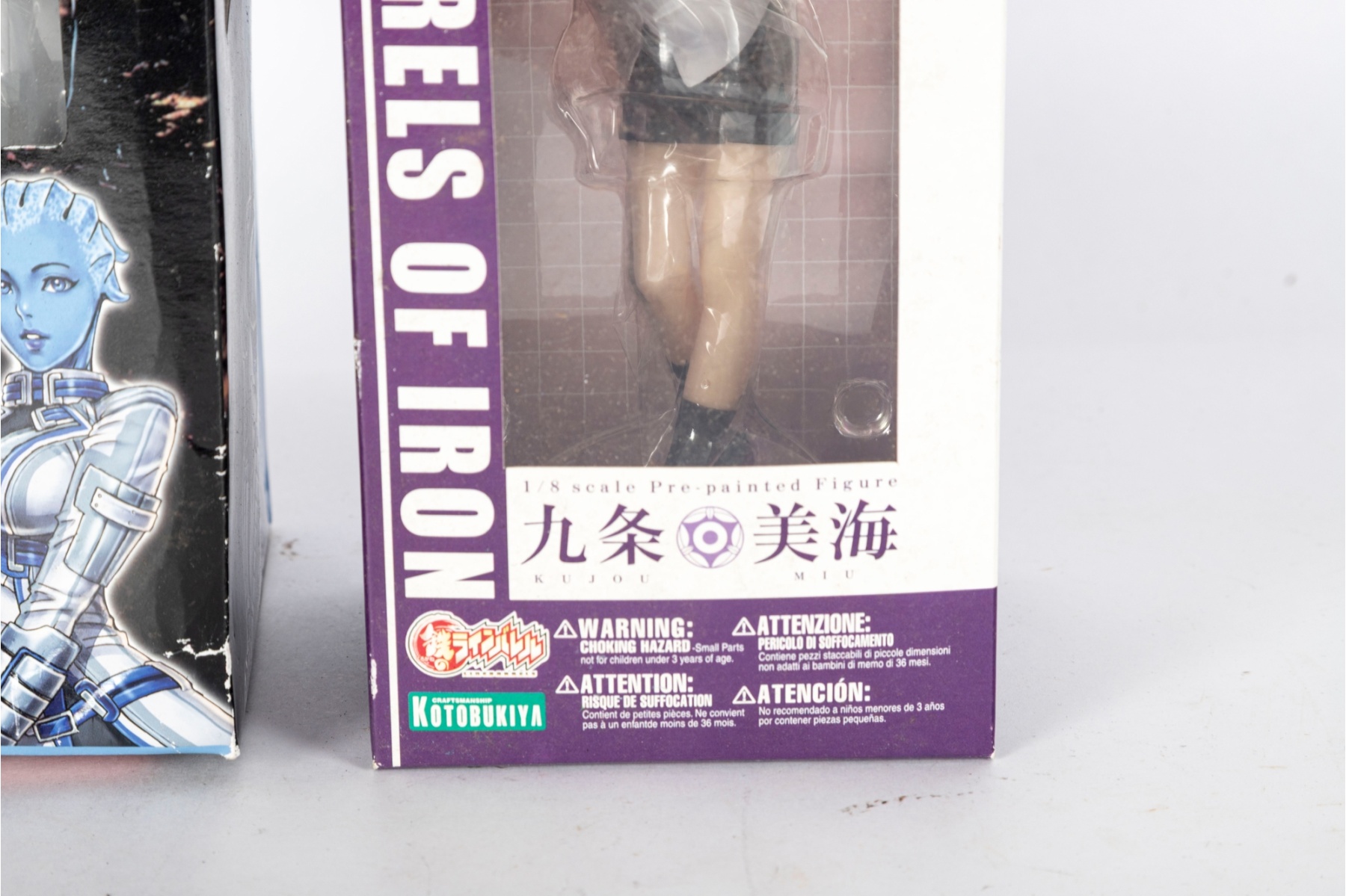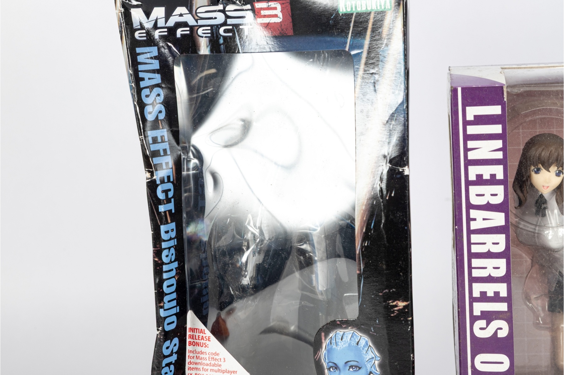 Liara T’Soni Bishoujo Statue--Figure not verified; box heavily worn and torn with creases and window damage.rnrnLinebarrels of Iron – Miu Kujou-Appears unused, box with light wear and creasing.