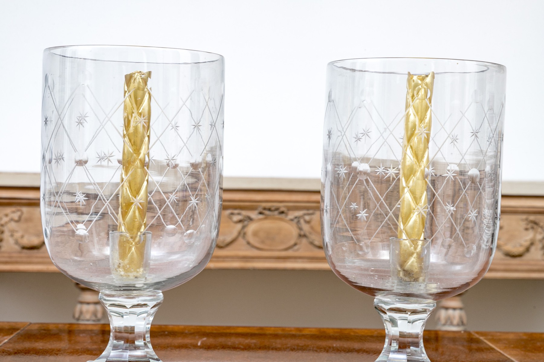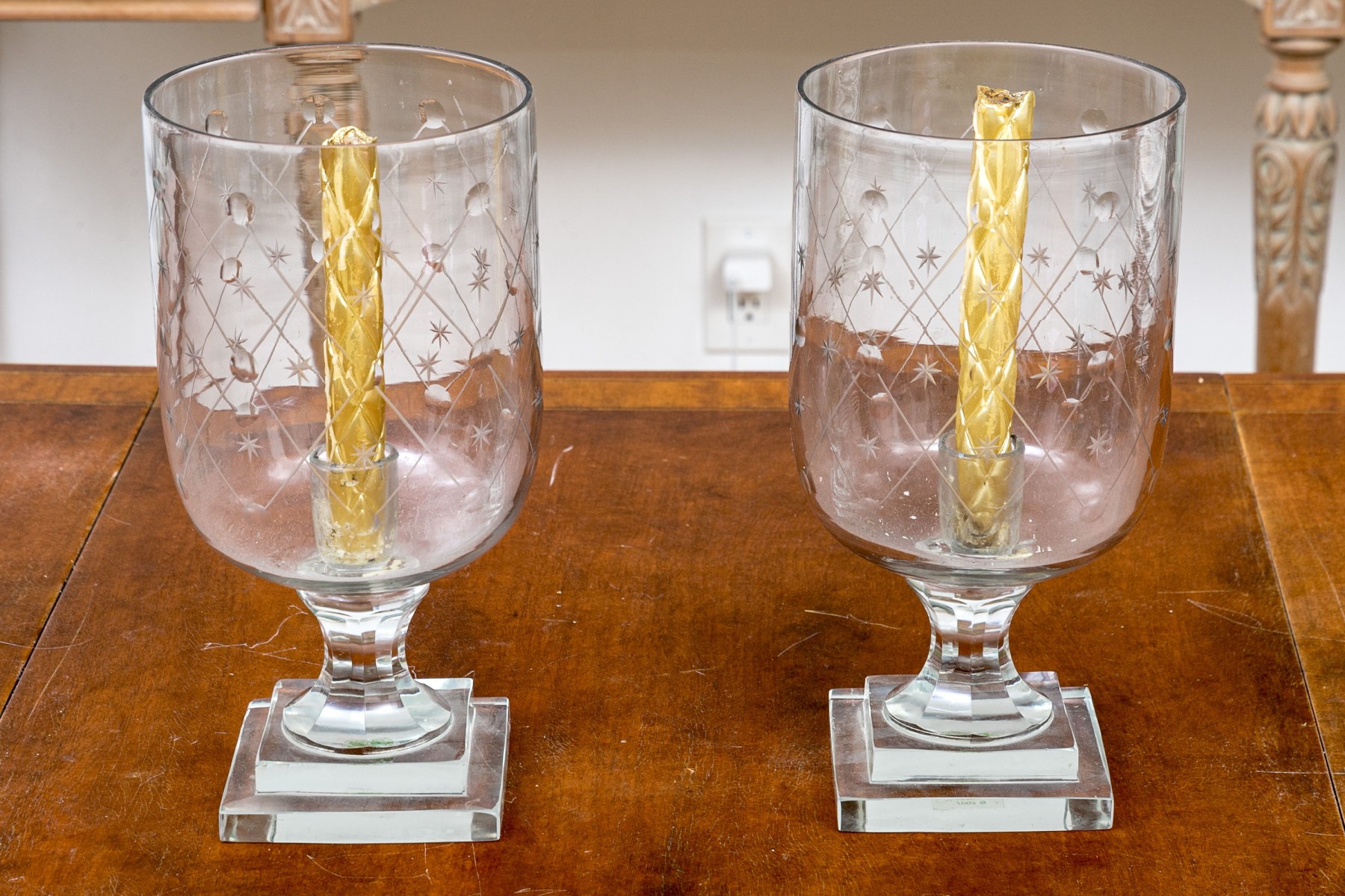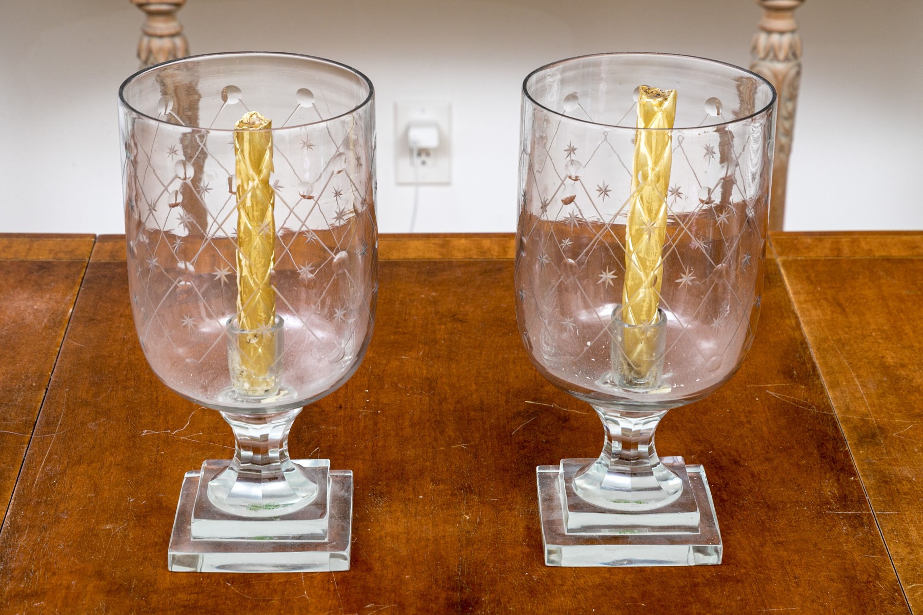 Pair of large hurricanes with etched glass comprised of stars, spheres and lattice decoration on a stepped square base.
