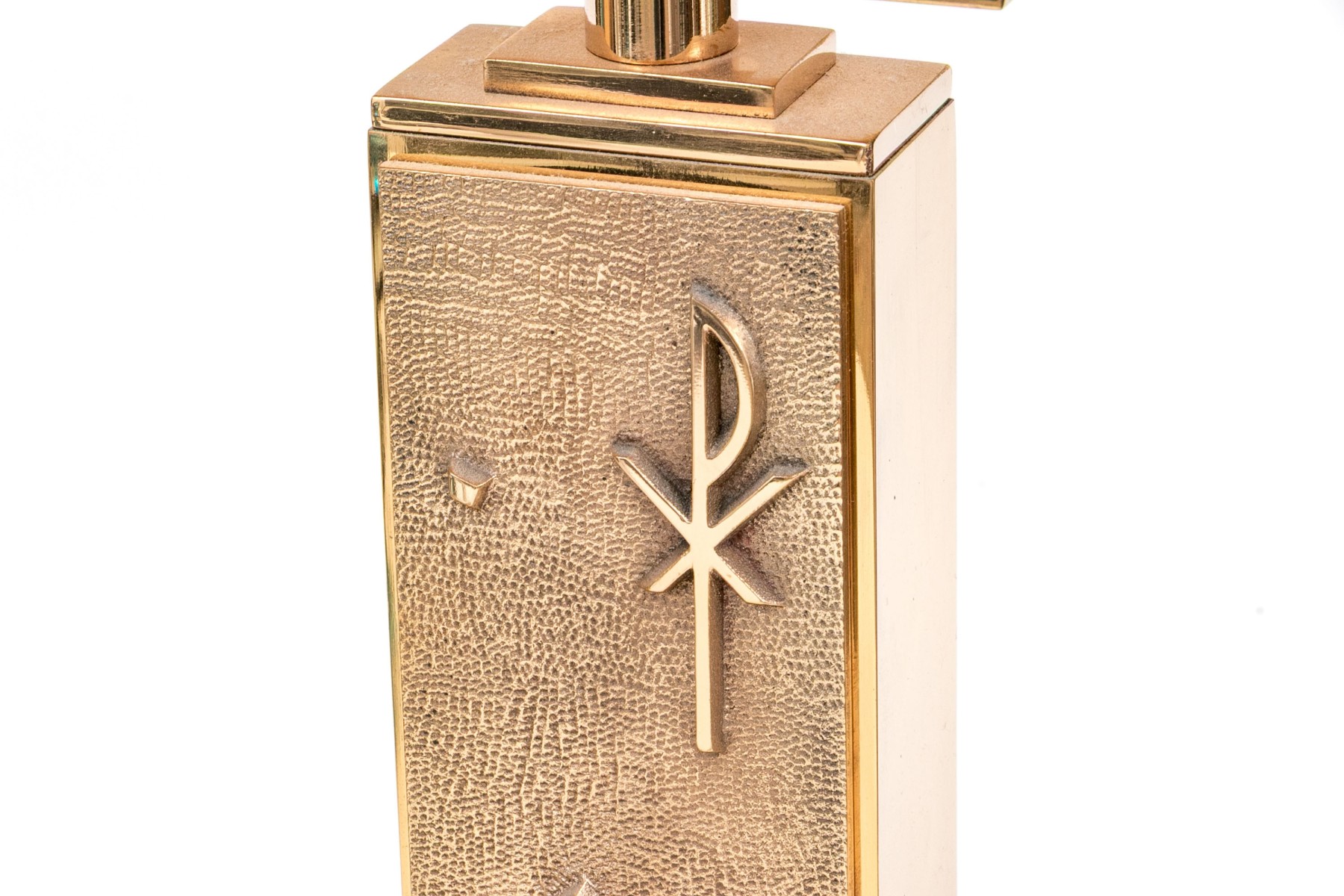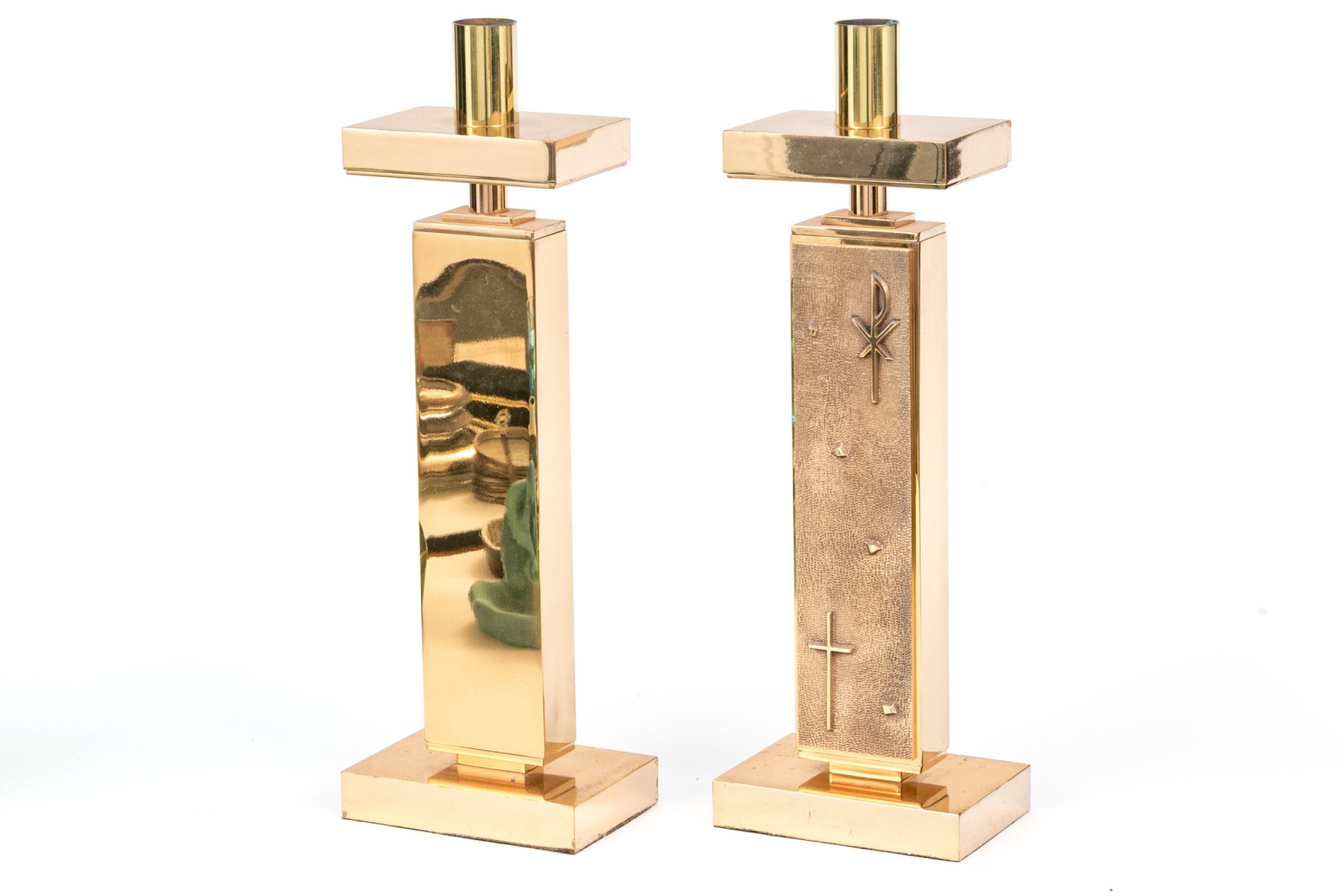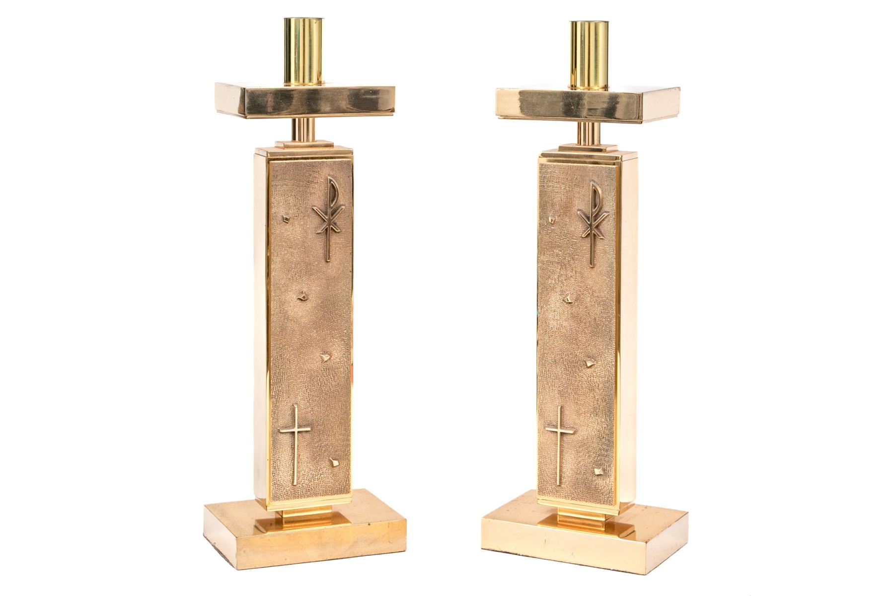 A striking pair of brass altar candlesticks designed with sleek cylindrical sconces and wide horizontal rectangular drip pans over vertical rectangular columns with chi-rho and cross motifs raised against textured grounds. Finished with rectangular block bases.