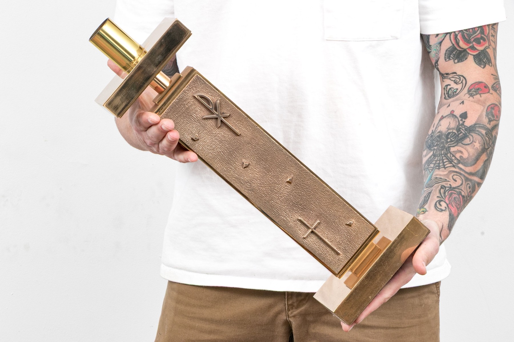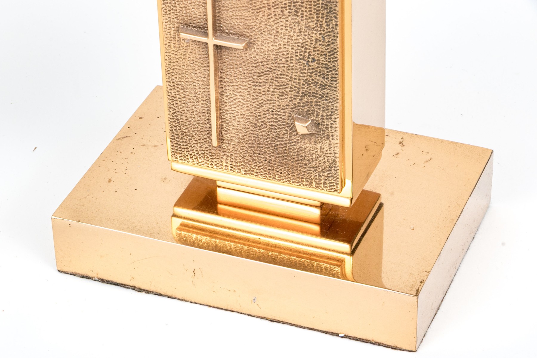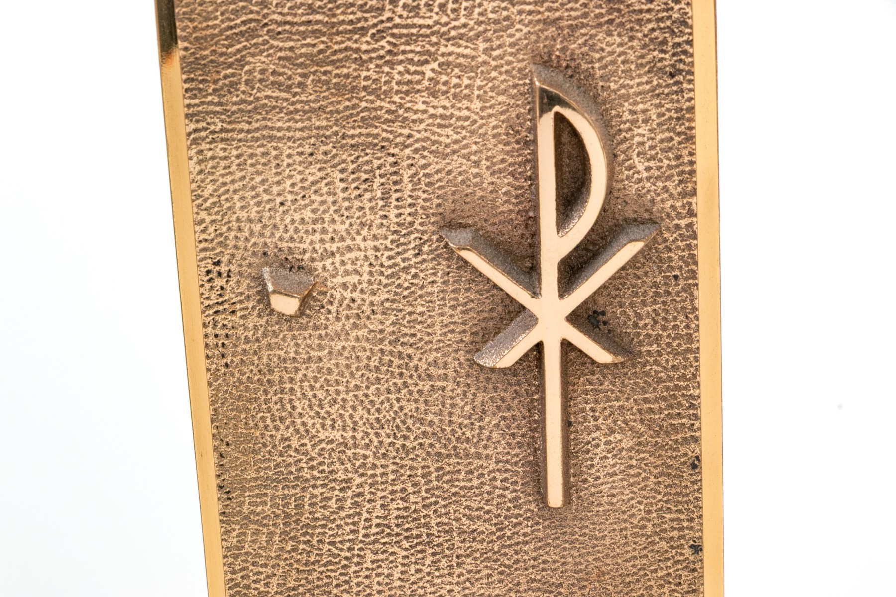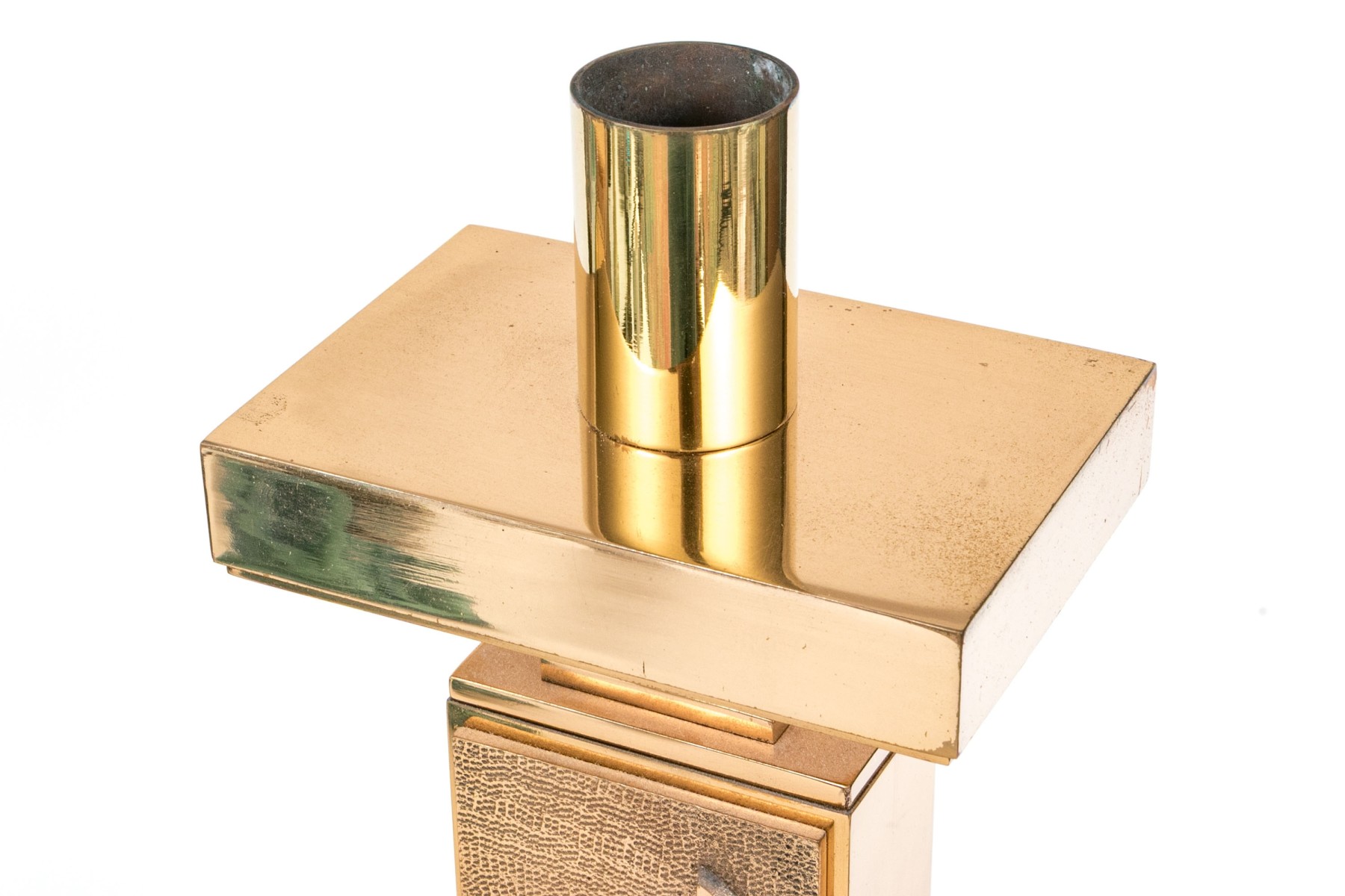 A striking pair of brass altar candlesticks designed with sleek cylindrical sconces and wide horizontal rectangular drip pans over vertical rectangular columns with chi-rho and cross motifs raised against textured grounds. Finished with rectangular block bases.