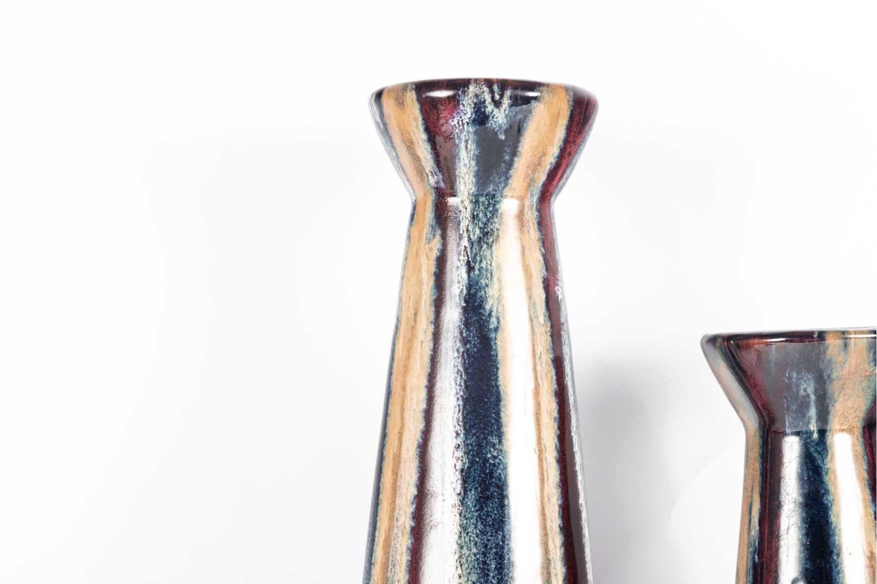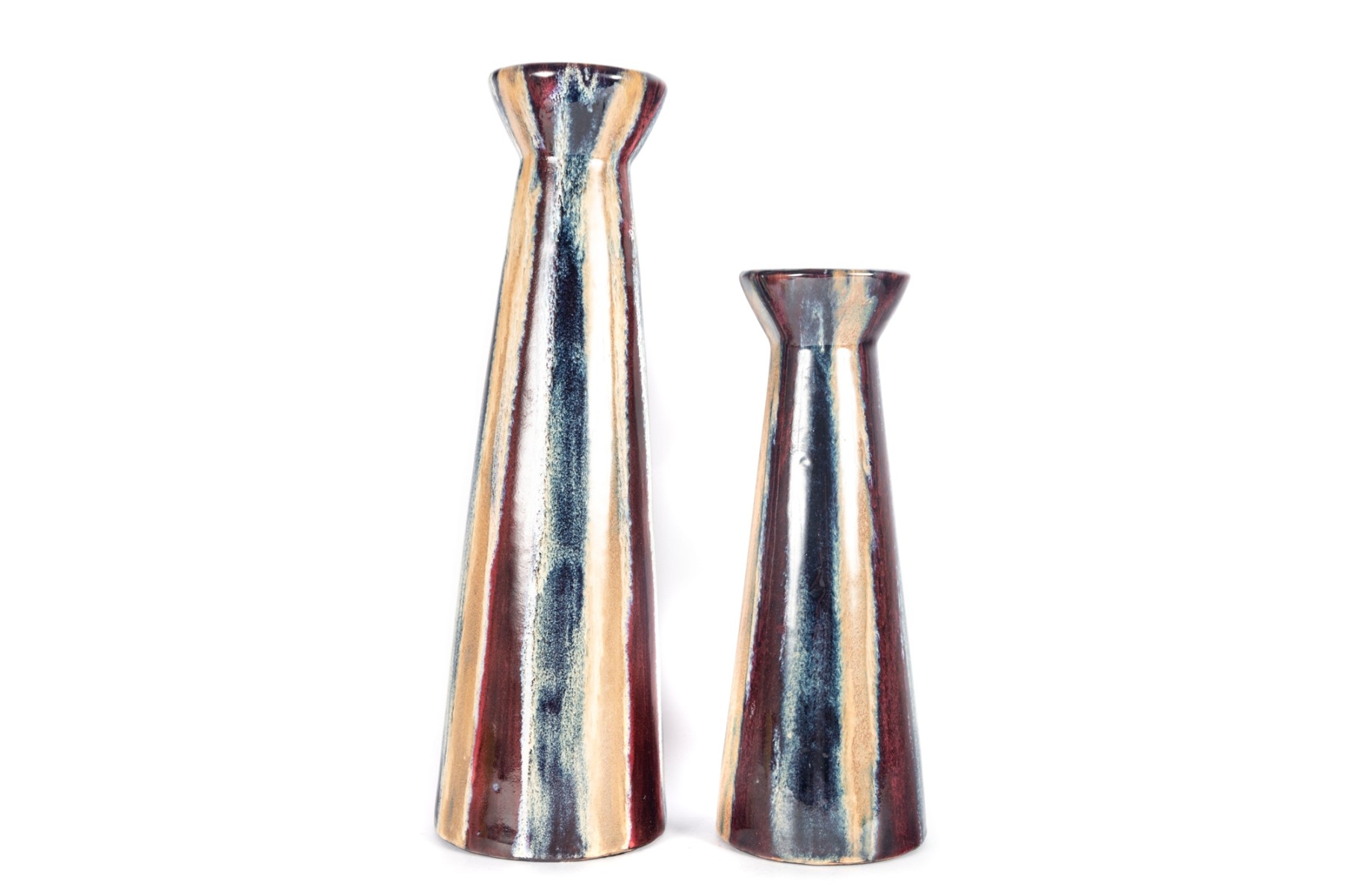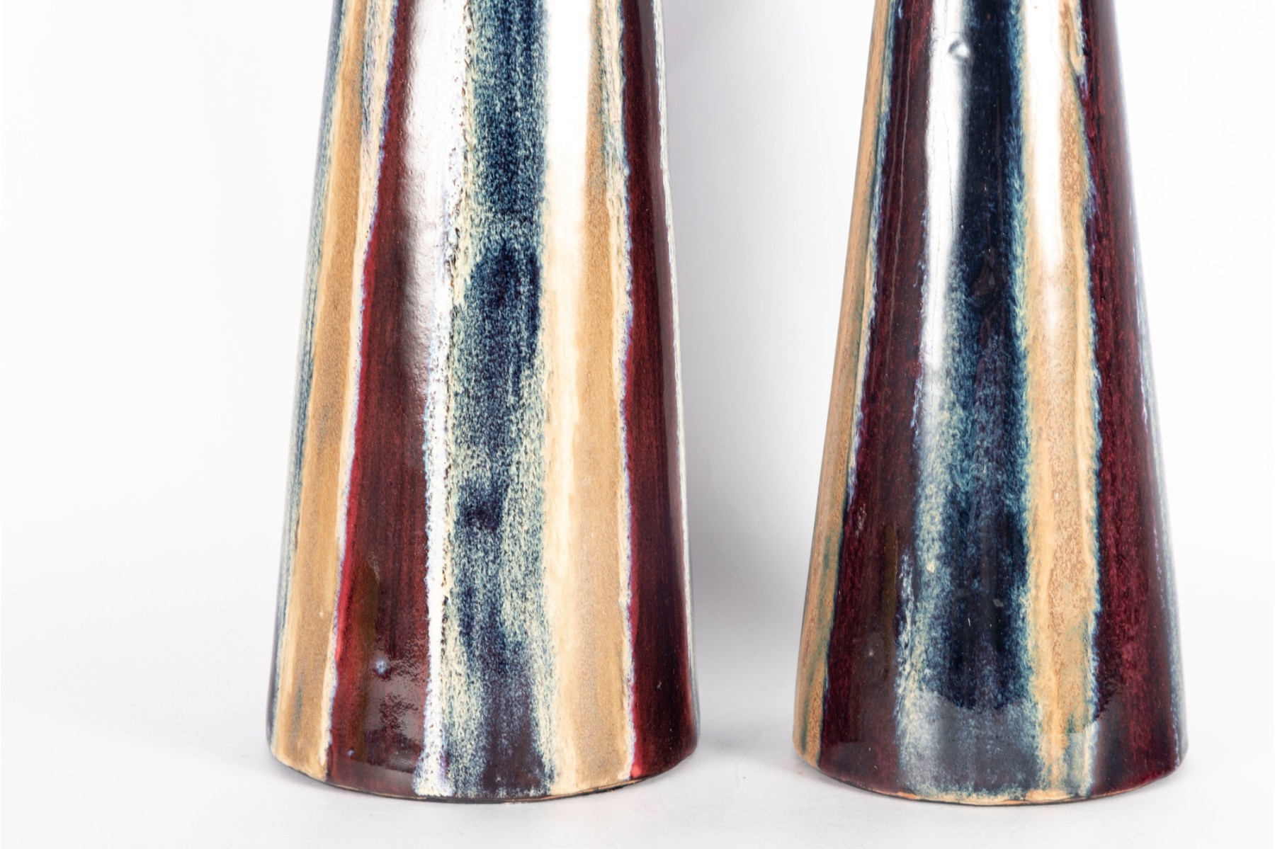 A pair of decorative pottery candlestick towers crafted from fine ceramic and glazed heavily with a glossy, multi-colored finish. Alternating sizes.
