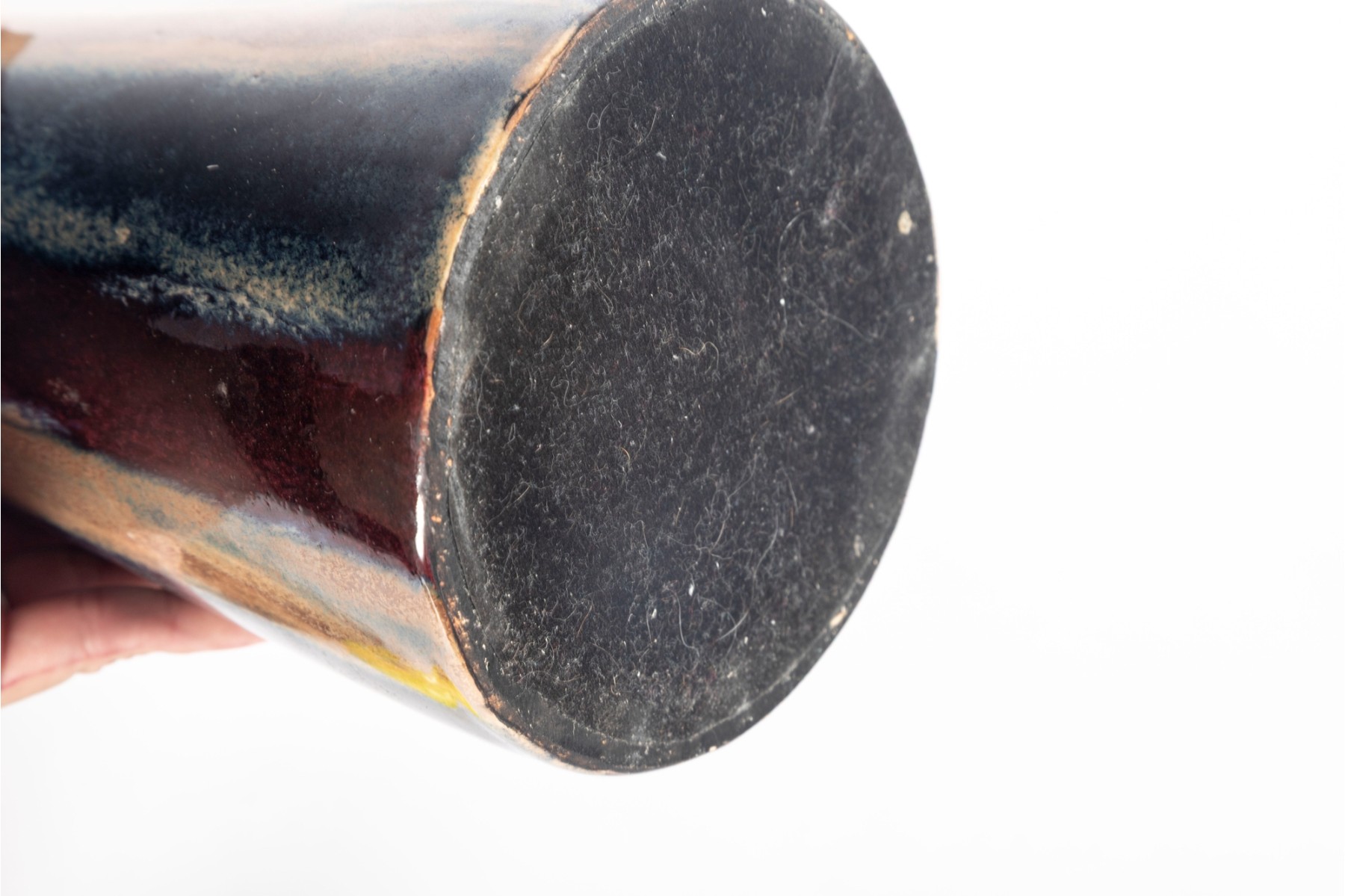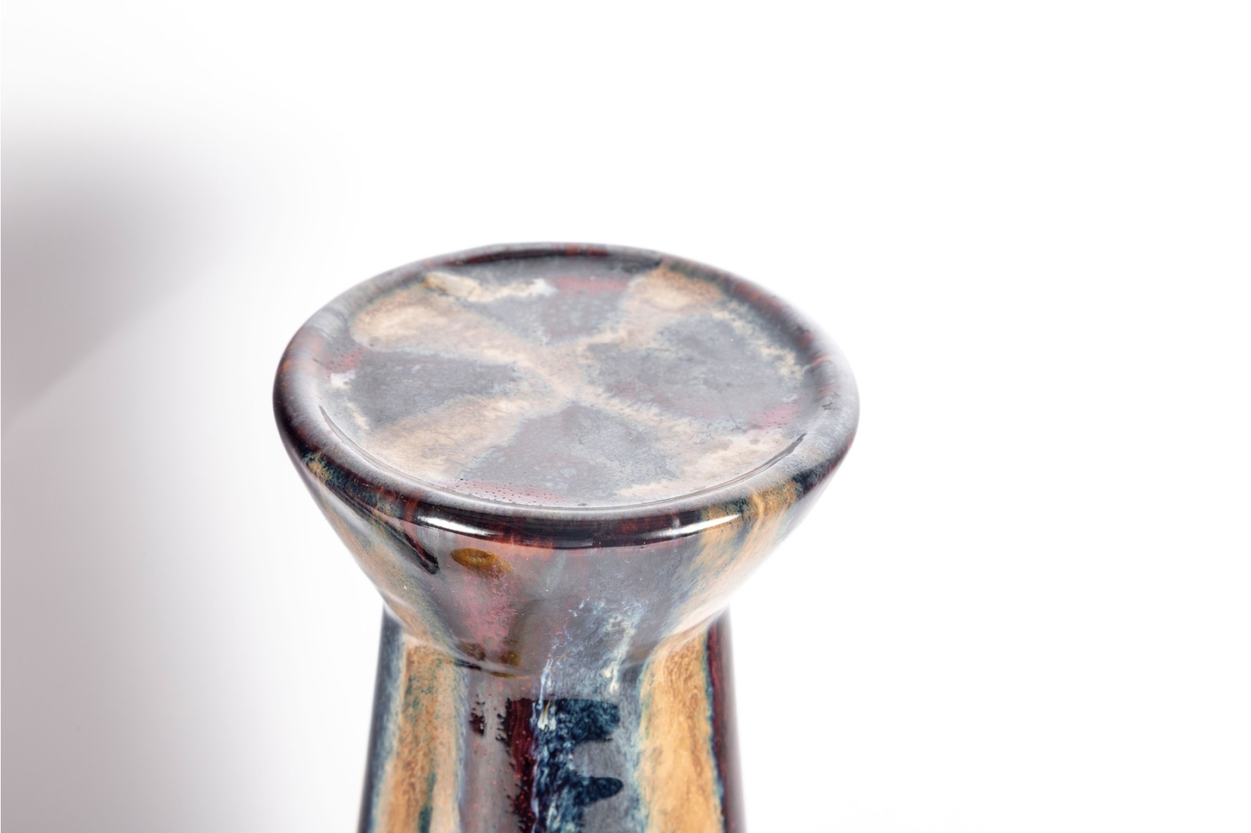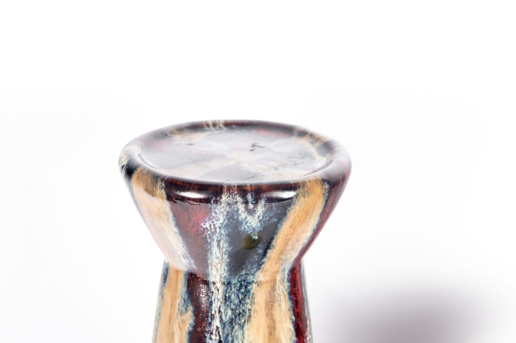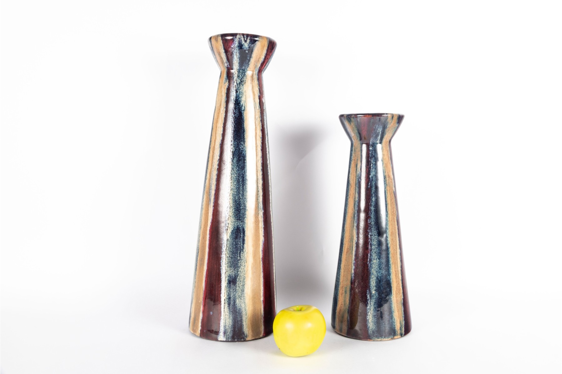 A pair of decorative pottery candlestick towers crafted from fine ceramic and glazed heavily with a glossy, multi-colored finish. Alternating sizes.