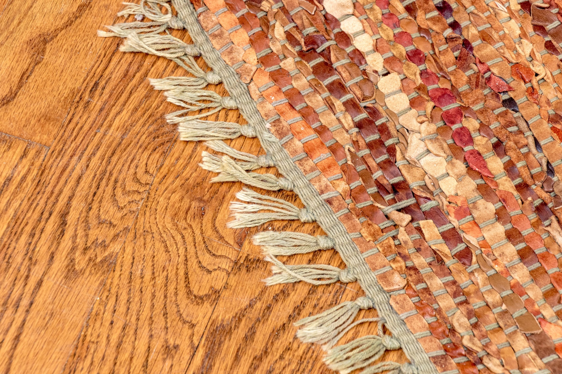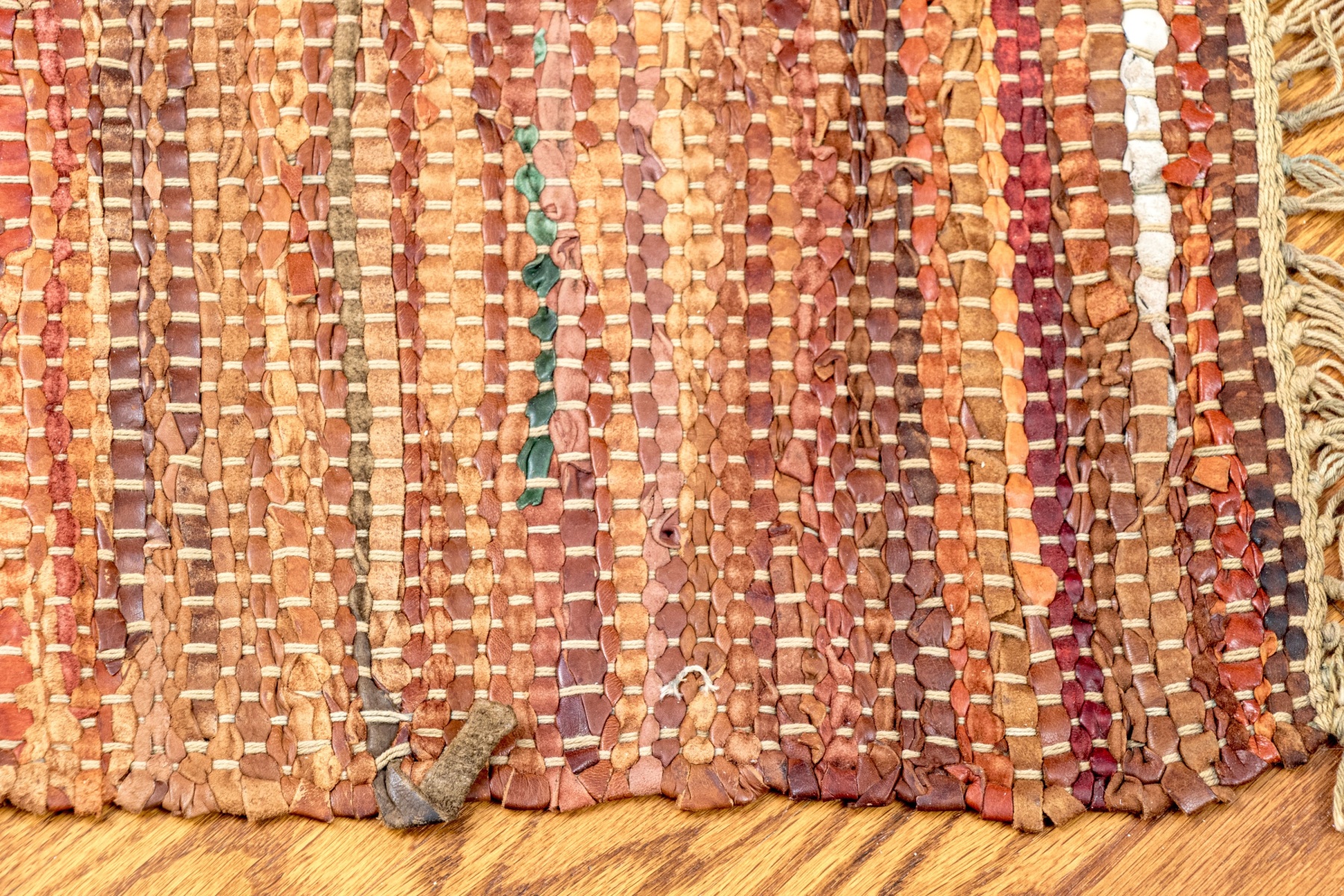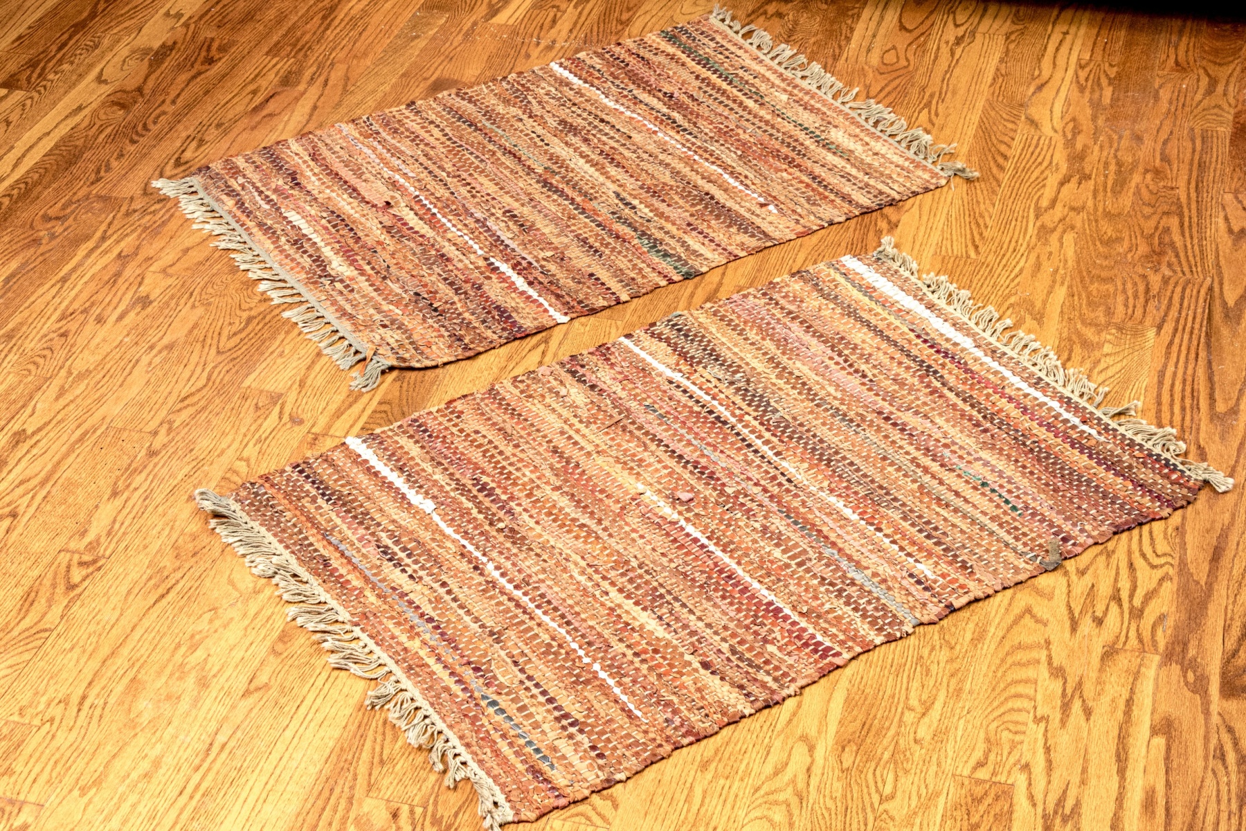 A stylish pair of chindi dhurries incorporating strips of colorful fabric and leather in earthy and autumnal hues for great texture and visual interest. Finished with fringes on the short sides.
