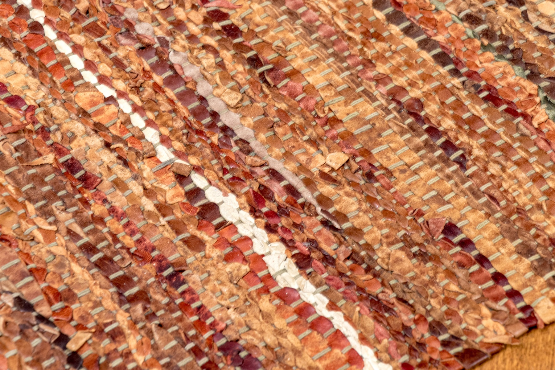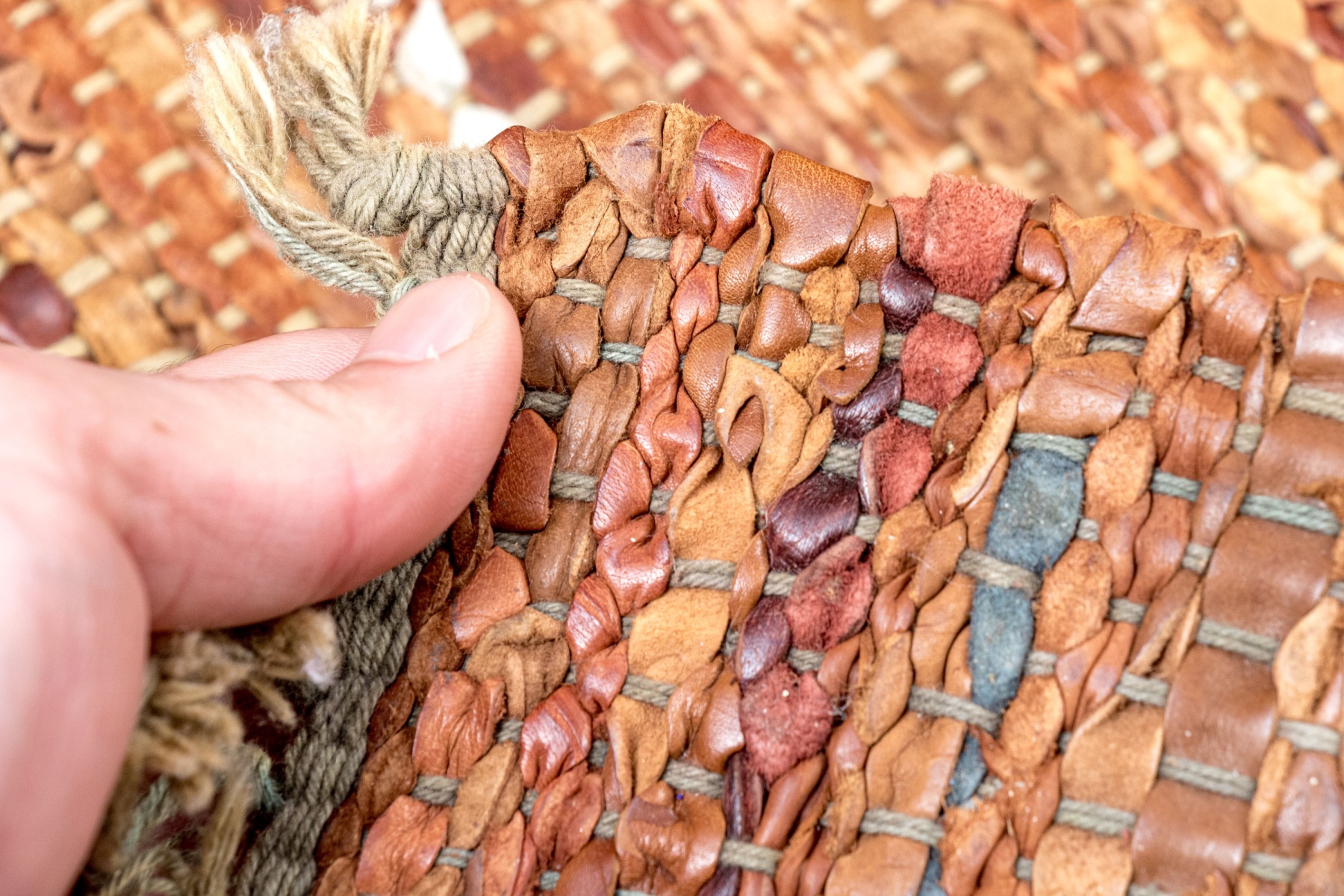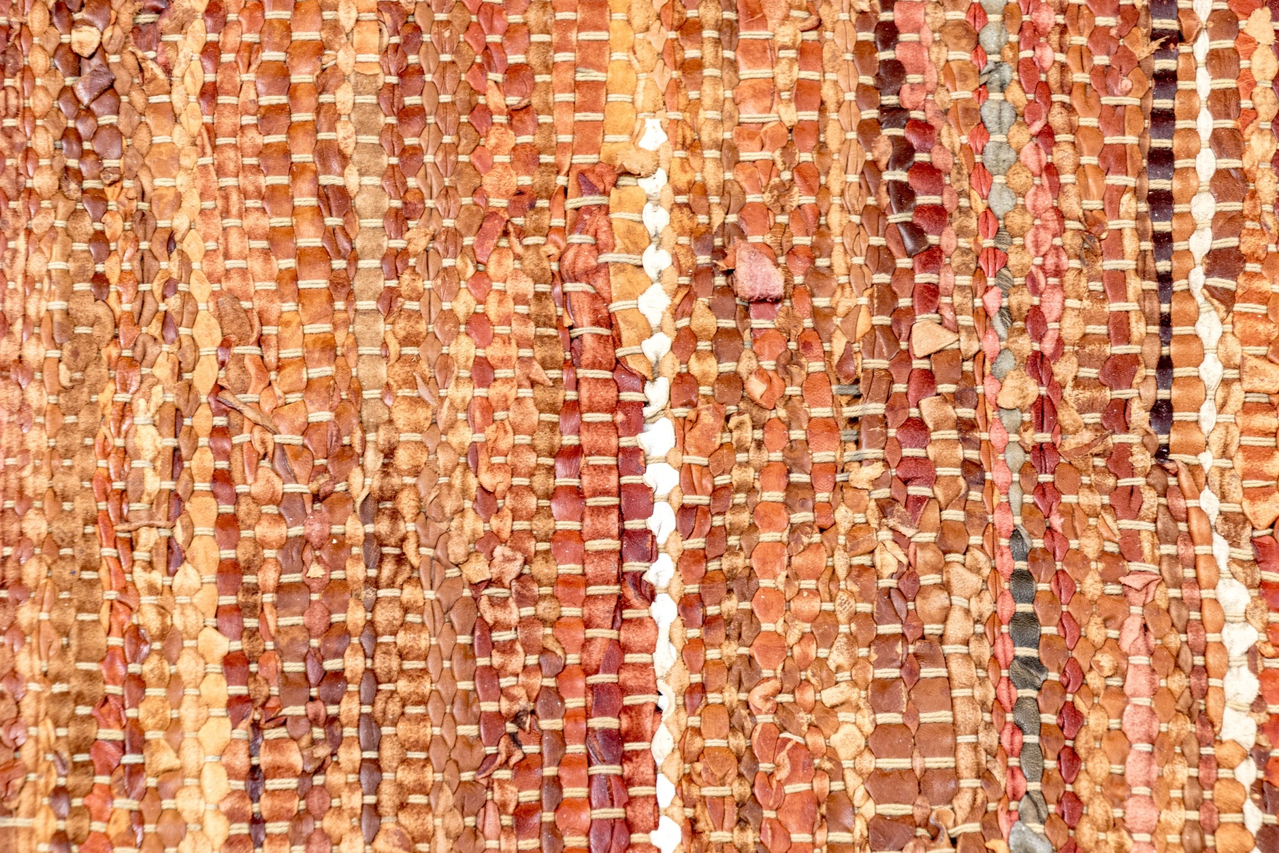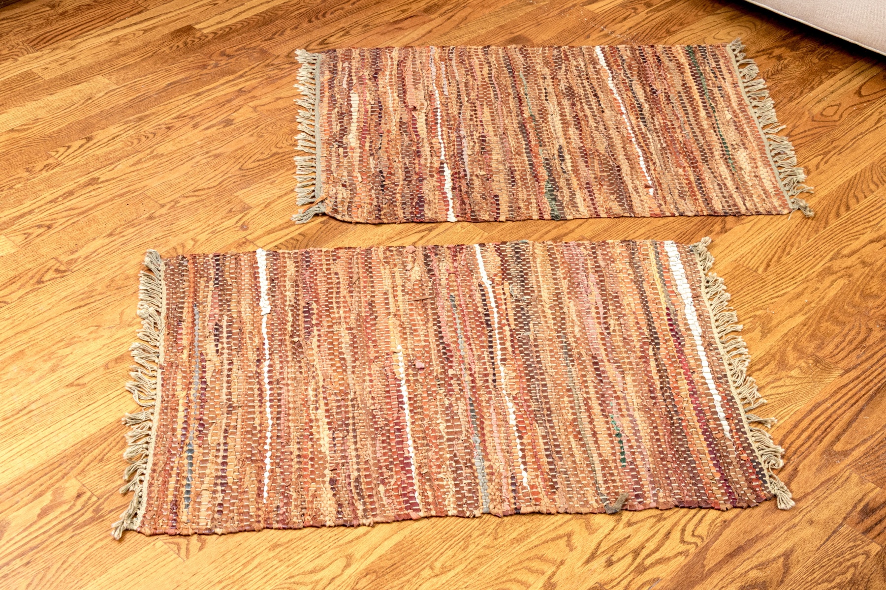 A stylish pair of chindi dhurries incorporating strips of colorful fabric and leather in earthy and autumnal hues for great texture and visual interest. Finished with fringes on the short sides.