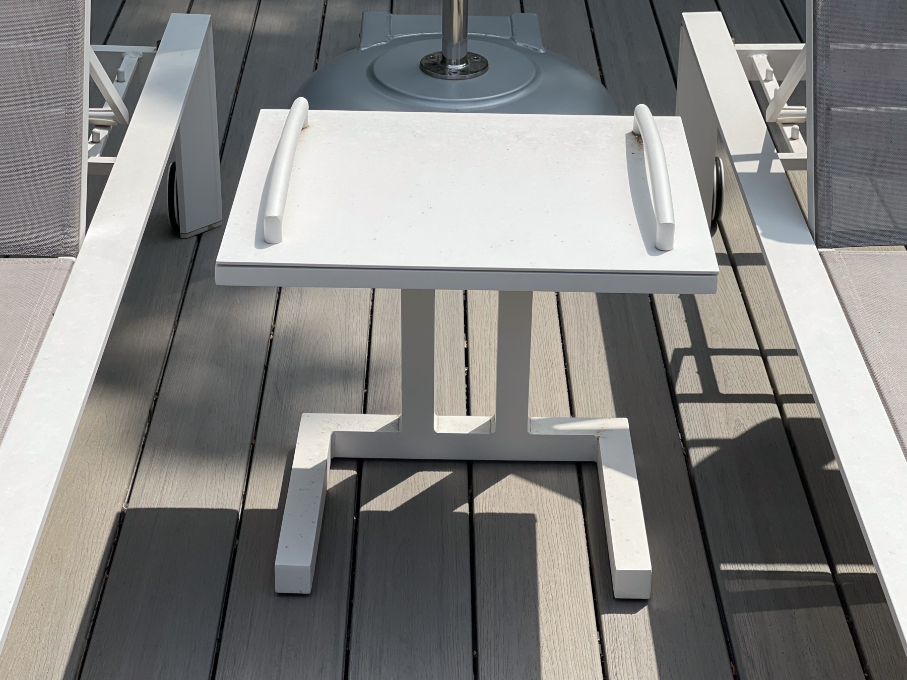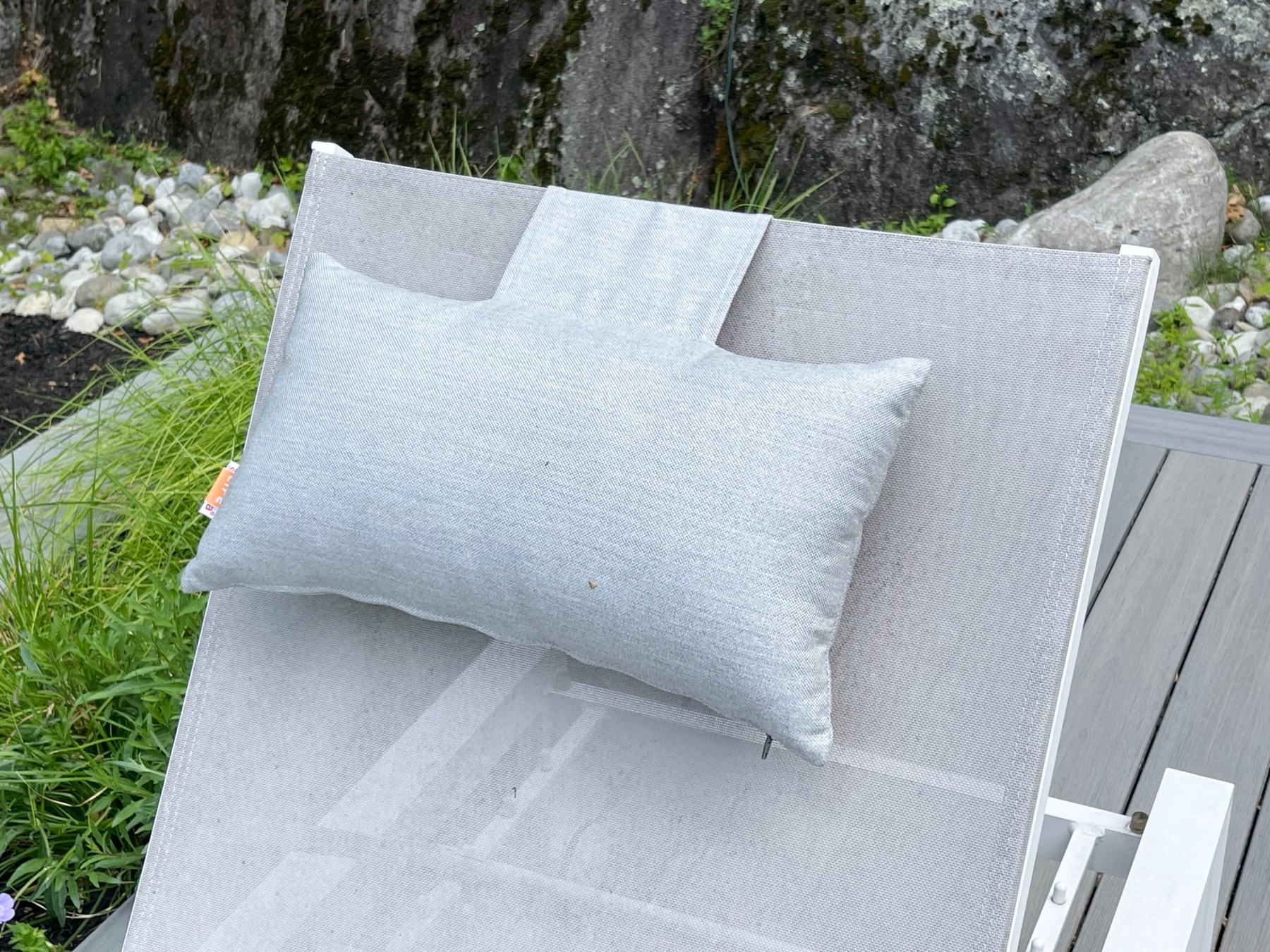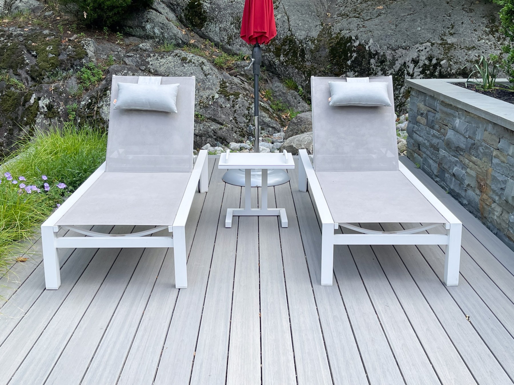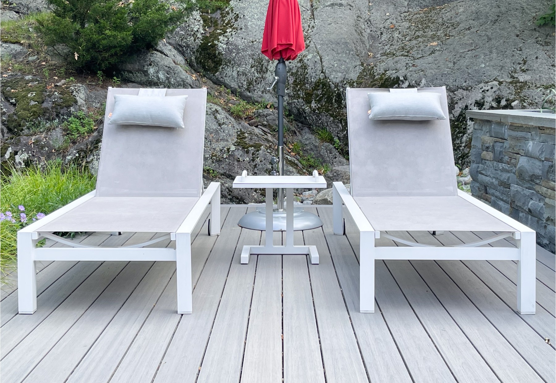 White finished frames with grey mesh seats provide a luxurious way to recline in the outdoors.