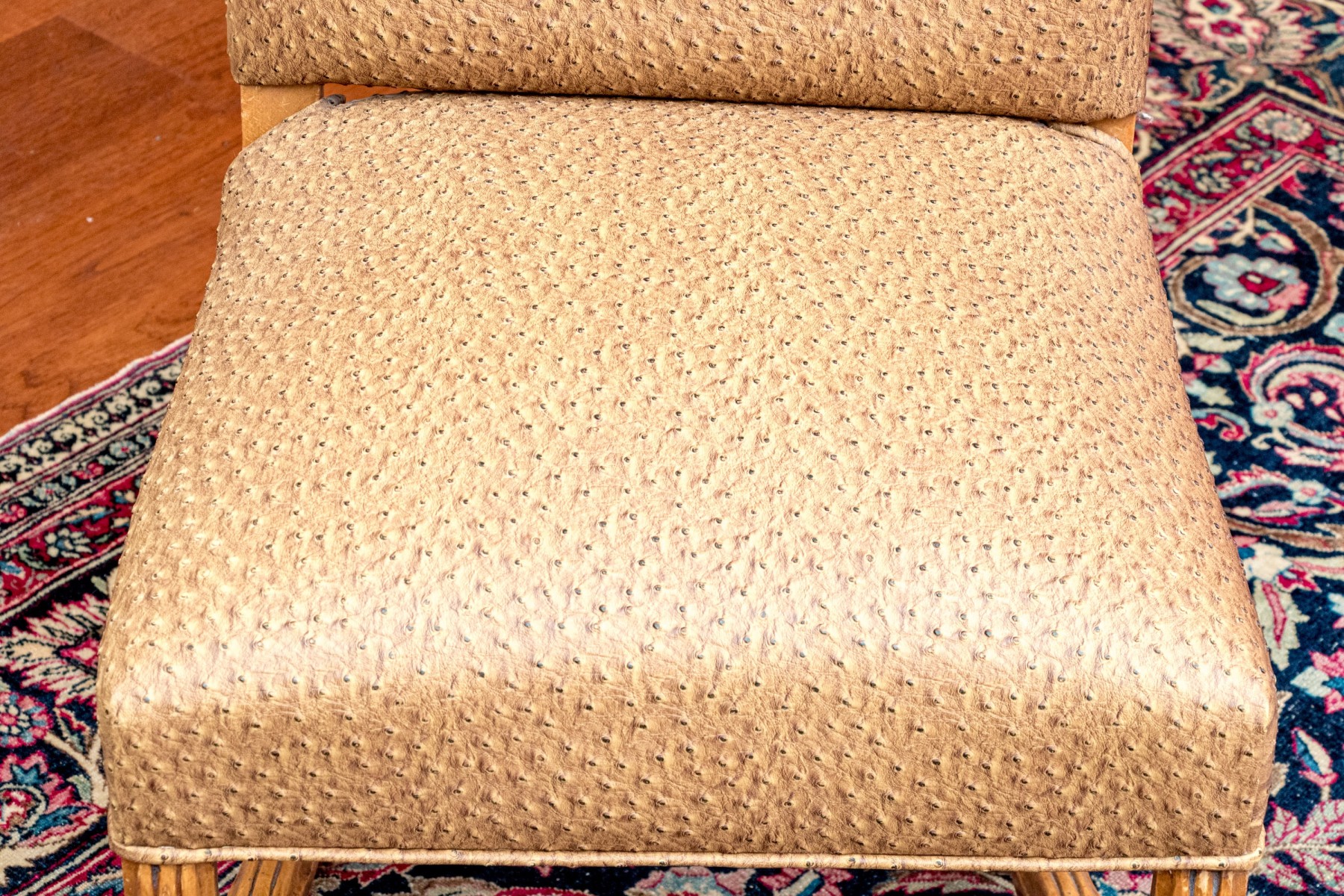 Very gentle wear to the ostrich leather upholstered chair with slight wear to the upper seat back corners but overall presents well.