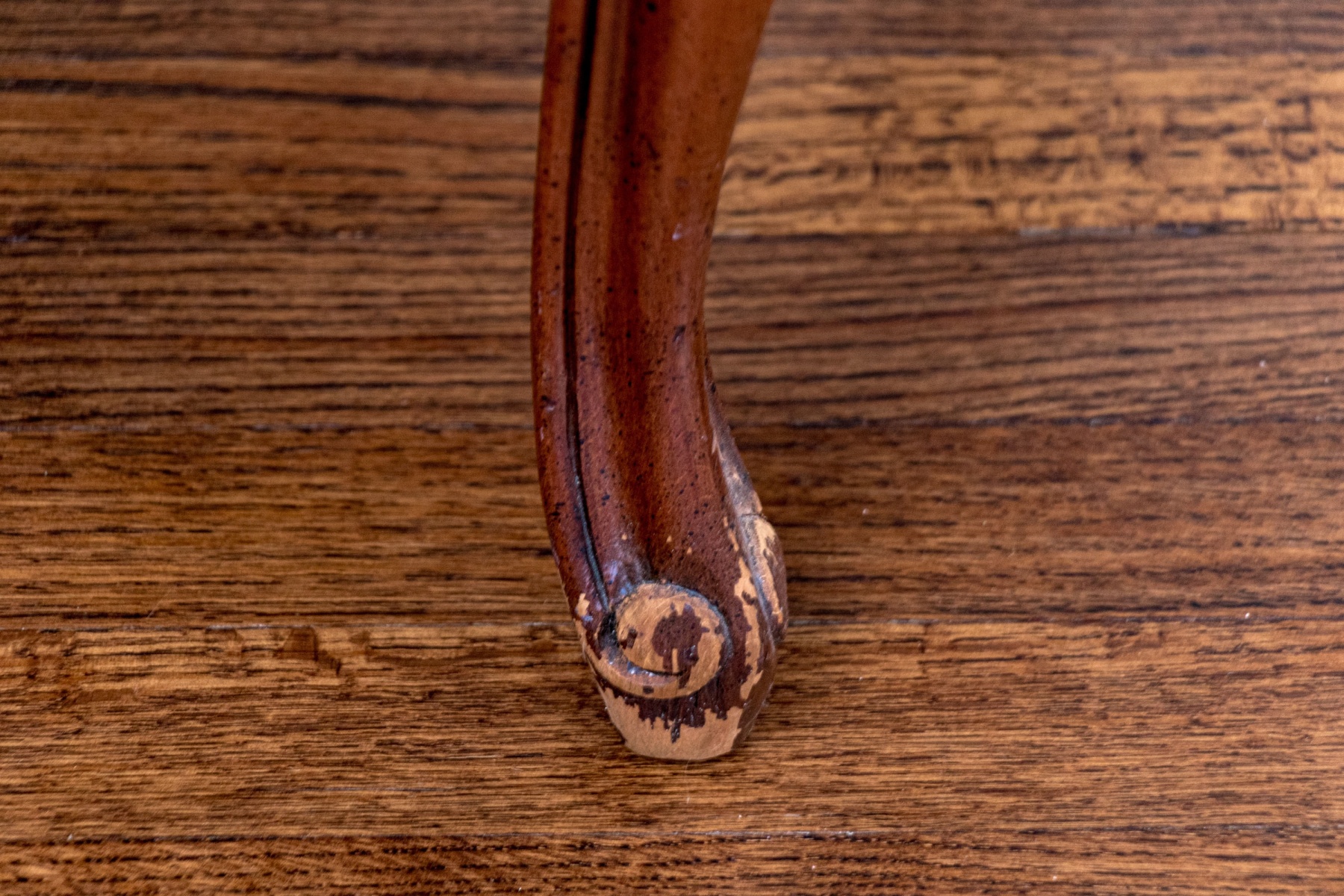 One chair with chipping to back foot, likely dog bites. One more sunned than the other with fading to the colors. Despite wear still a handsome pair.