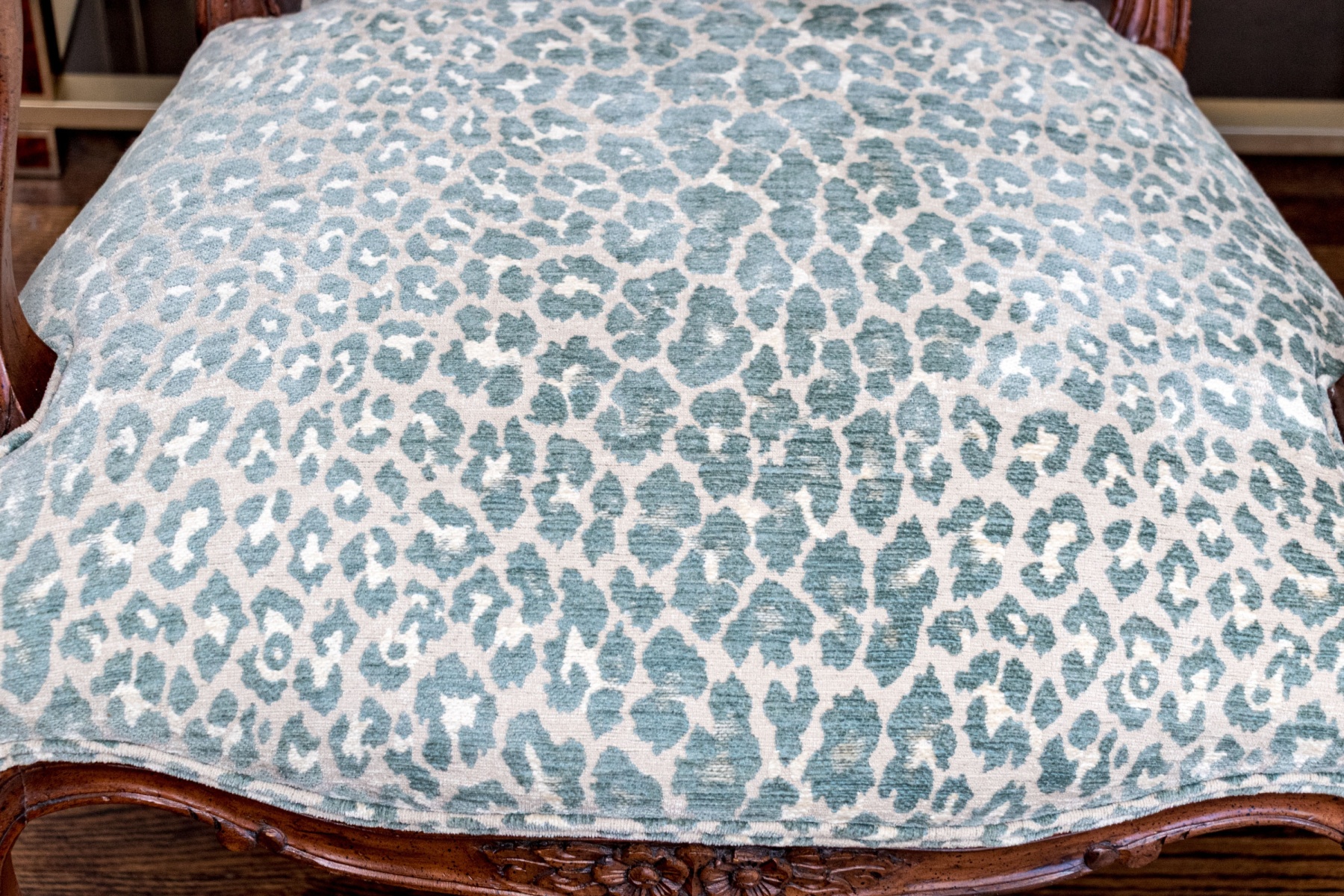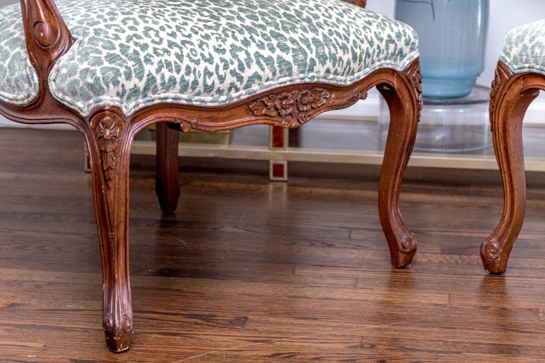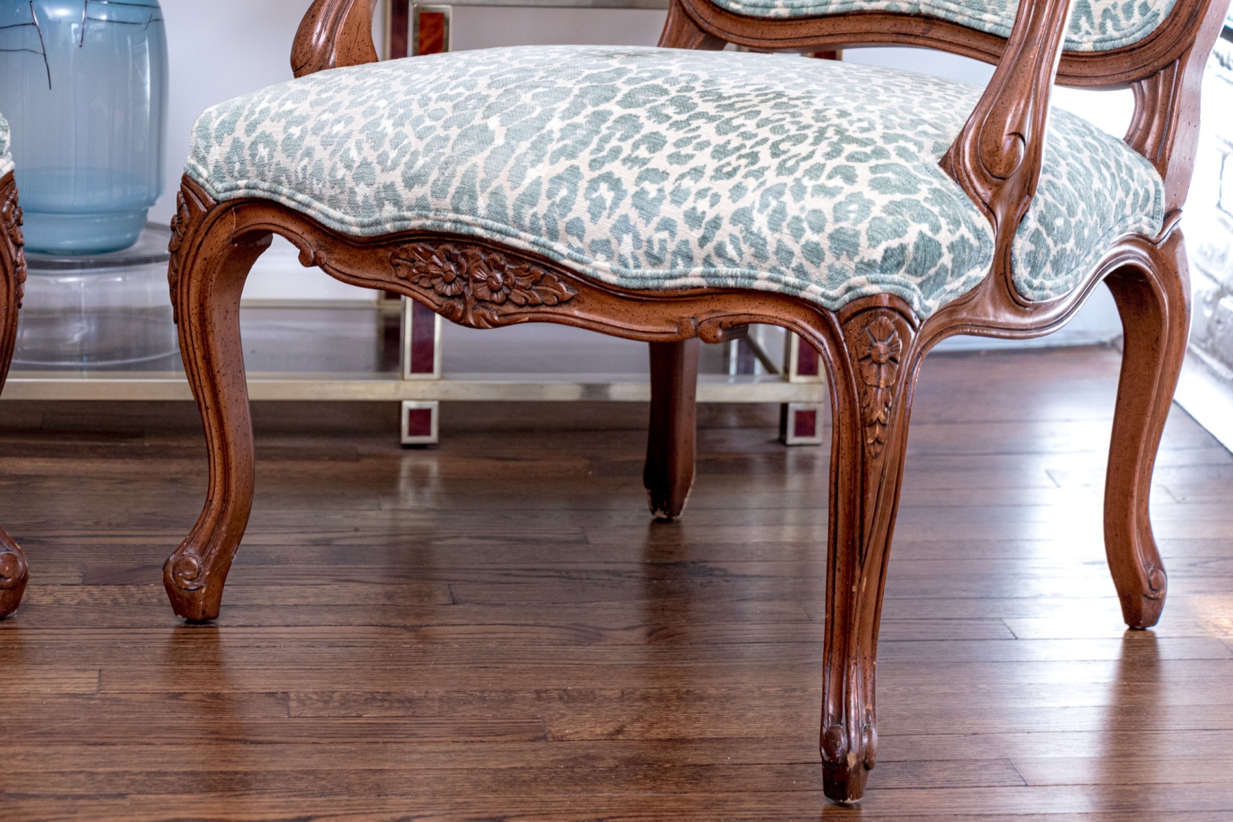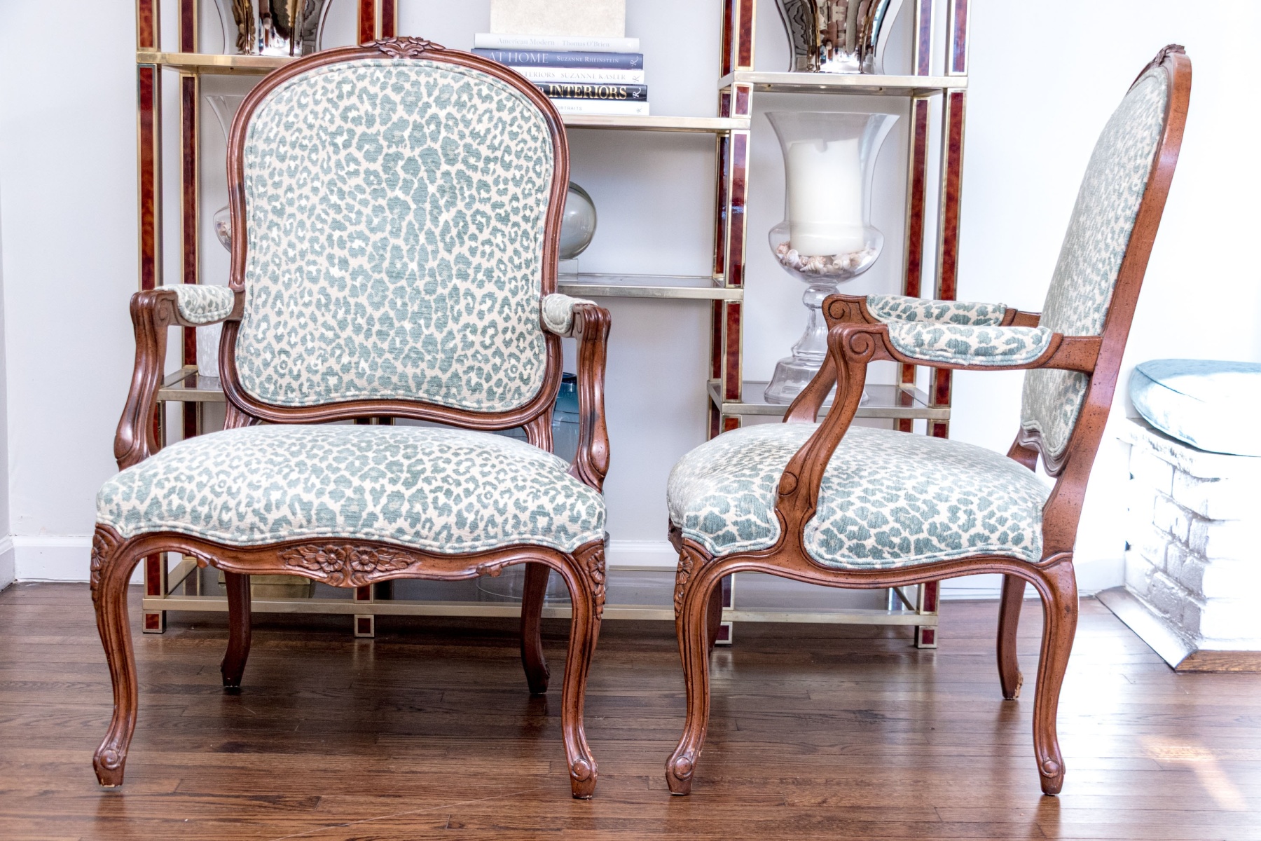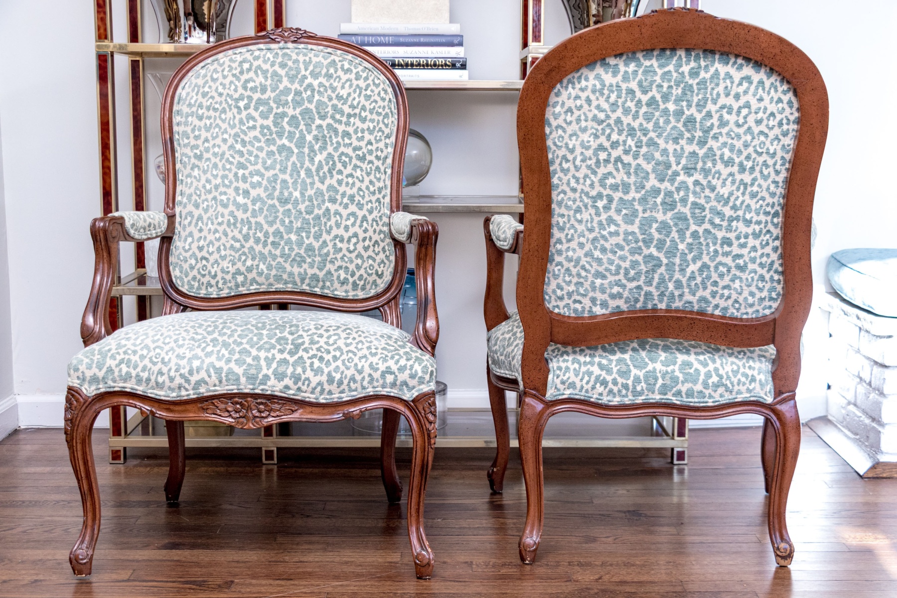 A stylish pair of fauteuils in classic Louis XV style, showcasing warm-toned medium brown fruitwood frames carved with elegant serpentine edges and foliate flourishes to create an elegant and timeless aesthetic. The backs, seats, and arm pads are upholstered in gorgeous white fabric with slate blue leopard patterns. Chairs finish with serpentine aprons and cabriole legs.