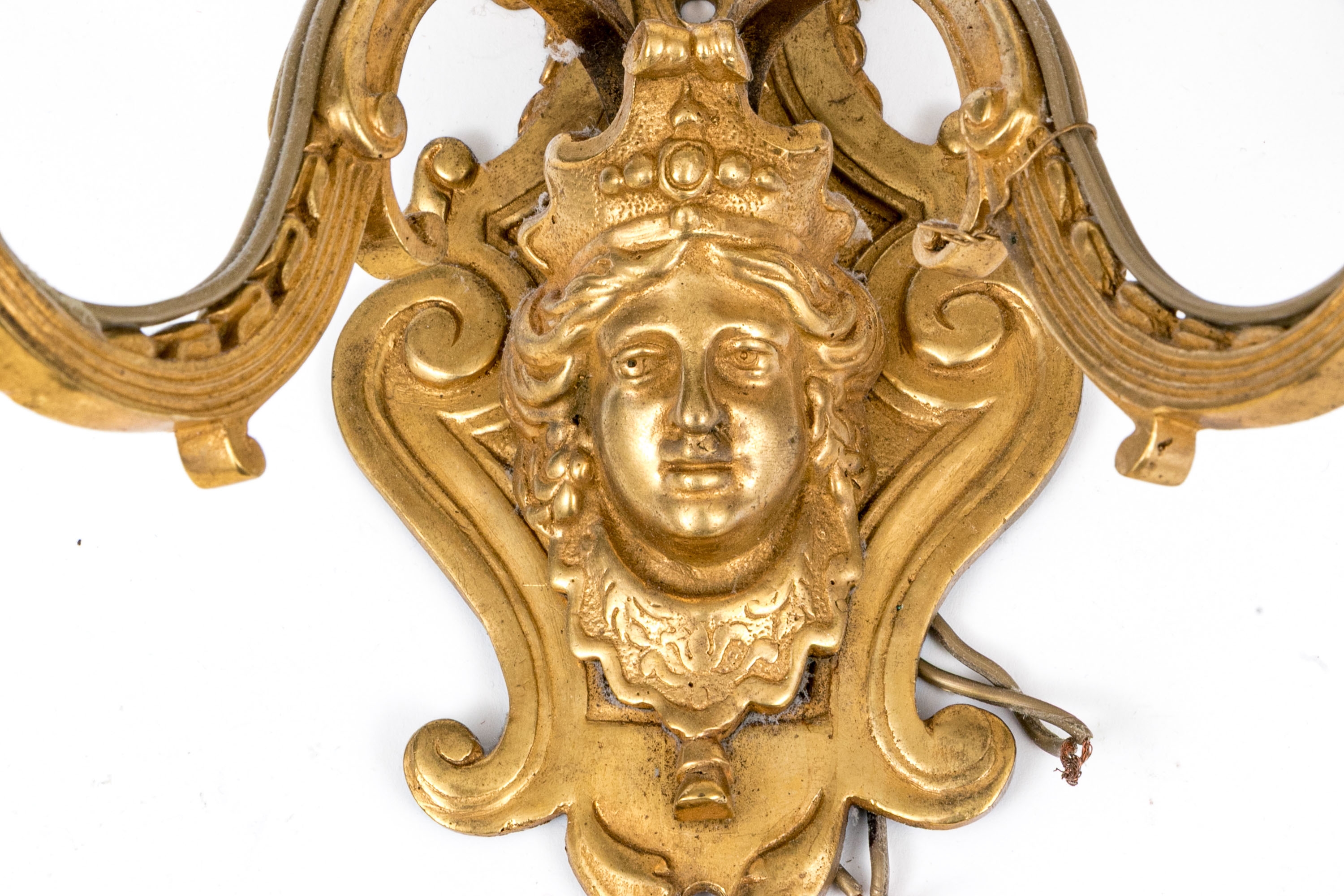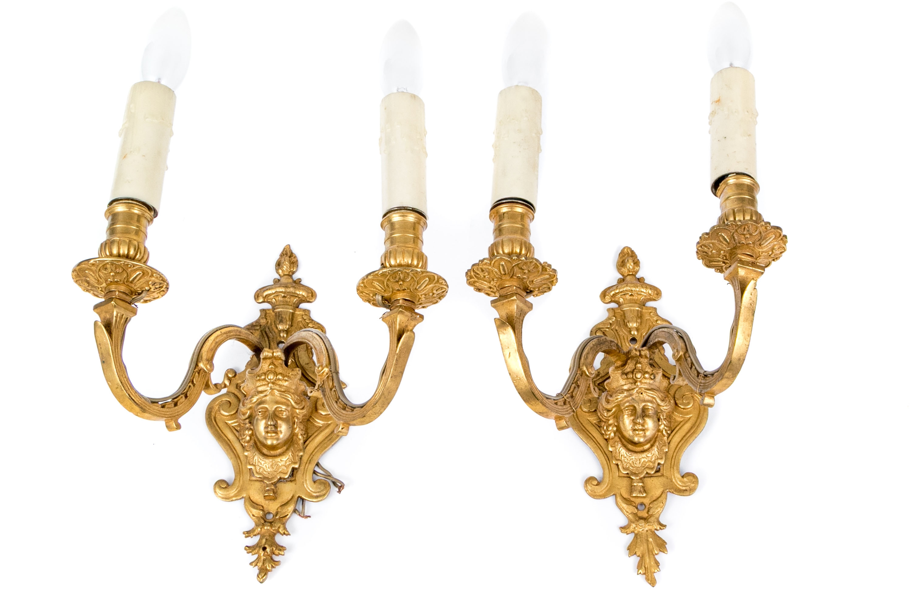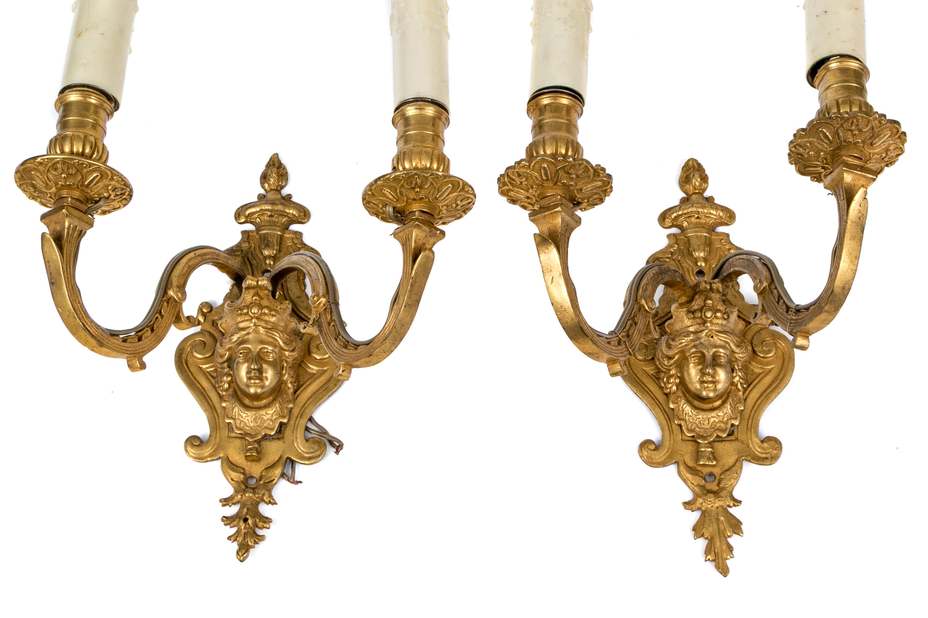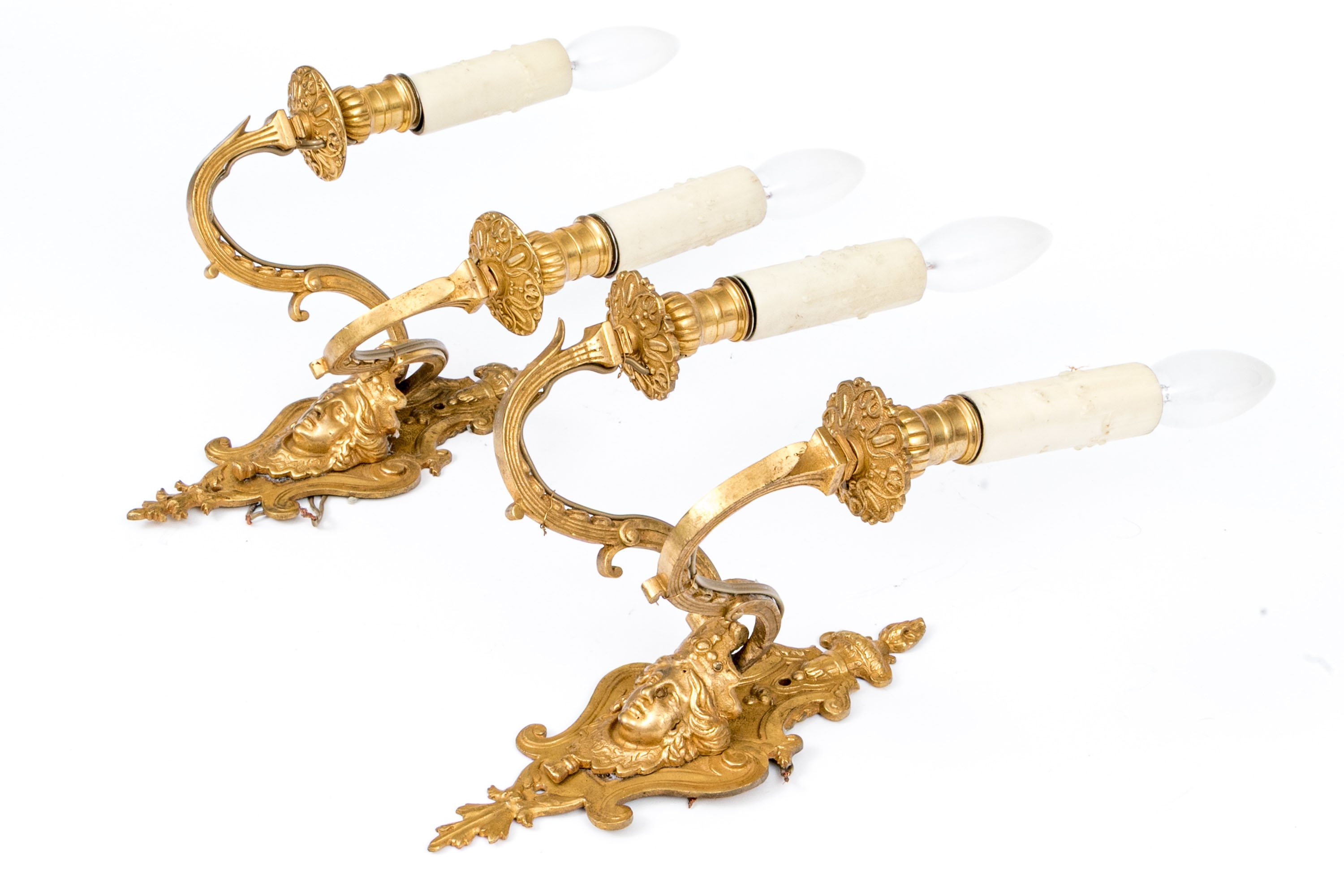 An opulent pair of Louis XVI style electric wall sconces showcasing two candle sockets over elegantly curved arms leading to a shapely plaque with figural centers over foliate finials.