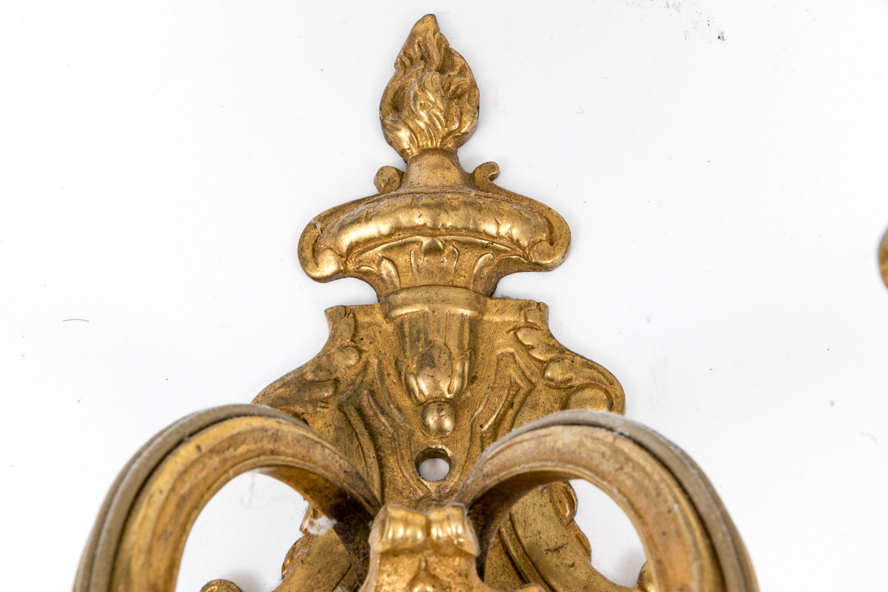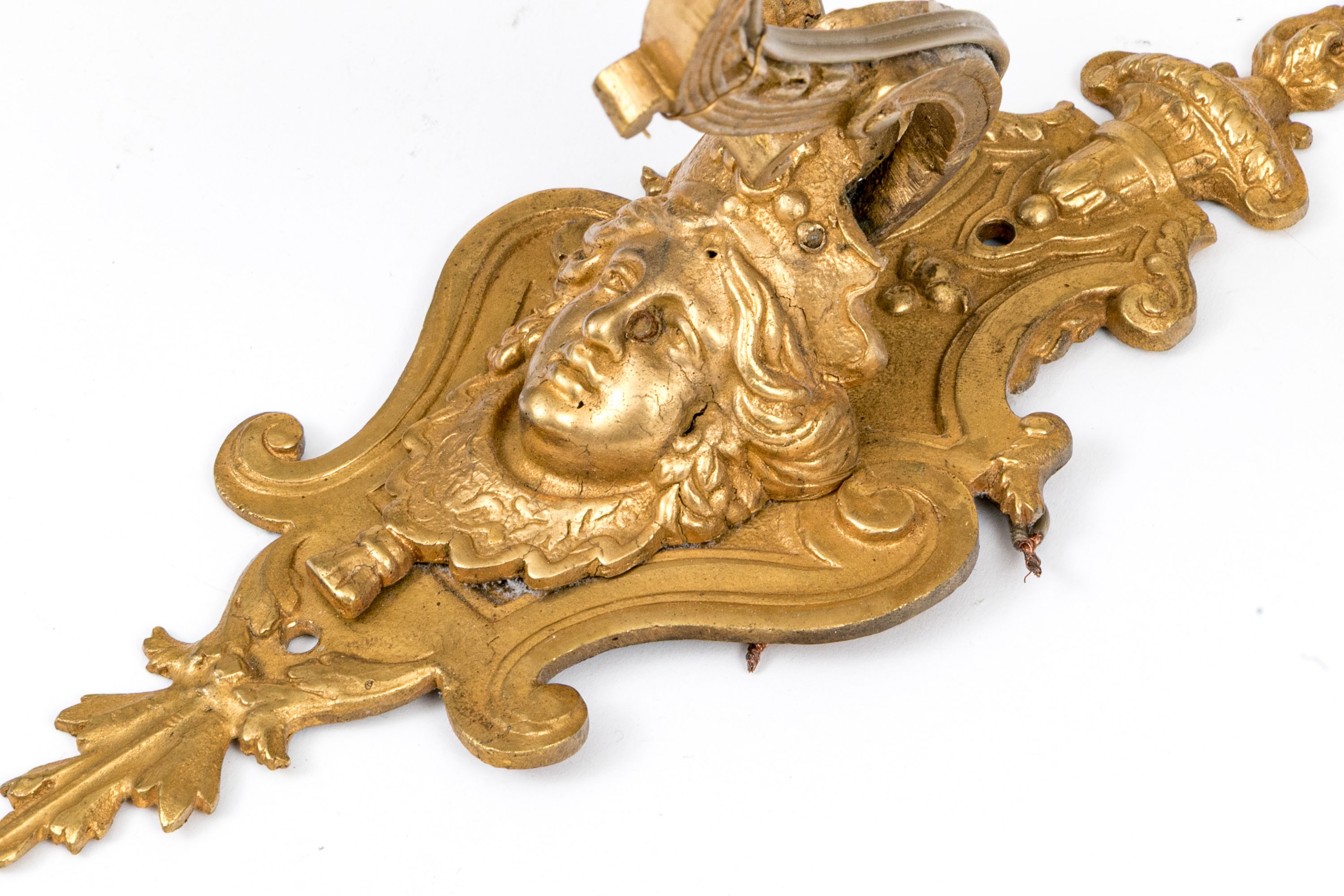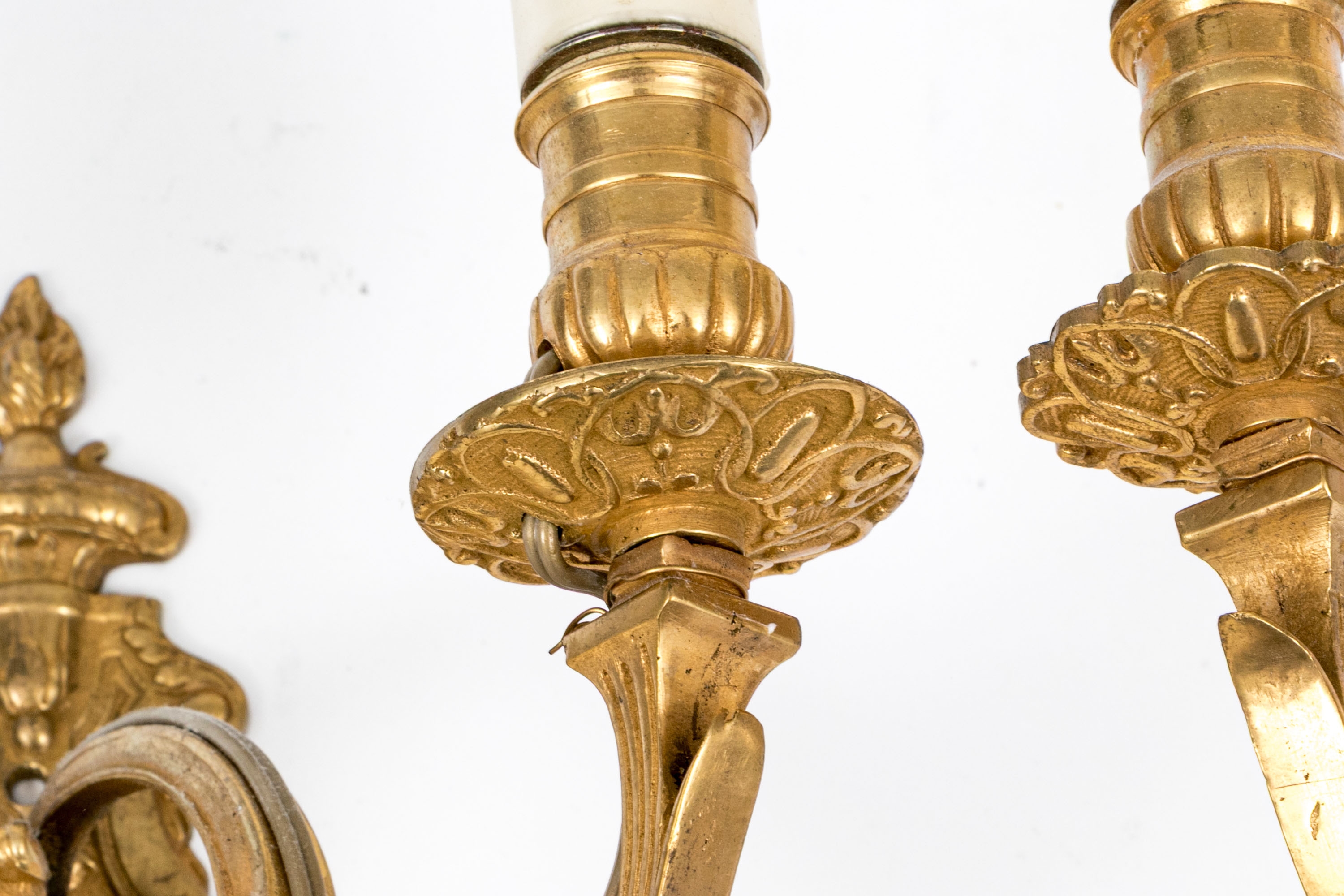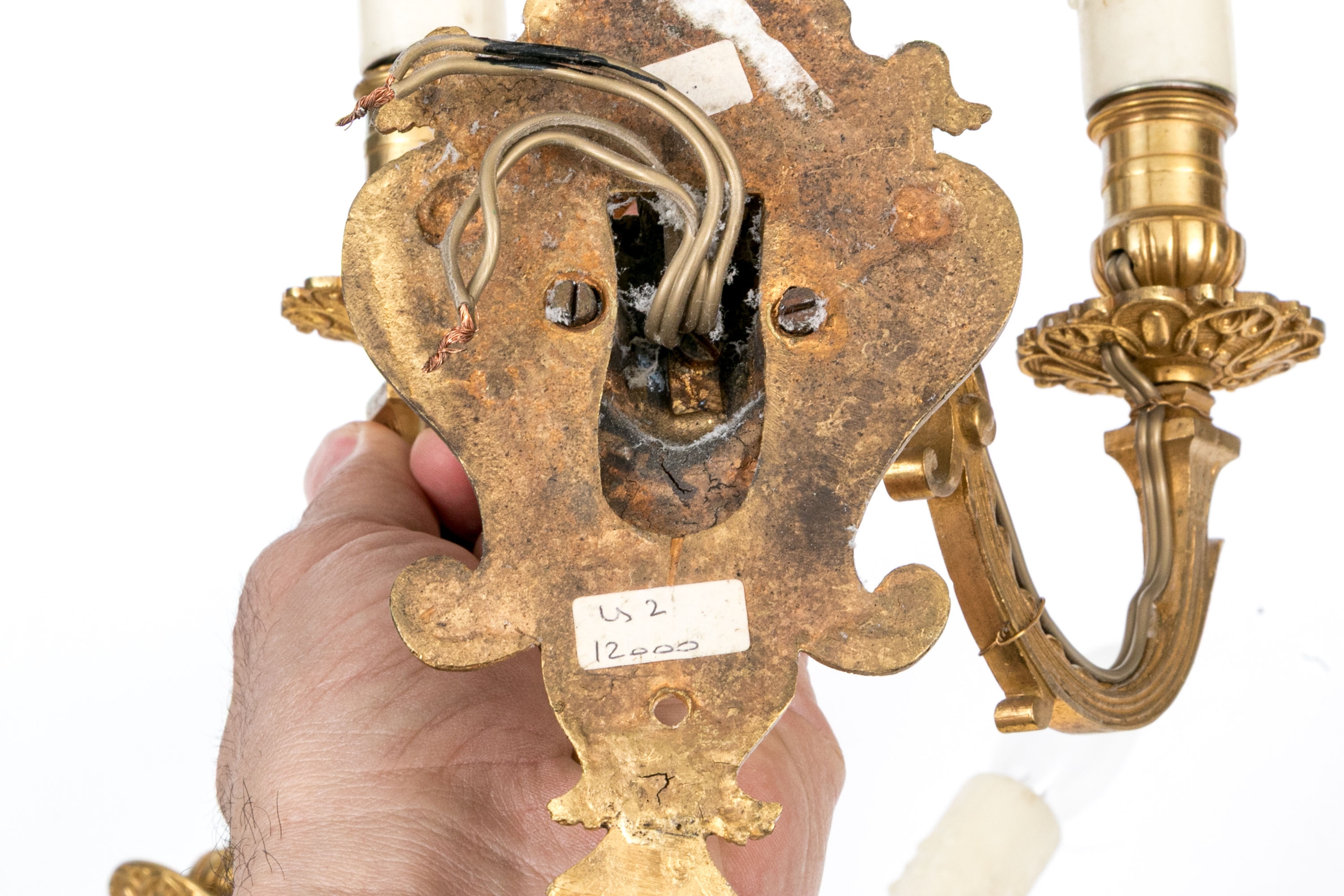 An opulent pair of Louis XVI style electric wall sconces showcasing two candle sockets over elegantly curved arms leading to a shapely plaque with figural centers over foliate finials.