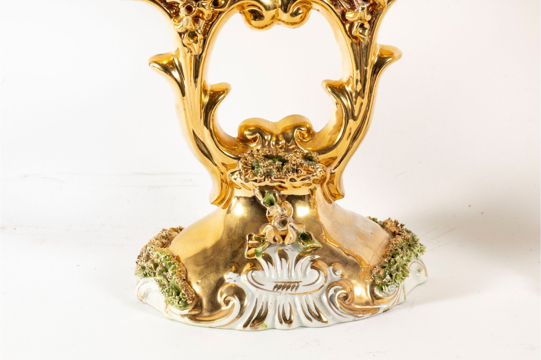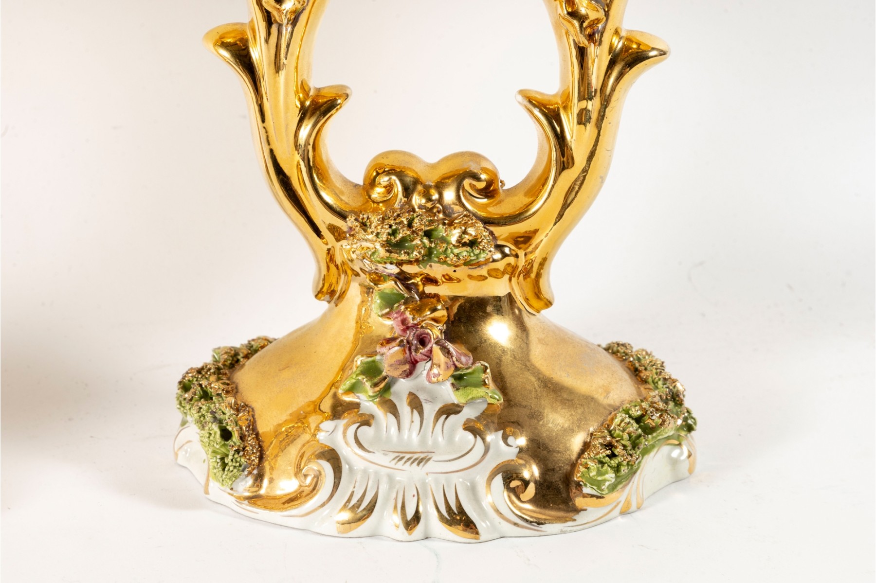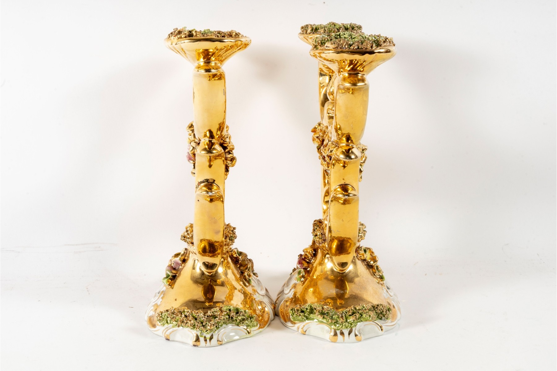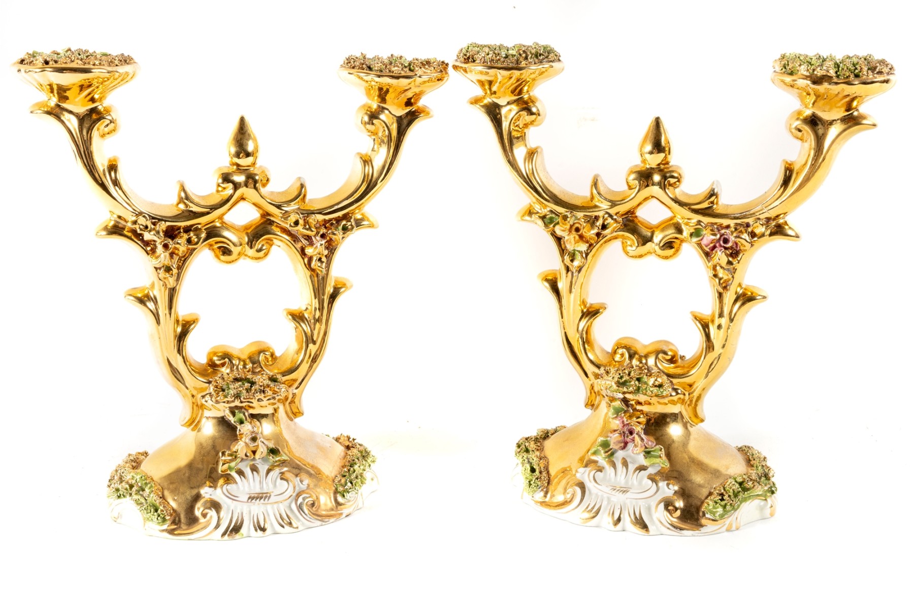 A fabulous pair of capodimonte Italian ceramic candelabras luxuriously gilt throughout and detailed with enameled flowers and foliage in green and pink. Each displays two foliate arms meeting at a tapered finial over open columns terminating on oval bases with sculptural relief. marked underfoot.