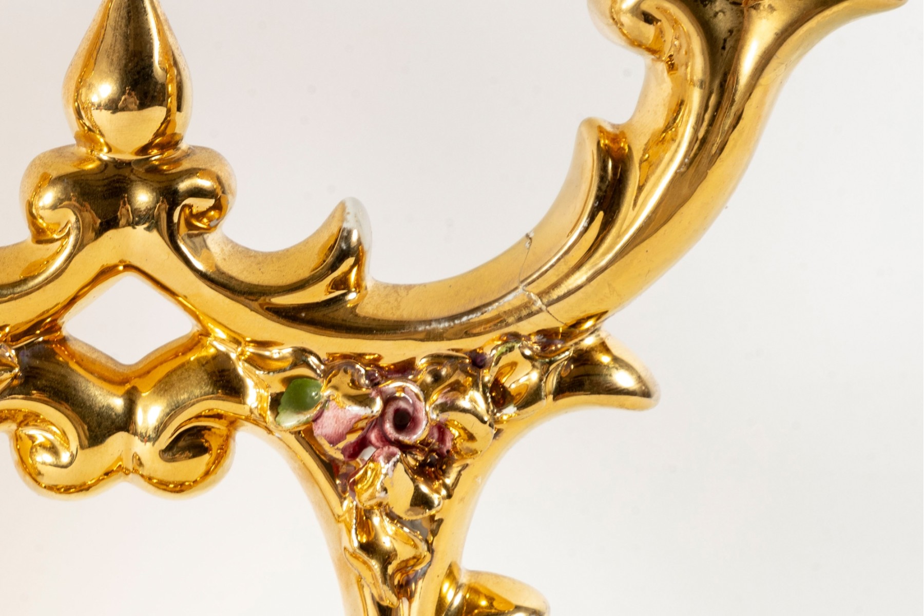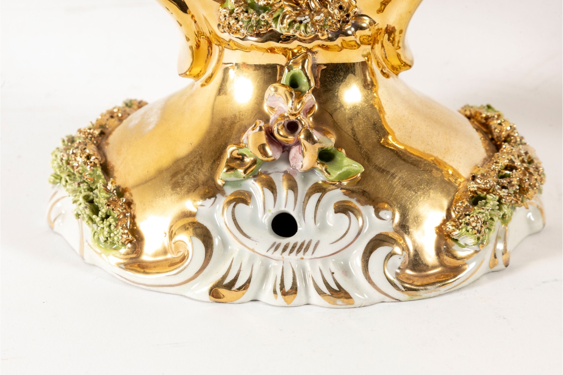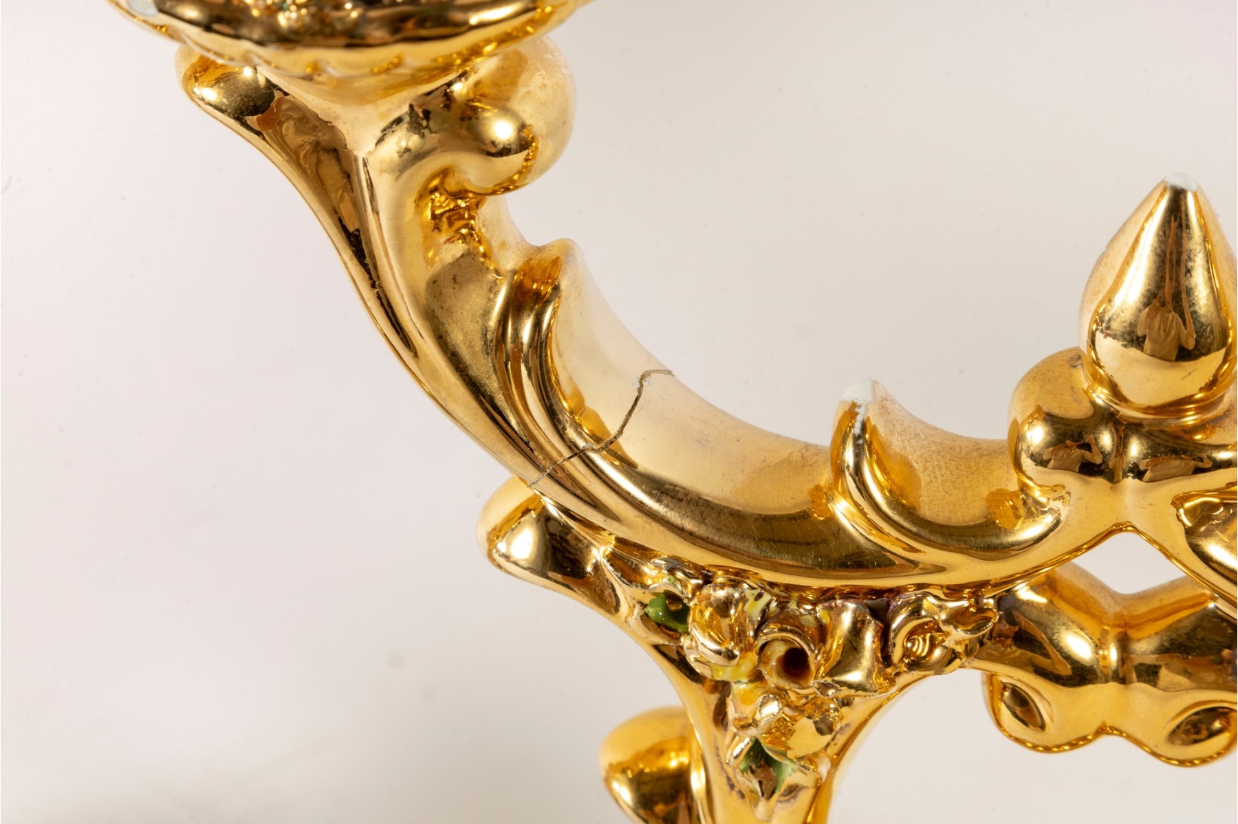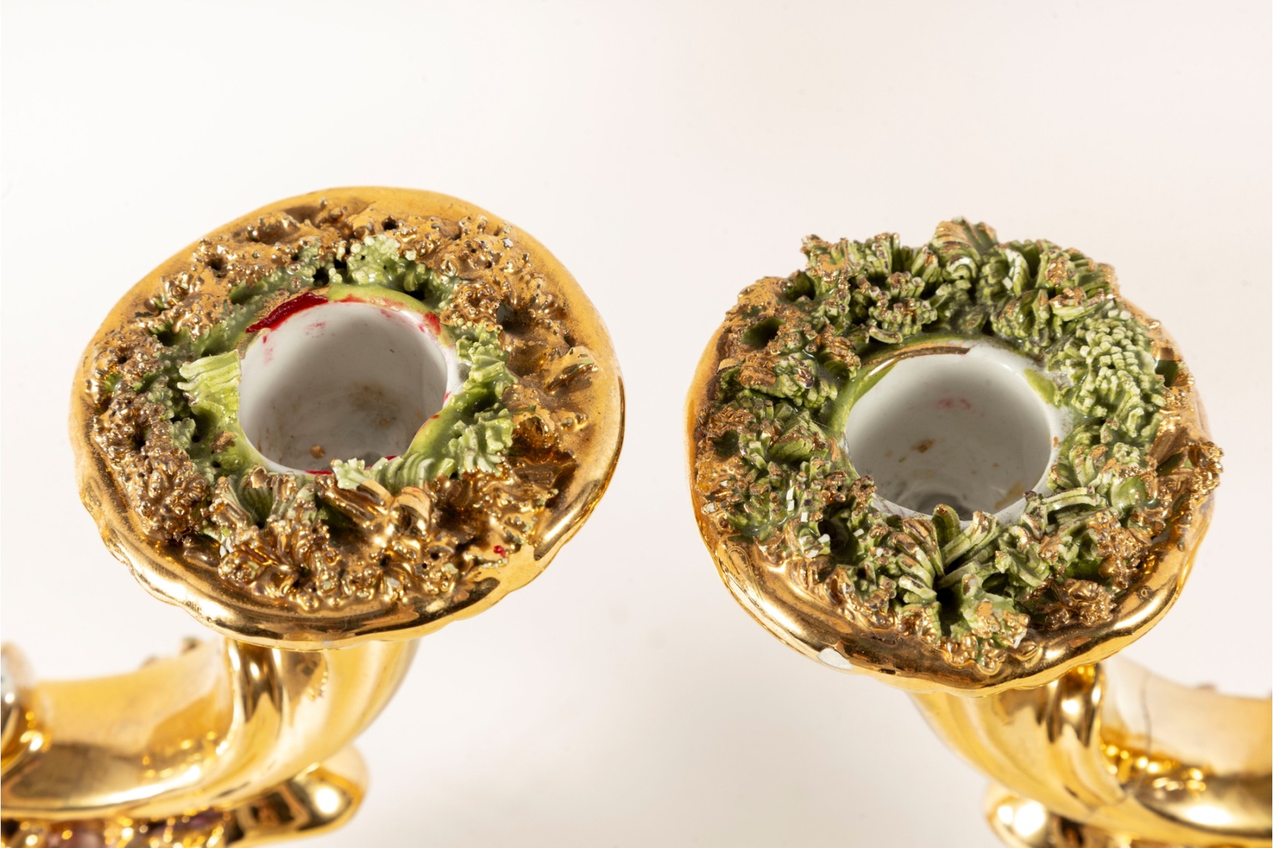 A fabulous pair of capodimonte Italian ceramic candelabras luxuriously gilt throughout and detailed with enameled flowers and foliage in green and pink. Each displays two foliate arms meeting at a tapered finial over open columns terminating on oval bases with sculptural relief. marked underfoot.