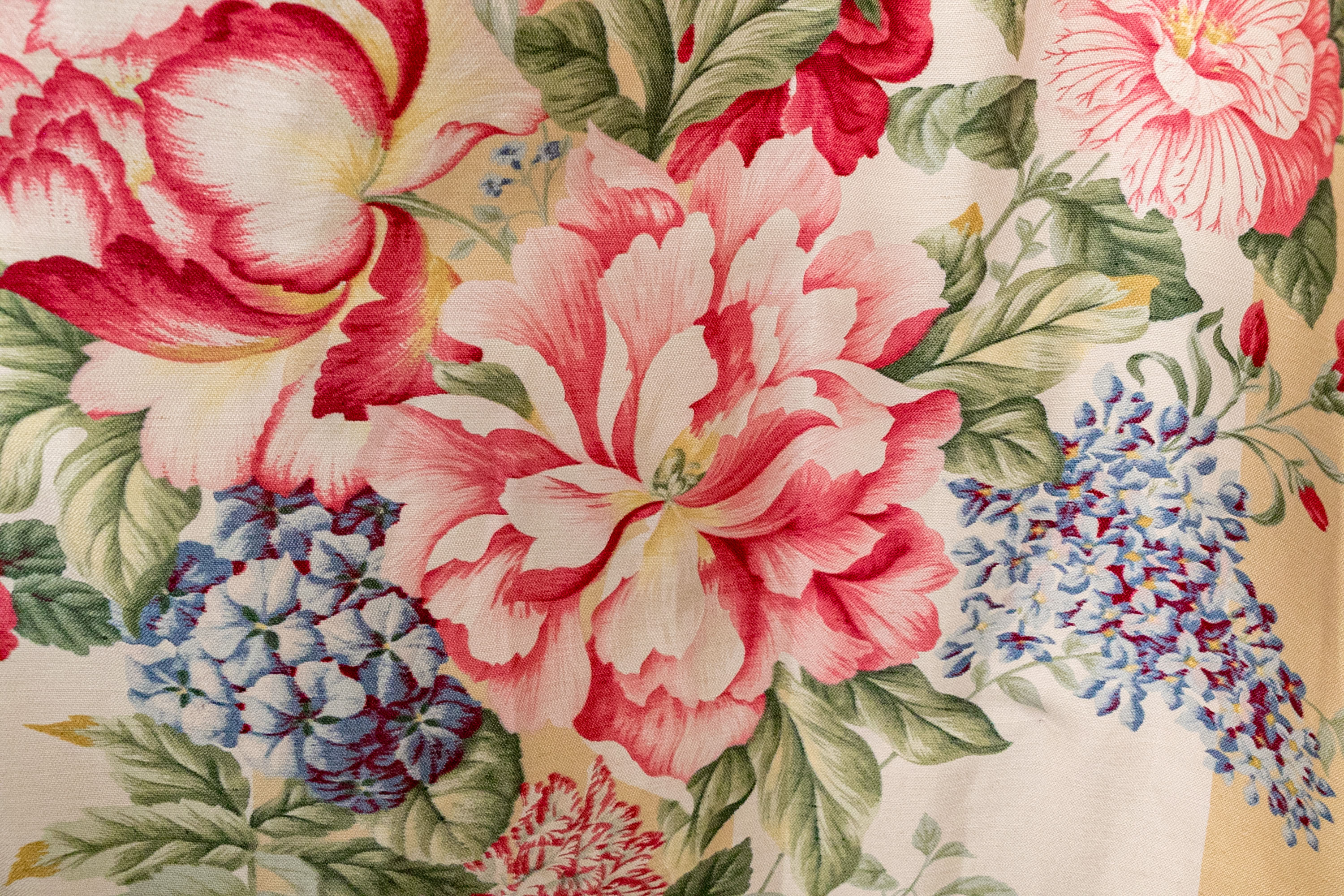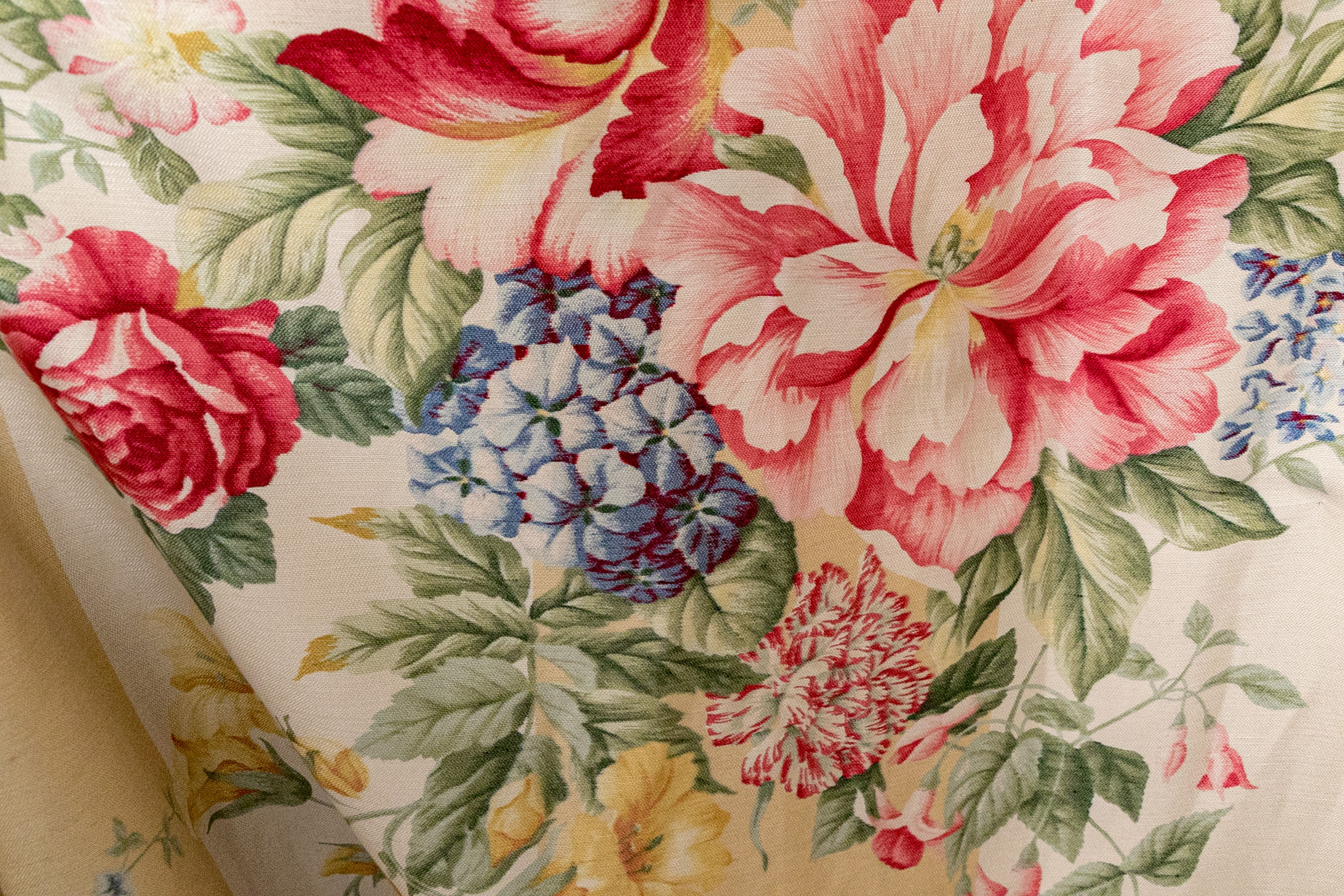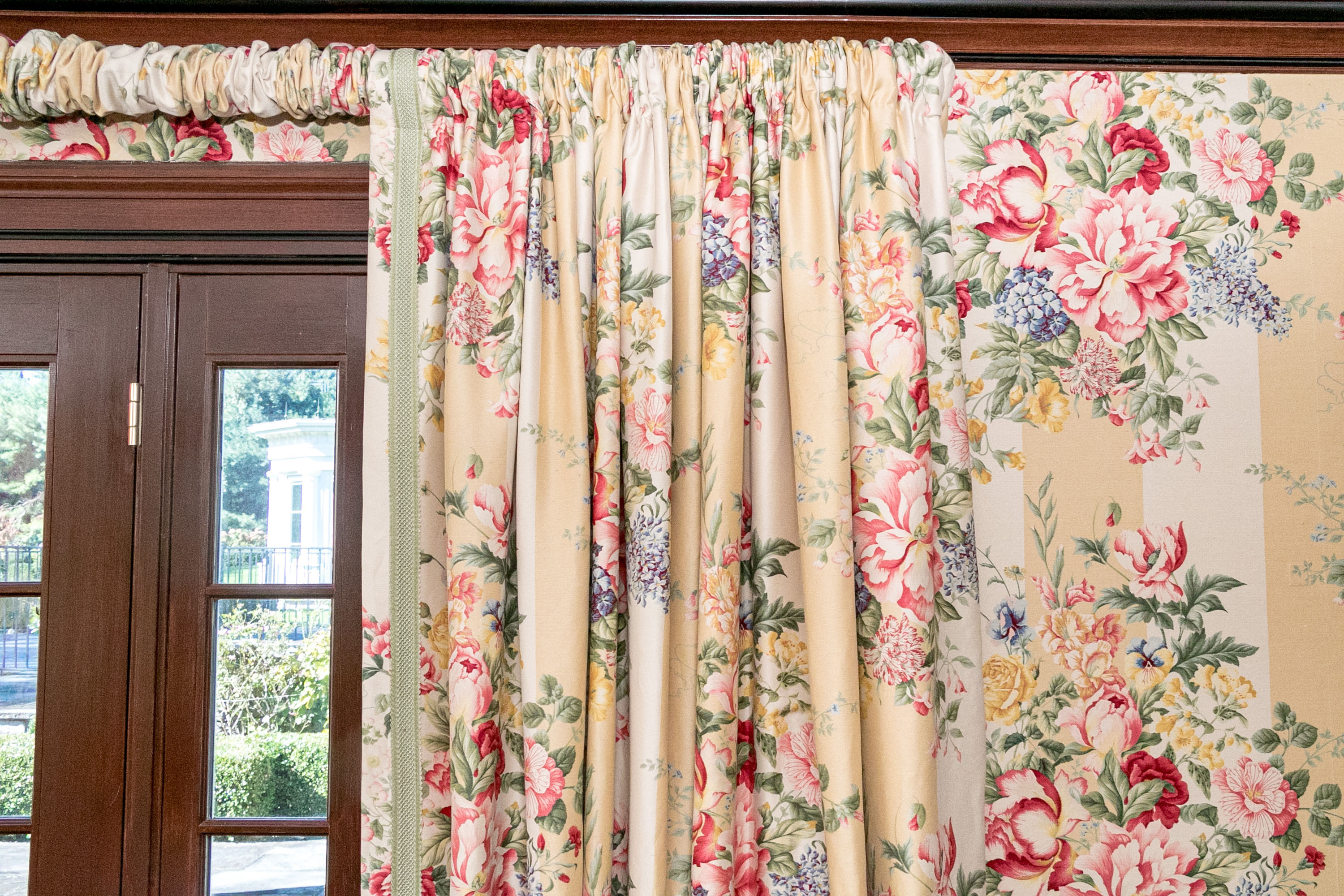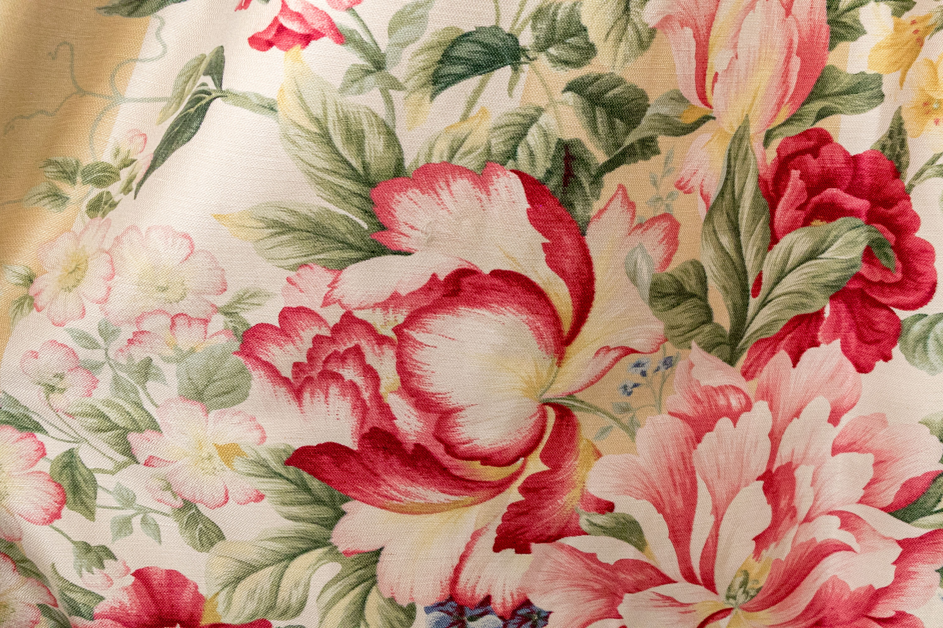 A luxurious pair of custom curtains in gorgeous chintzy fabric decorated by large floral sprays in red, blue, and yellow with lush green foliage against cream and yellow striped backgrounds. Each with white liners sewn on the reverse.