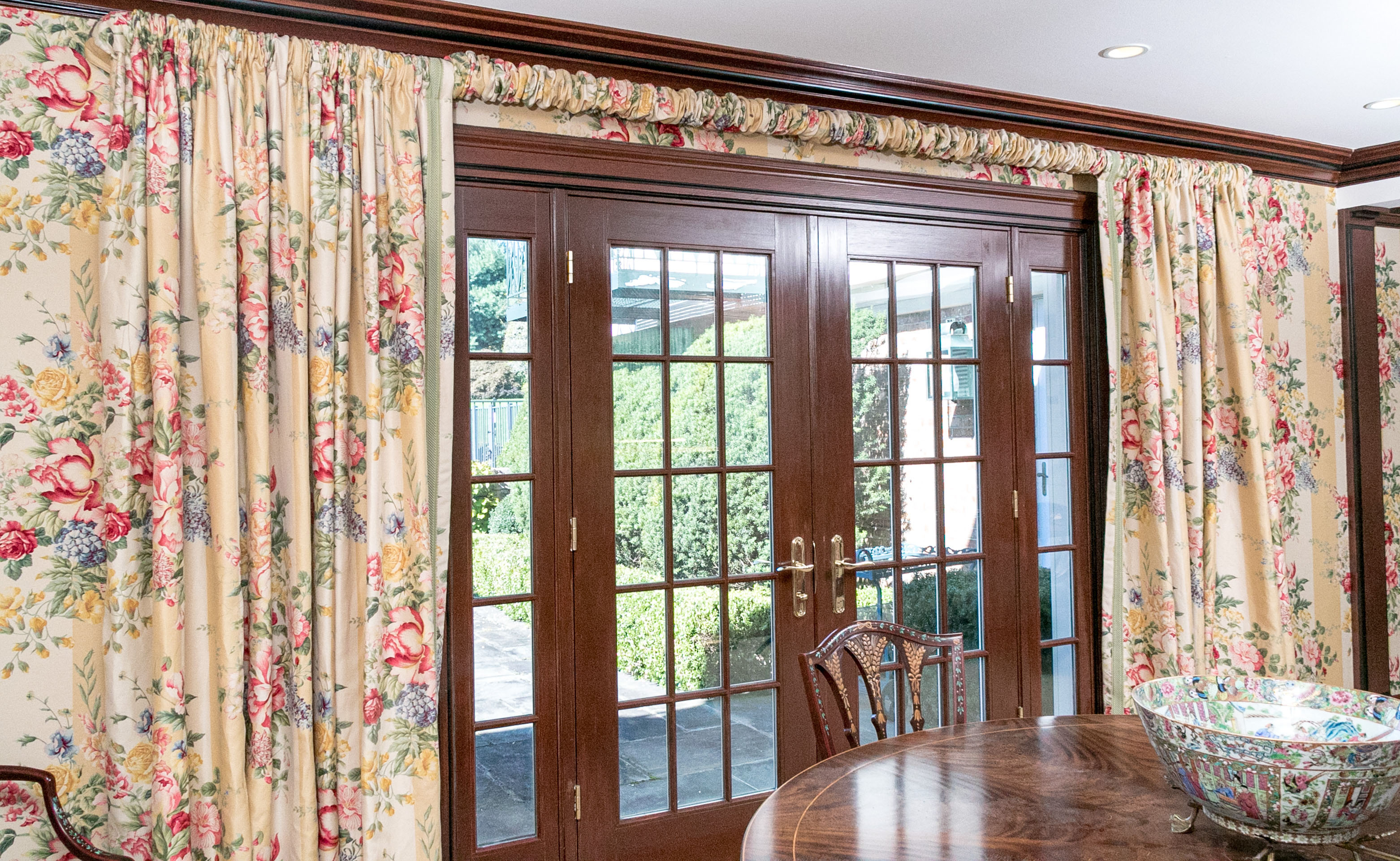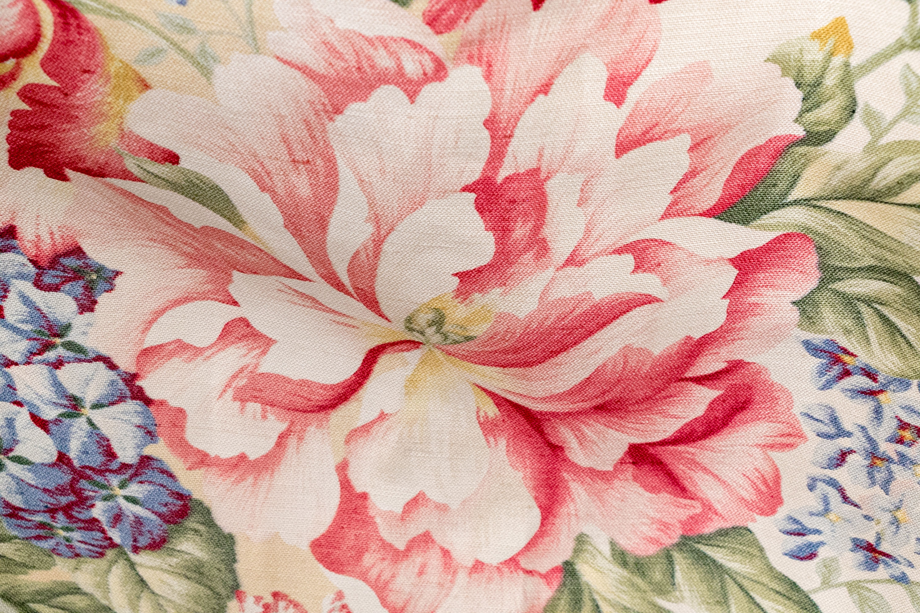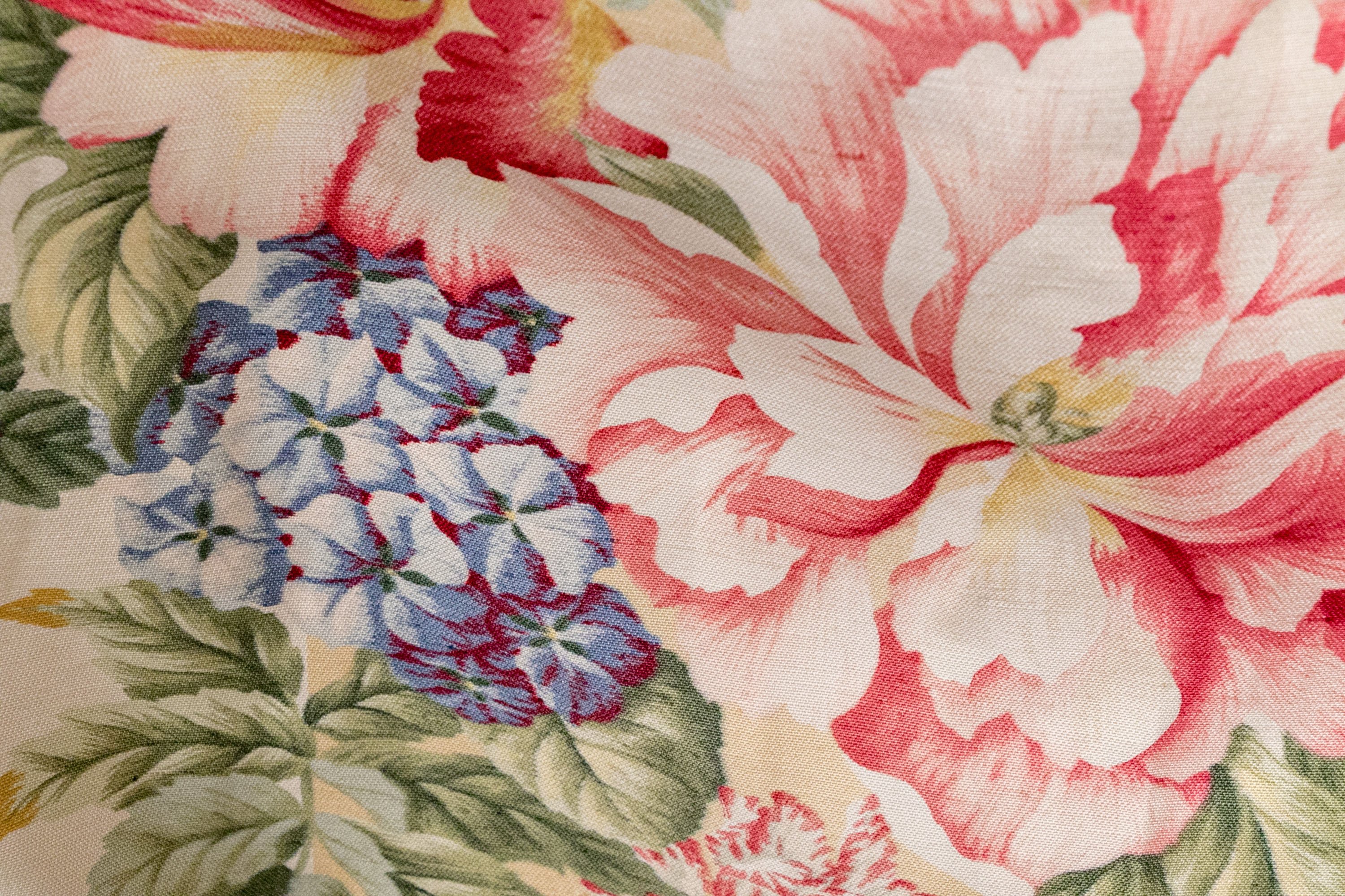 A luxurious pair of custom curtains in gorgeous chintzy fabric decorated by large floral sprays in red, blue, and yellow with lush green foliage against cream and yellow striped backgrounds. Each with white liners sewn on the reverse.