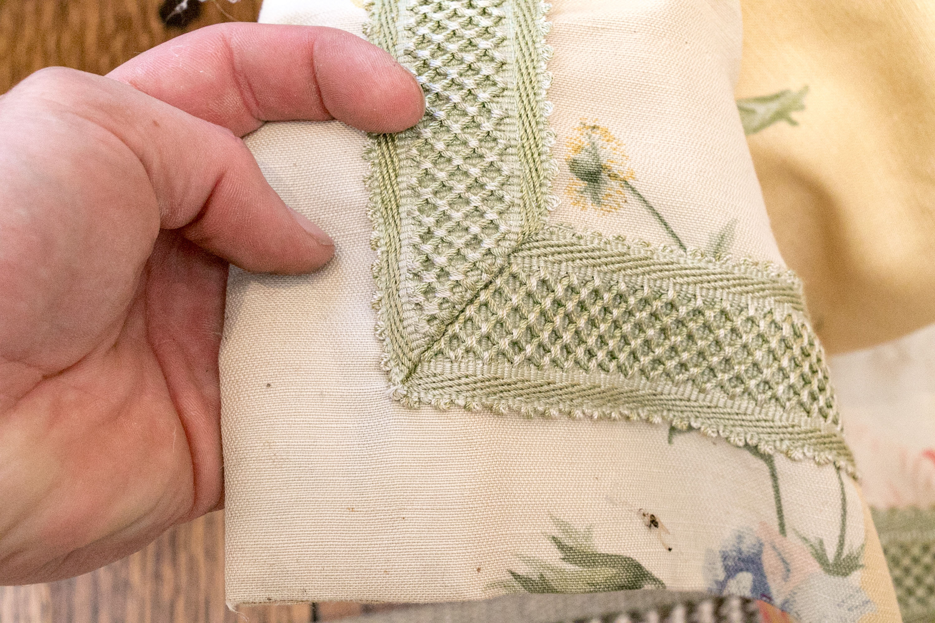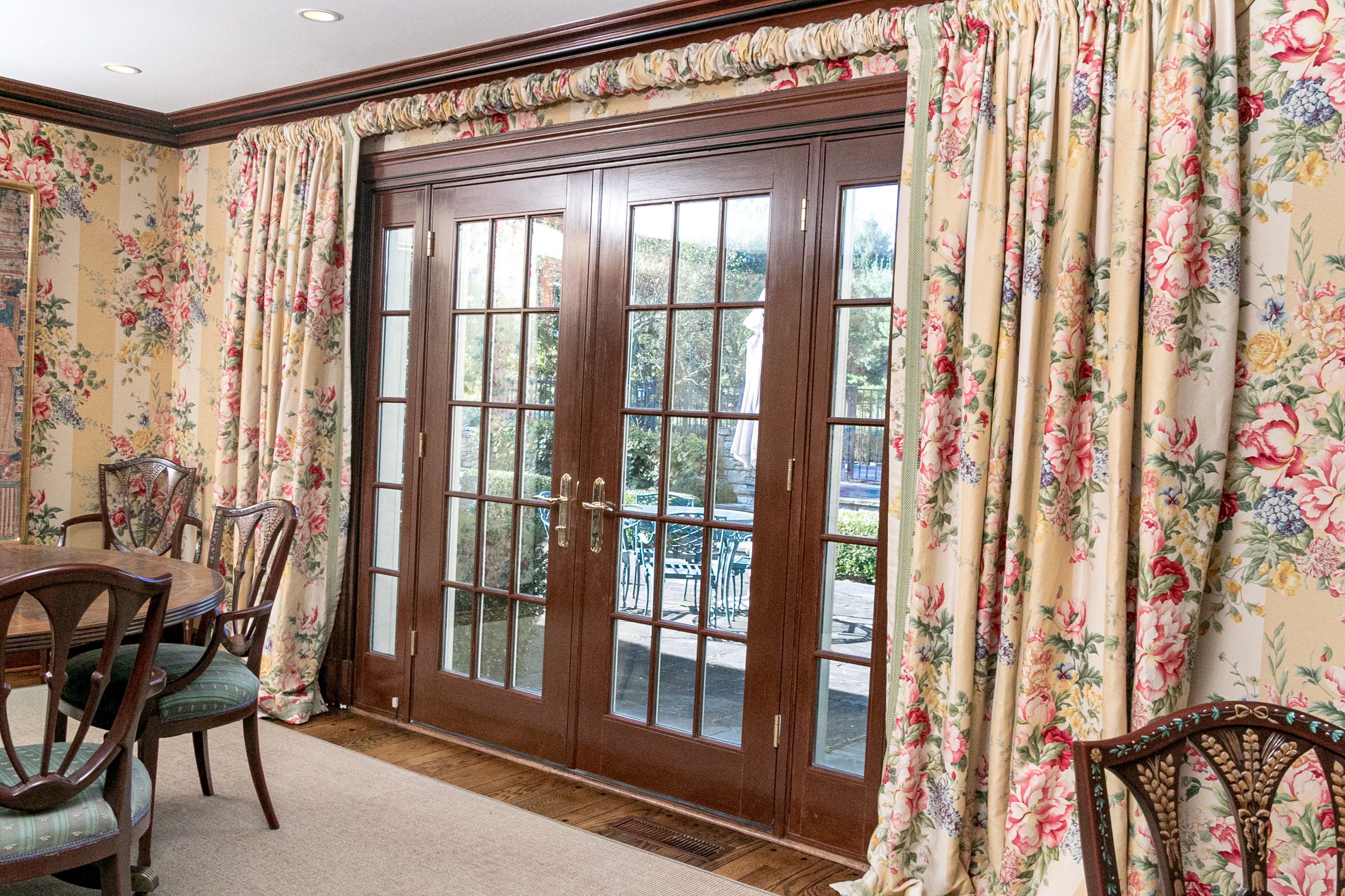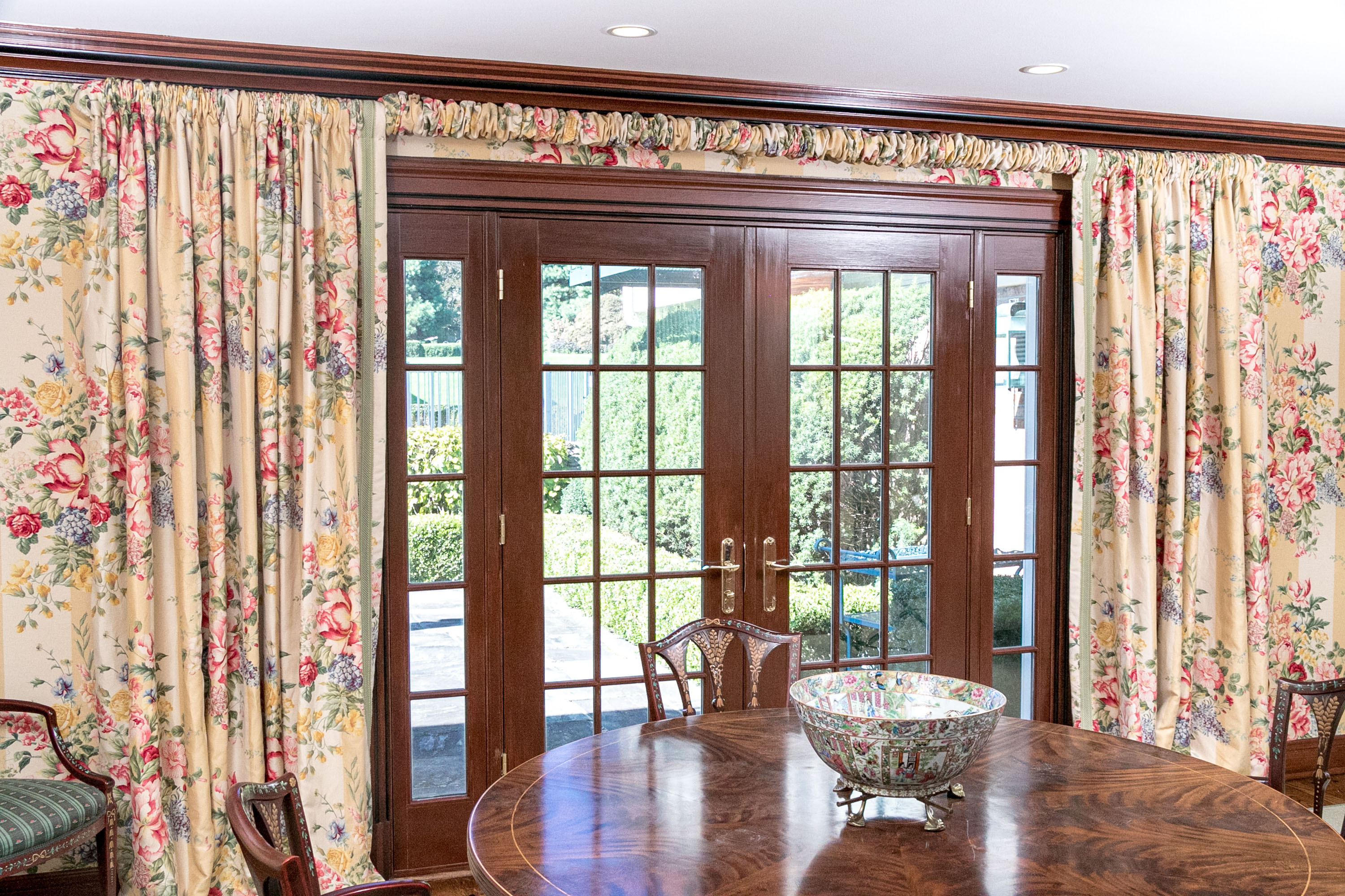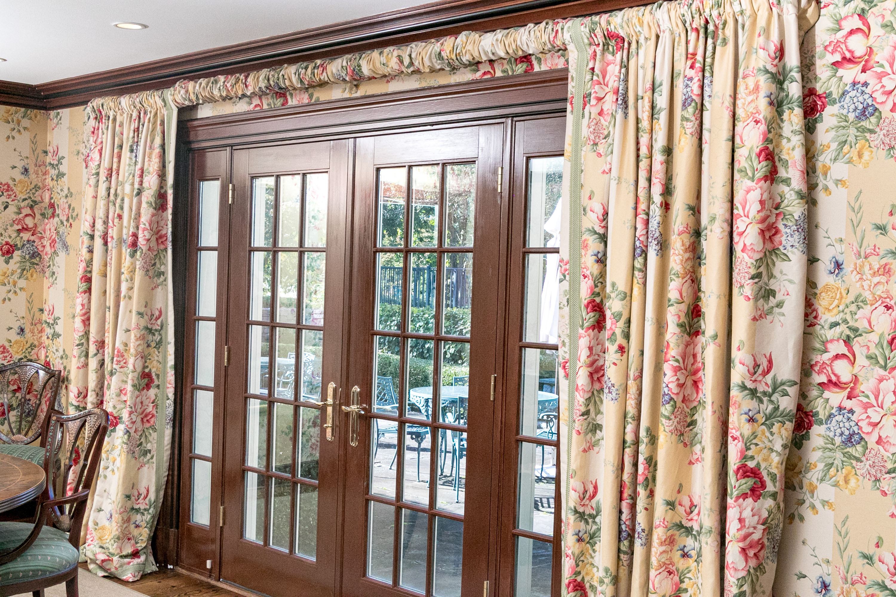 A luxurious pair of custom curtains in gorgeous chintzy fabric decorated by large floral sprays in red, blue, and yellow with lush green foliage against cream and yellow striped backgrounds. Each with white liners sewn on the reverse.