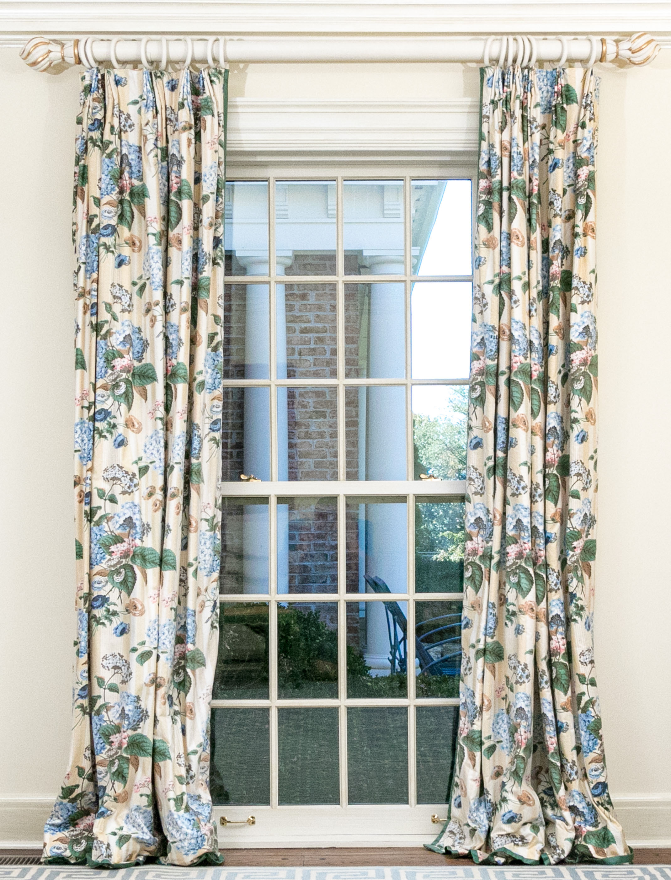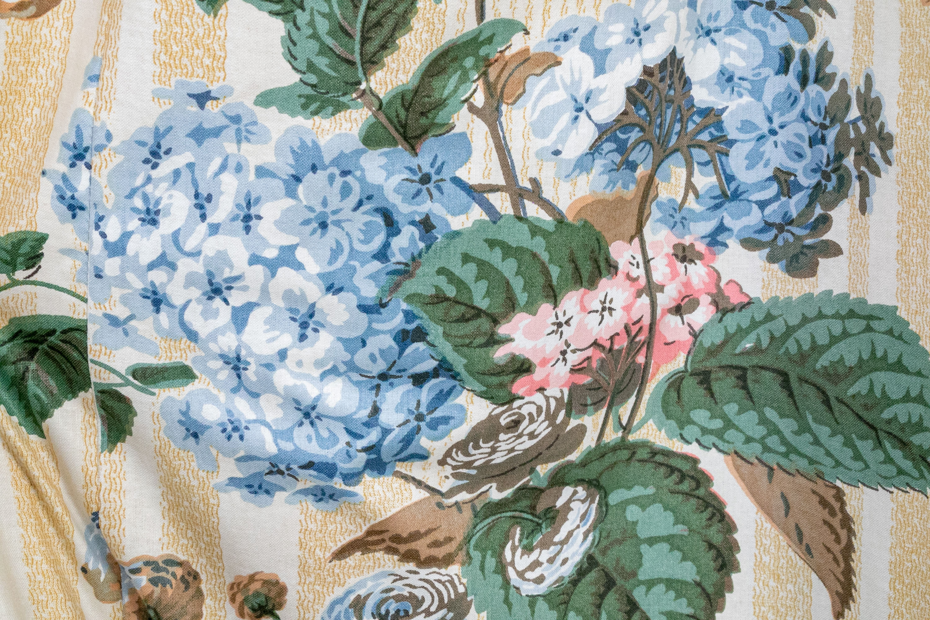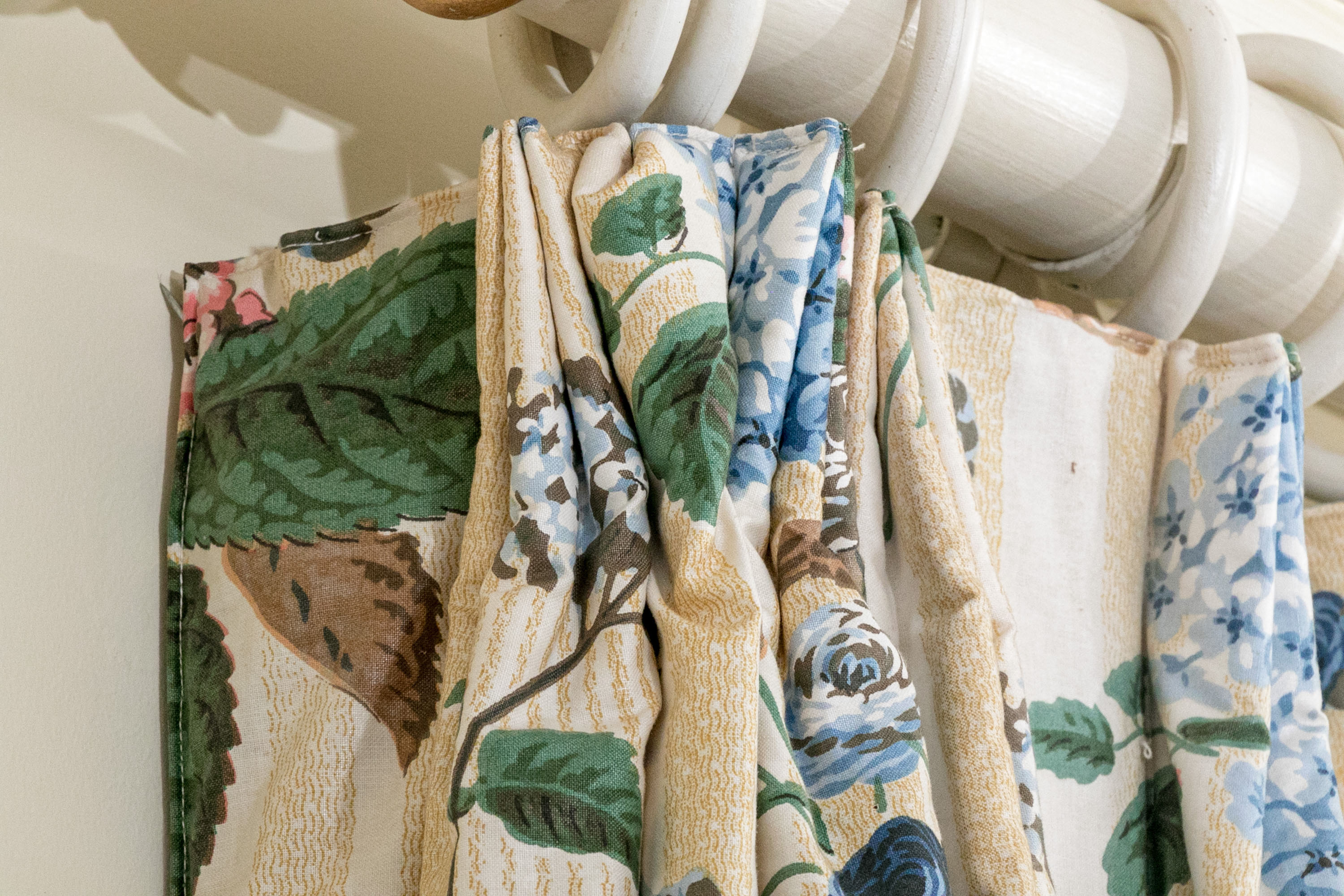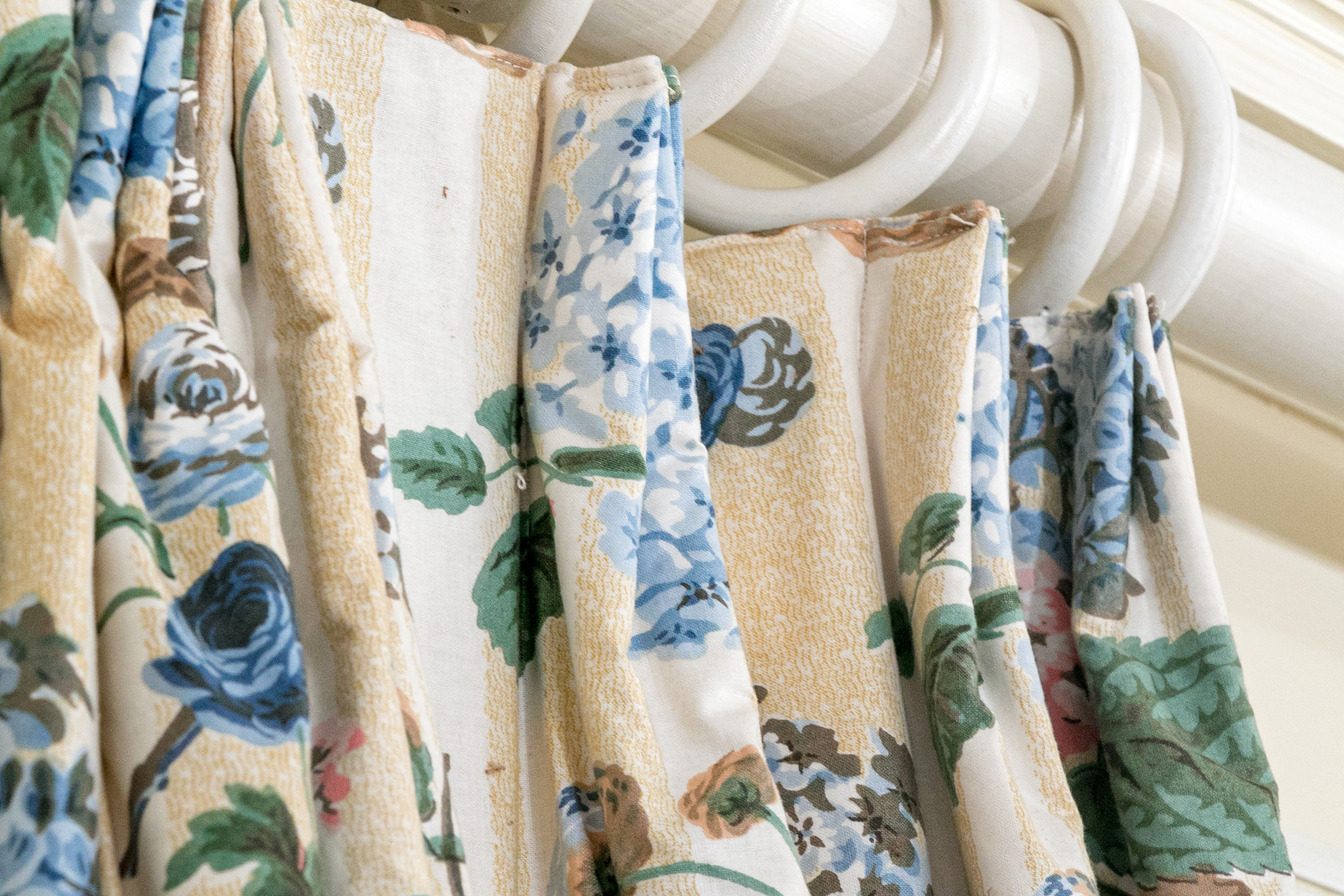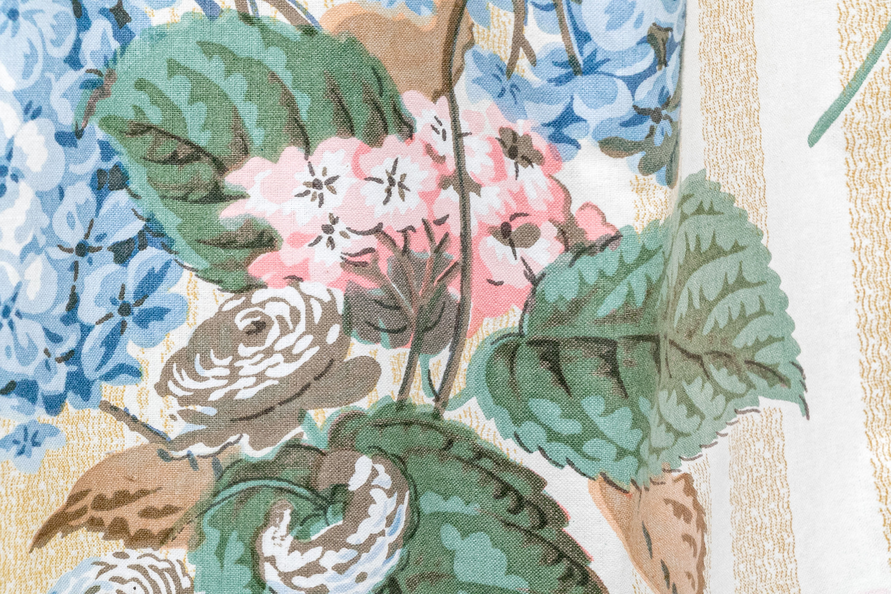 A luxurious duo of custom curtains in gorgeous chintzy fabric decorated by large floral sprays in red, blue, and yellow with lush green foliage against cream and yellow striped backgrounds. Each with white and green lattice liners n the reverse.