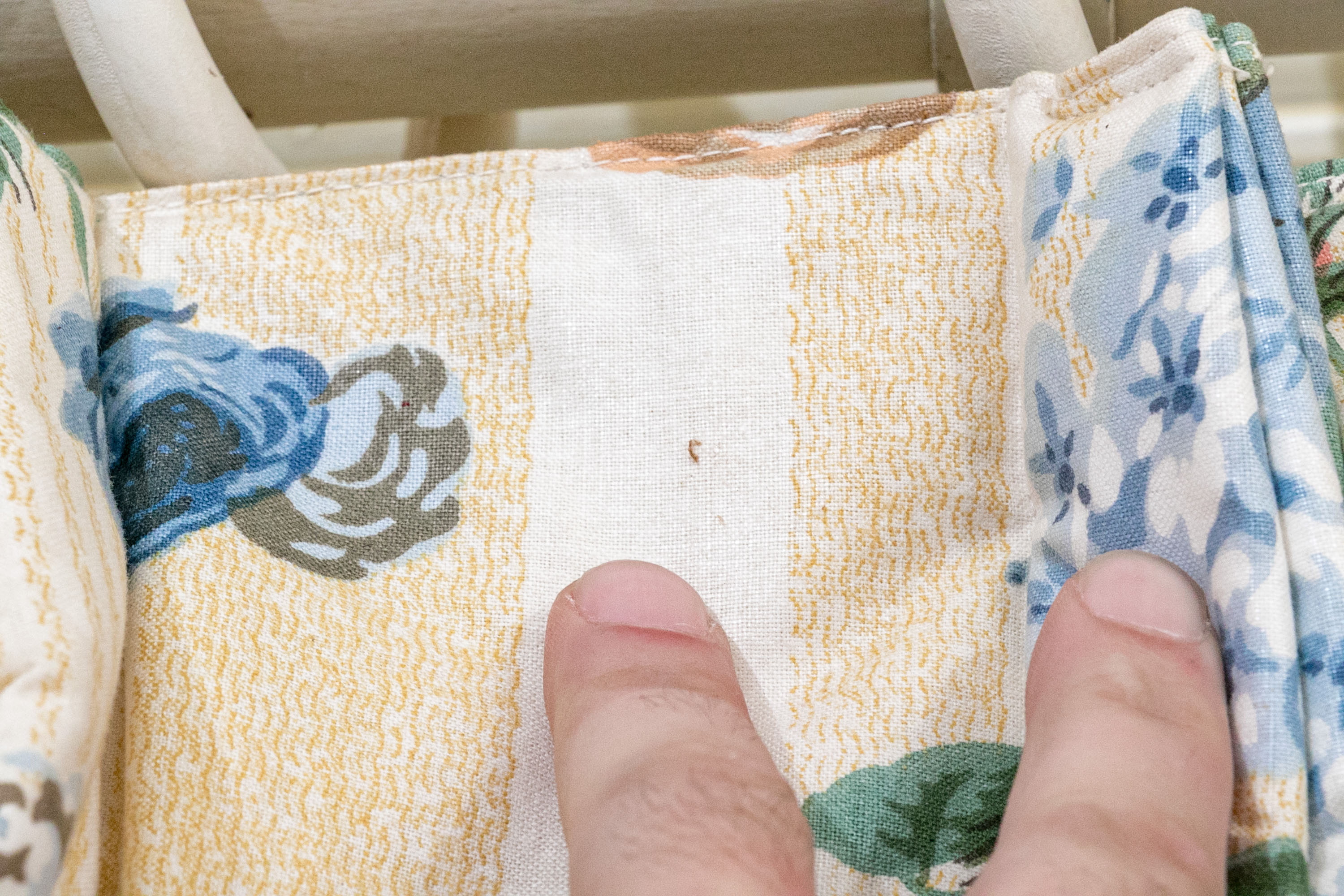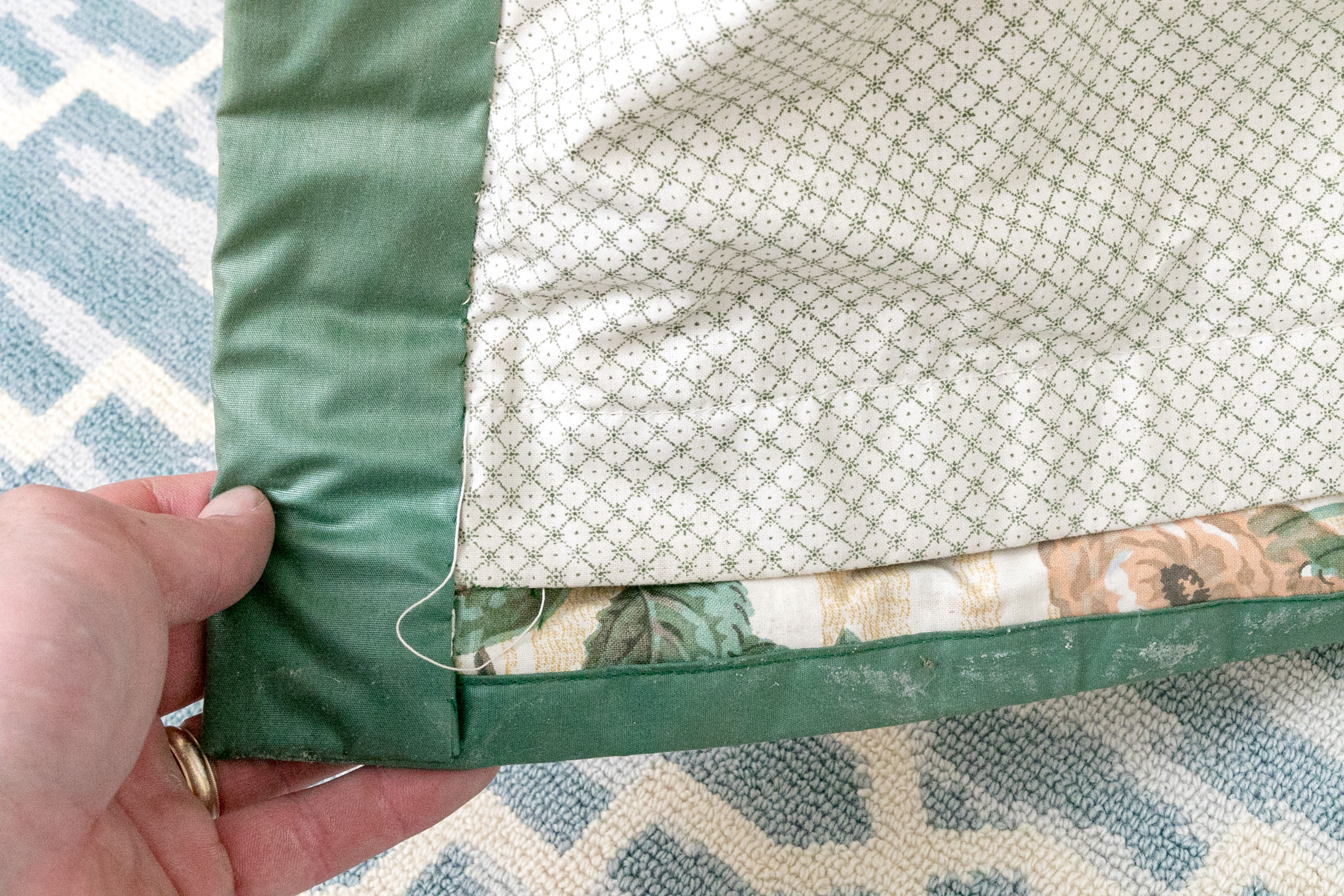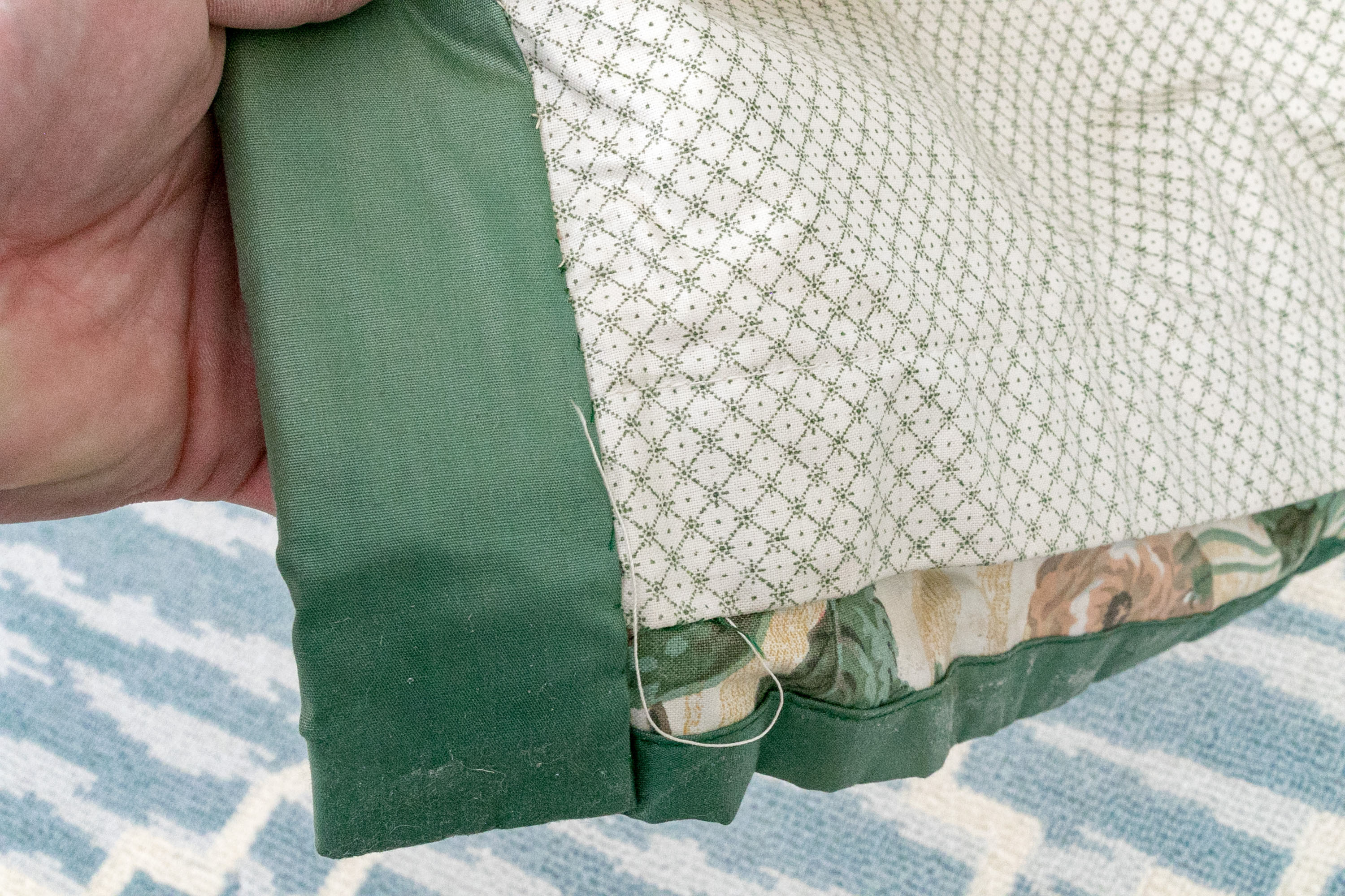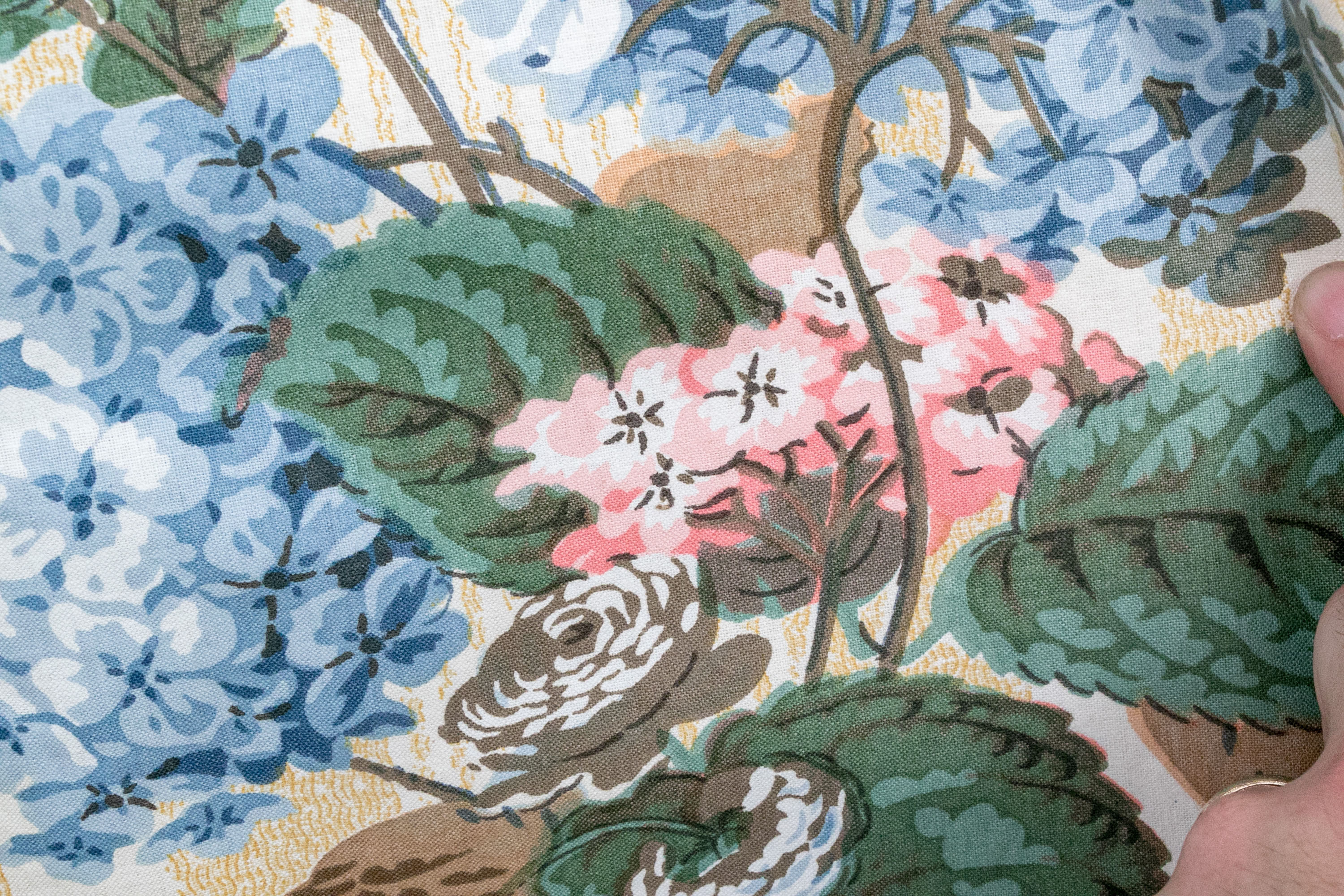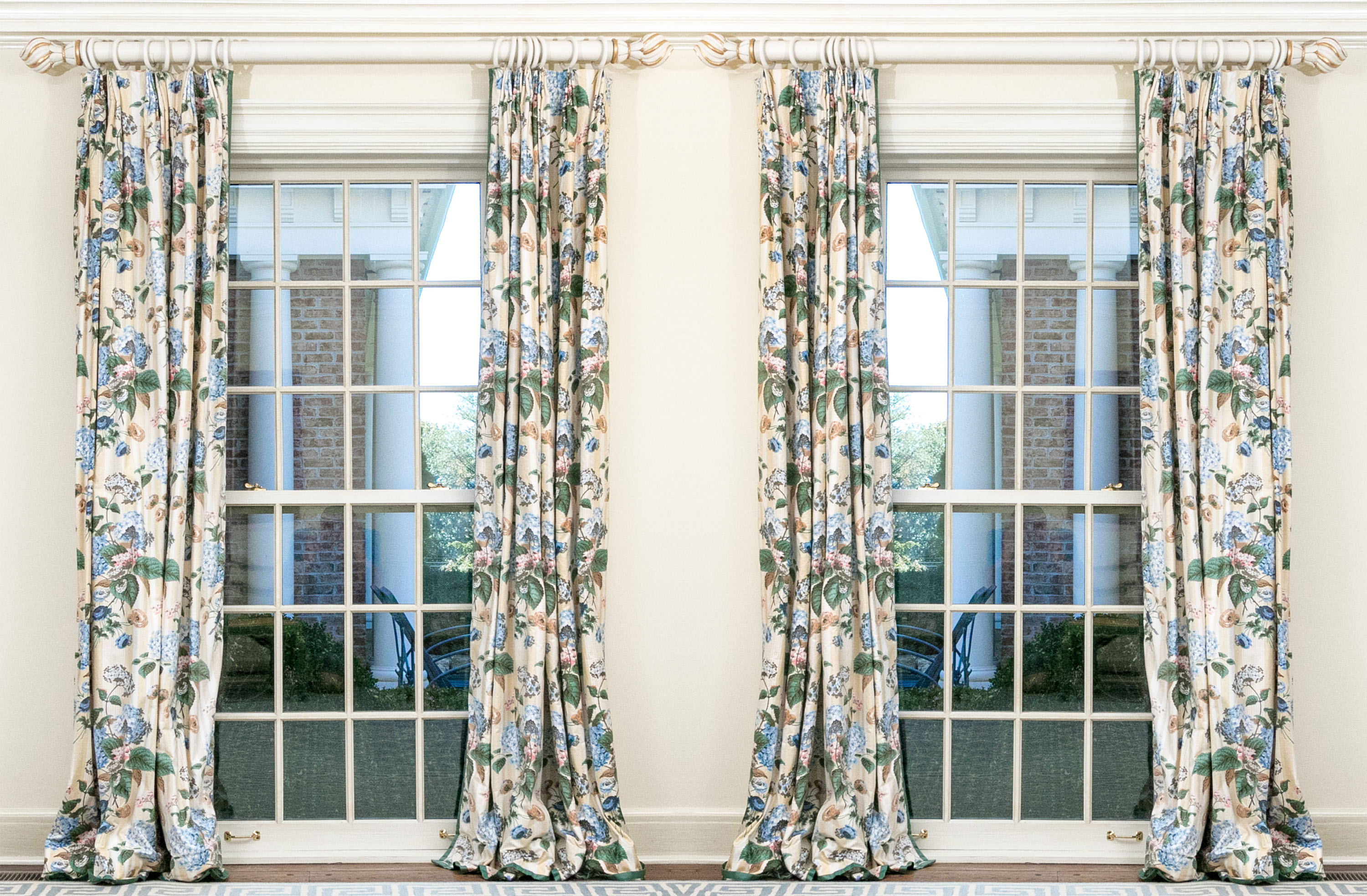 A luxurious duo of custom curtains in gorgeous chintzy fabric decorated by large floral sprays in red, blue, and yellow with lush green foliage against cream and yellow striped backgrounds. Each with white and green lattice liners n the reverse.