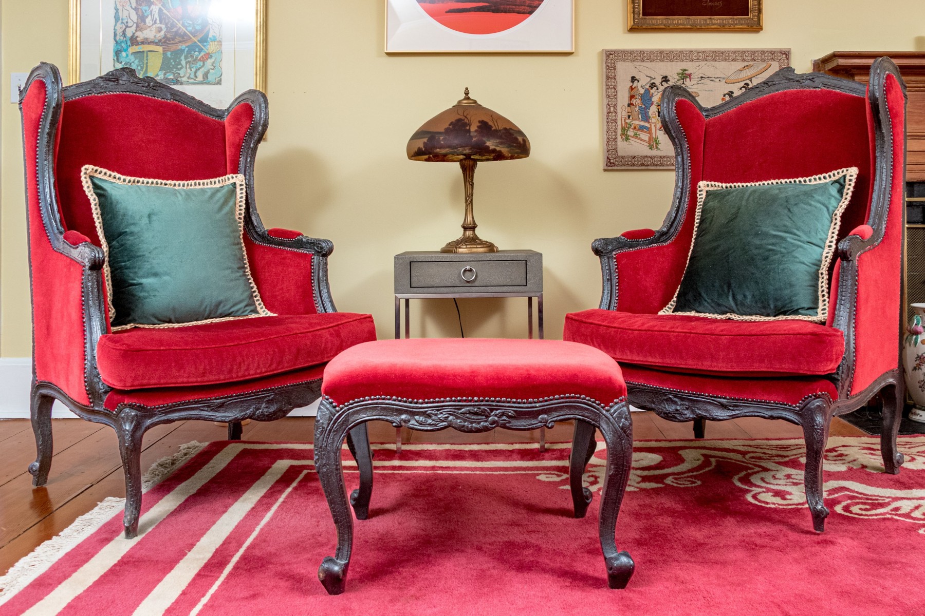 The wingback armchairs come together with a pair of quality green upholstered accent pillows with fringe.