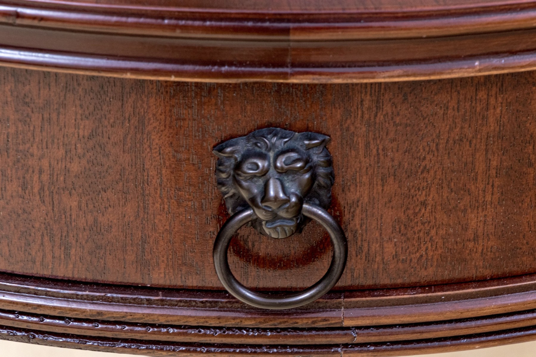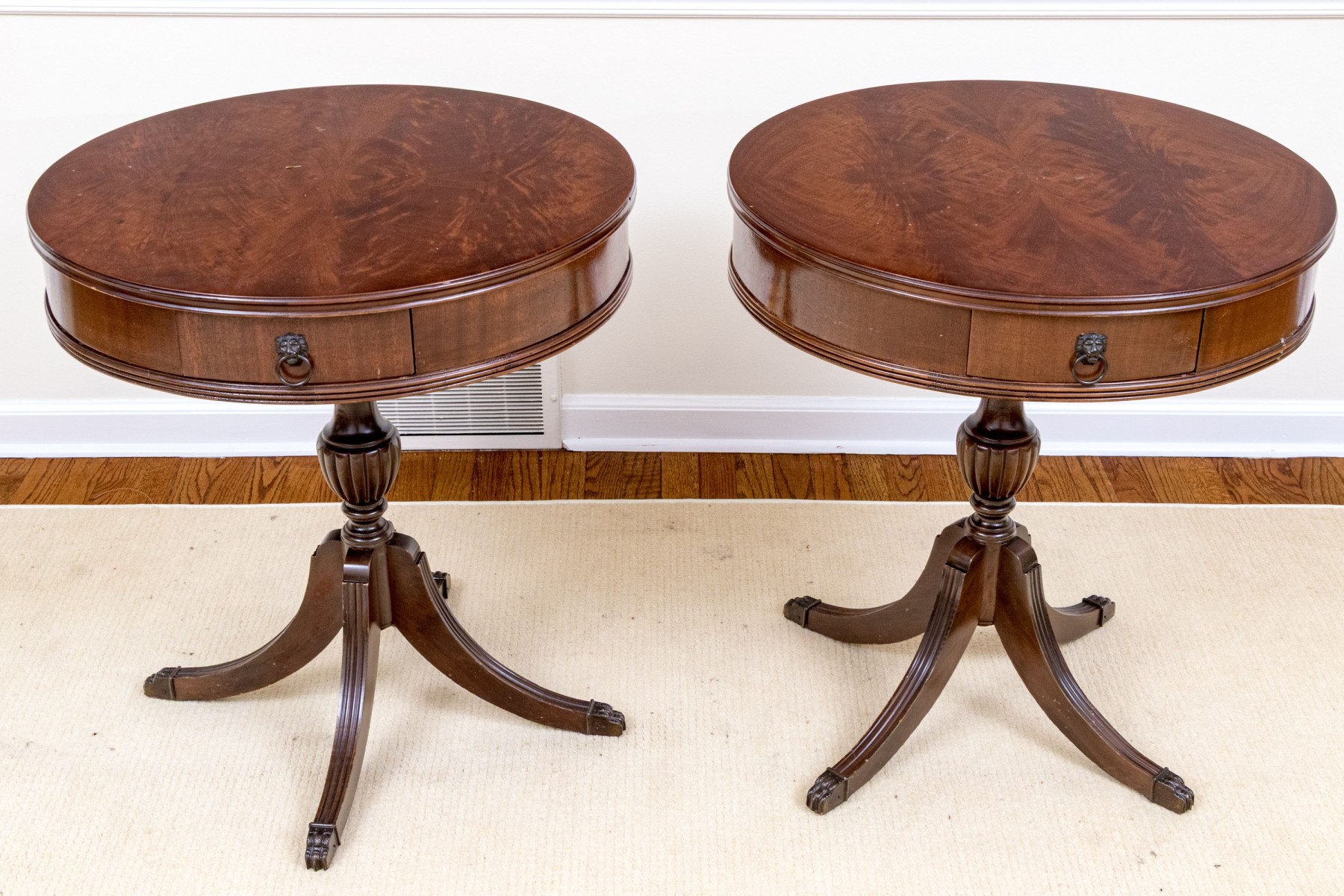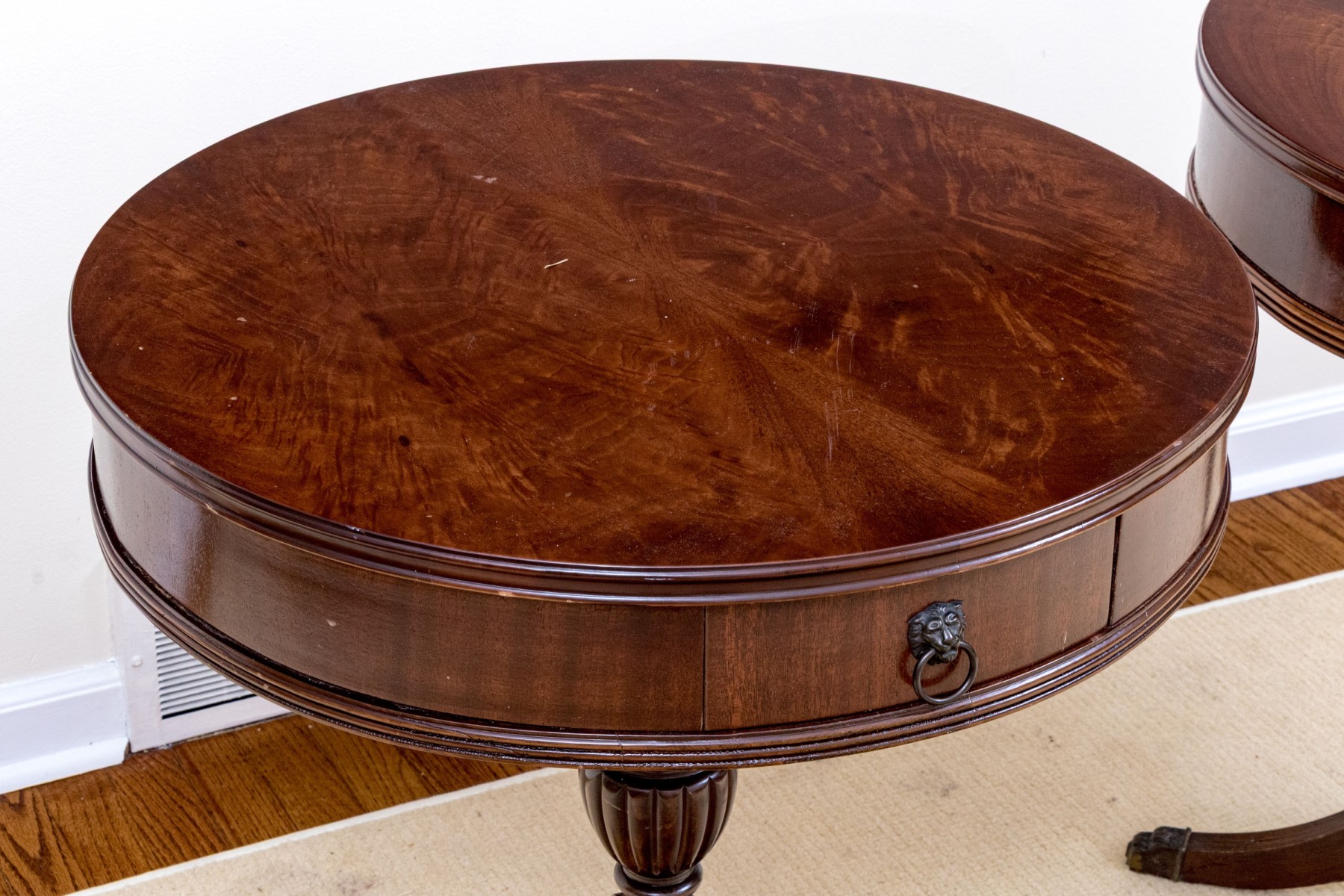 A quality pair of drum tables in classic Regency style, finely crafted in rich red-brown mahogany. Raised on four curved legs with brass paw toe caps. The cylindrical tables on pedestals with two drawers each with lion mask handles and loose rings.