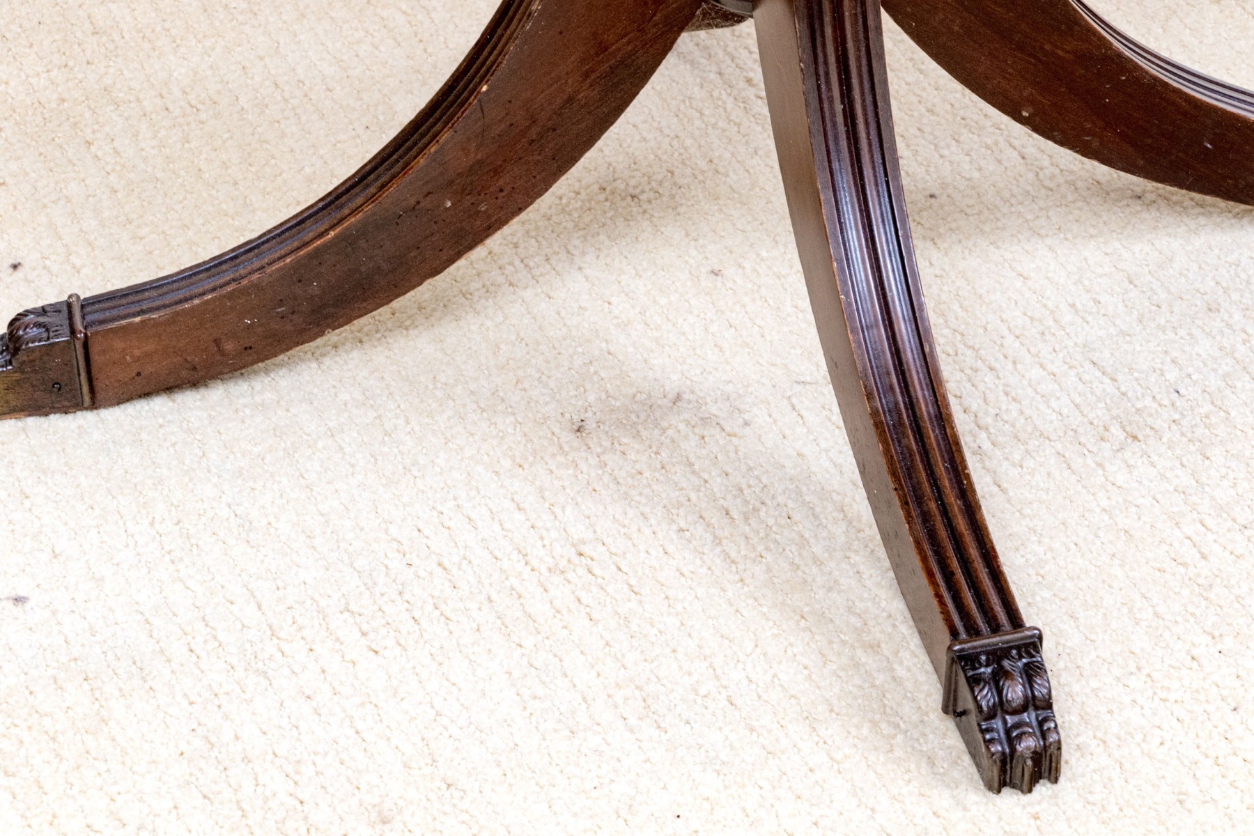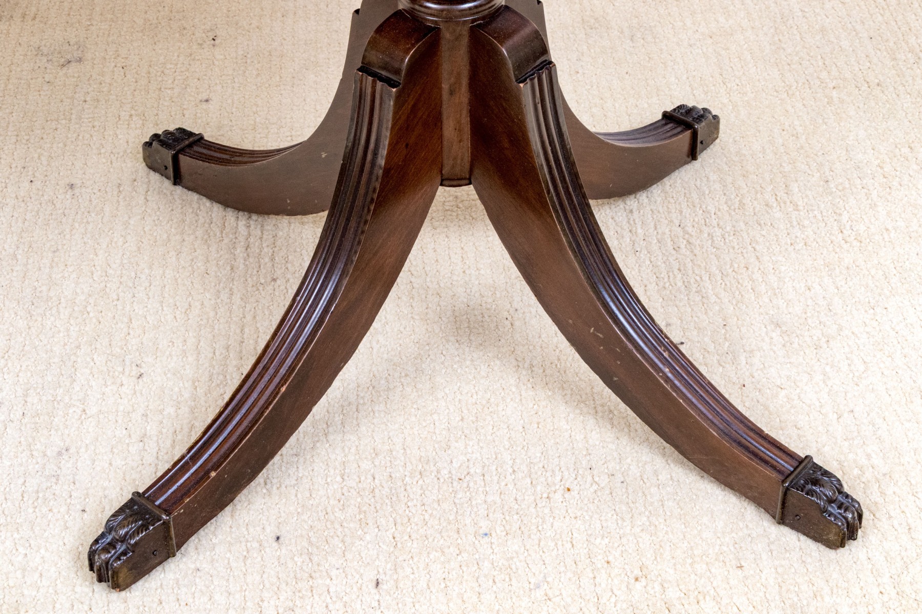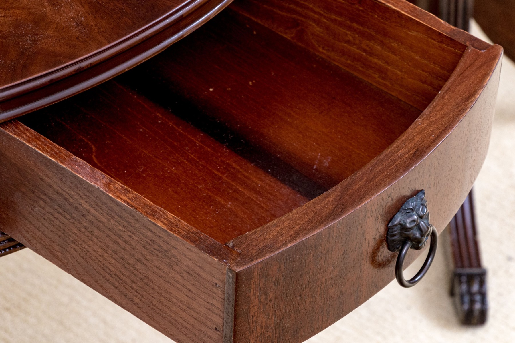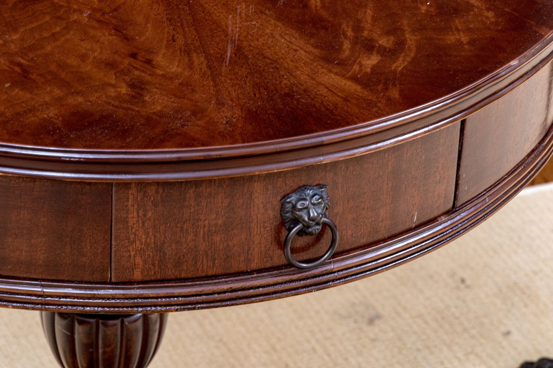 A quality pair of drum tables in classic Regency style, finely crafted in rich red-brown mahogany. Raised on four curved legs with brass paw toe caps. The cylindrical tables on pedestals with two drawers each with lion mask handles and loose rings.