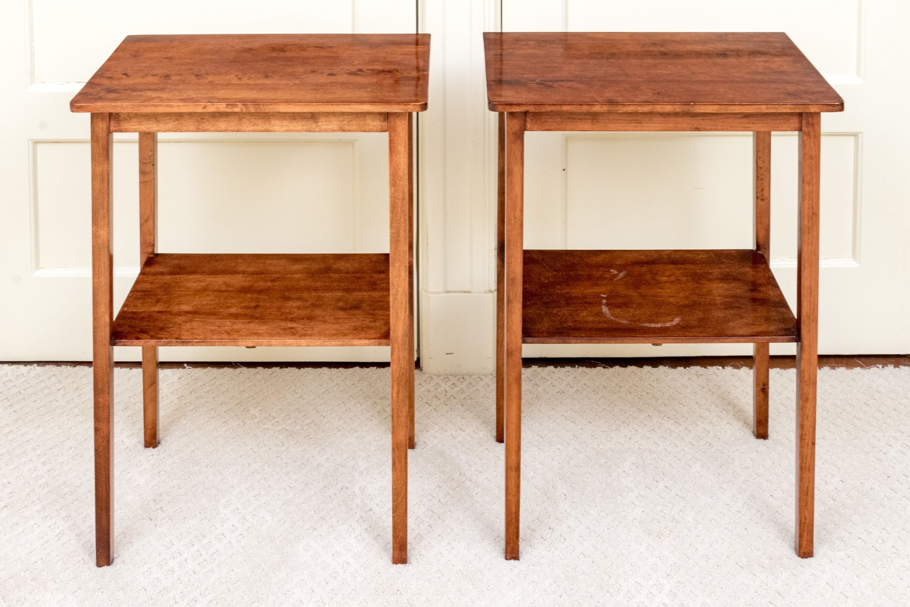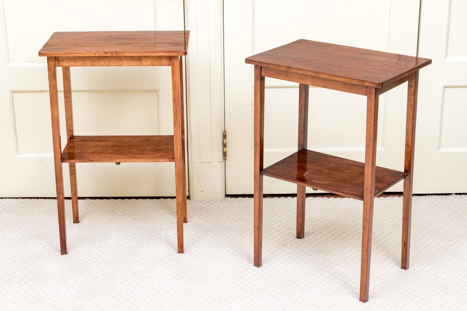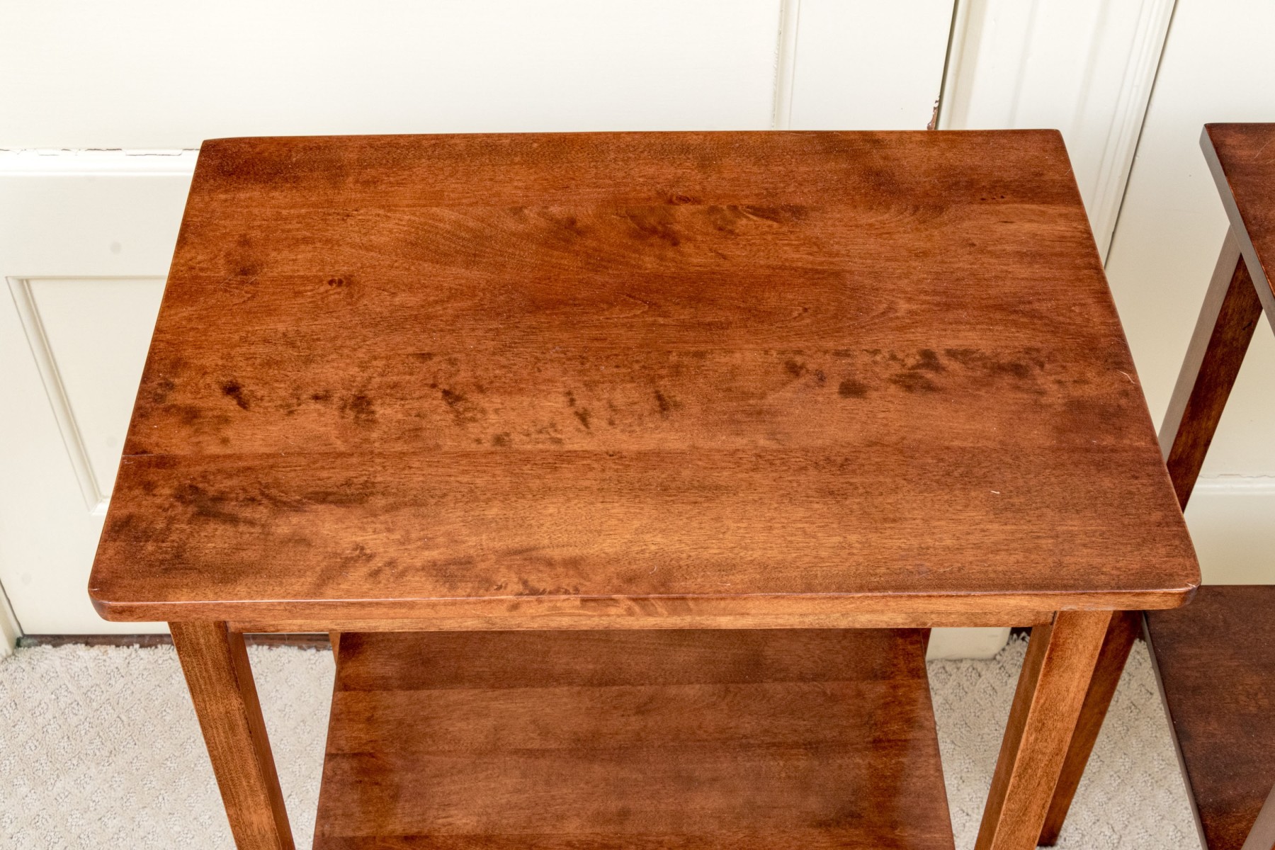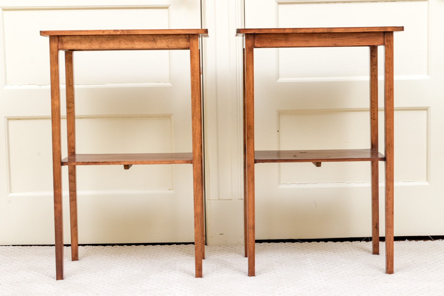 A delightful pair of warm medium brown mahogany end tables with mid century flare, featuring rectangular tops with gently rounded front corners supported by straight, subtly tapered legs around open lower shelves.