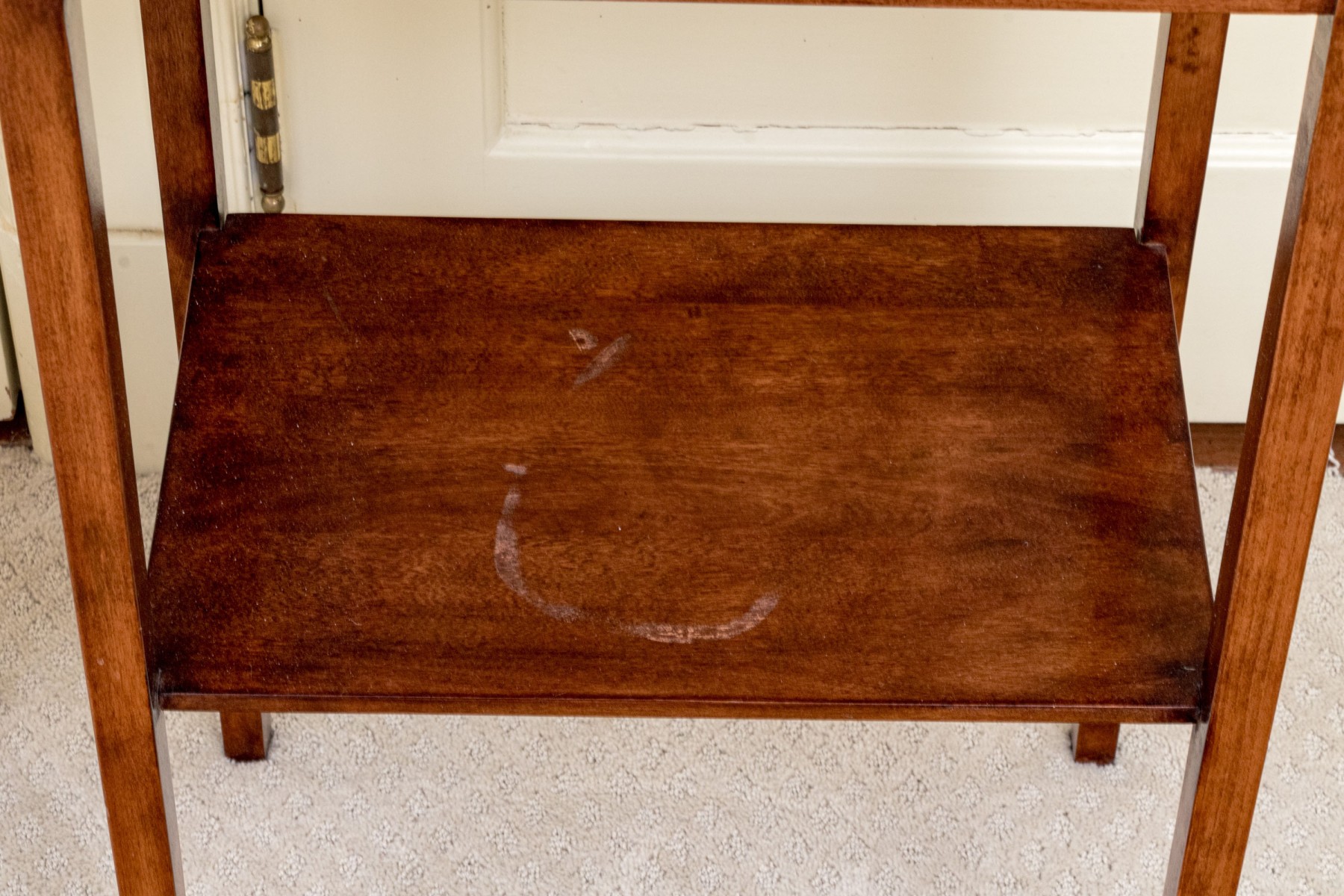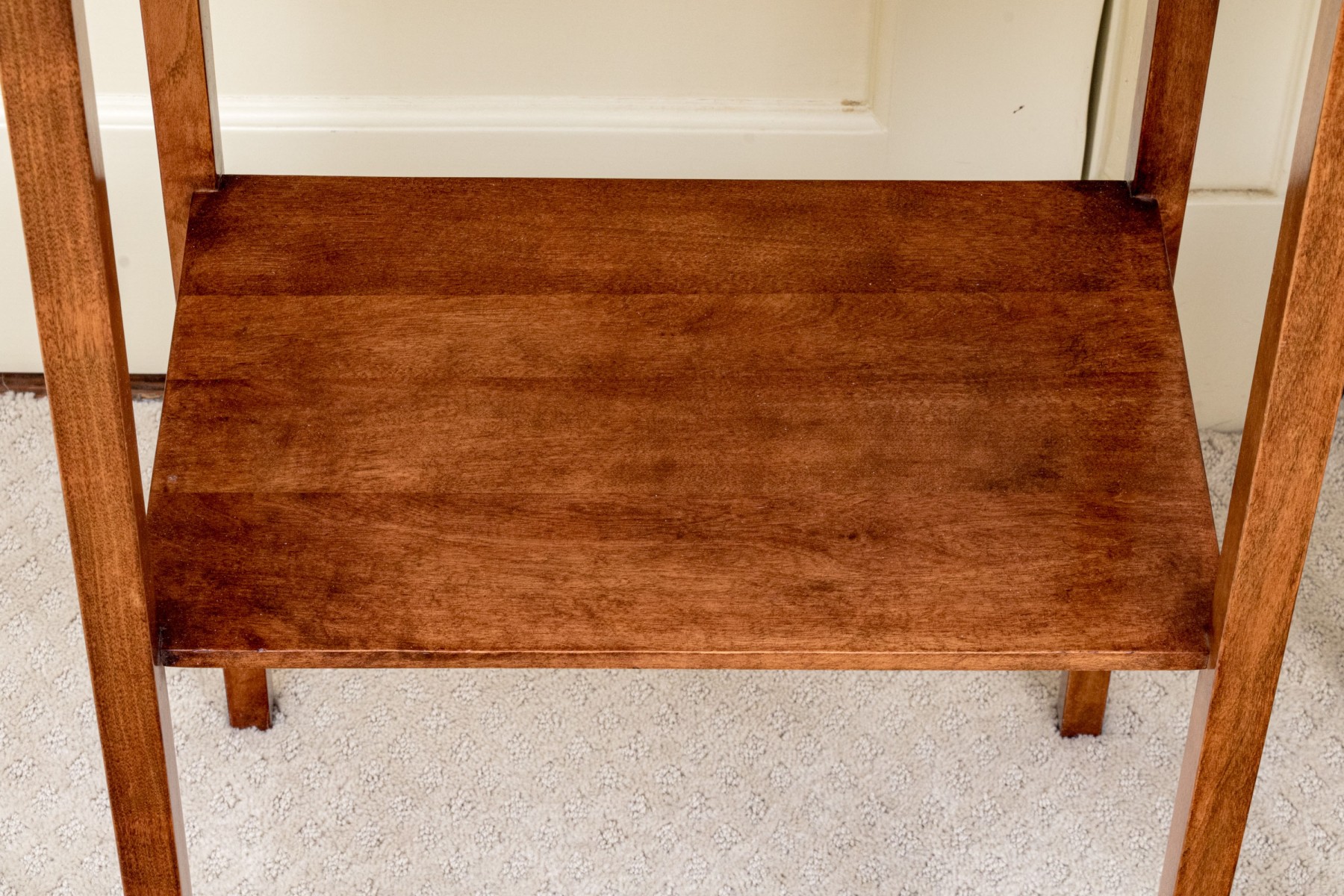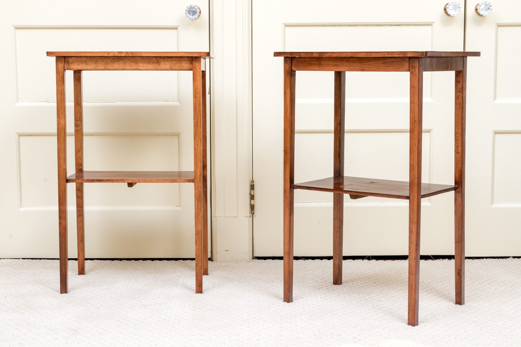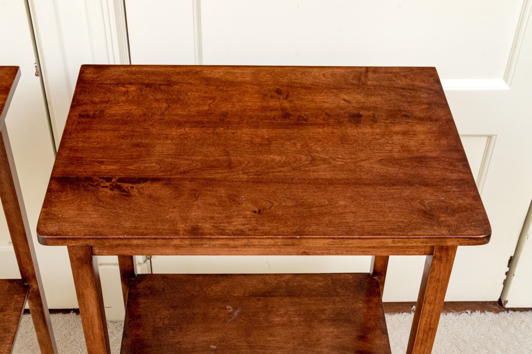 A delightful pair of warm medium brown mahogany end tables with mid century flare, featuring rectangular tops with gently rounded front corners supported by straight, subtly tapered legs around open lower shelves.