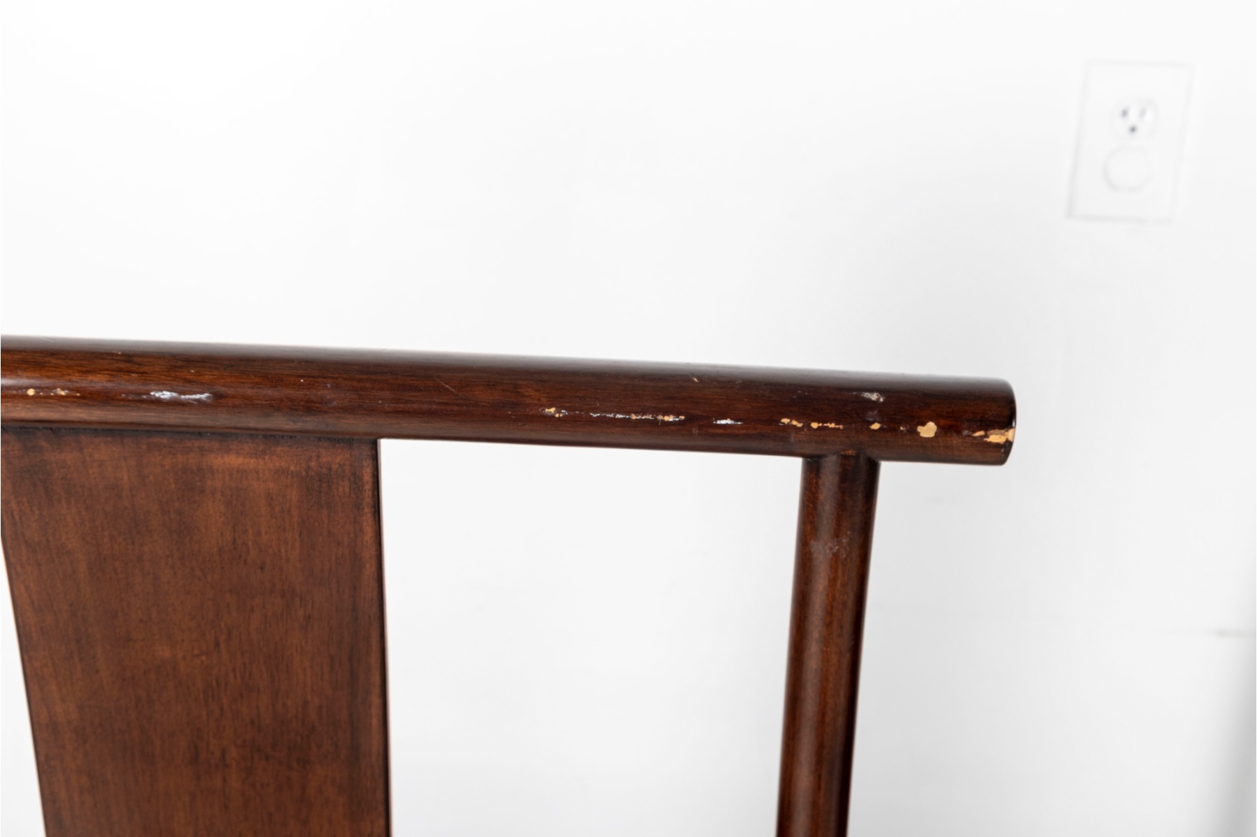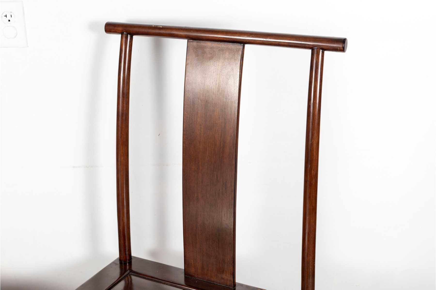 Pair of contemporary hardwood chairs by designer Maria Yee, crafted in elegant Ming-style form with a tall, curved backrest, wide seat, and stretcher base. Finished in a rich dark brown stain highlighting the natural wood grain.