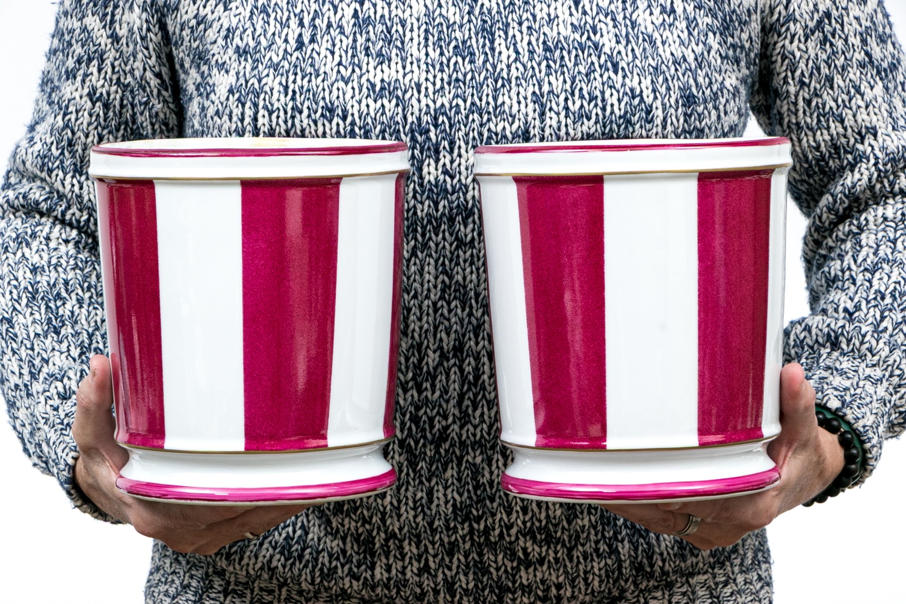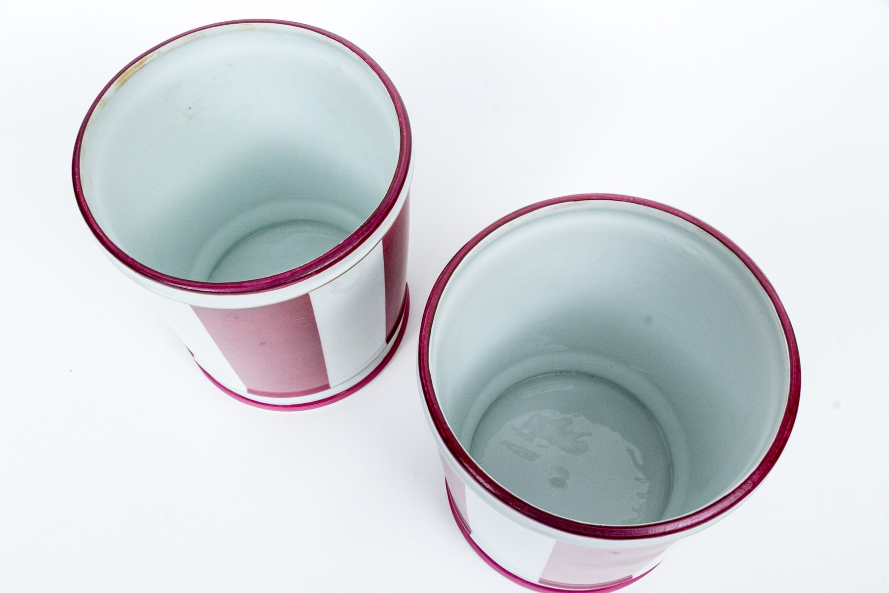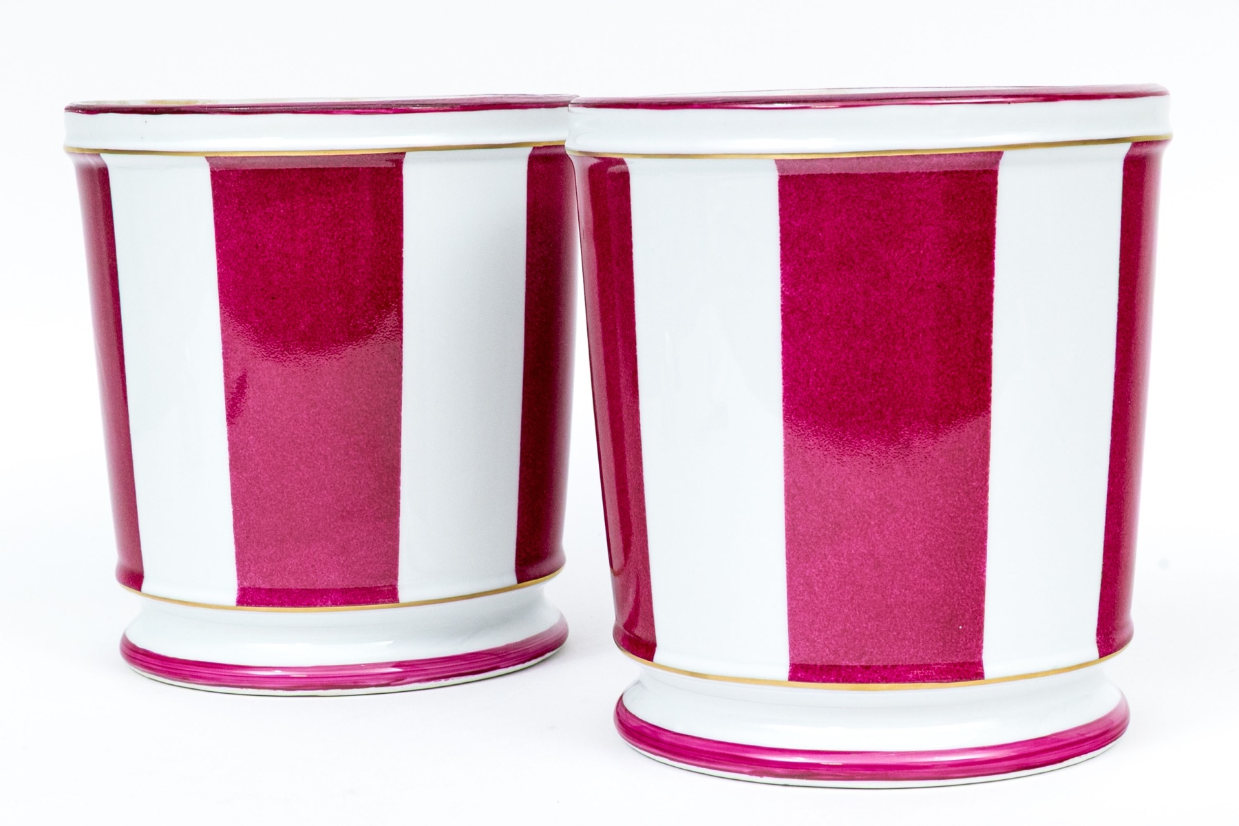 Retailed by Bergdorf Goodman, New York. Elegant large white porcelain cache pots with wide deep pink bands and gilt details.