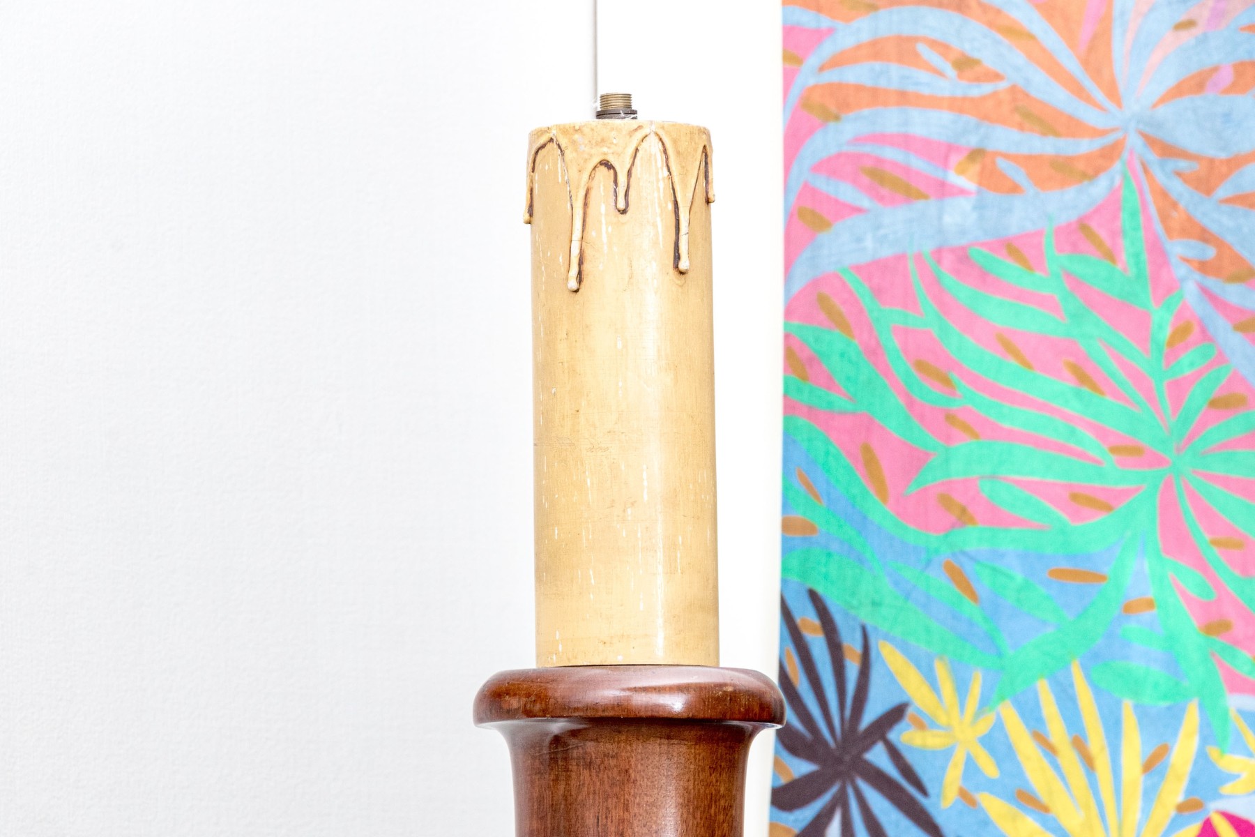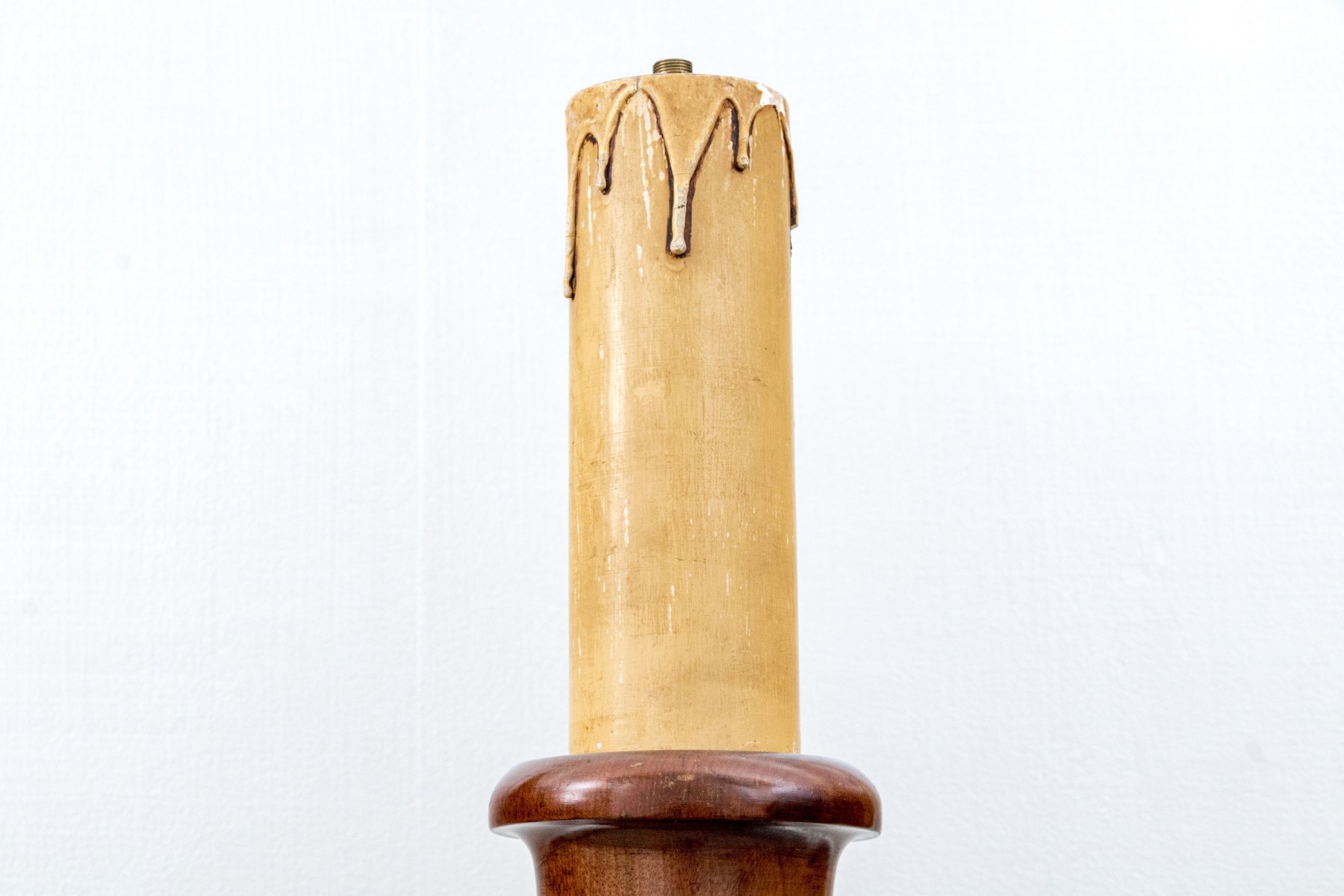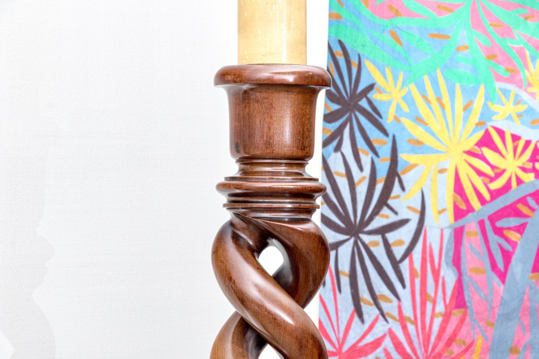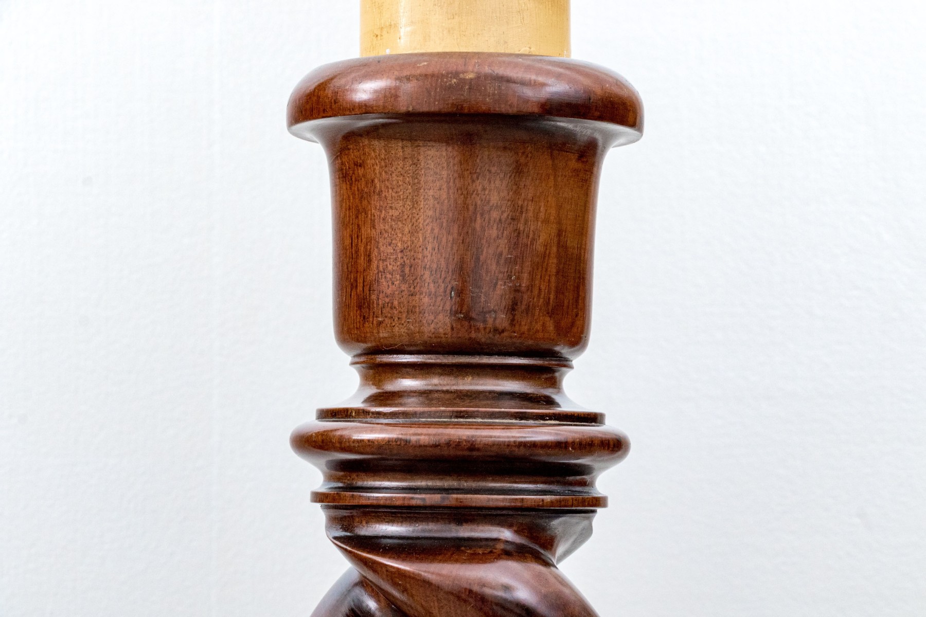 A handsome pair of massive English floor lamps in candlestick form with de-electrified pillar candle sockets raised over stately and sculptural barley twist columns in a rich, medium brown finish. The columns are supported by elegant square beveled bases raised on bracket feet.