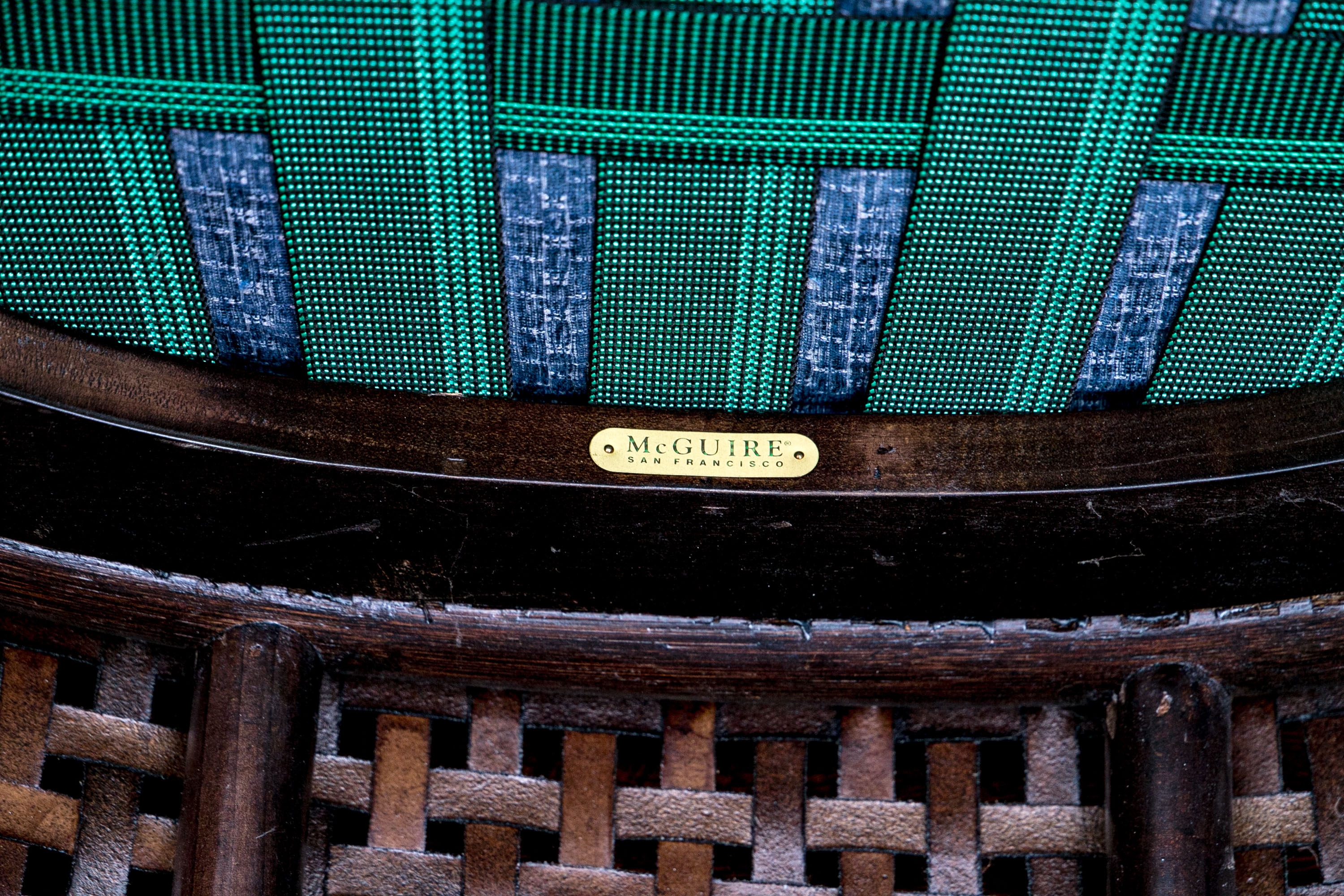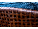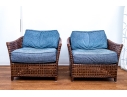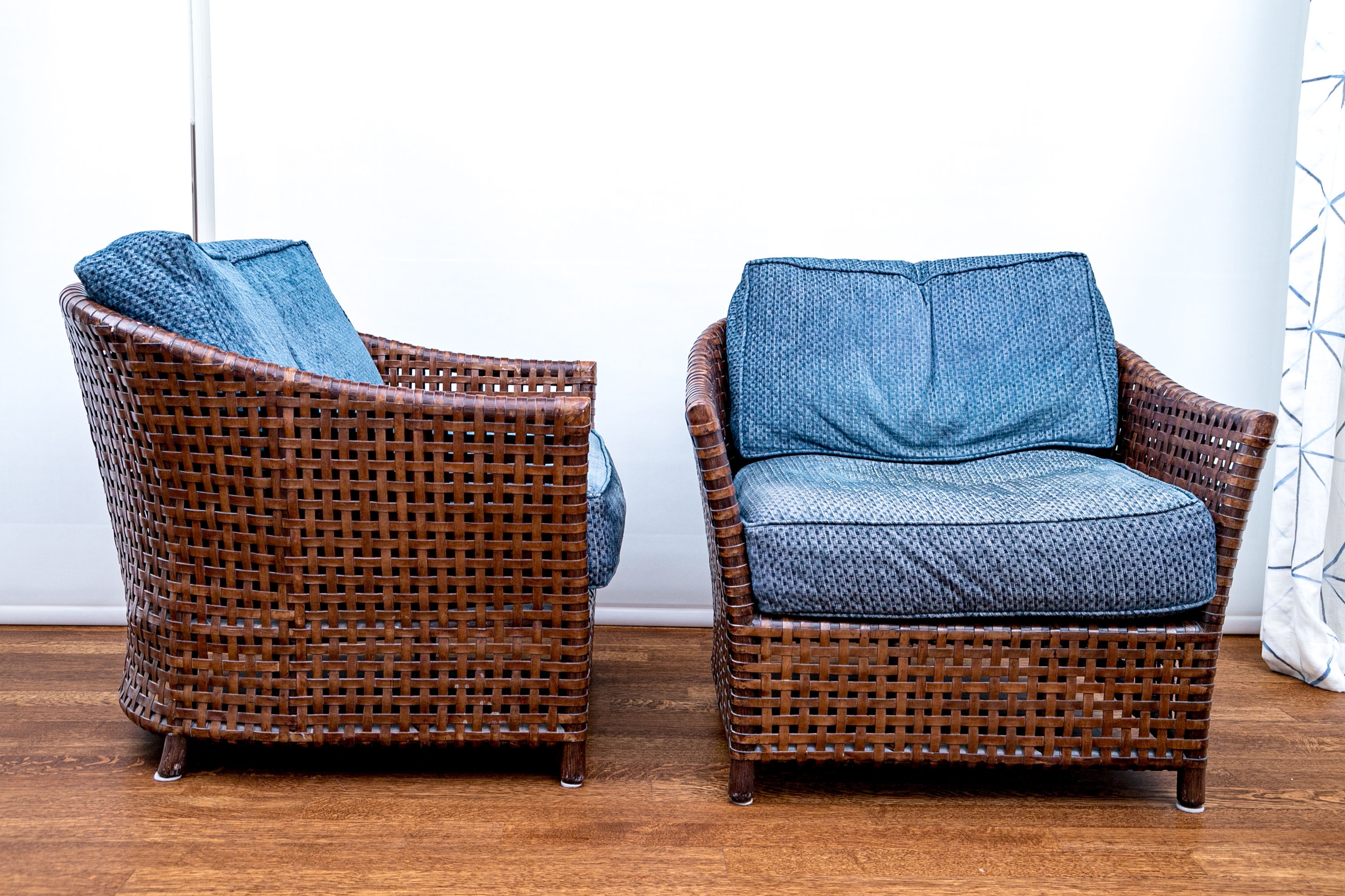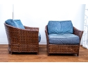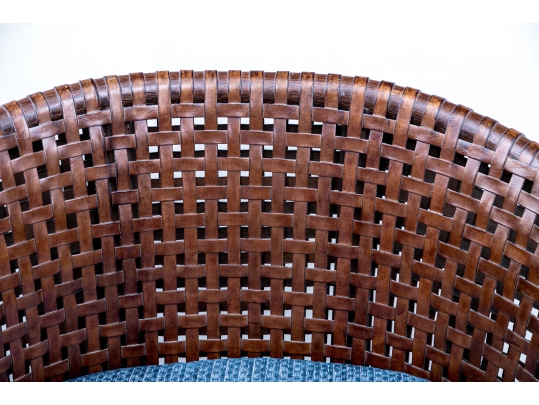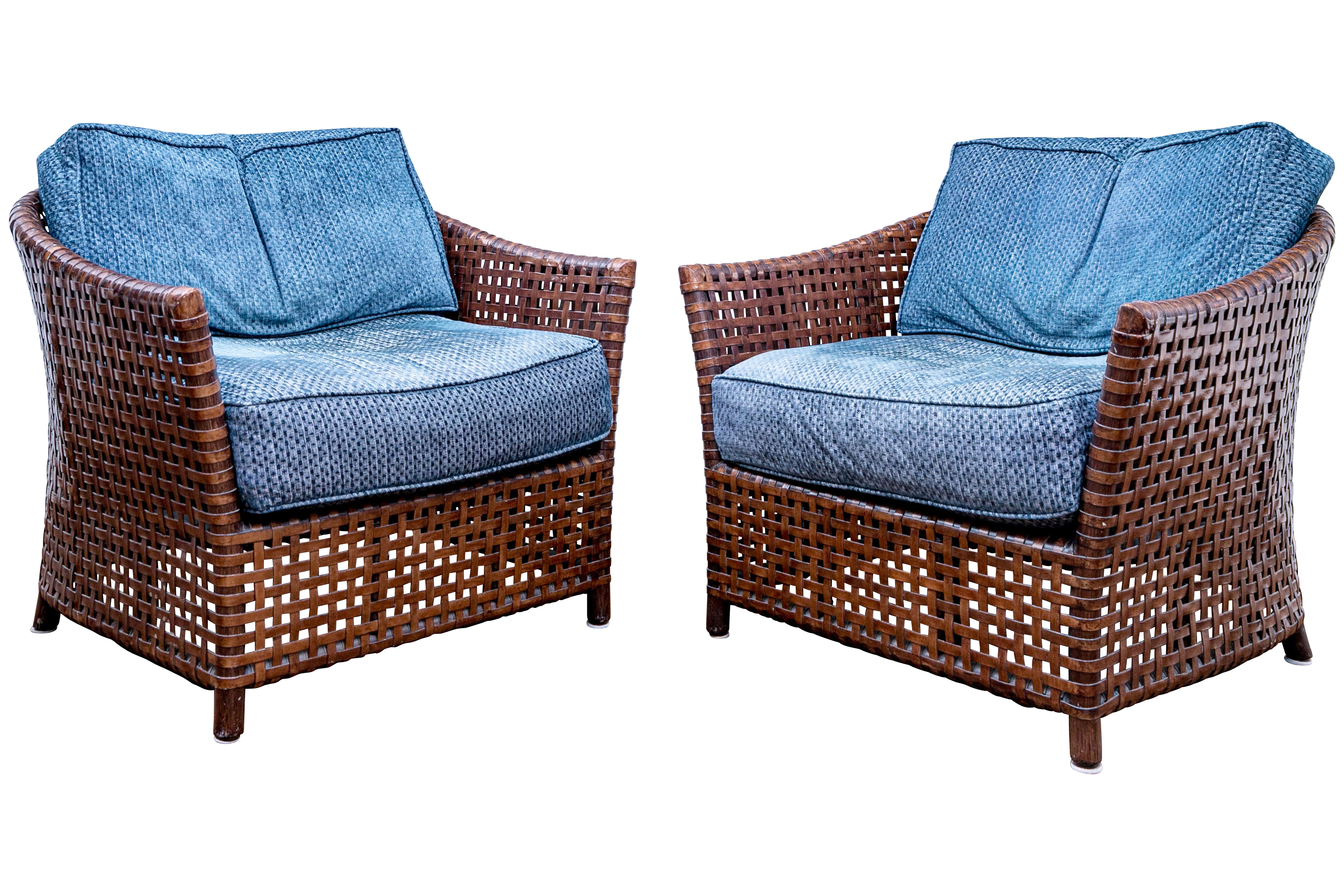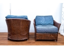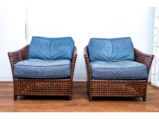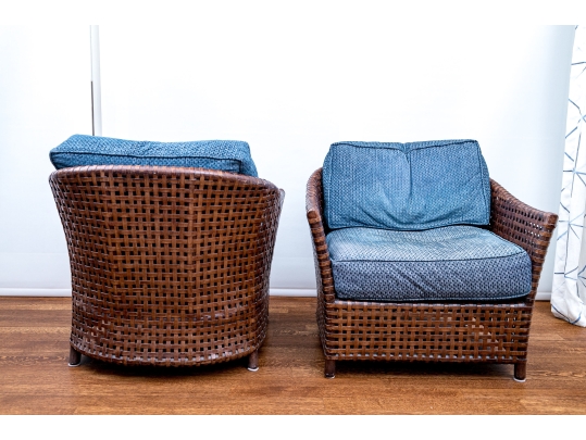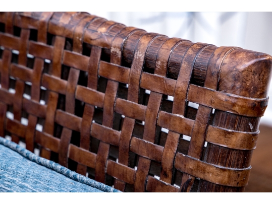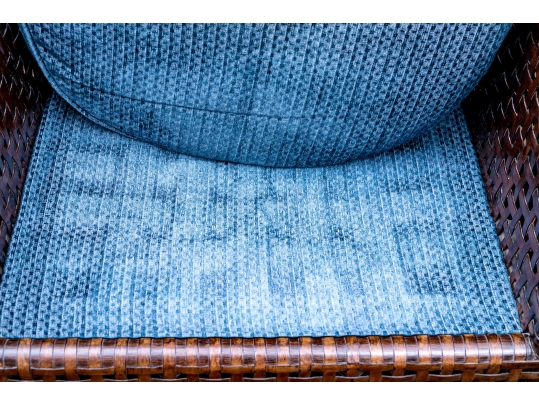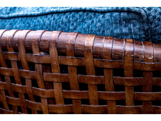 Part of the Antalya Collection by McGuire Furniture with rattan construction and laced with durable woven leather strapping. The chair with gently flared armrests, generous loose cushion seat and back, barrel back and resting on round feet. The pieces with blue textured upholstery with a gentle raised geometric pattern.