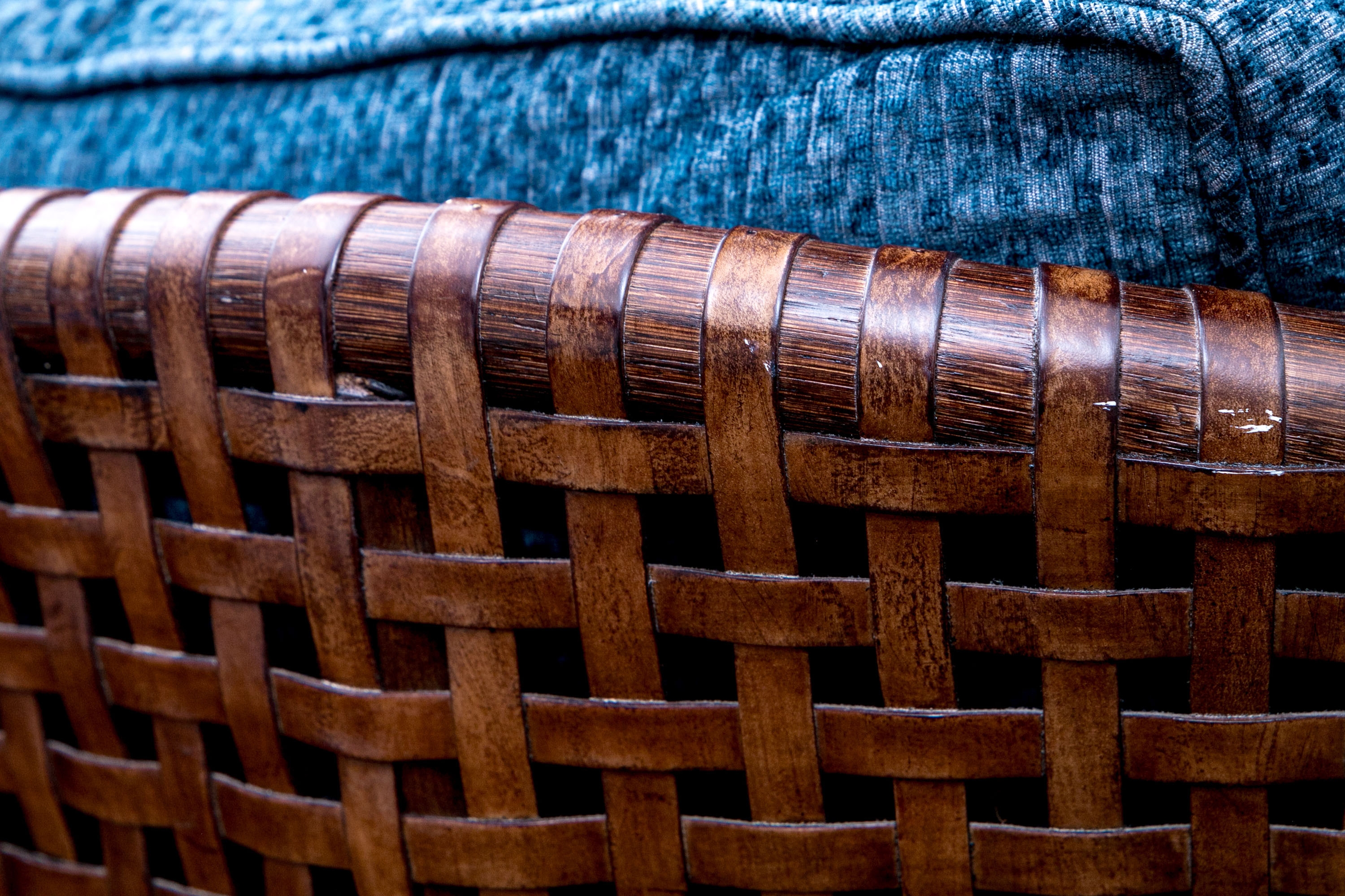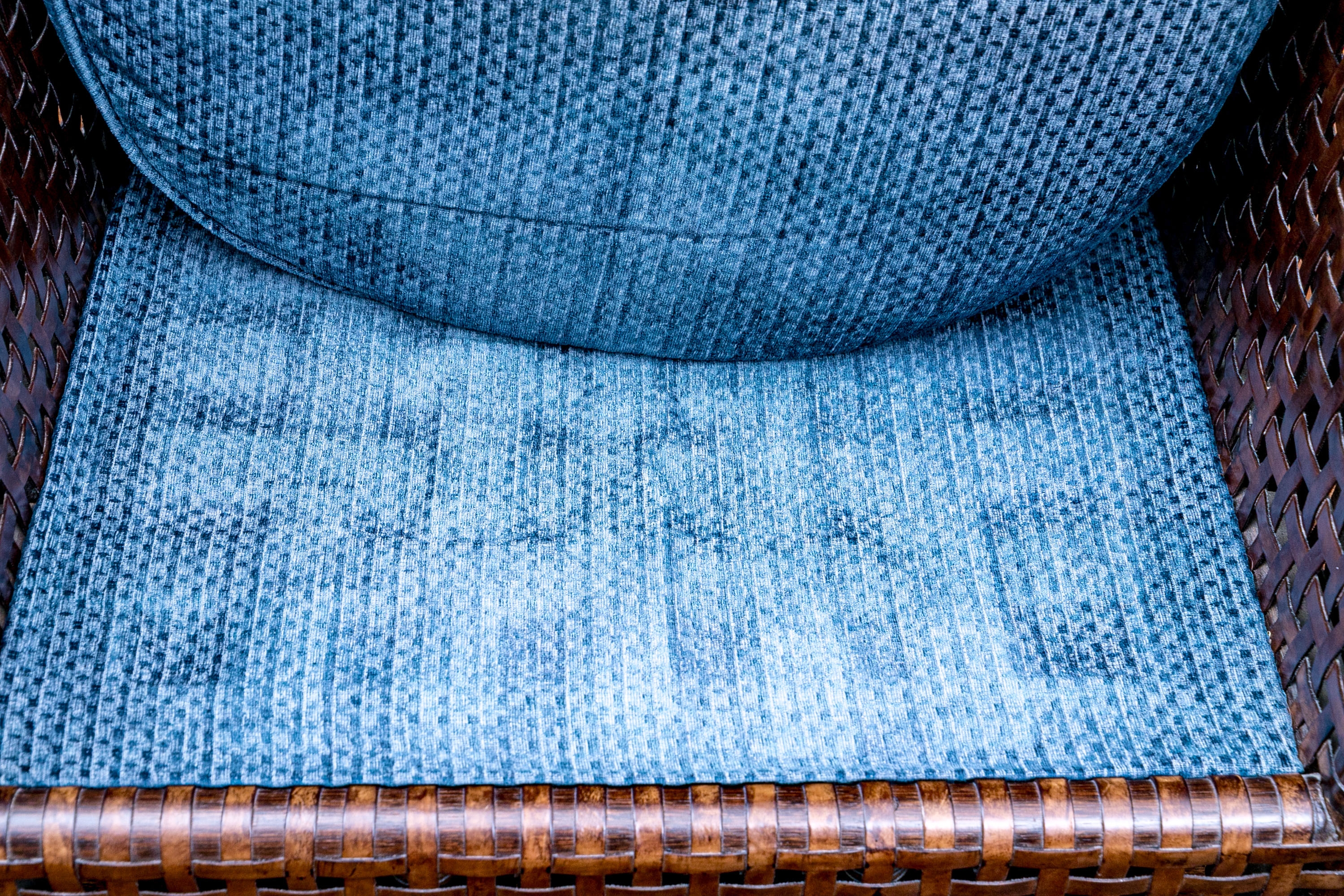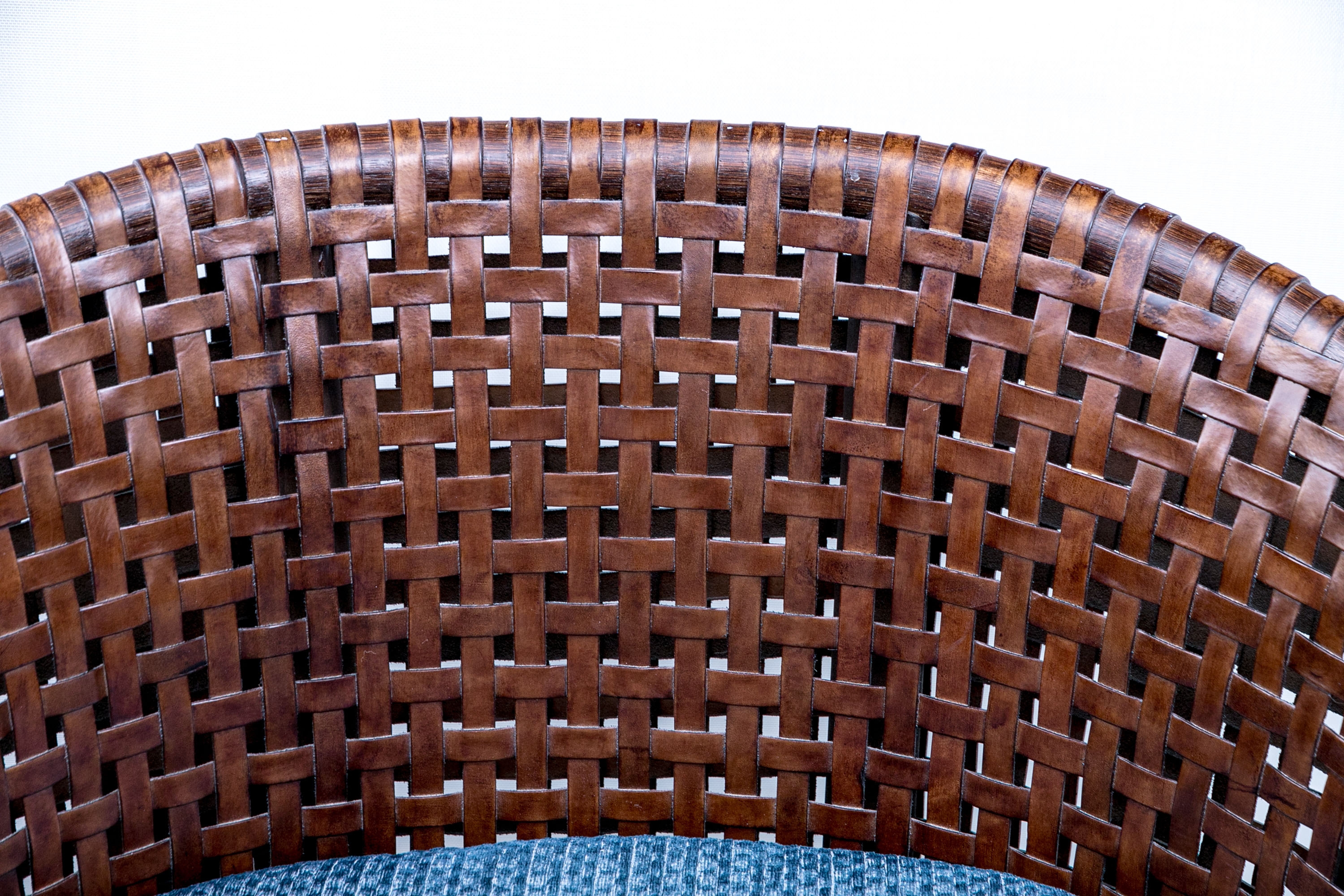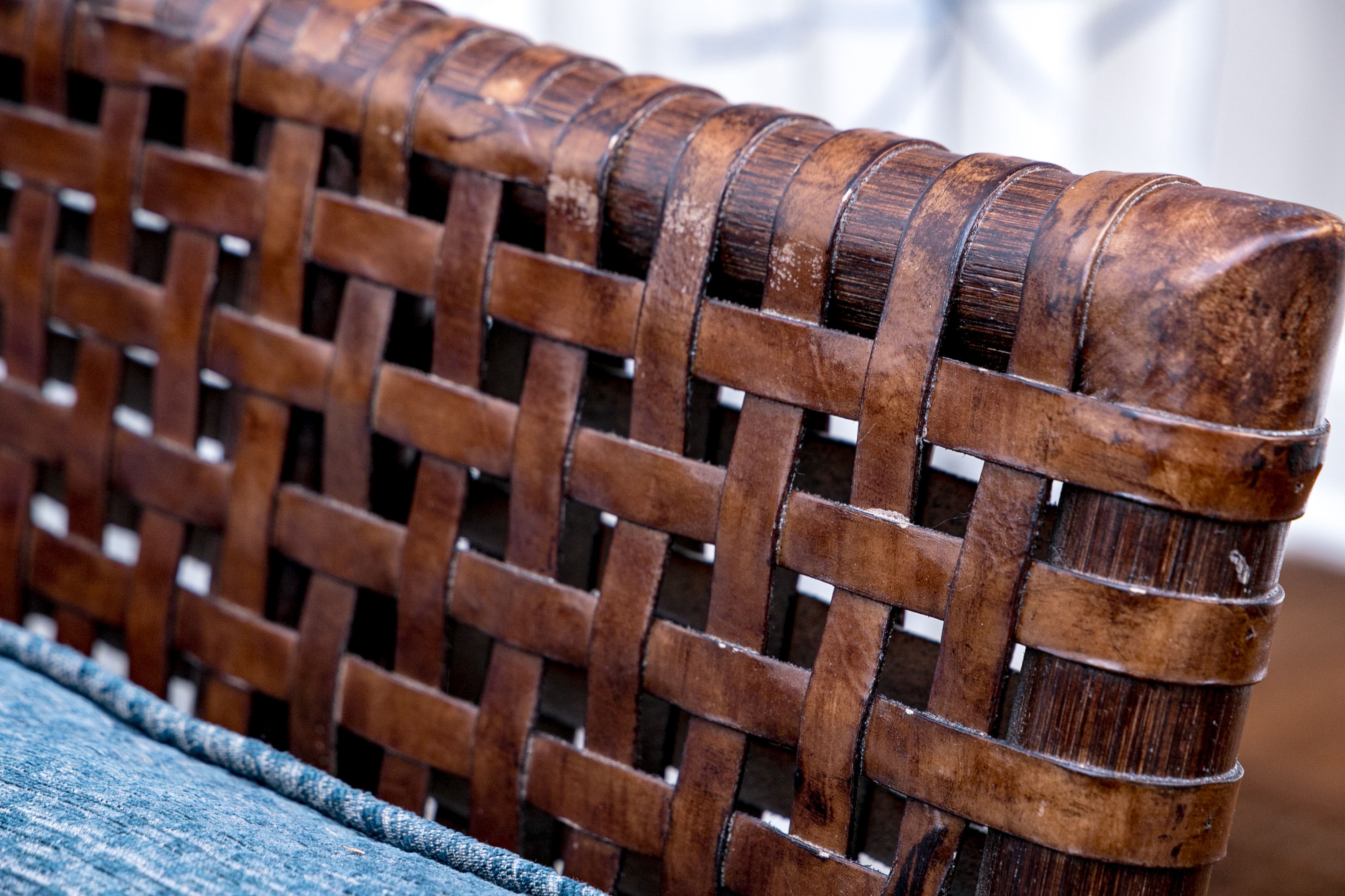 Part of the Antalya Collection by McGuire Furniture with rattan construction and laced with durable woven leather strapping. The chair with gently flared armrests, generous loose cushion seat and back, barrel back and resting on round feet. The pieces with blue textured upholstery with a gentle raised geometric pattern.