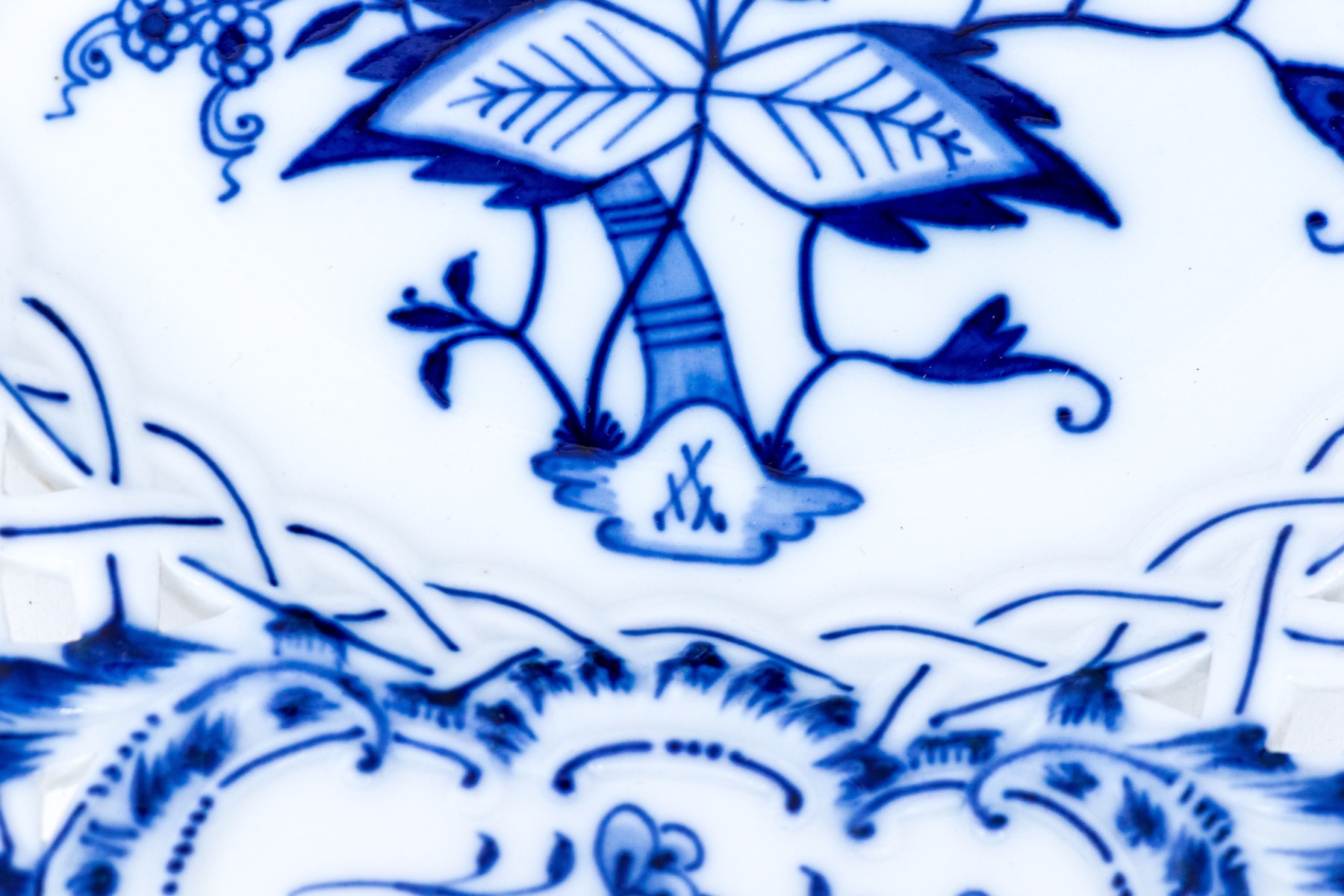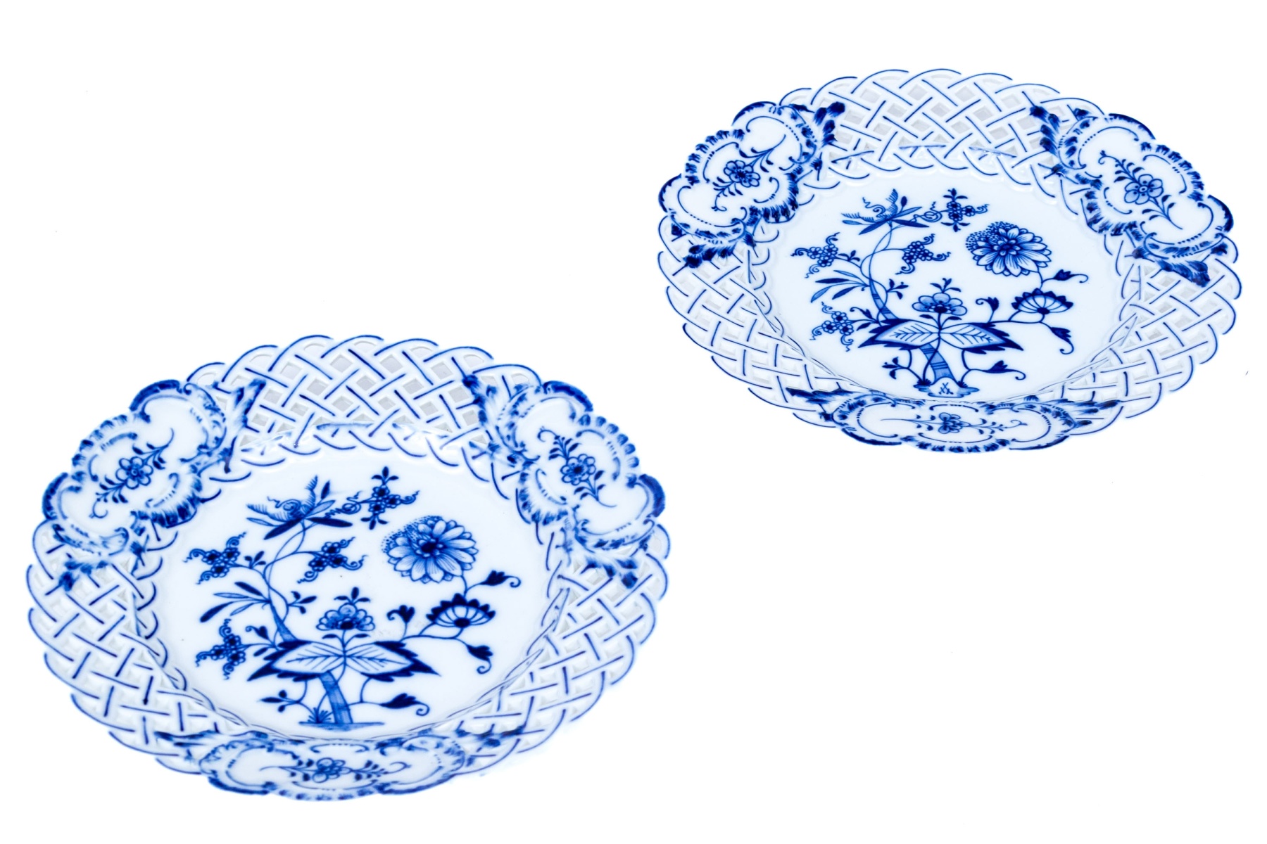 Blue floral motifs with openwork basket weave form borders. Marked underfoot.