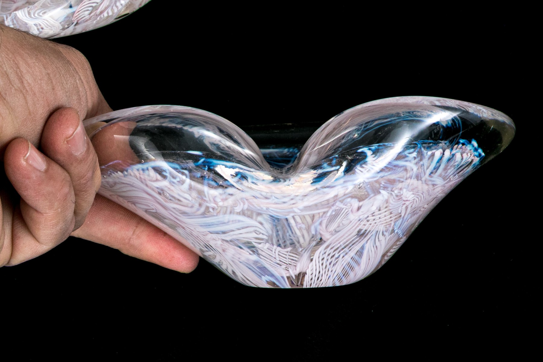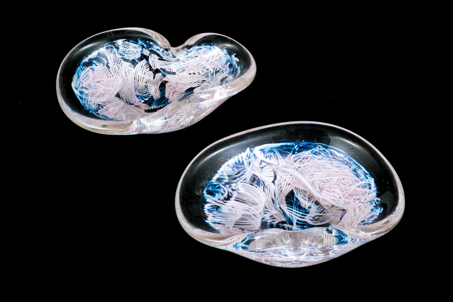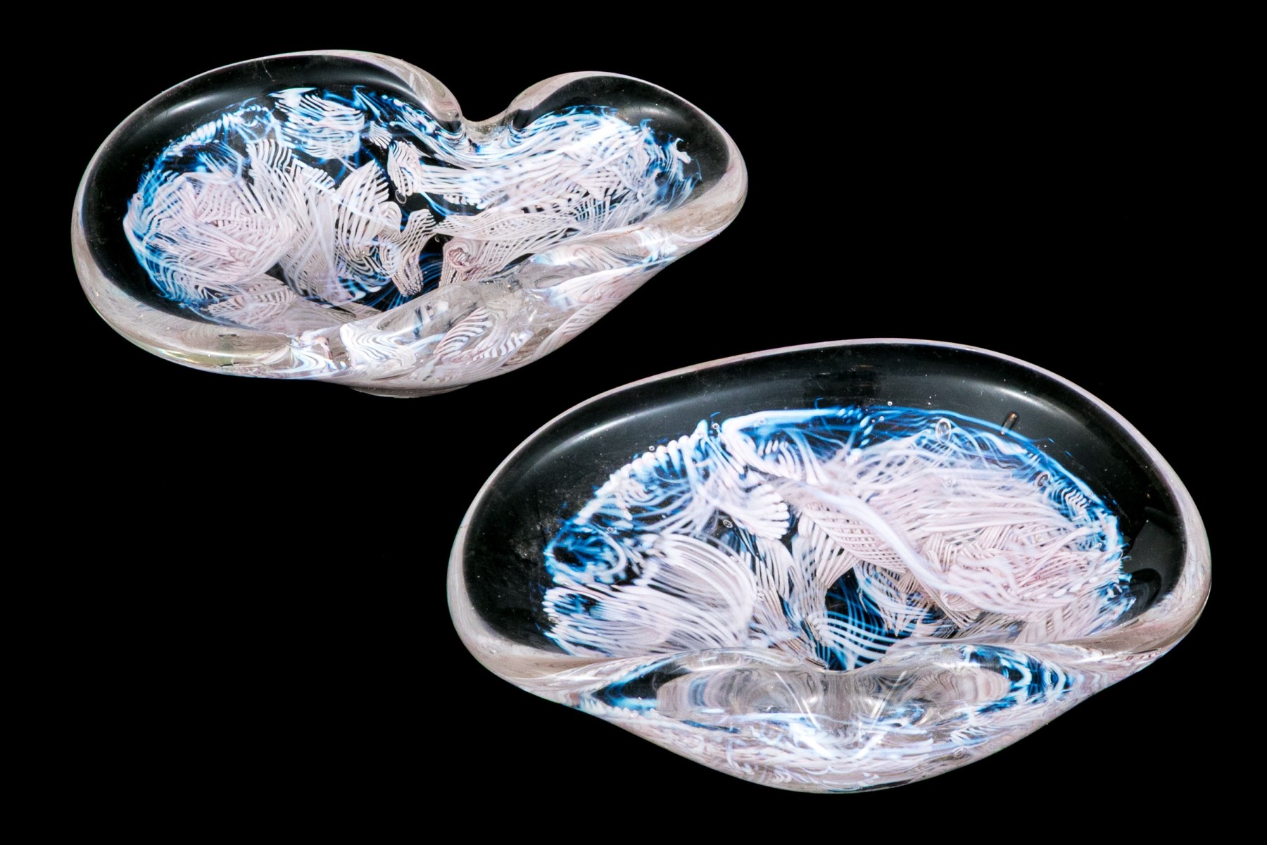 A gorgeous pair of authentic mid-century Murano glass bowls with fluid, rounded heart shapes beautifully decorated with textural blue, white, and cream striations swirling energetically at the center of clear glass bodies.