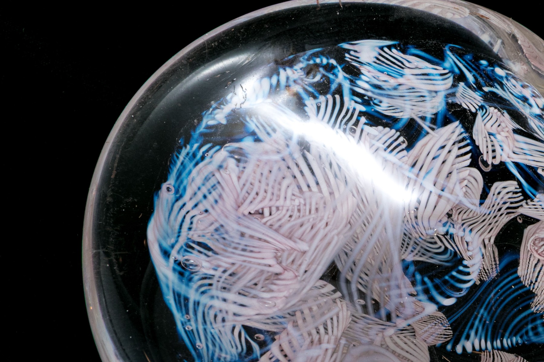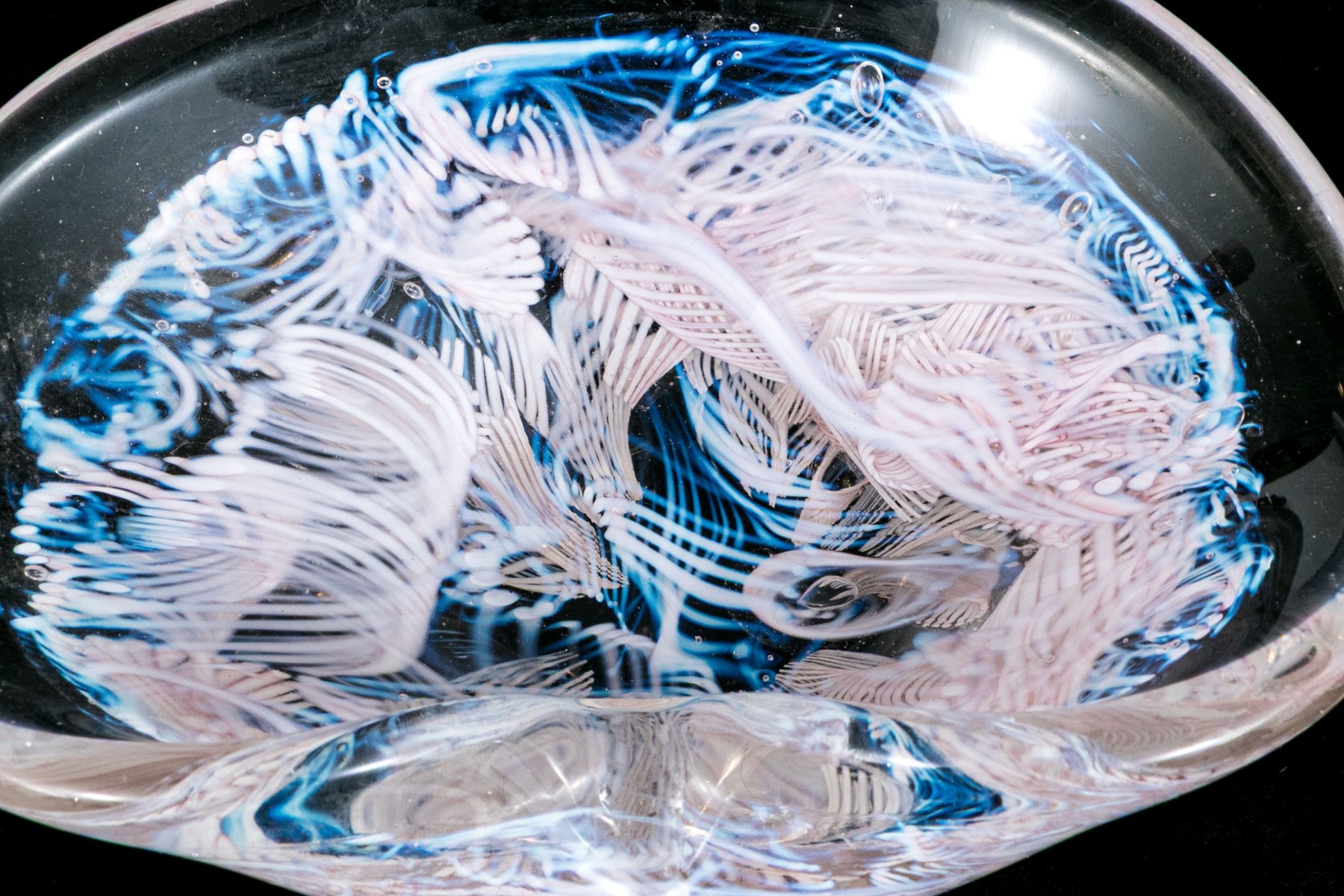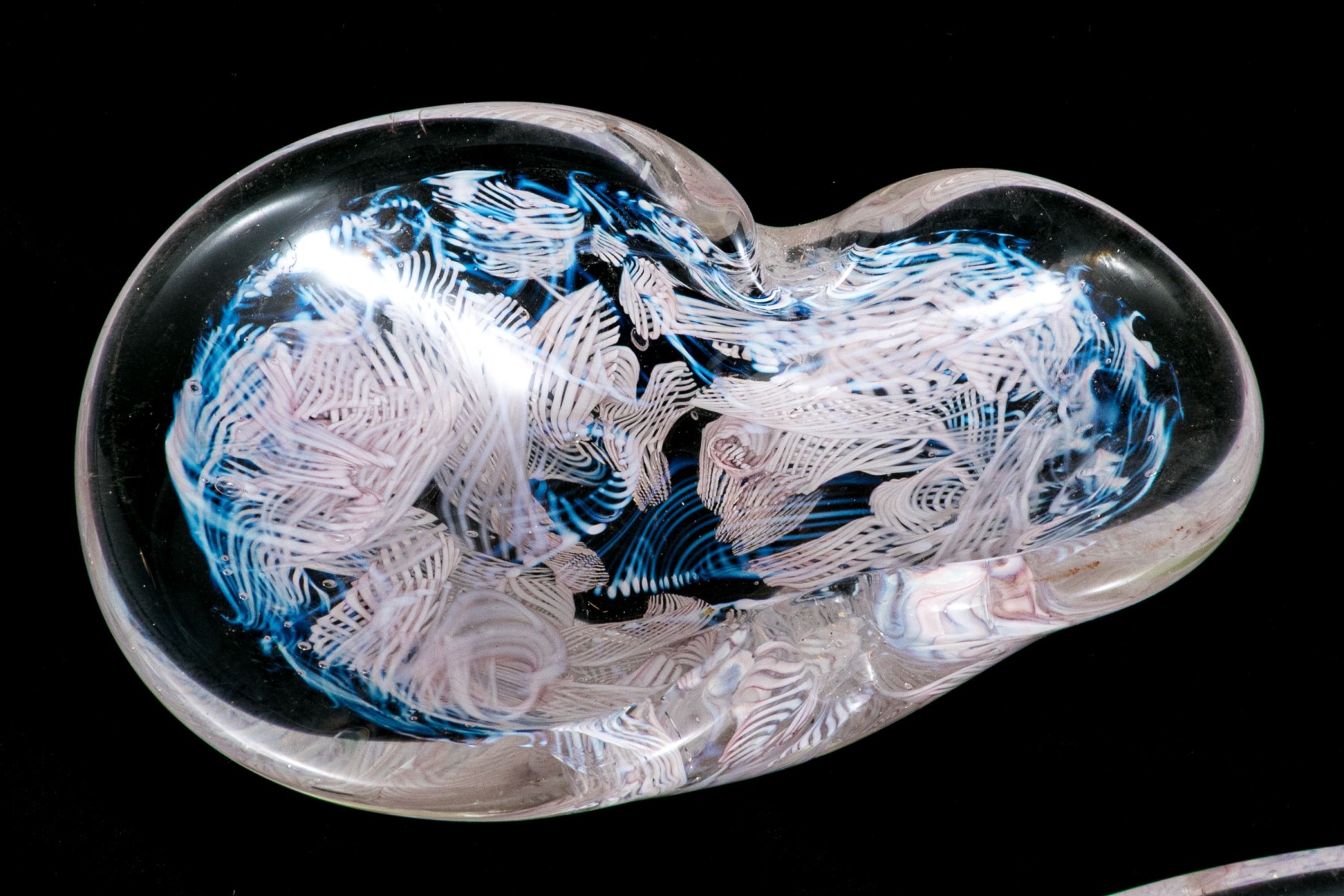 A gorgeous pair of authentic mid-century Murano glass bowls with fluid, rounded heart shapes beautifully decorated with textural blue, white, and cream striations swirling energetically at the center of clear glass bodies.