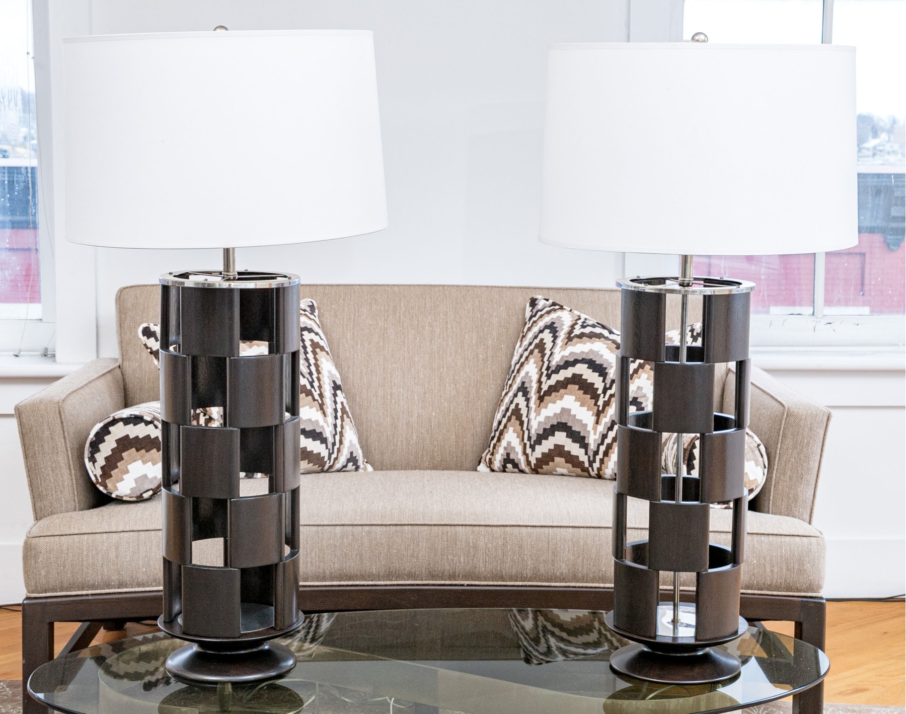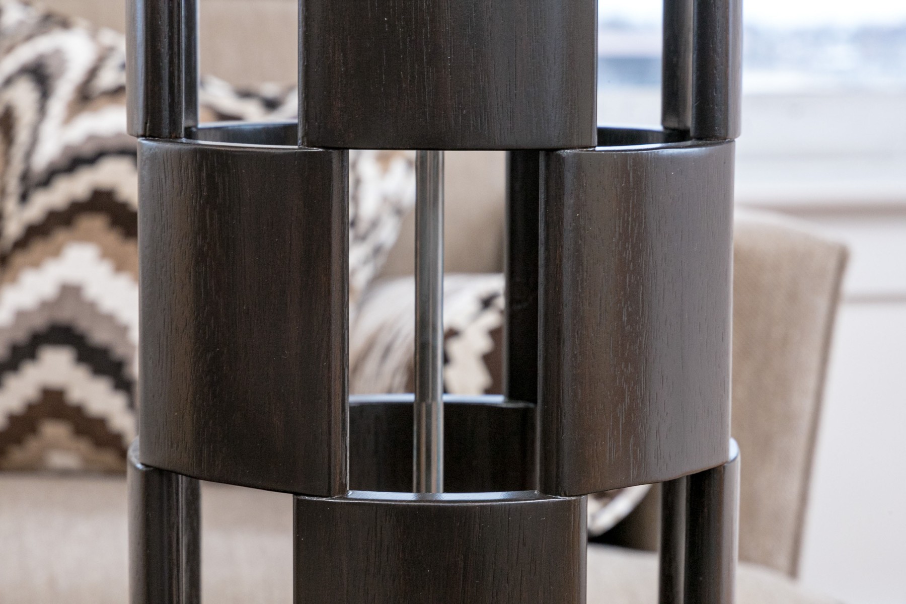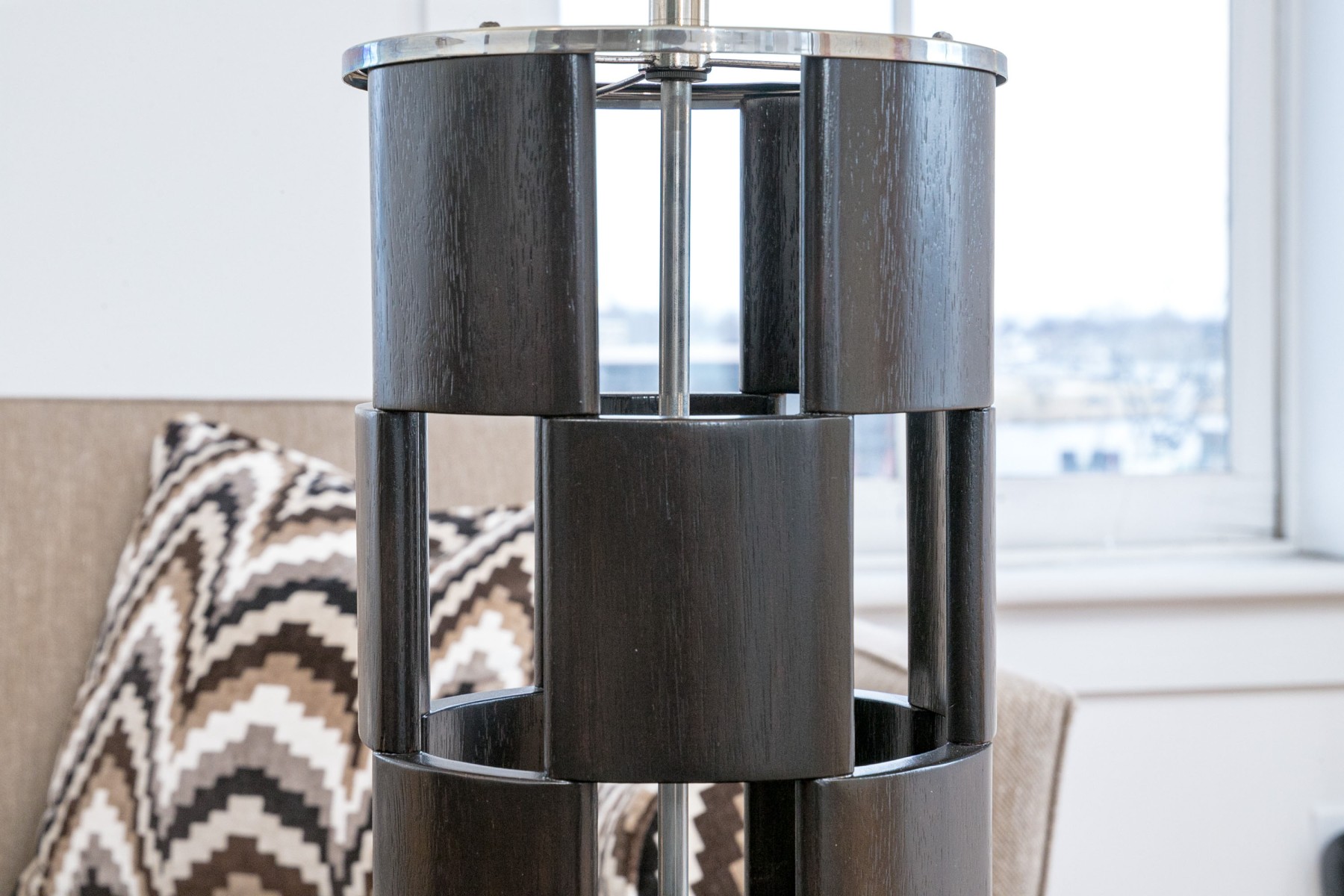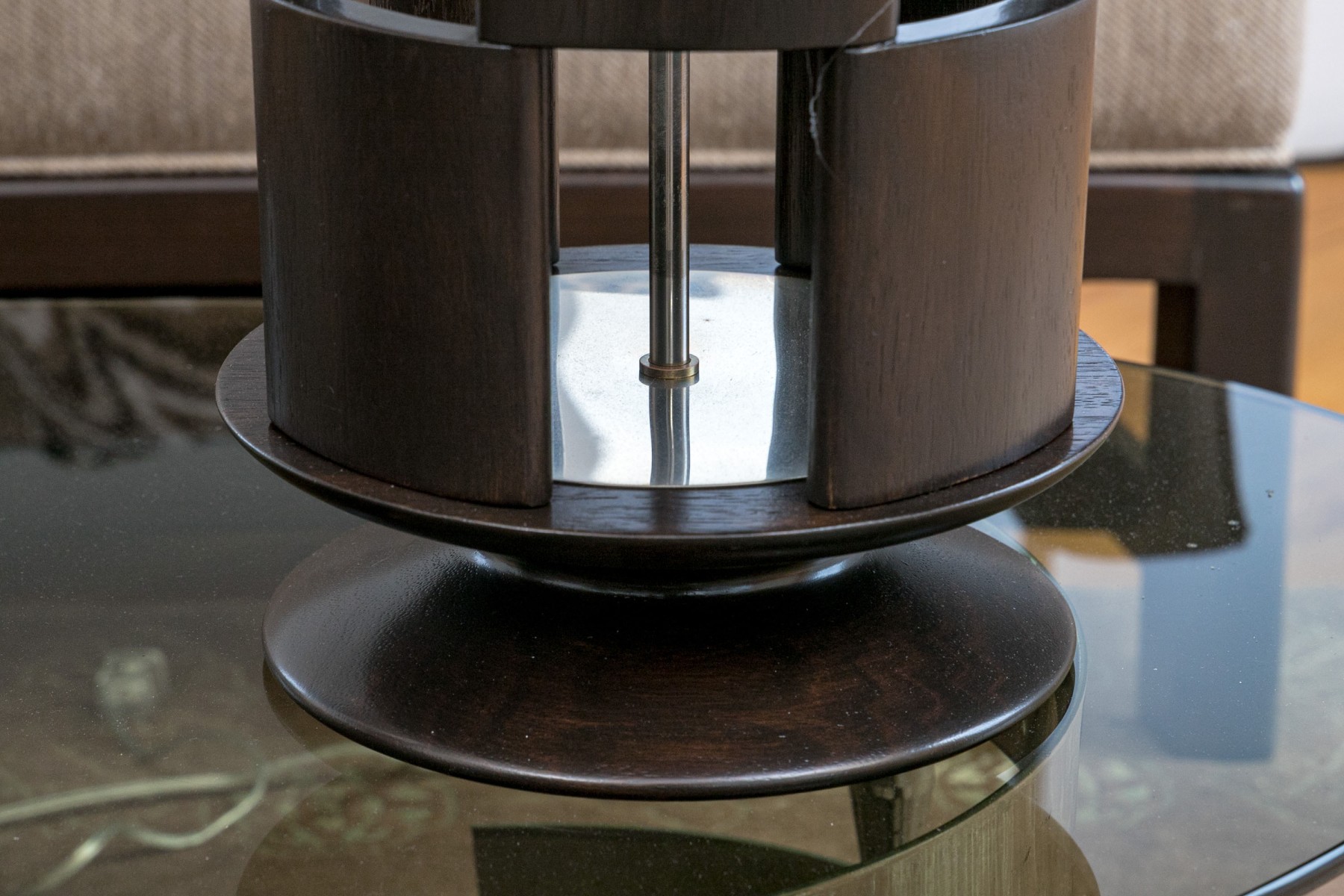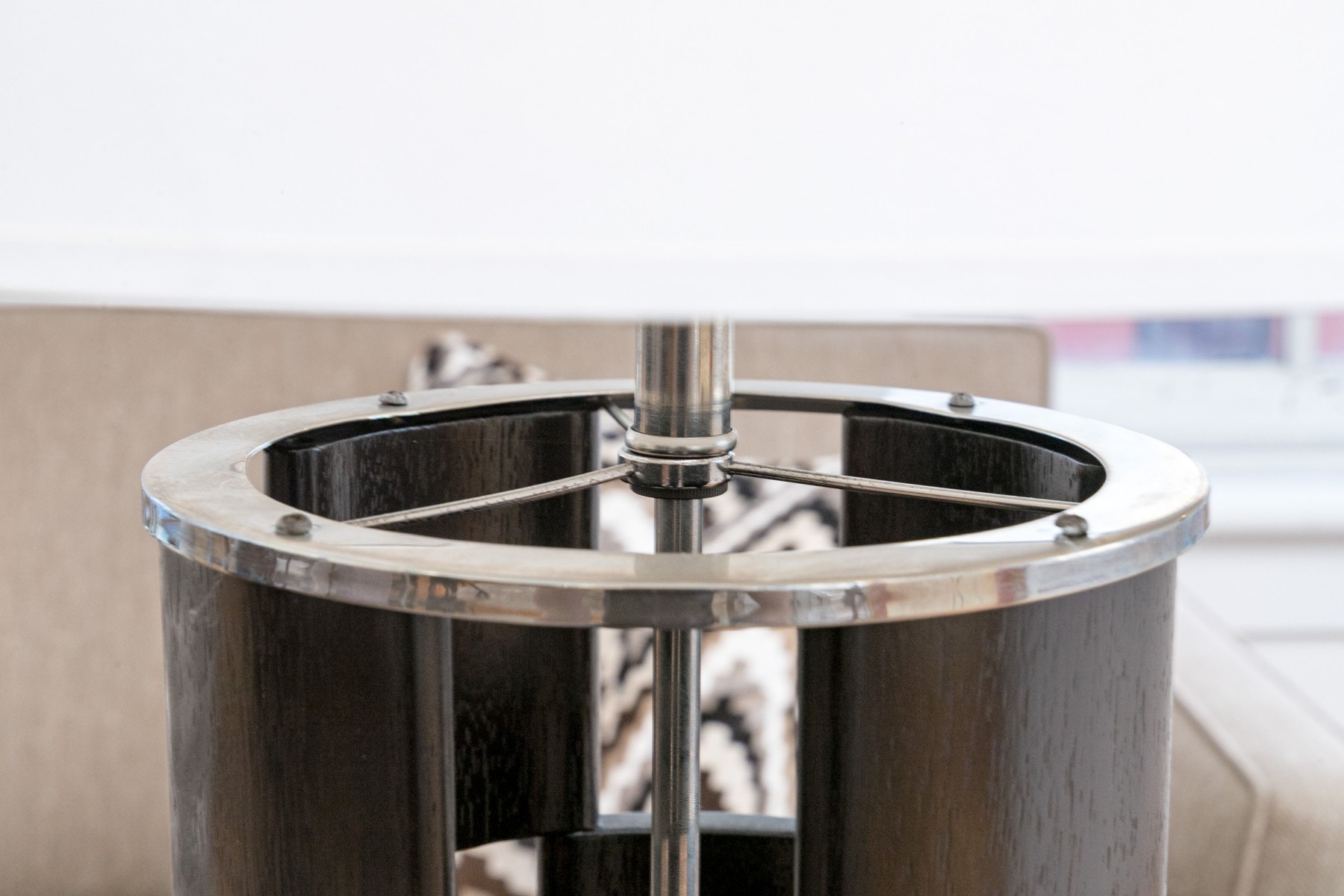 A circular openwork design in dark wood with tiers of squares and chrome mounts. Along with white paper shades.