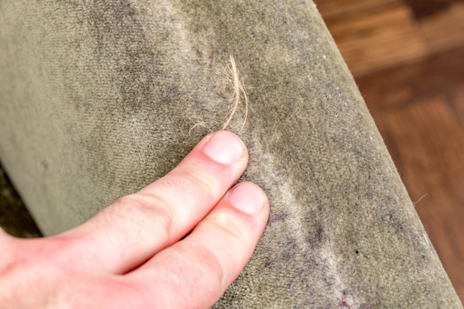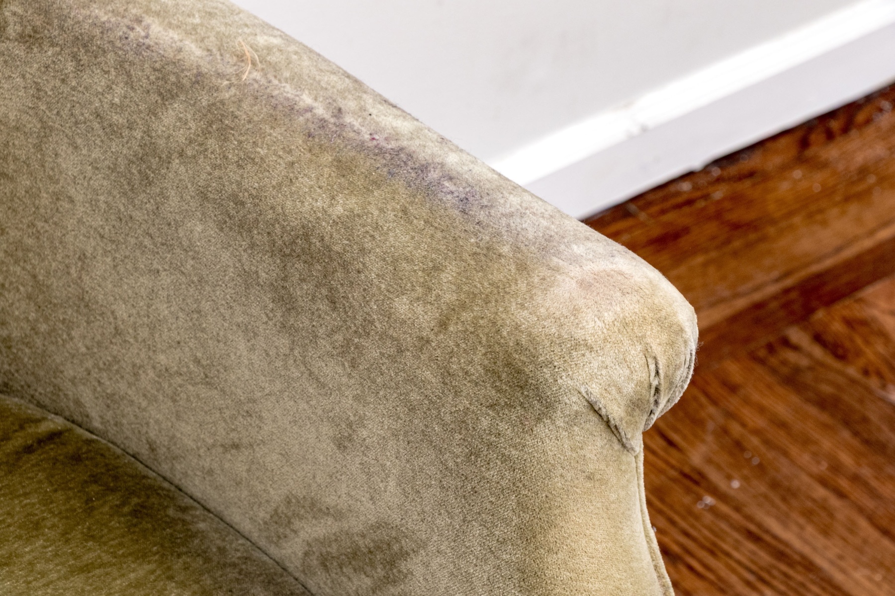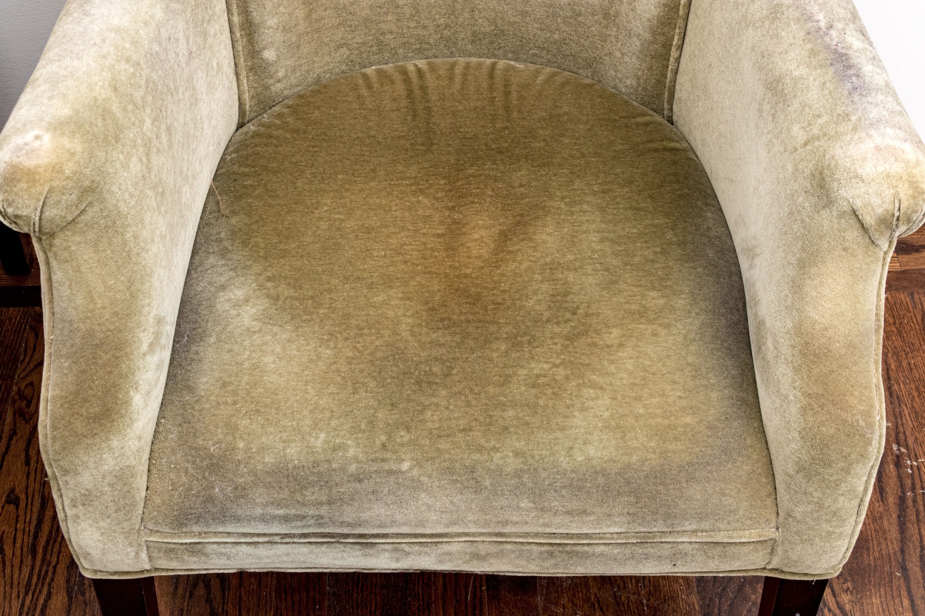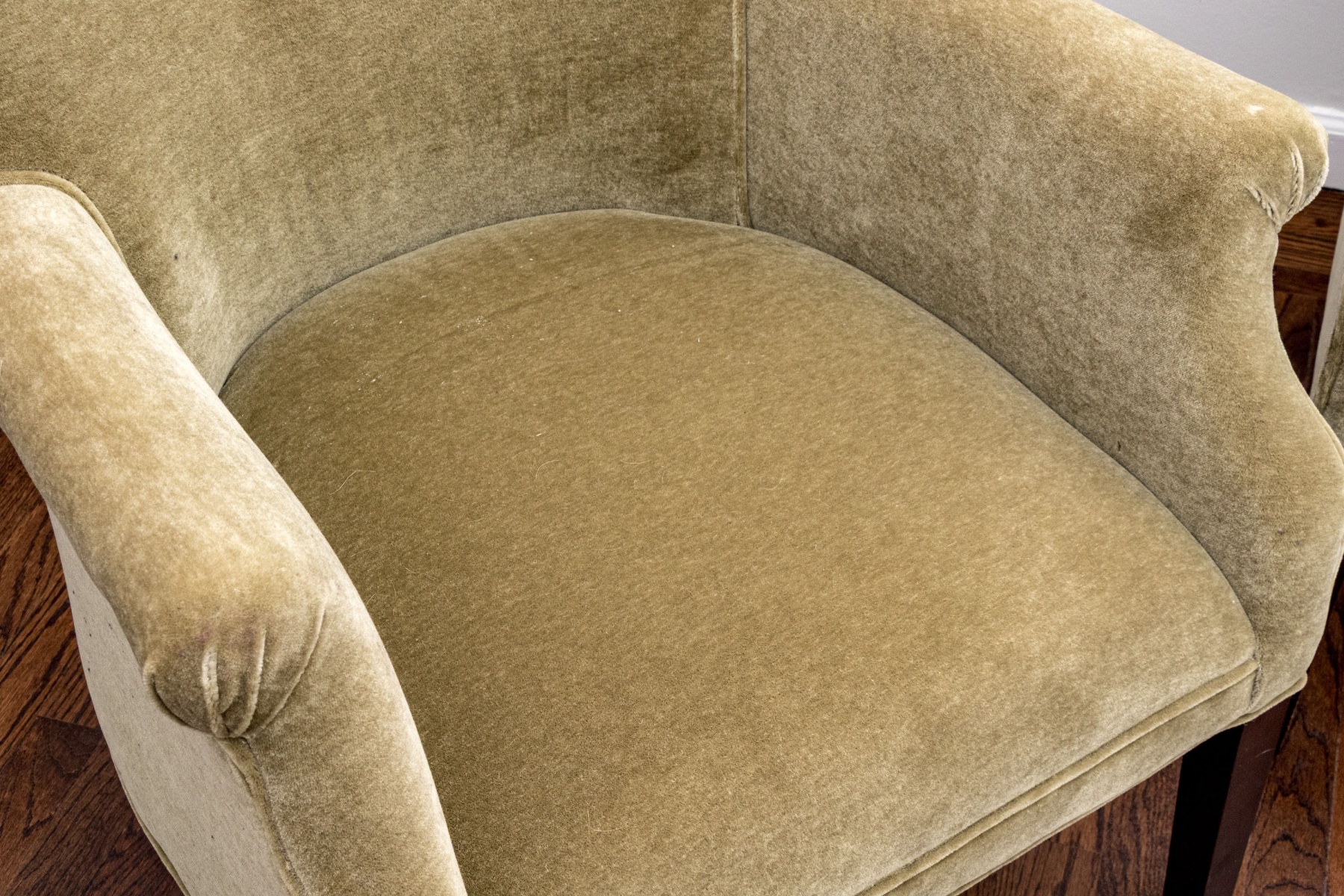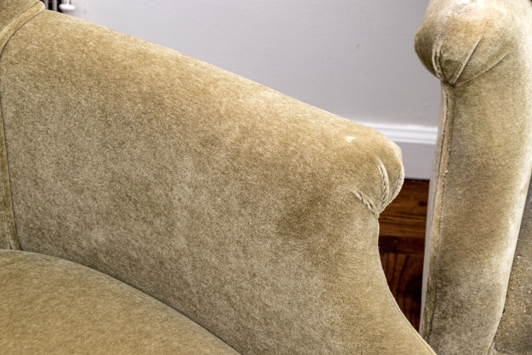 Each with some wear to upholstery, with one having more notable wear and sunning. Despite wear still a very handsome pair.