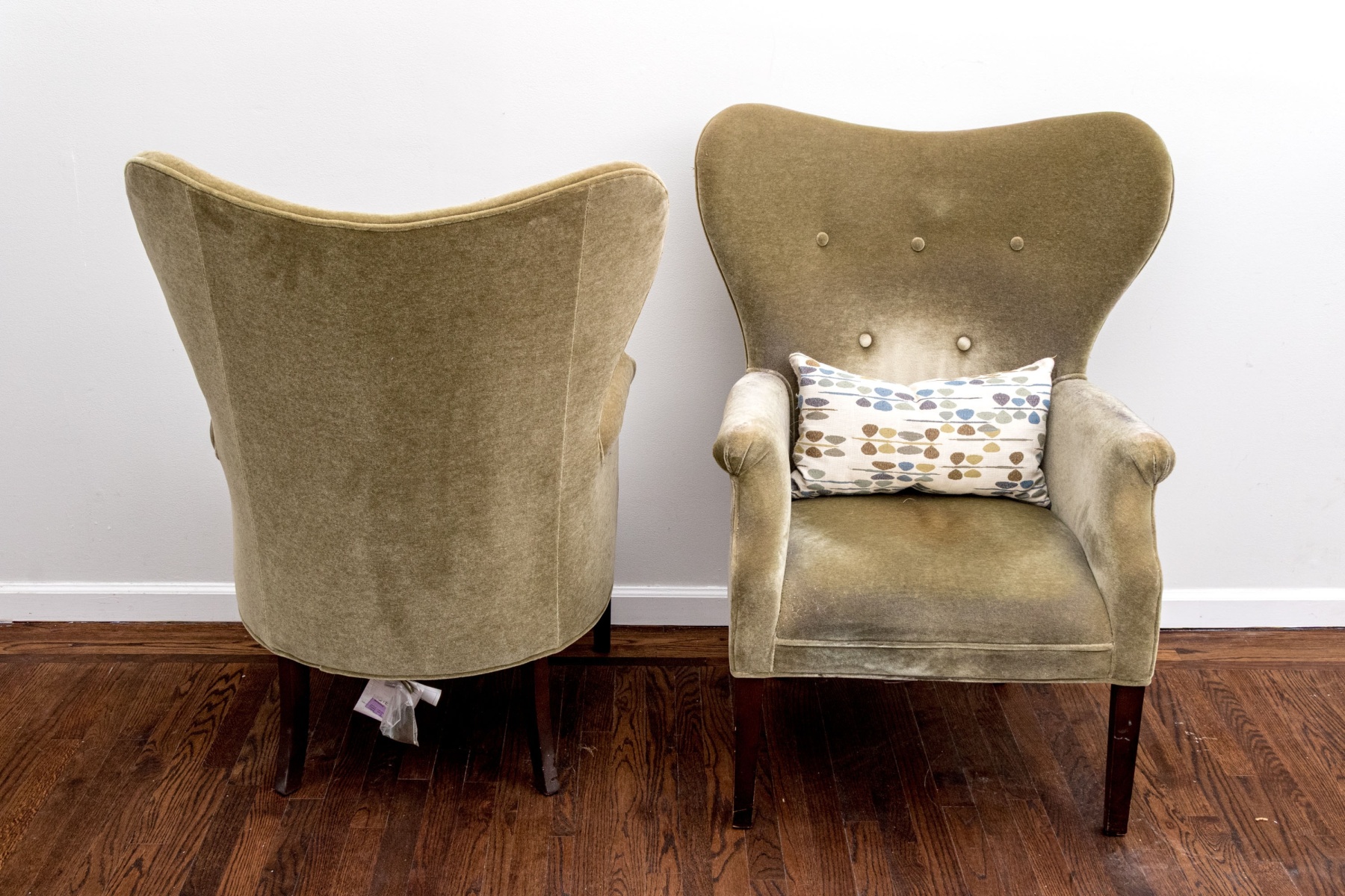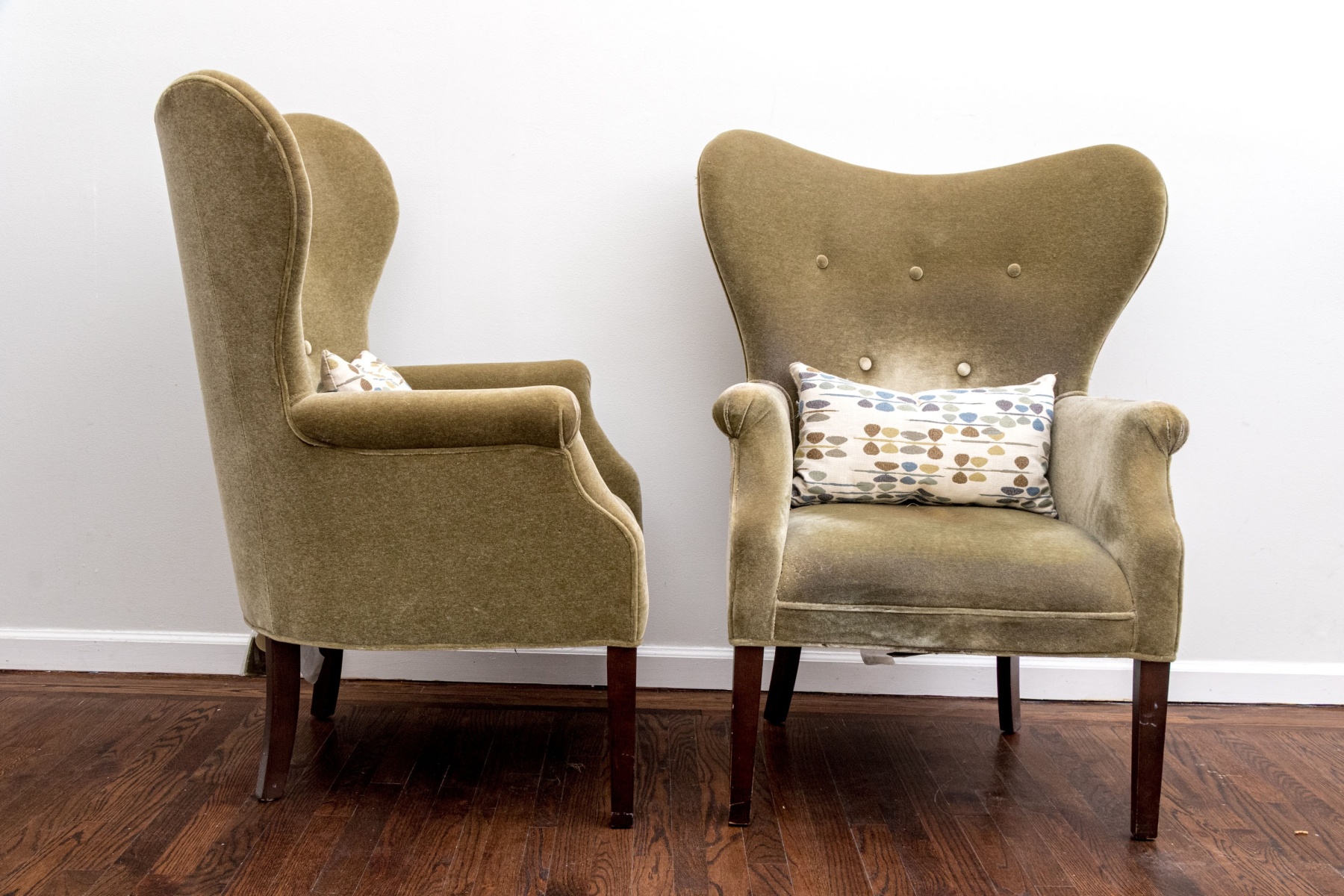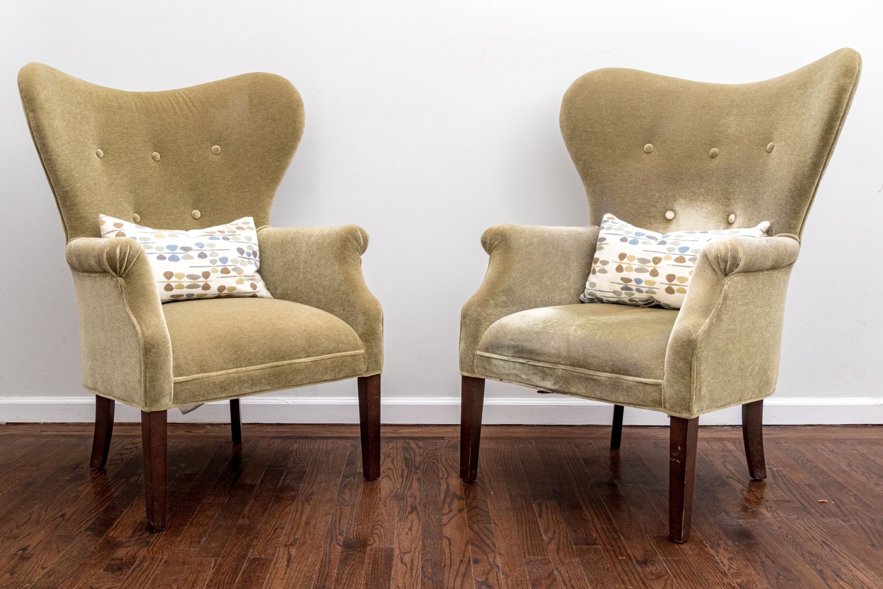A stylish pair of high quality Mitchell Gold + Bob Williams "Suzanne" chairs combining contemporary style with traditional flair. The chairs feature dramatic wing backs with button tufting, rolled arms, and gently domed seats upholstered in olive green mohair. Raised over straight and tapered dark brown front legs and curved back legs. Accented with mod lumbar pillows sporting earthy abstract foliage against white fabric.